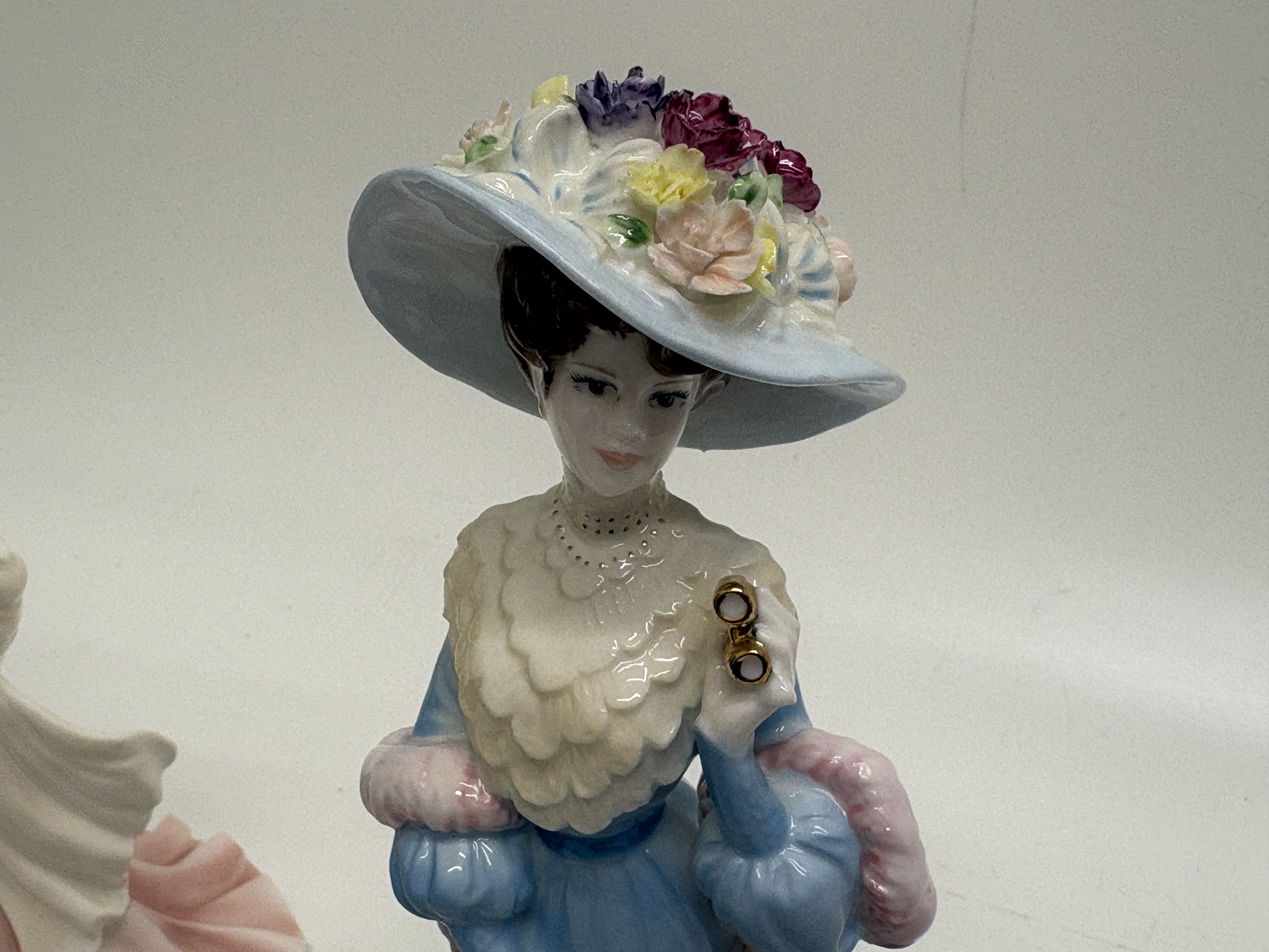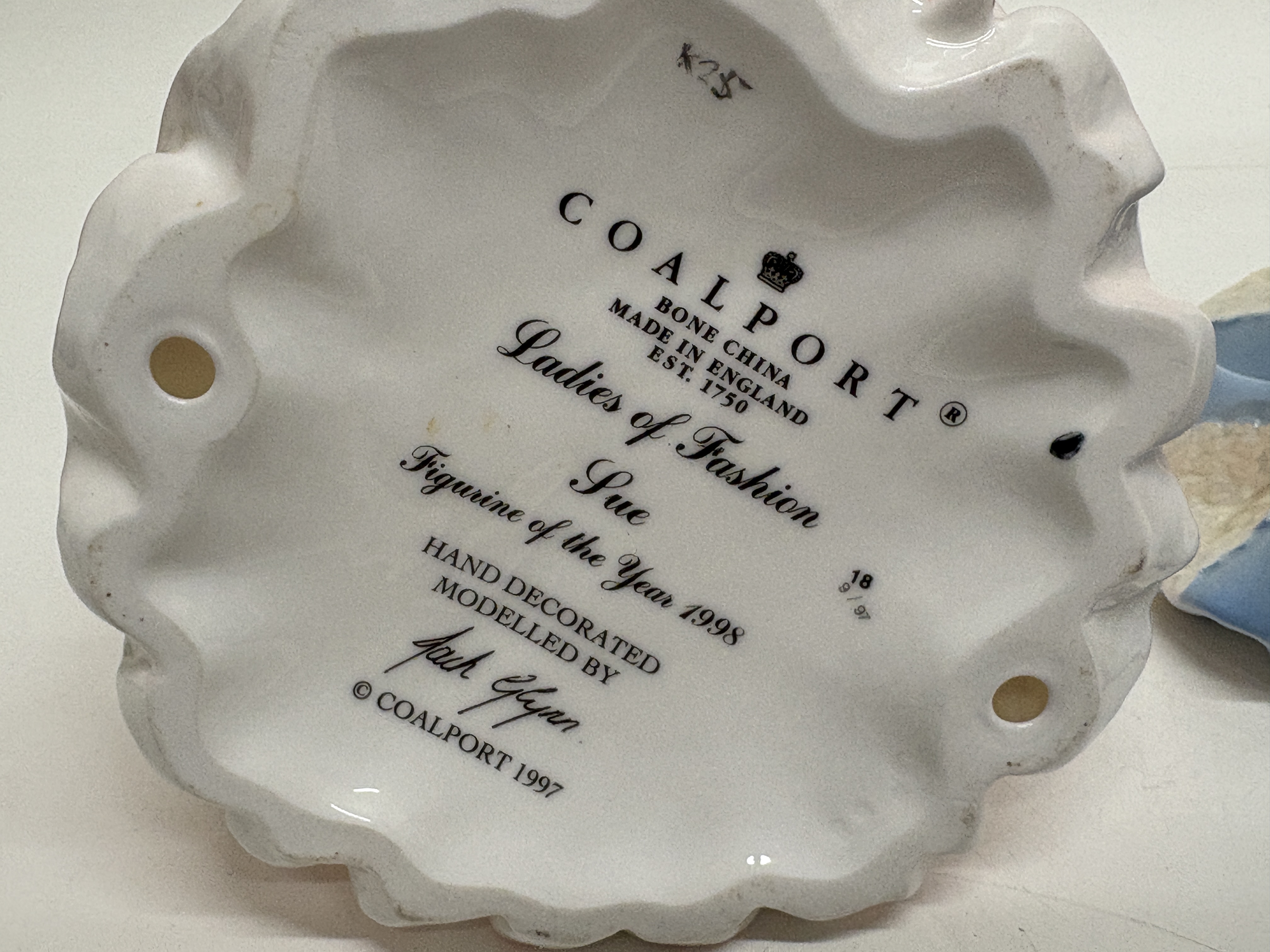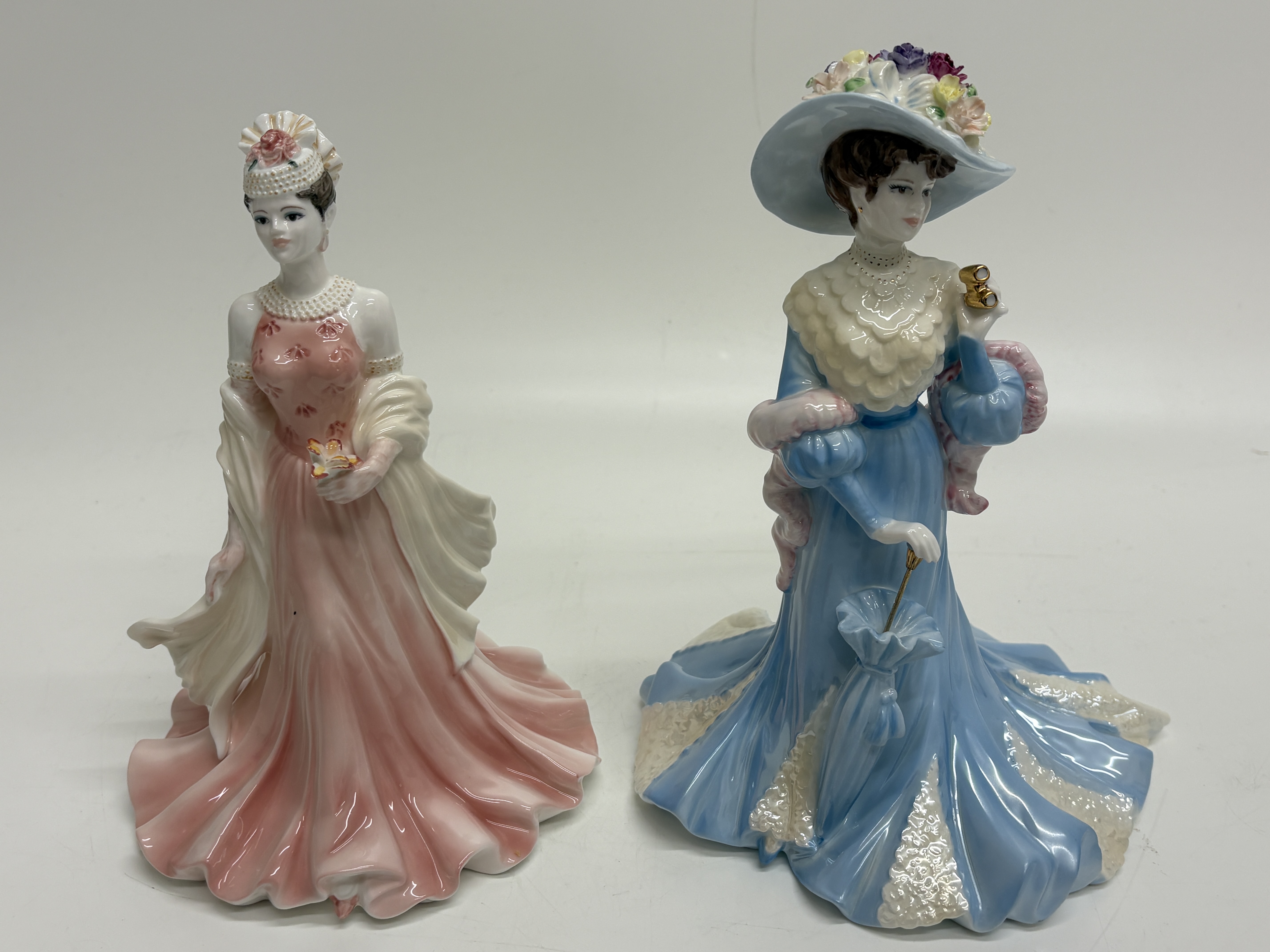 A pair of fine bone china figurines by Coalport, both hand-decorated in England and designed by modeller Jack Glynn. The first figurine, titled Sue, is from the Ladies of Fashion series and was designated Figurine of the Year 1998. She is depicted in a sophisticated pink sleeveless gown with raised floral detailing, a cream shawl, and a pillbox hat adorned with beads and a pink rose. The base bears the Coalport crown mark, the modeller’s signature, a 1997 copyright, and hand-written factory marks K25 and 18 9/97. The second figurine, Lady Sara, is a limited edition piece from the High Society series, numbered 2,904 of 5,000. She wears an elegant blue Victorian-style gown with a white tiered ruff collar and a wide-brimmed hat heavily decorated with multi-coloured flowers. She holds gold-toned opera glasses and a closed blue parasol. The base features the Coalport crown mark, the specific edition number, the modeller’s signature, a 1996 copyright, and factory marks K3 A, 61, and Y15. Height 22cm.