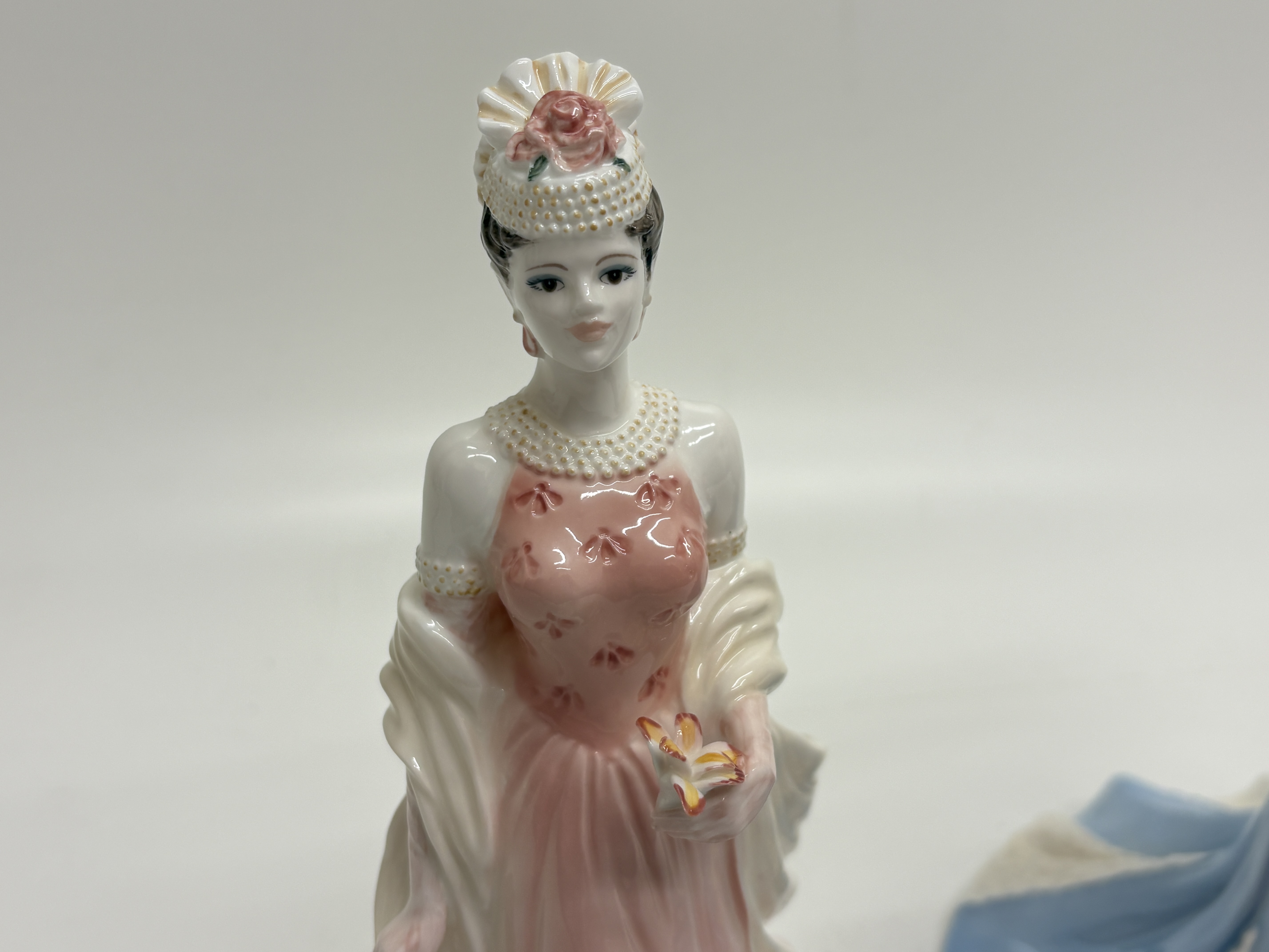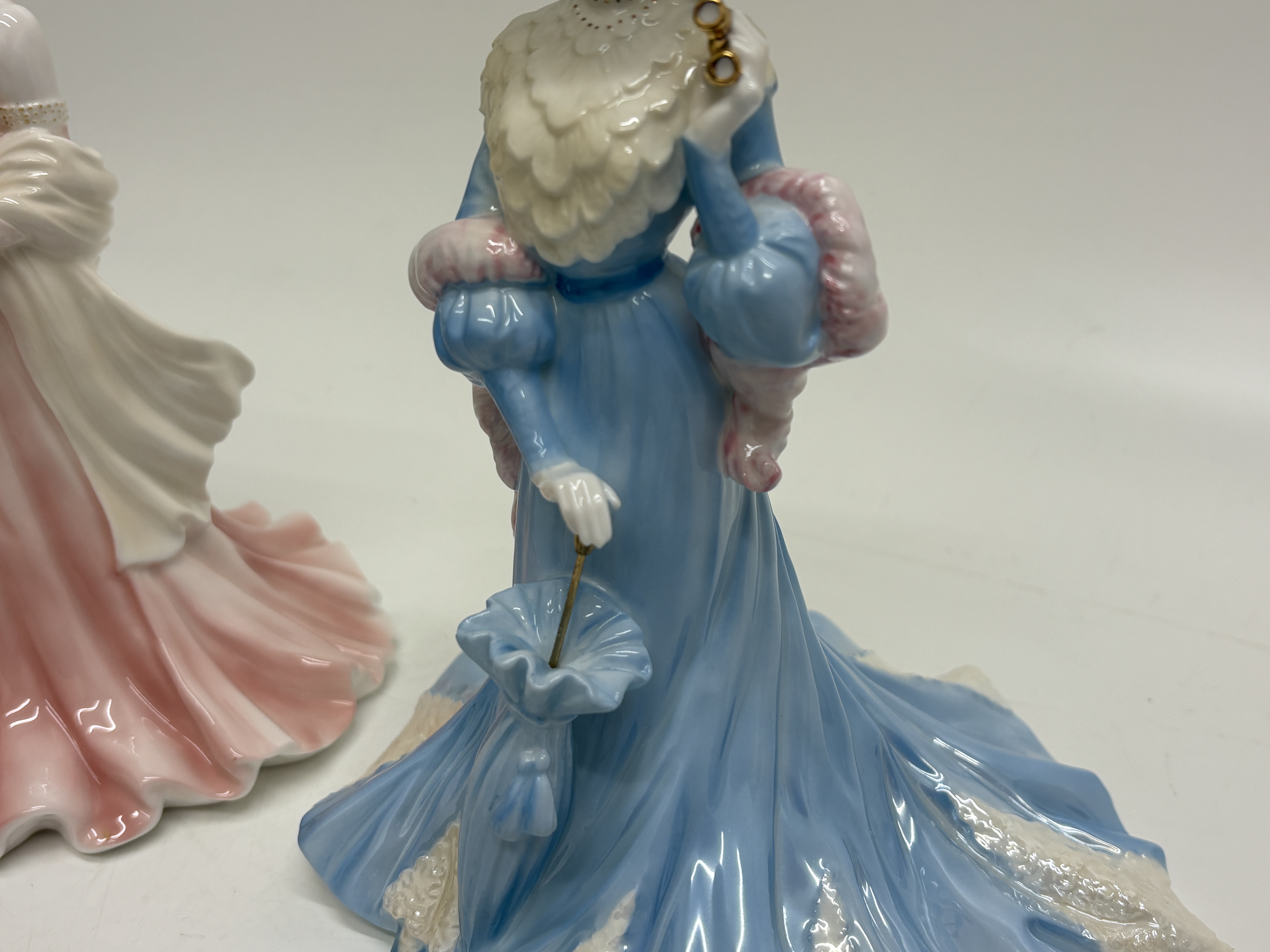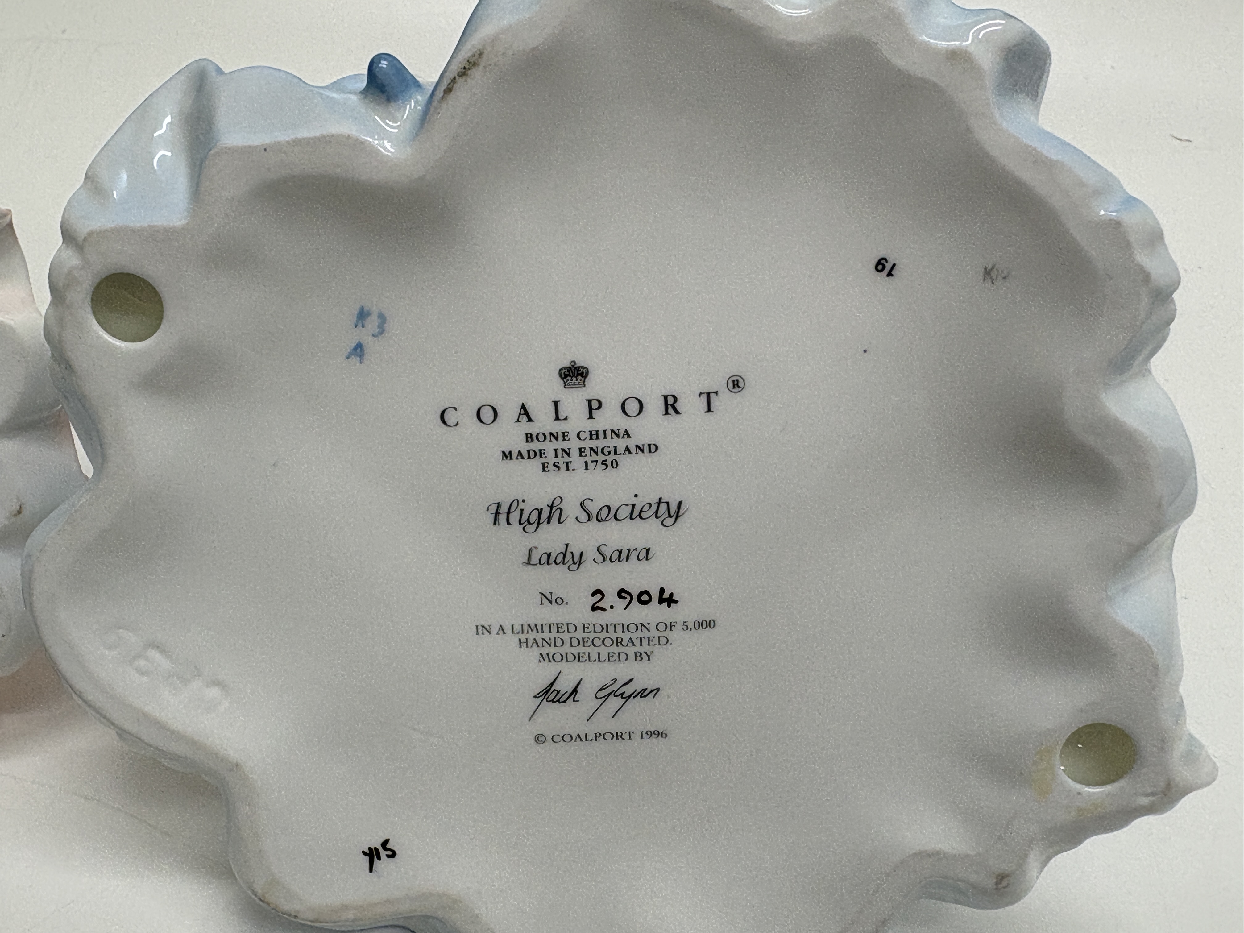 A pair of fine bone china figurines by Coalport, both hand-decorated in England and designed by modeller Jack Glynn. The first figurine, titled Sue, is from the Ladies of Fashion series and was designated Figurine of the Year 1998. She is depicted in a sophisticated pink sleeveless gown with raised floral detailing, a cream shawl, and a pillbox hat adorned with beads and a pink rose. The base bears the Coalport crown mark, the modeller’s signature, a 1997 copyright, and hand-written factory marks K25 and 18 9/97. The second figurine, Lady Sara, is a limited edition piece from the High Society series, numbered 2,904 of 5,000. She wears an elegant blue Victorian-style gown with a white tiered ruff collar and a wide-brimmed hat heavily decorated with multi-coloured flowers. She holds gold-toned opera glasses and a closed blue parasol. The base features the Coalport crown mark, the specific edition number, the modeller’s signature, a 1996 copyright, and factory marks K3 A, 61, and Y15. Height 22cm.