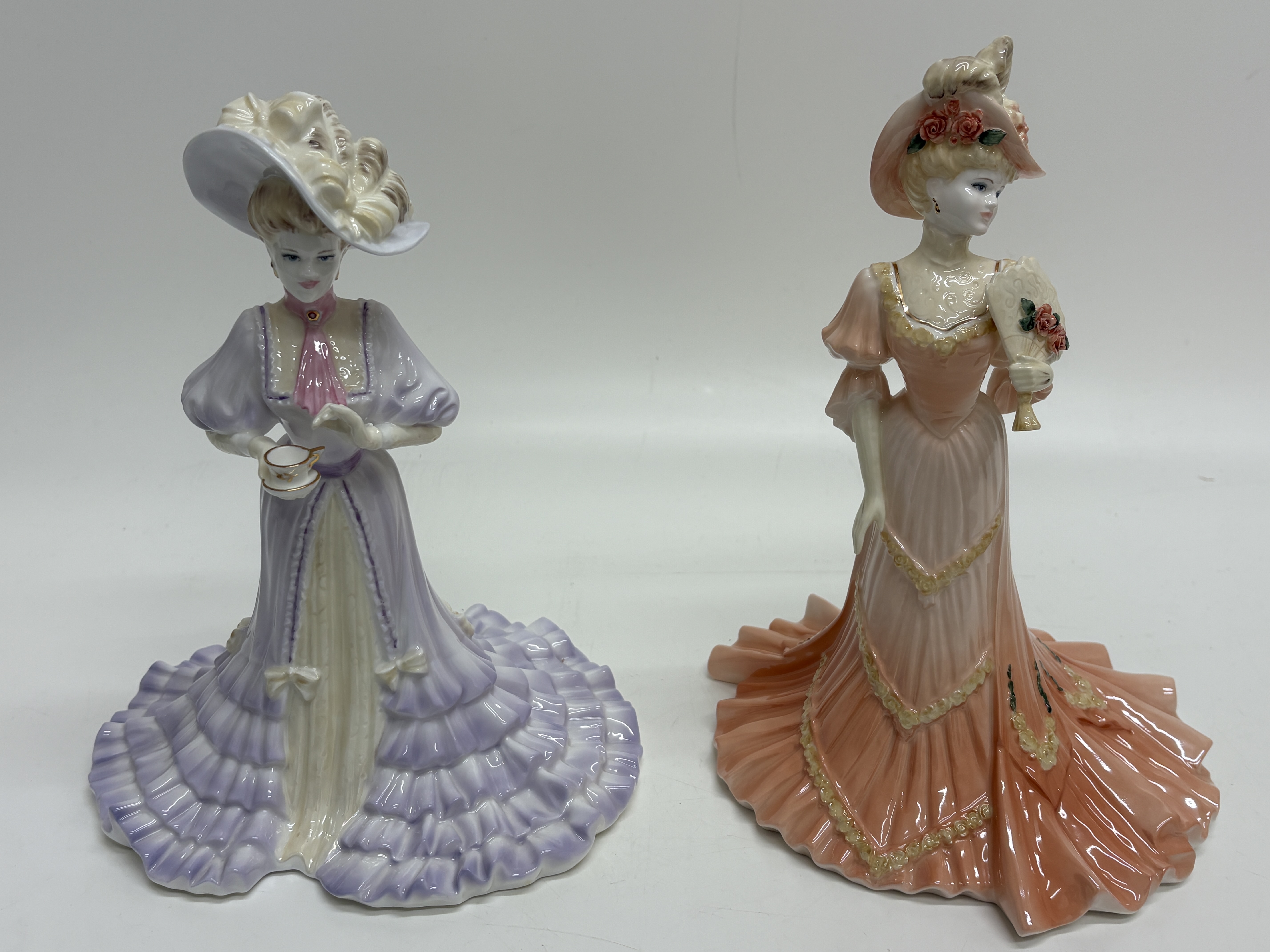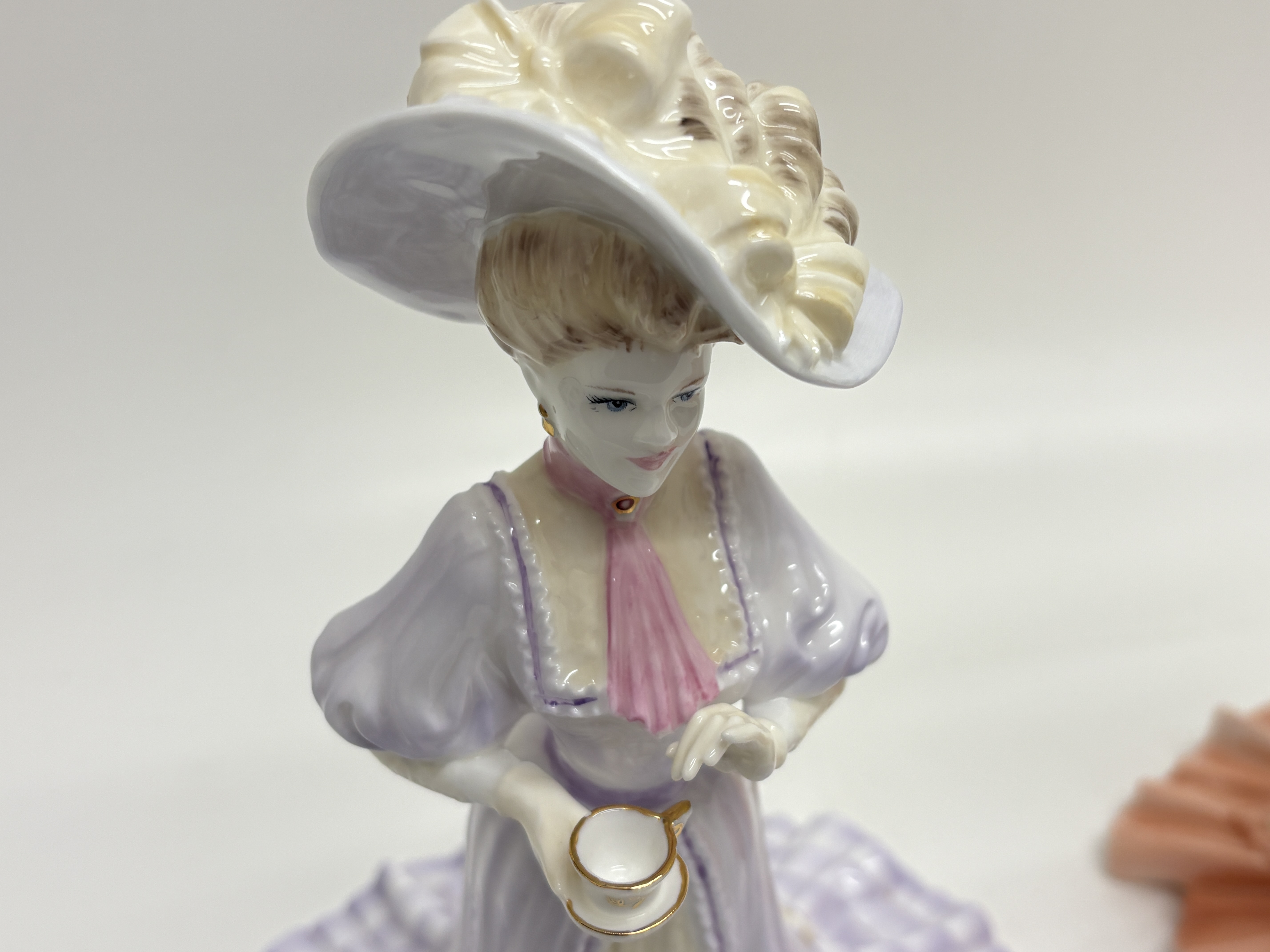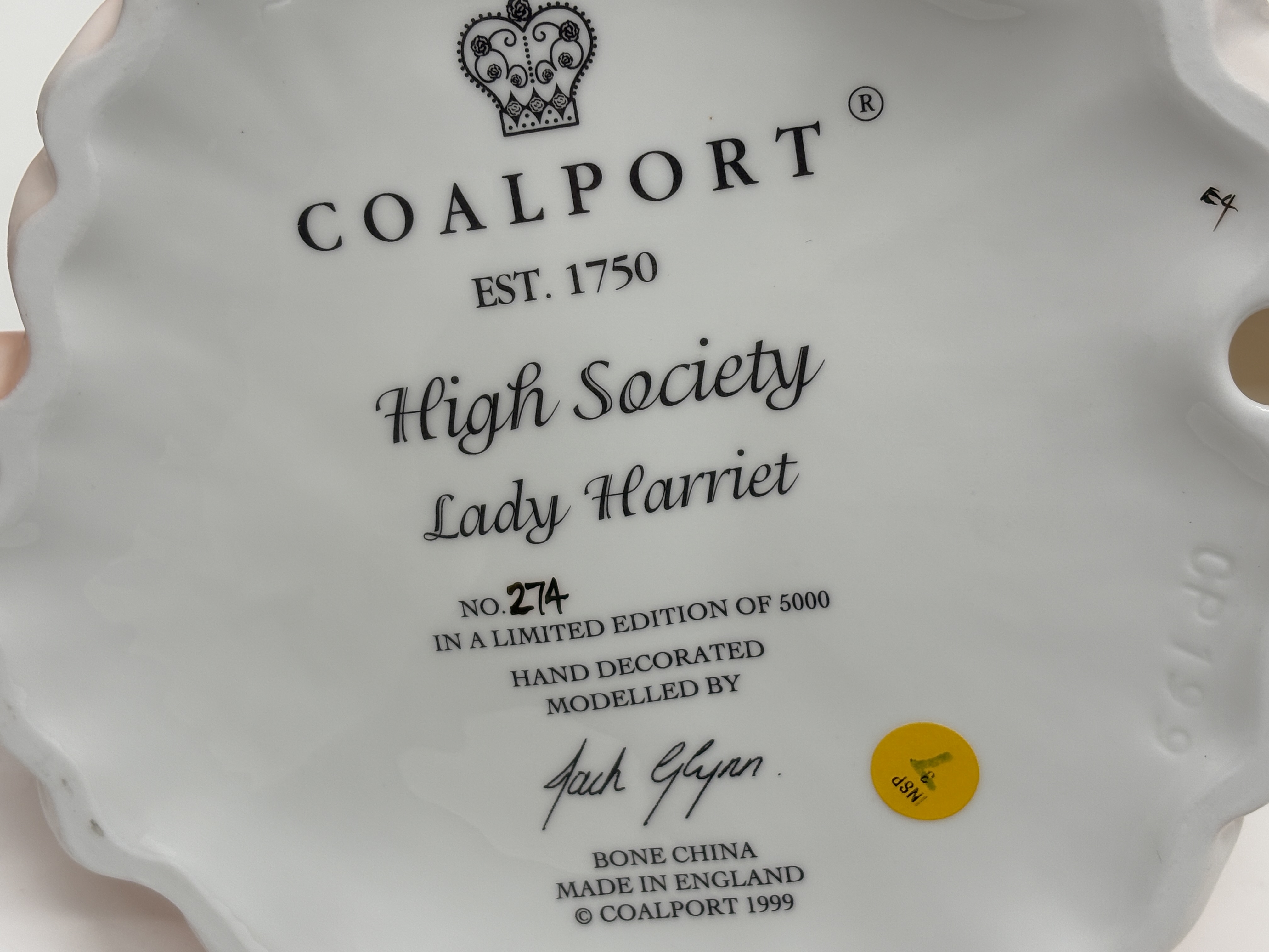 A pair of fine Coalport glazed bone china figurines from the prestigious High Society collection, both modelled by Jack Glynn. The first figurine, Lady Elizabeth, is depicted in an elegant late Victorian style light purple and cream ruffled gown with a matching wide-brimmed hat featuring ostrich feathers, holding a gold-trimmed teacup. It is hand-numbered 1170 of a limited edition of 5,000 and carries the 1991 copyright. The second figurine, Lady Harriet, wears a peach-coloured gown with delicate floral accents and a hat adorned with red roses, holding an ornate cream fan. It is hand-numbered 274 of a limited edition of 5,000 and carries the 1999 copyright. Both pieces feature the Coalport crown factory mark, BONE CHINA, MADE IN ENGLAND, and the artist’s facsimile signature to the base. Height 22 cm.