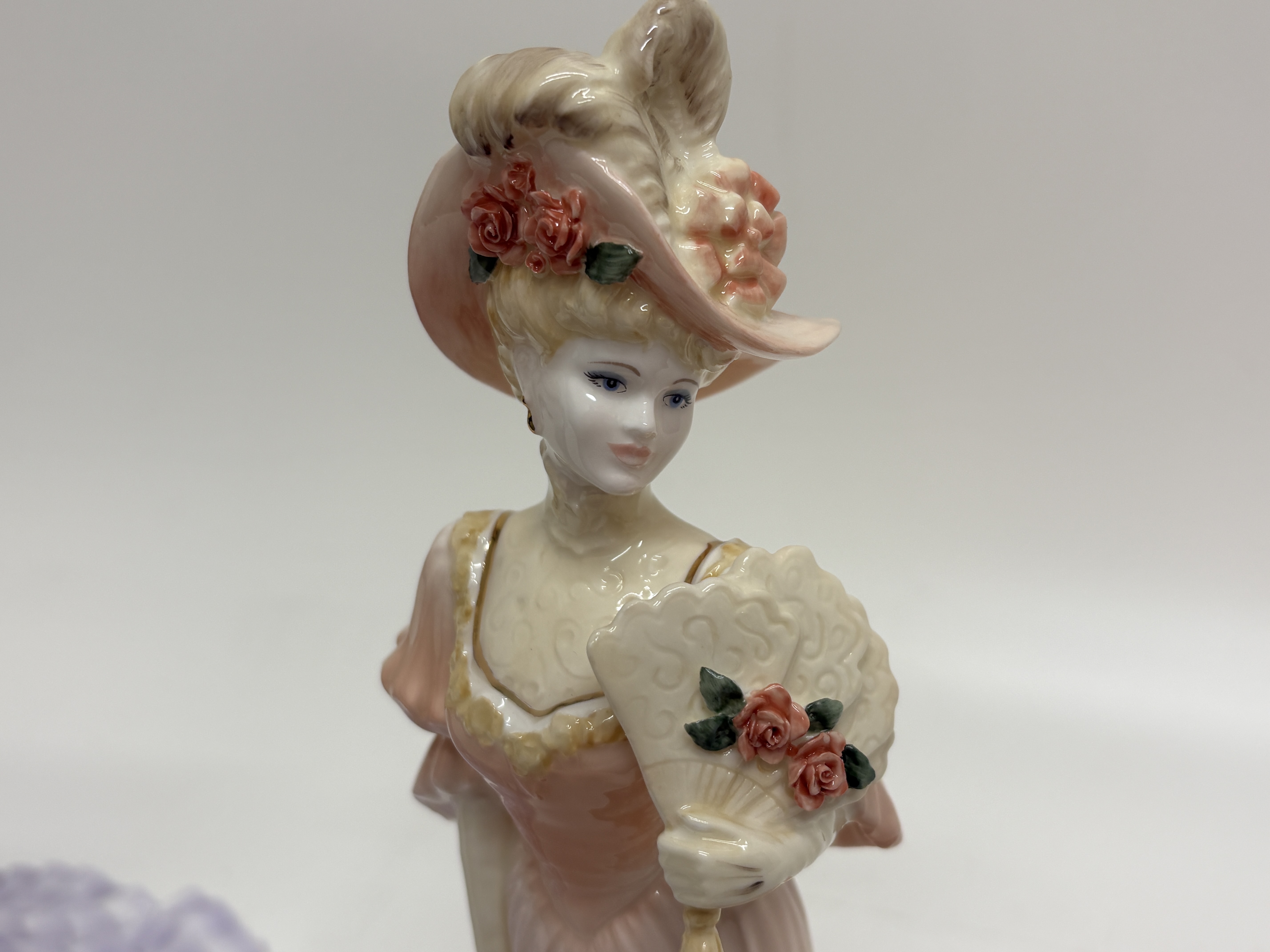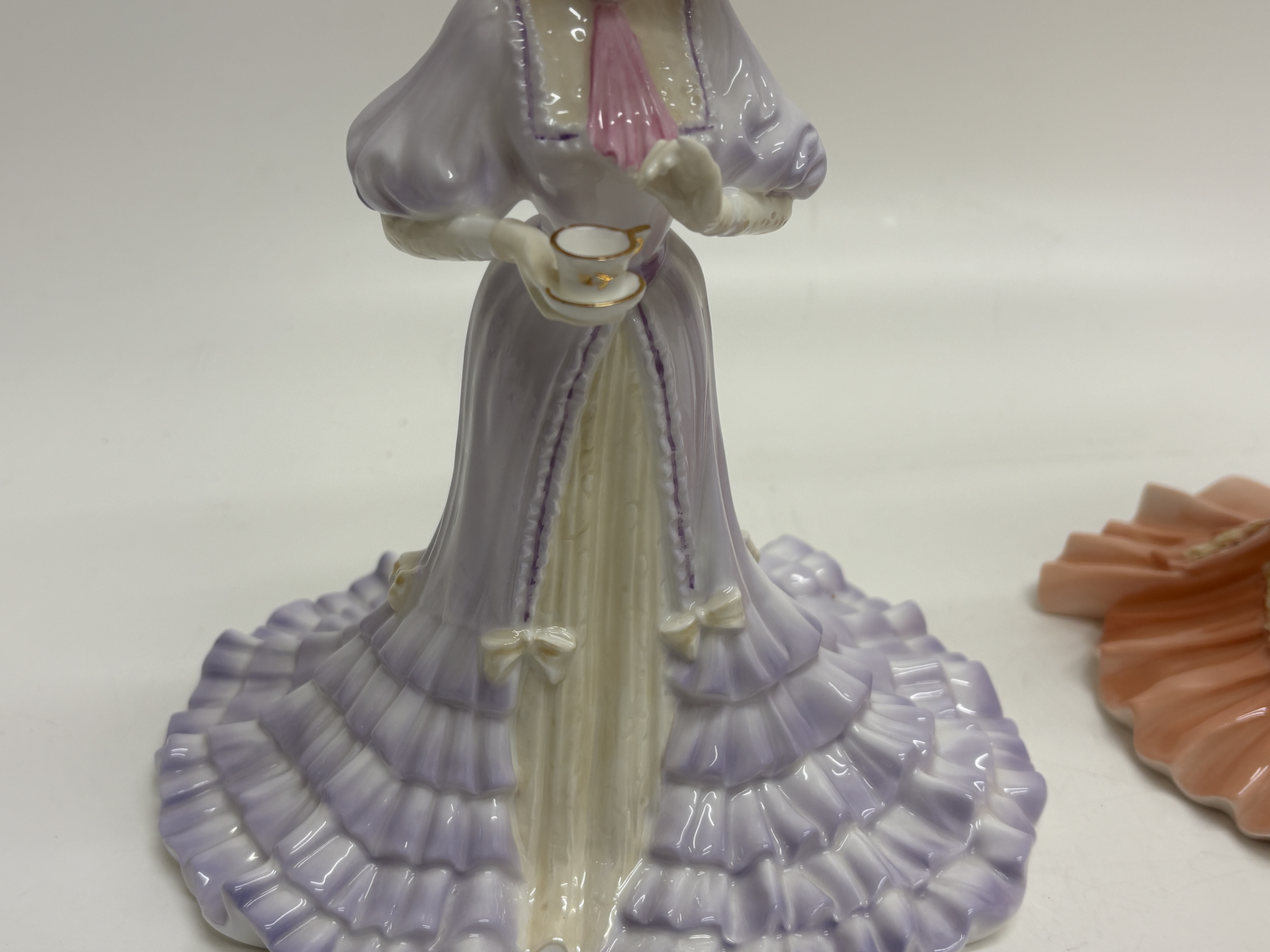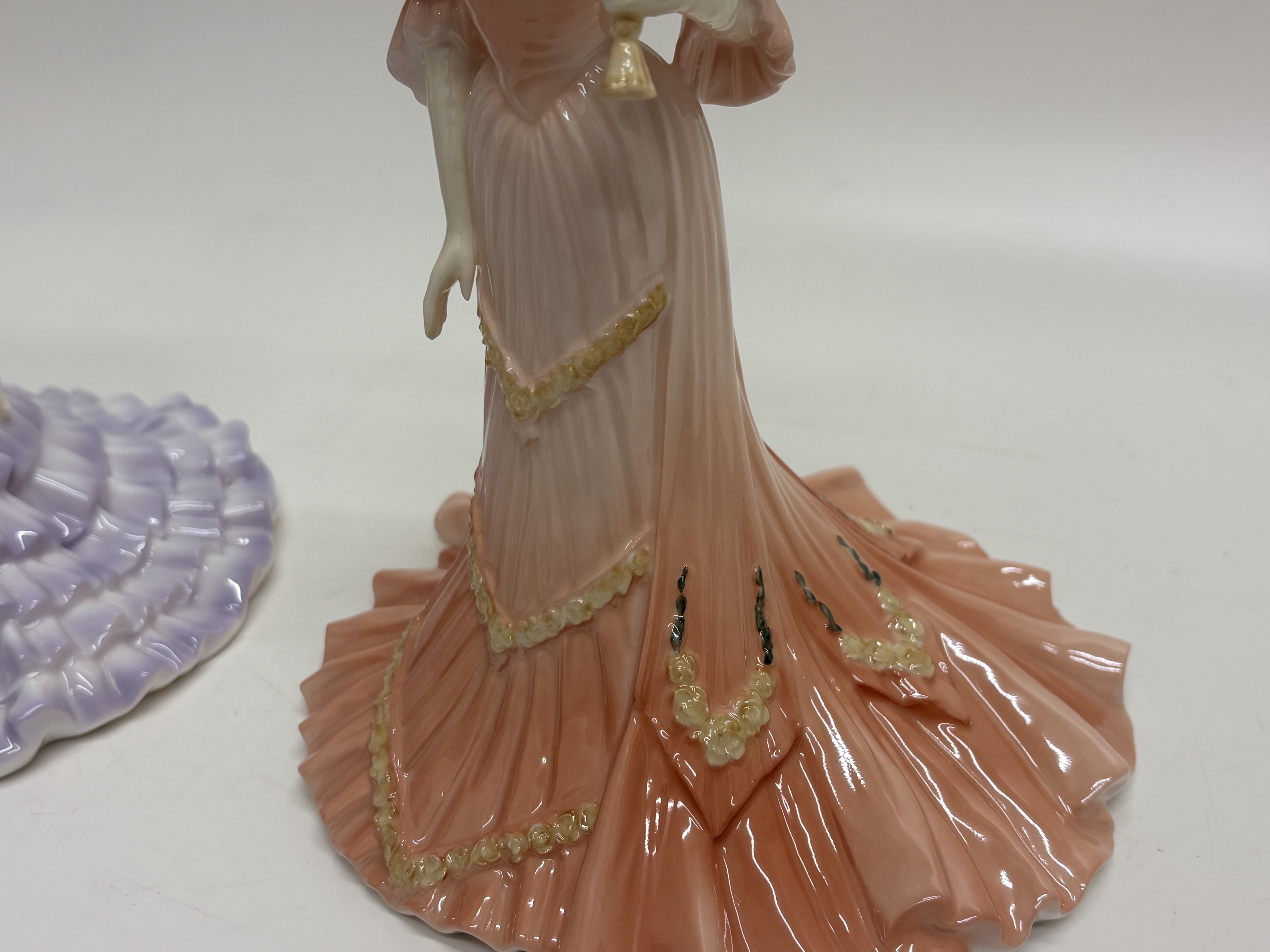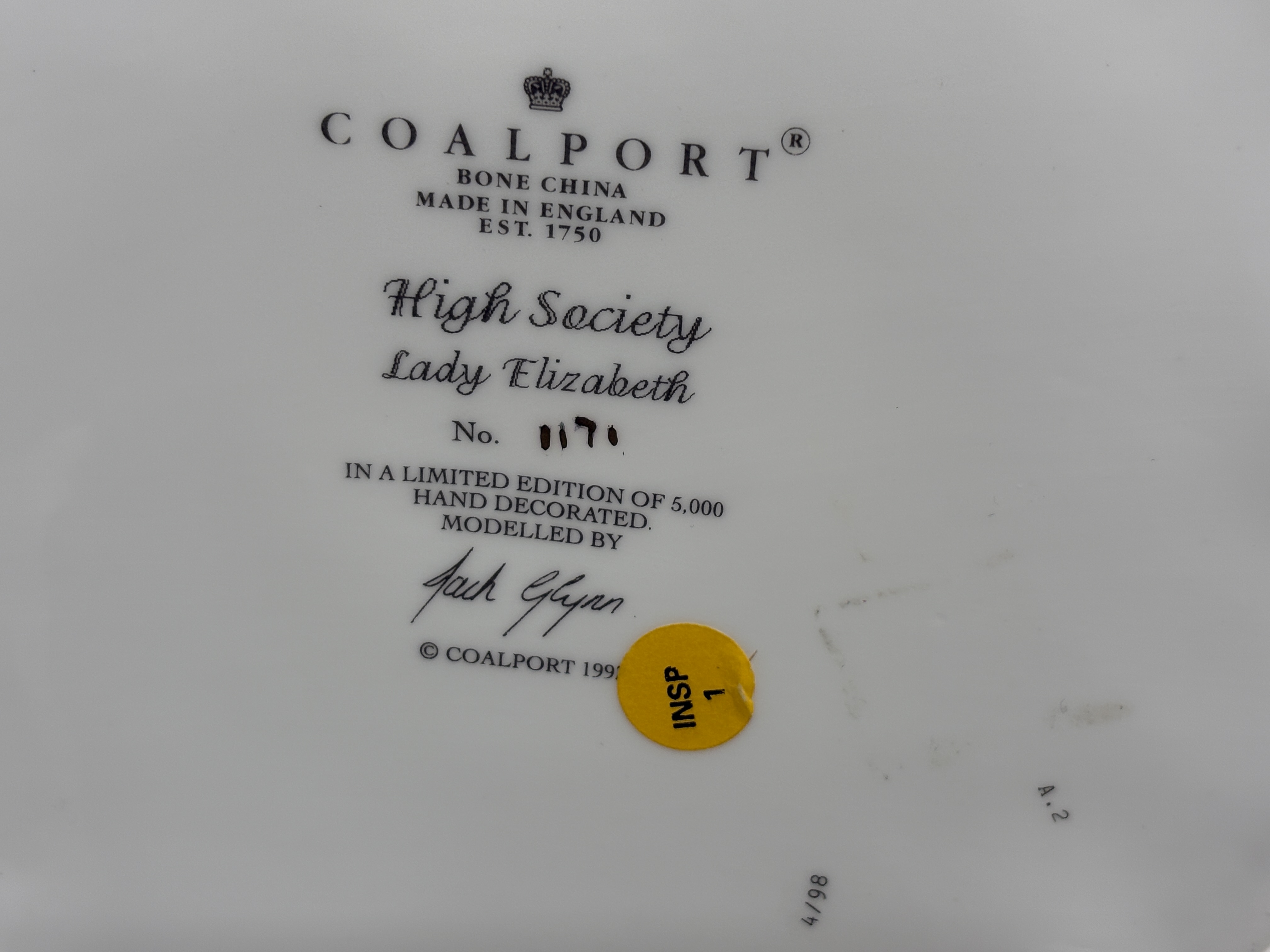 A pair of fine Coalport glazed bone china figurines from the prestigious High Society collection, both modelled by Jack Glynn. The first figurine, Lady Elizabeth, is depicted in an elegant late Victorian style light purple and cream ruffled gown with a matching wide-brimmed hat featuring ostrich feathers, holding a gold-trimmed teacup. It is hand-numbered 1170 of a limited edition of 5,000 and carries the 1991 copyright. The second figurine, Lady Harriet, wears a peach-coloured gown with delicate floral accents and a hat adorned with red roses, holding an ornate cream fan. It is hand-numbered 274 of a limited edition of 5,000 and carries the 1999 copyright. Both pieces feature the Coalport crown factory mark, BONE CHINA, MADE IN ENGLAND, and the artist’s facsimile signature to the base. Height 22 cm.