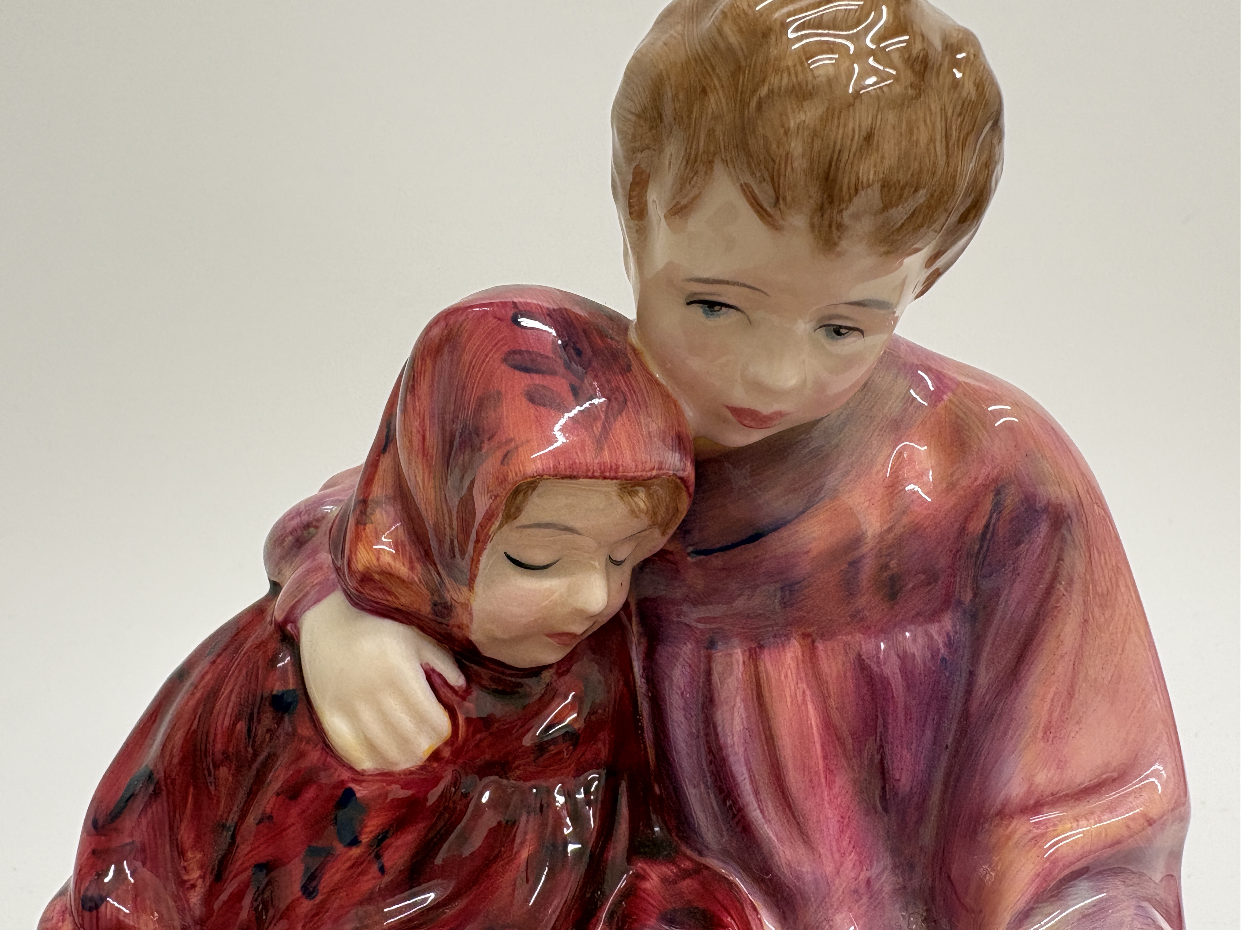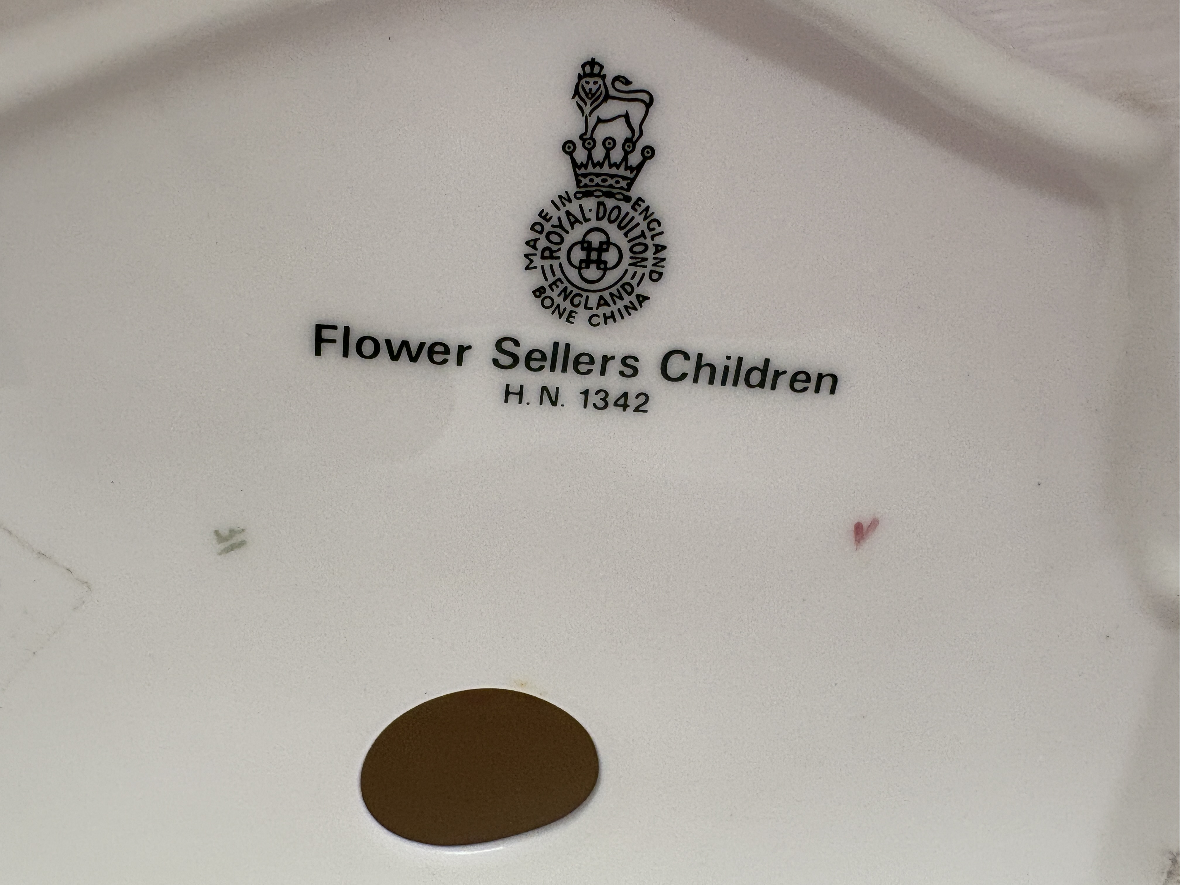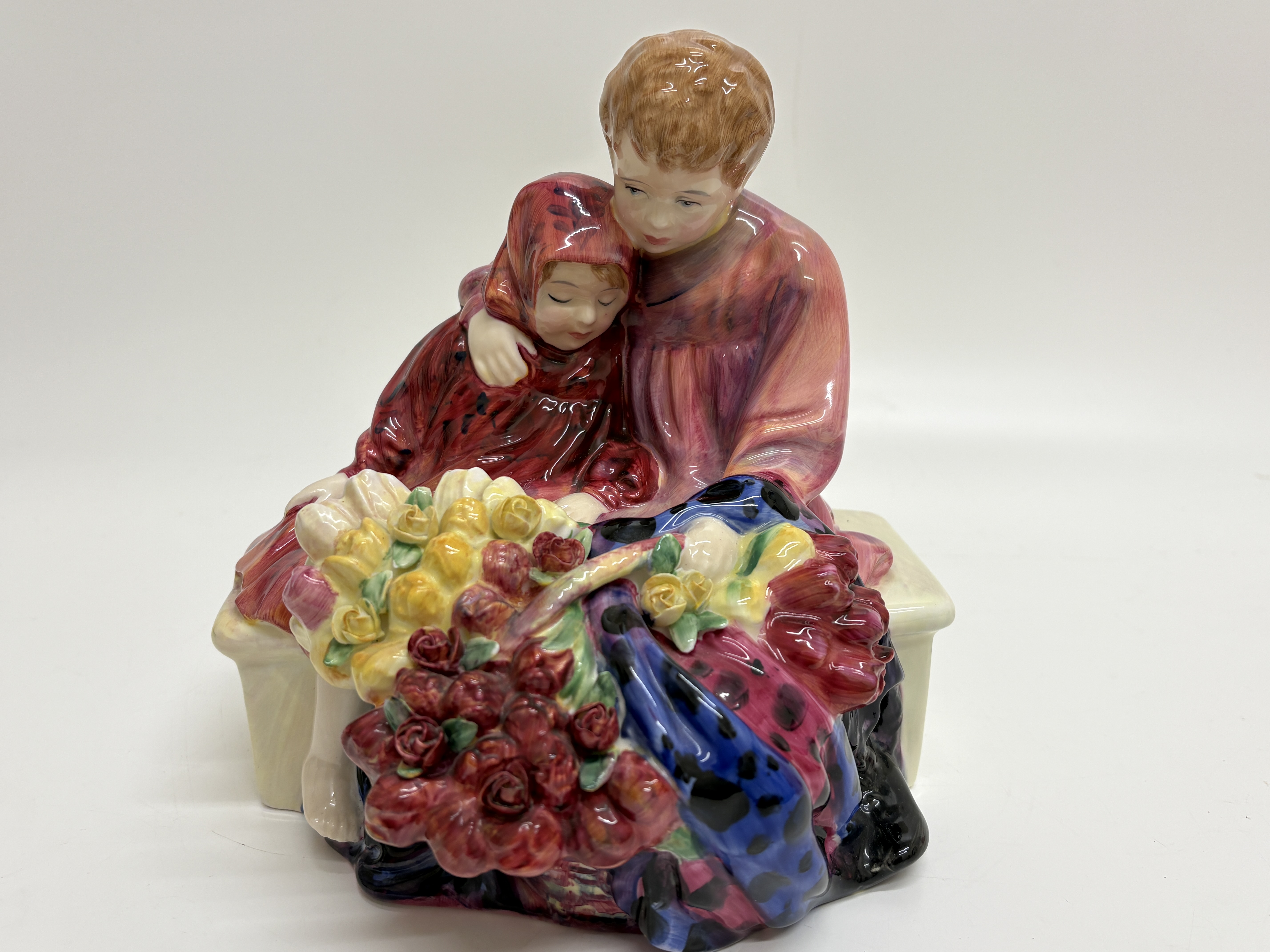 A fine Royal Doulton bone china figurine titled Flower Sellers Children, model number HN 1342. This classic study depicts two siblings seated upon a low, off-white bench. The older boy, dressed in a purple-toned tunic, protectively embraces a younger girl wearing a deep red dress and matching headscarf. In the foreground sits an oversized basket overflowing with a vibrant assortment of hand-modelled flowers, including red and yellow roses and pink tulips. The piece features rich, multi-tonal glazes and expressive facial features. The underside bears the standard Royal Doulton lion-and-crown backstamp in black underglaze, along with the title and model number. Includes a small green hand-painted decorator mark, possibly 31, and a minor pinkish pigment mark from the artist’s brush. Height: 16.5 cm.