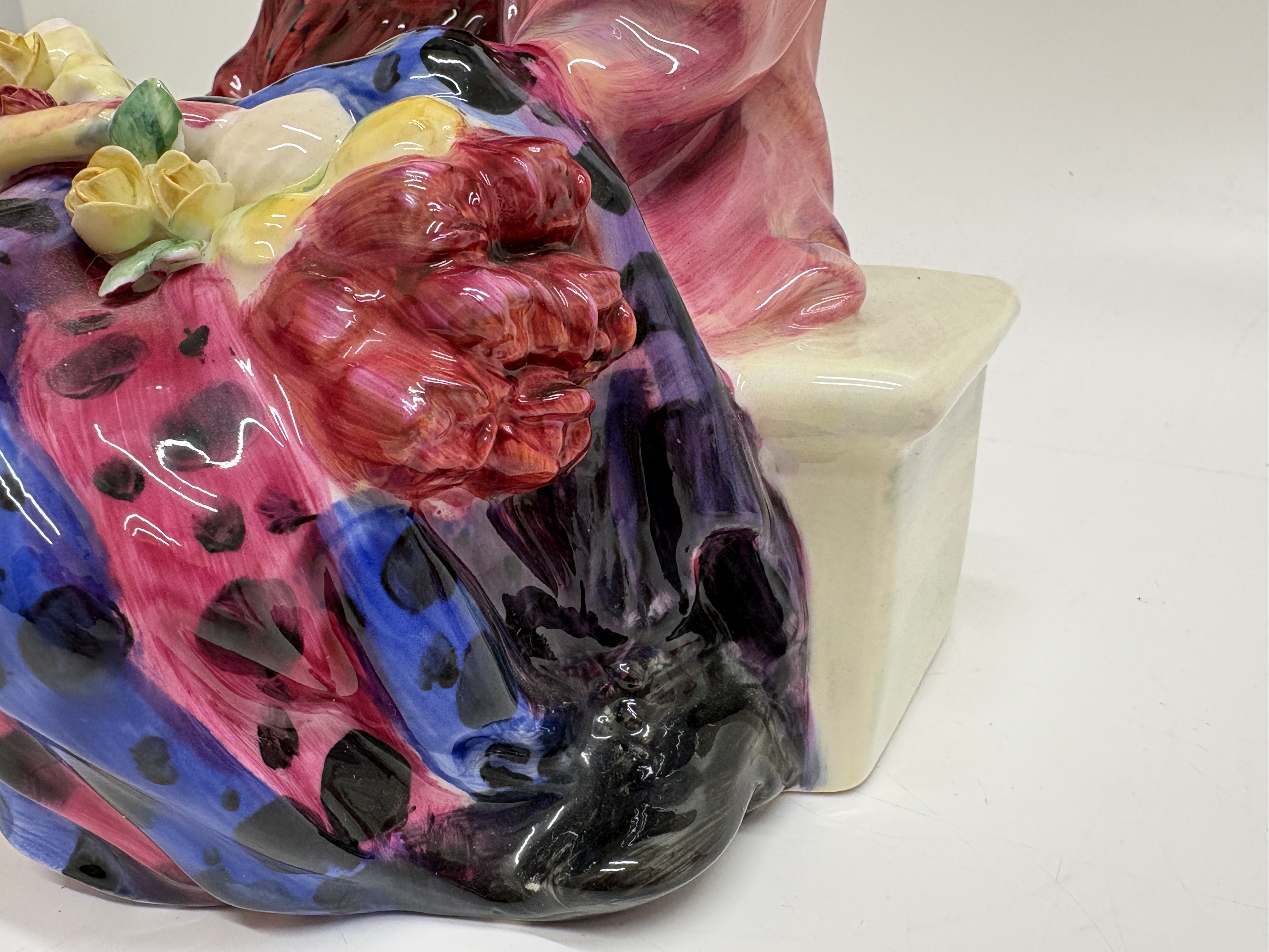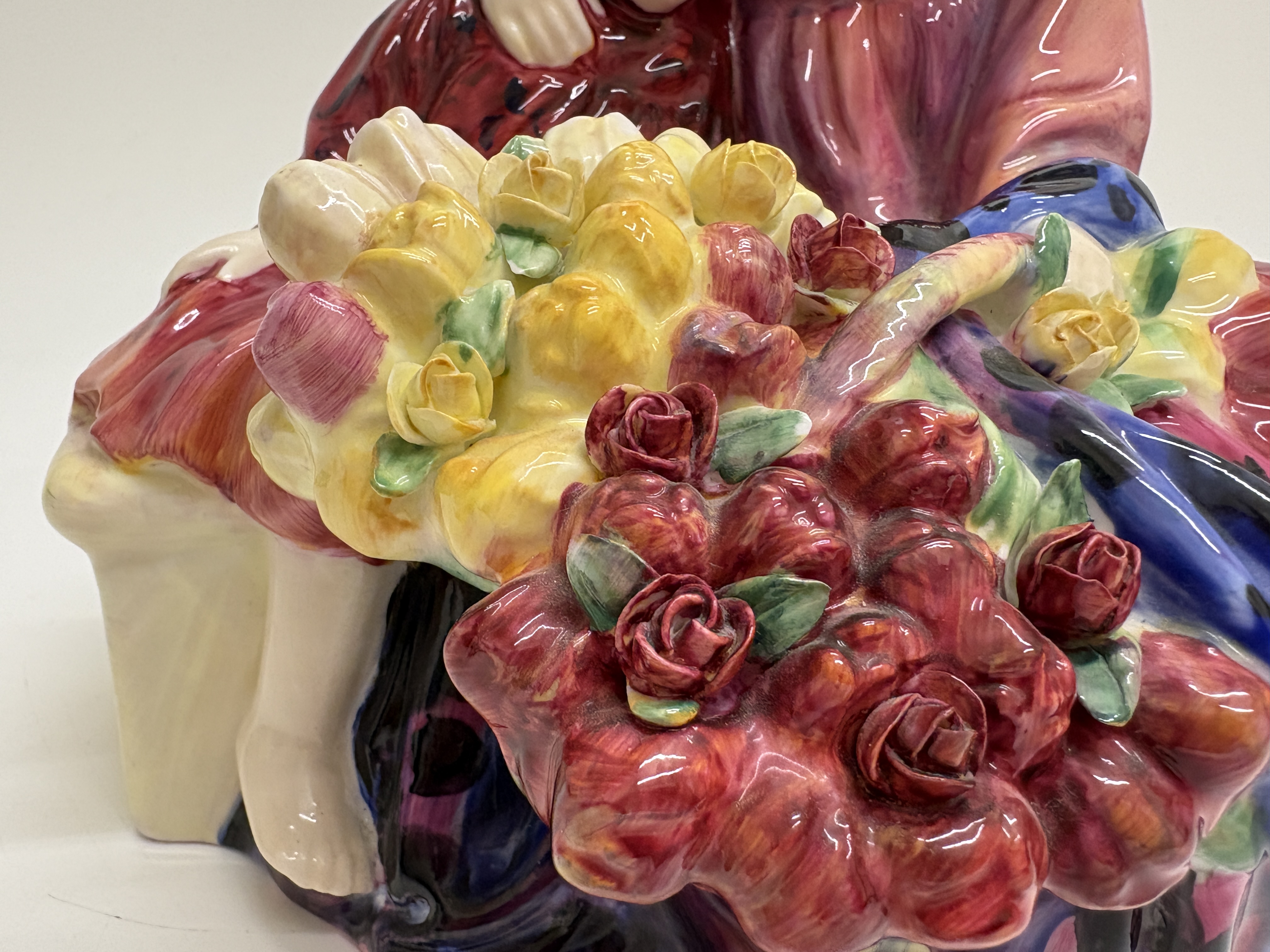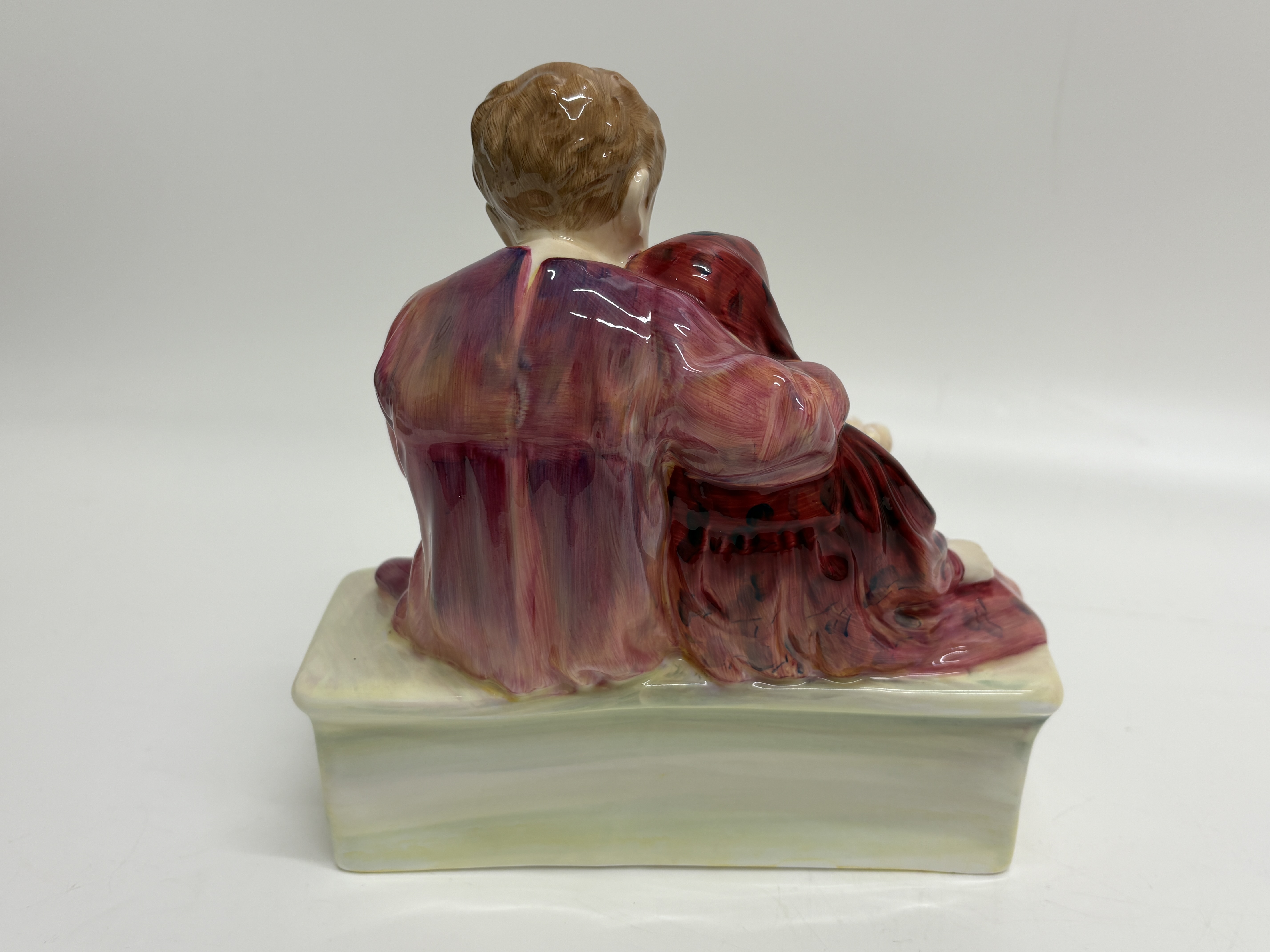 A fine Royal Doulton bone china figurine titled Flower Sellers Children, model number HN 1342. This classic study depicts two siblings seated upon a low, off-white bench. The older boy, dressed in a purple-toned tunic, protectively embraces a younger girl wearing a deep red dress and matching headscarf. In the foreground sits an oversized basket overflowing with a vibrant assortment of hand-modelled flowers, including red and yellow roses and pink tulips. The piece features rich, multi-tonal glazes and expressive facial features. The underside bears the standard Royal Doulton lion-and-crown backstamp in black underglaze, along with the title and model number. Includes a small green hand-painted decorator mark, possibly 31, and a minor pinkish pigment mark from the artist’s brush. Height: 16.5 cm.