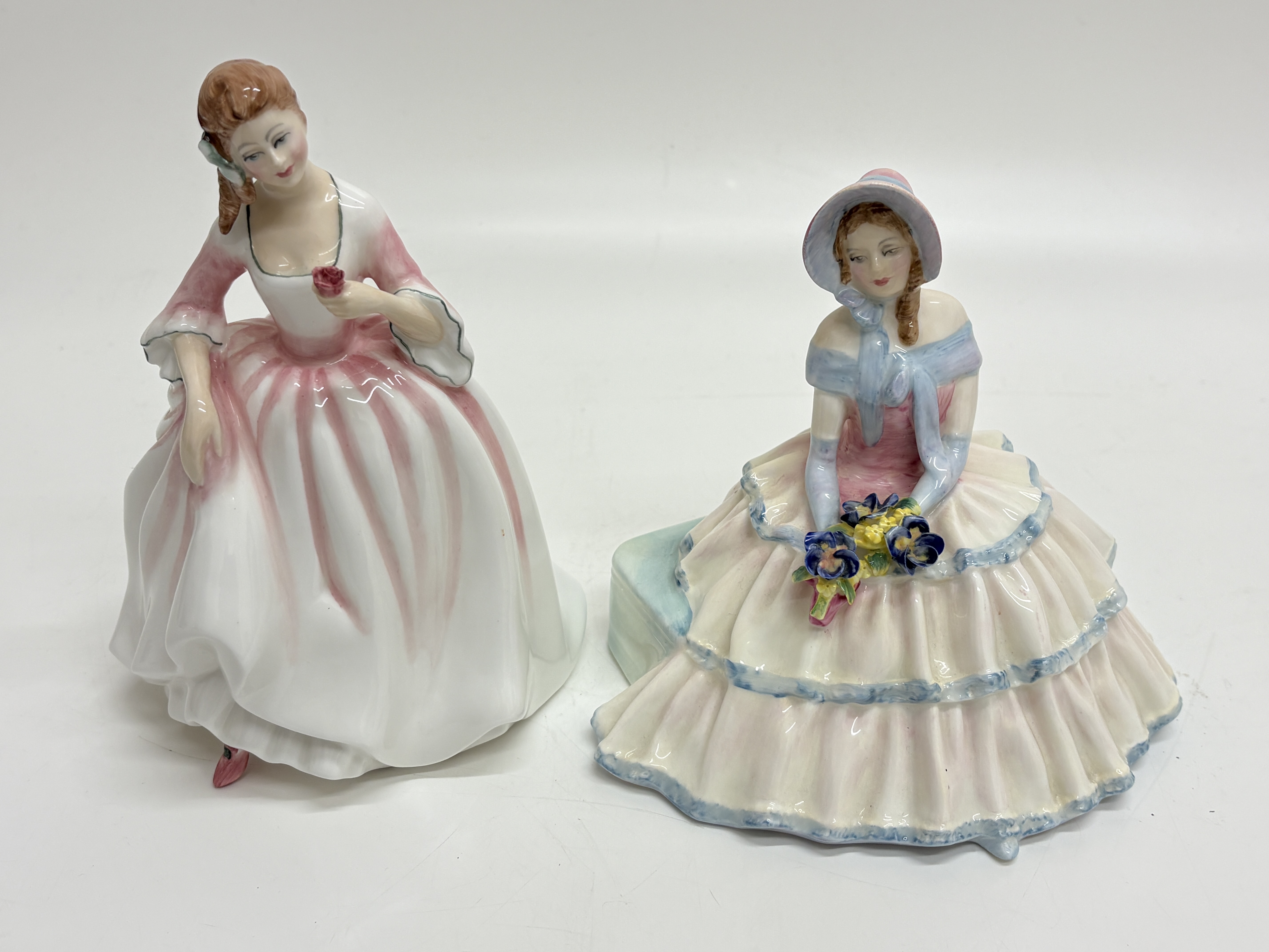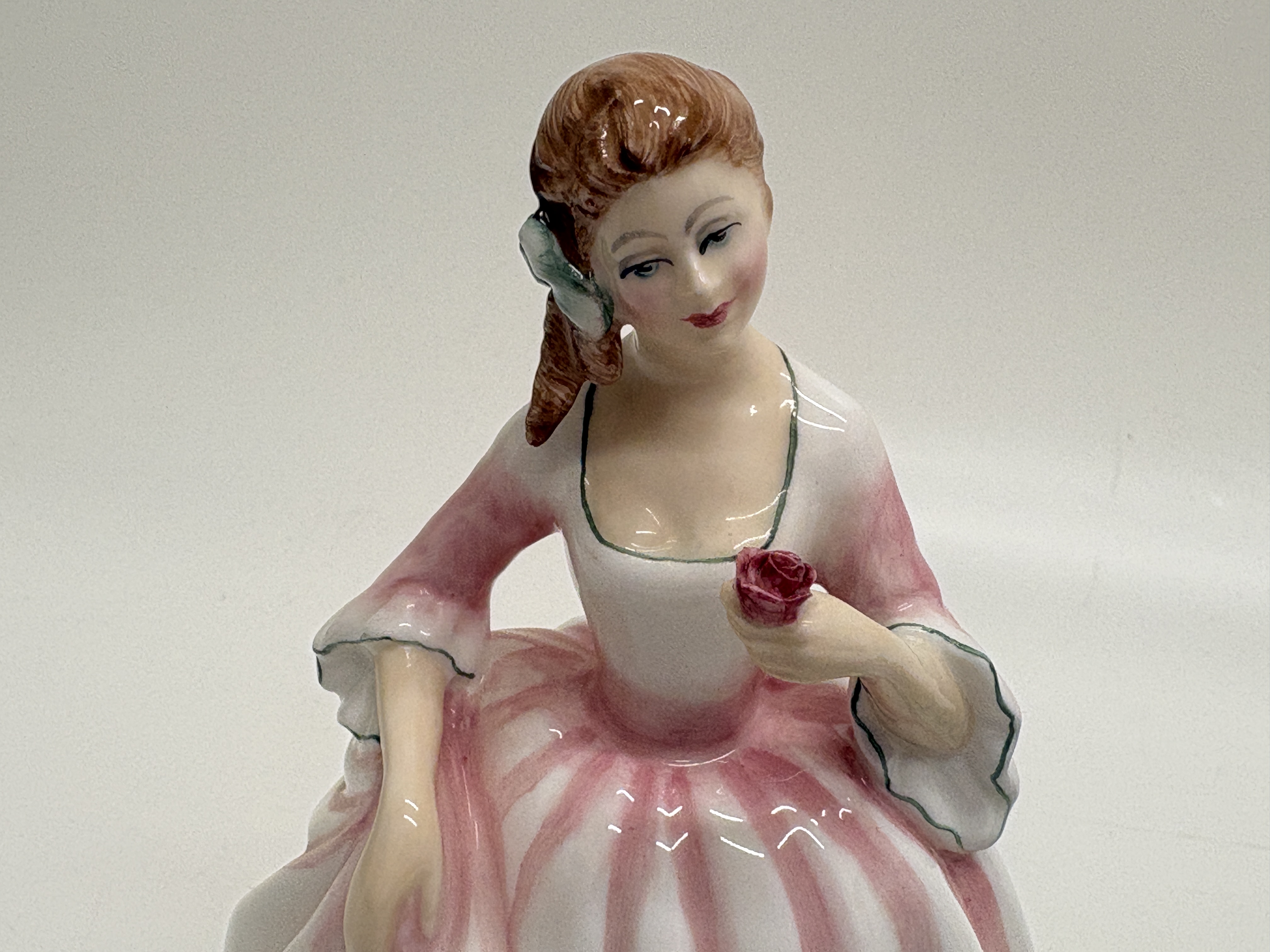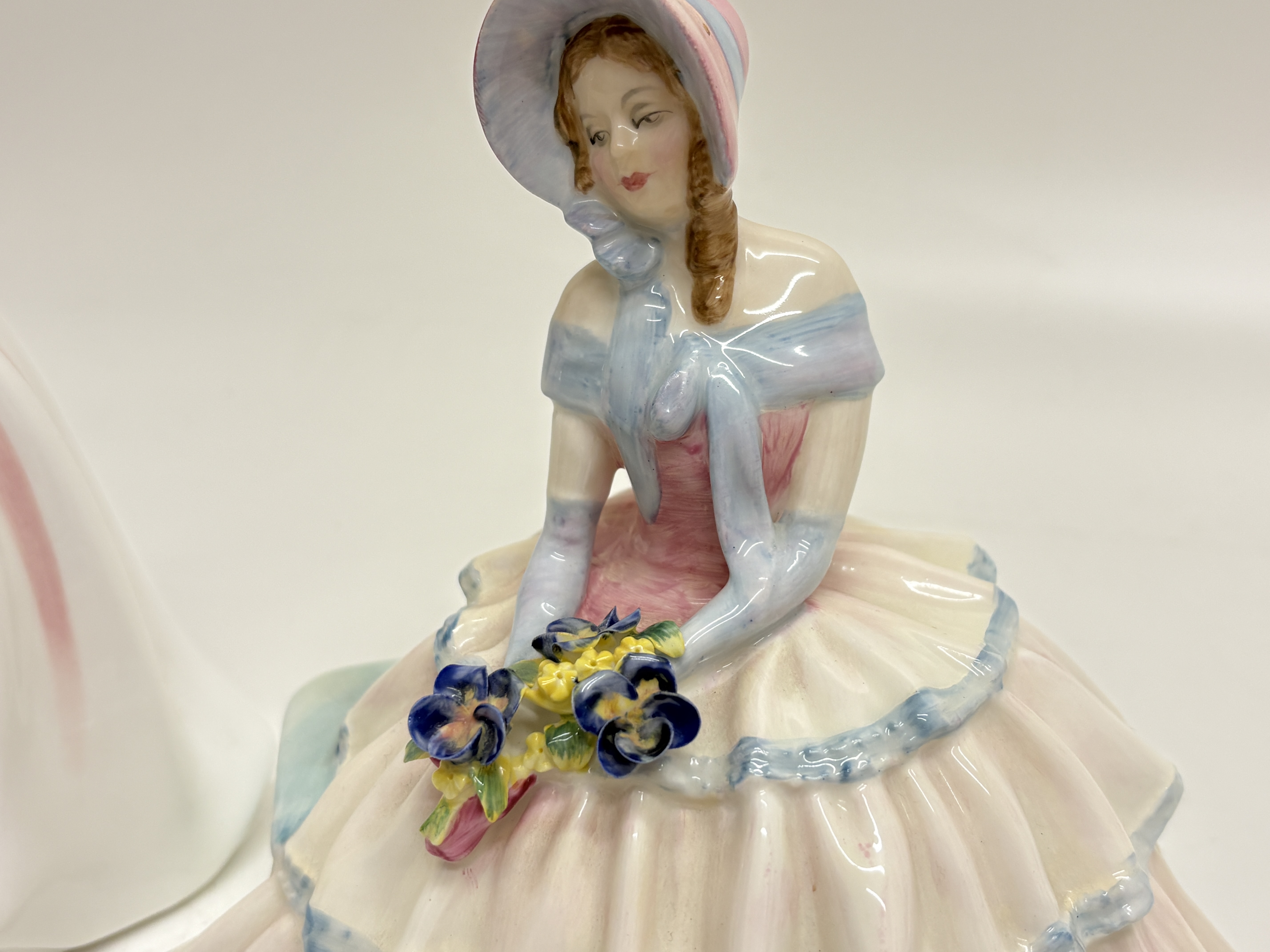A pair of Royal Doulton fine bone china figurines, hand-made and hand-decorated in England. The first, titled Tender Moment (HN 3303), was modelled by Peggy Davies and issued in 1990; it depicts a standing young woman in an 18th-century style gown featuring pink vertical stripes and white panels, holding a single red rose in her left hand. The base carries the standard Royal Doulton lion and crown mark along with two red decorator brush strokes. The second, titled Daydreams (HN 1731), was modelled by Leslie Harradine and features a seated young woman in a tiered pink and white skirt with blue trim, a pink bodice, a blue shawl, and a matching bonnet, holding a bouquet of yellow and blue flowers. The base includes the factory mark, a facsimile signature for Leslie Harradine, a handwritten black H, and a grey stamped A. This example of Daydreams represents a later production of the classic 1935 design. Tender Moment height 18.5cm, Daydreams height 15cm.