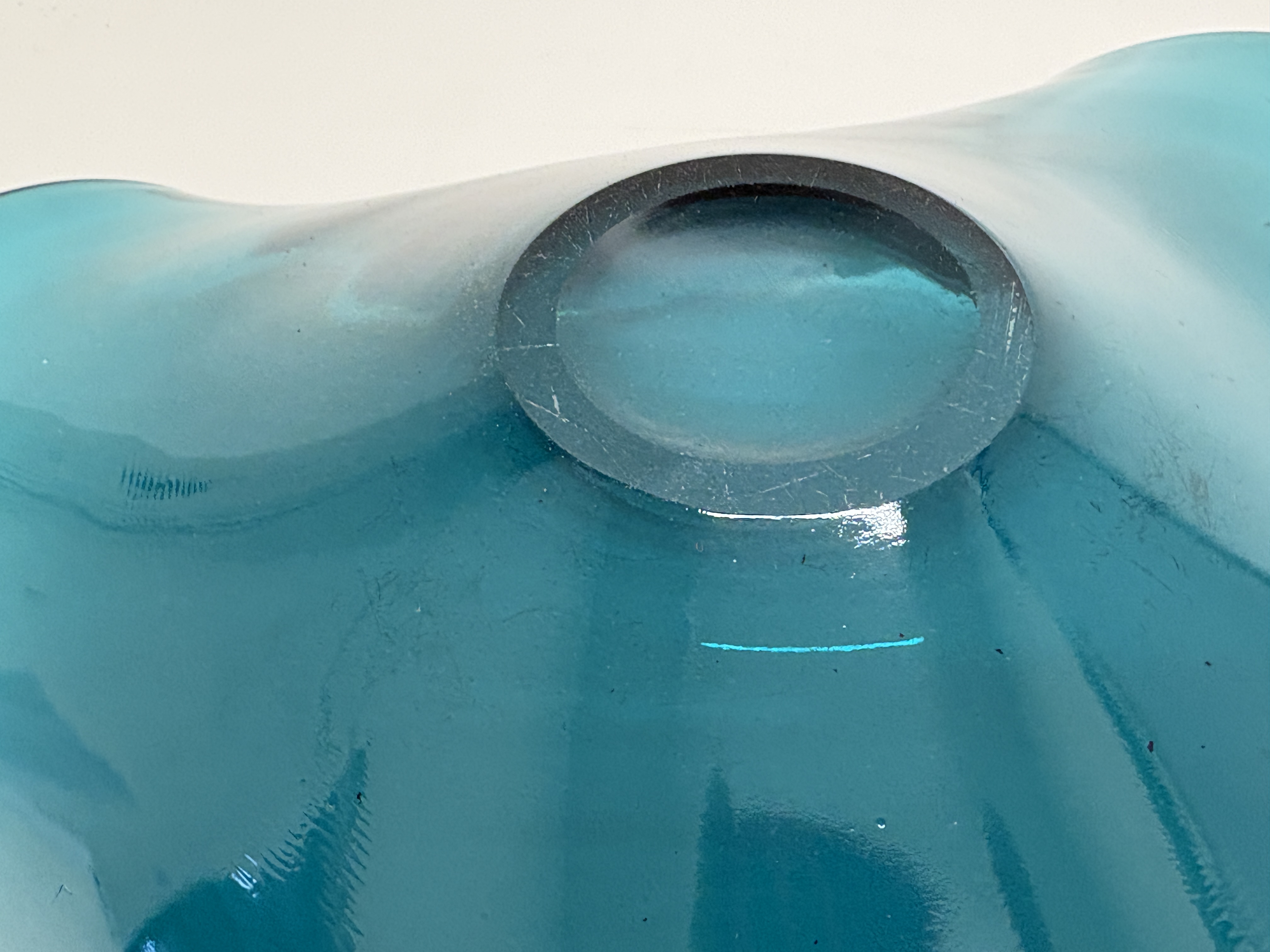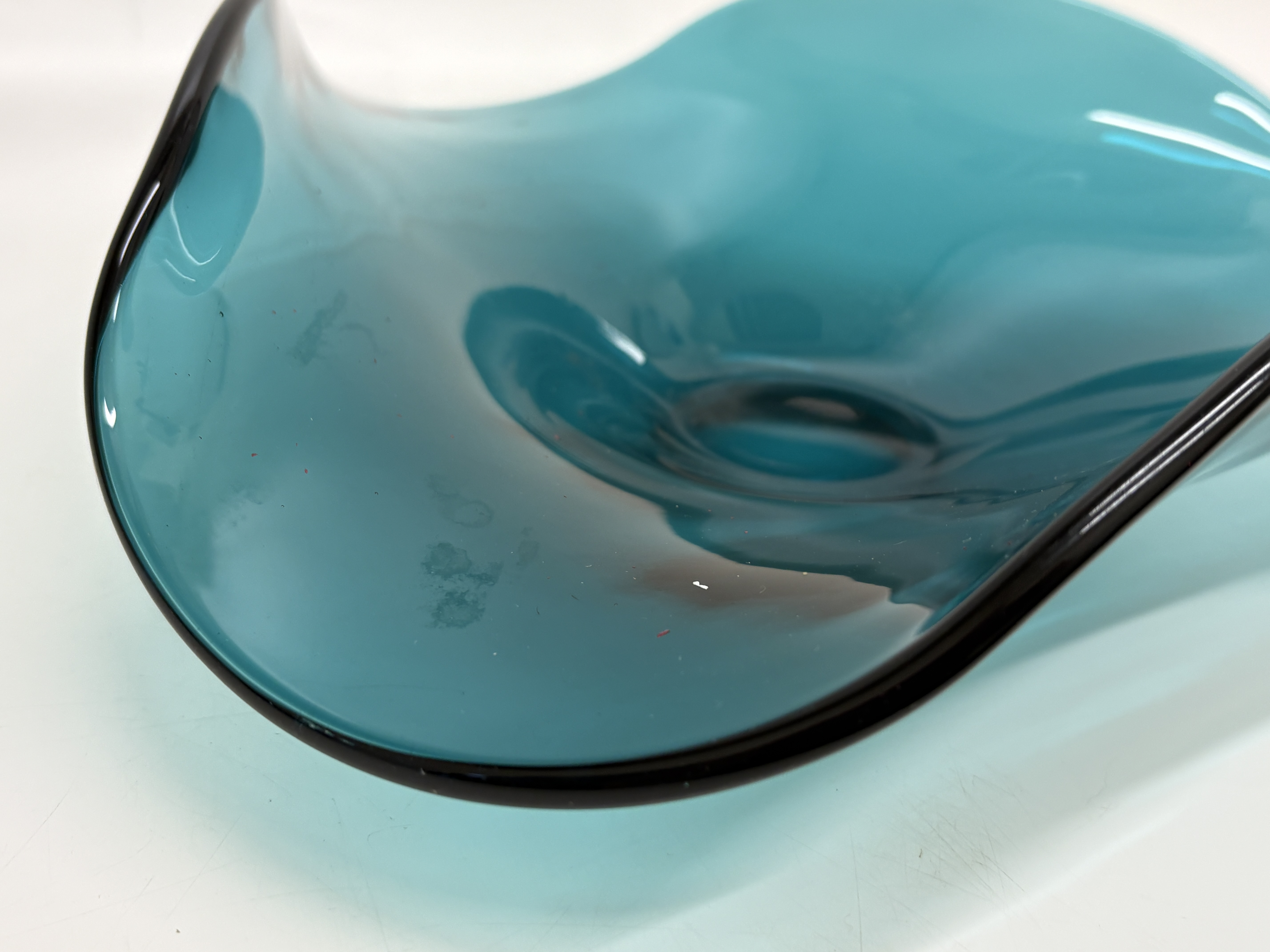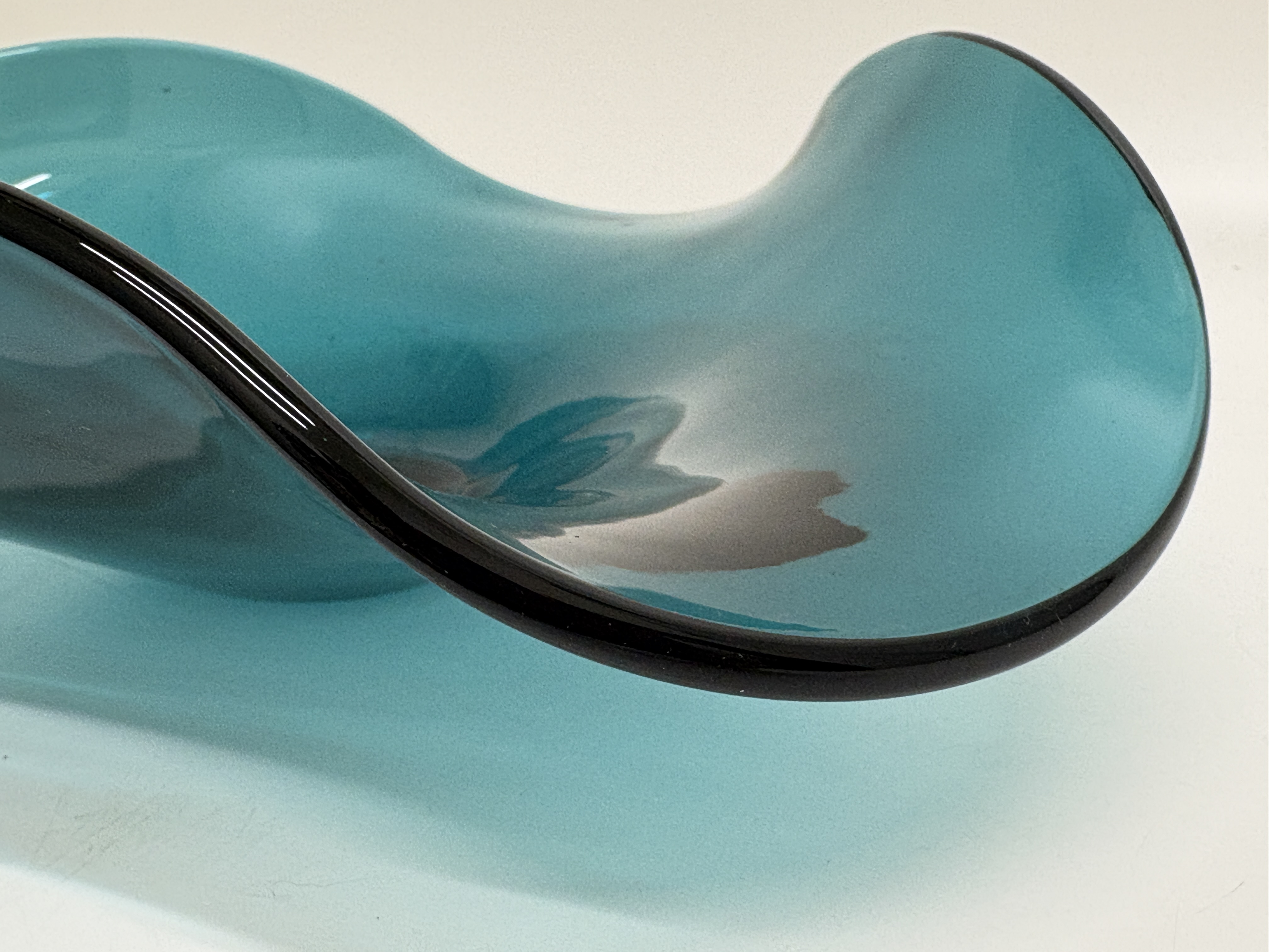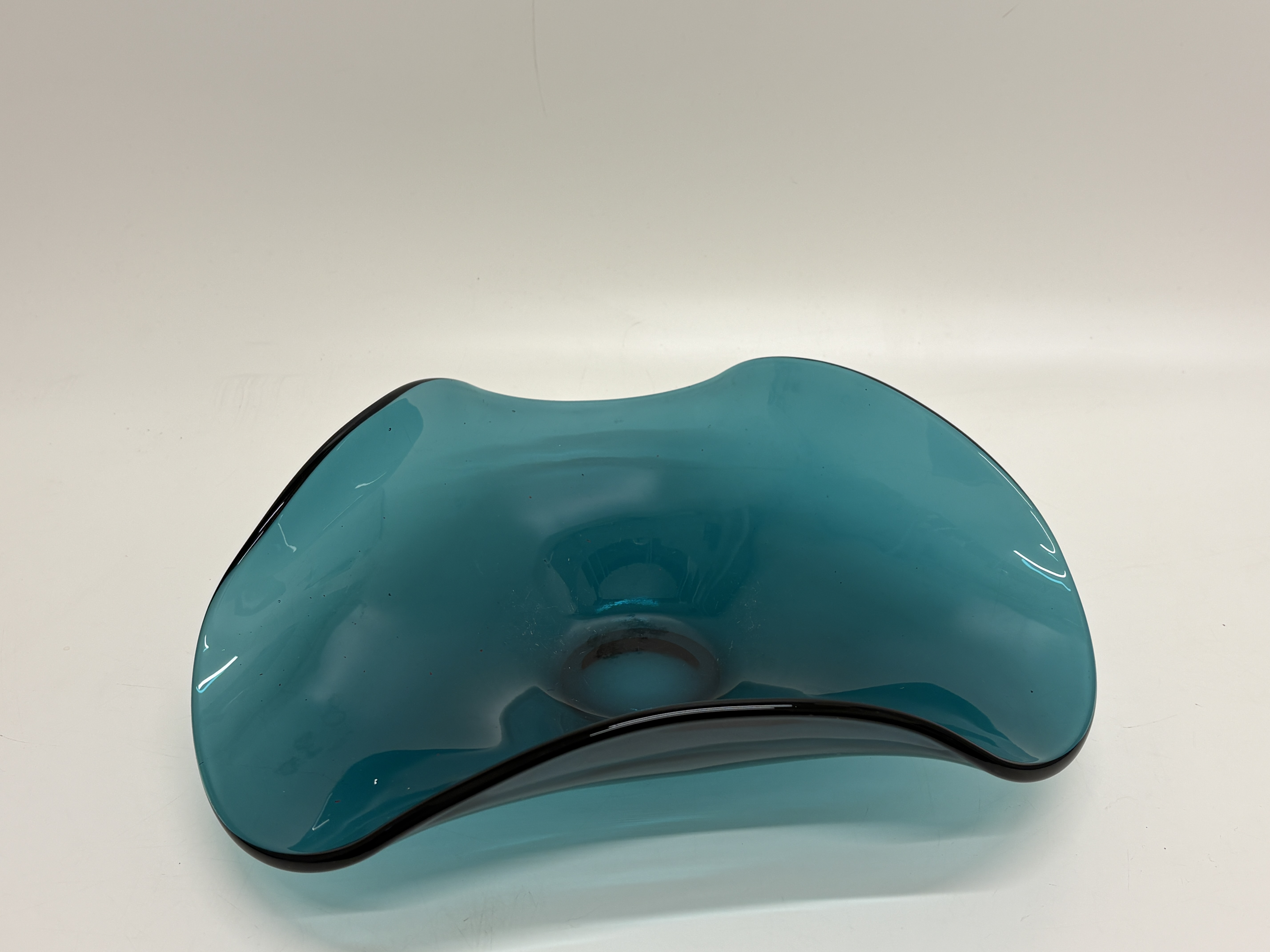 A large hand-blown art glass bowl from the Lenox Organics collection. This biomorphic piece features a striking turquoise blue non-lead crystal body with a characteristic undulating, wavy rim. The edge is finished with a thin, applied cased border in a contrasting deep black or amethyst tone. The form is reminiscent of Mid-Century Modern design but is a contemporary production by Lenox. The underside features a ground-flat circular base where the pontil mark has been professionally finished. No visible signatures or labels are present, which is common for this range after the removal of original adhesive stickers. Dimensions: Approximately 28 cm diameter.