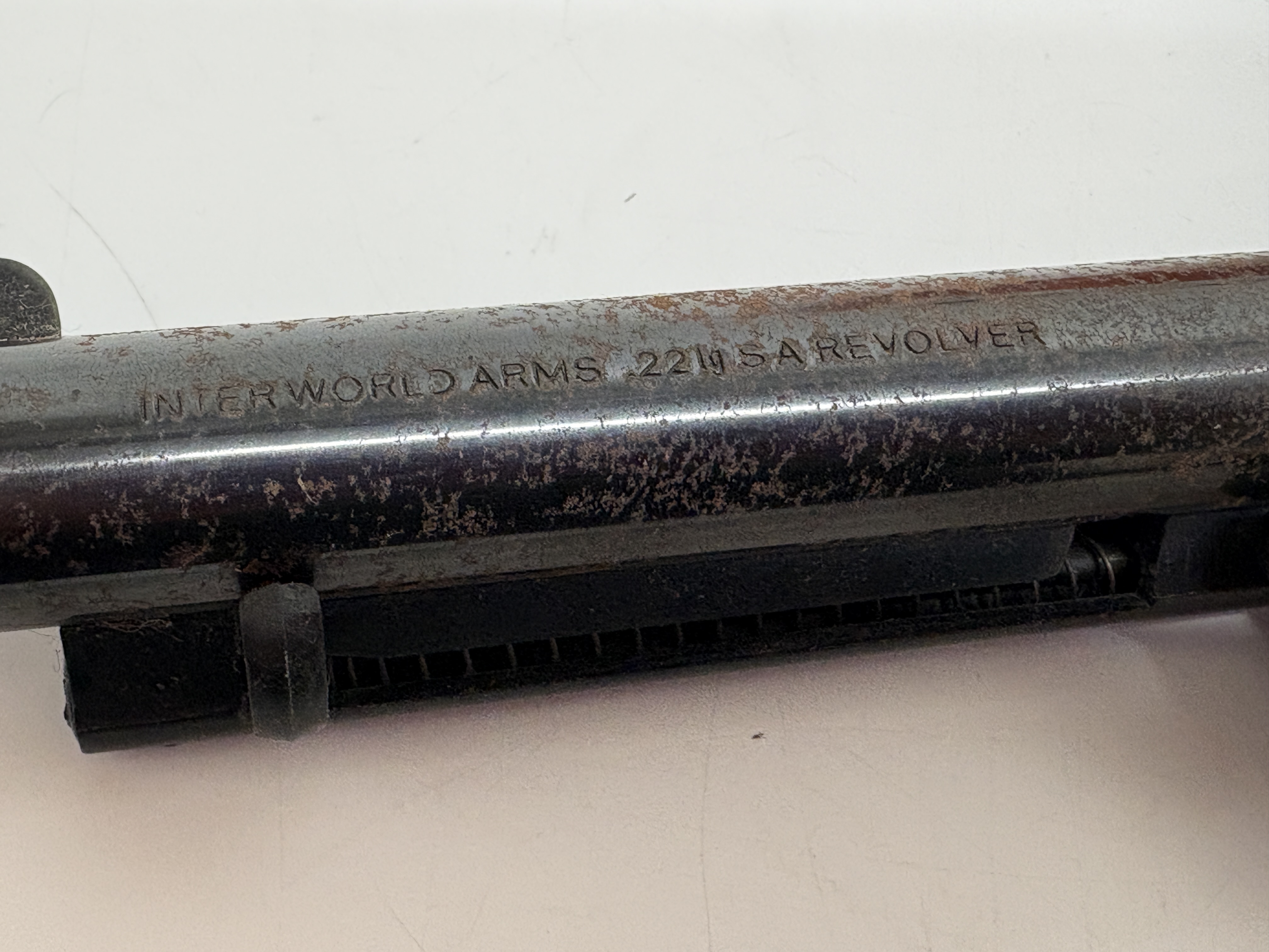 Two-piece wooden grips inset with IWA medallions, 5.5-inch round barrel marked INTER WORLD ARMS 22 LONG SA BLANK FIRING REVOLVER with integrated ejector rod housing, blackened finish, single-action mechanism.