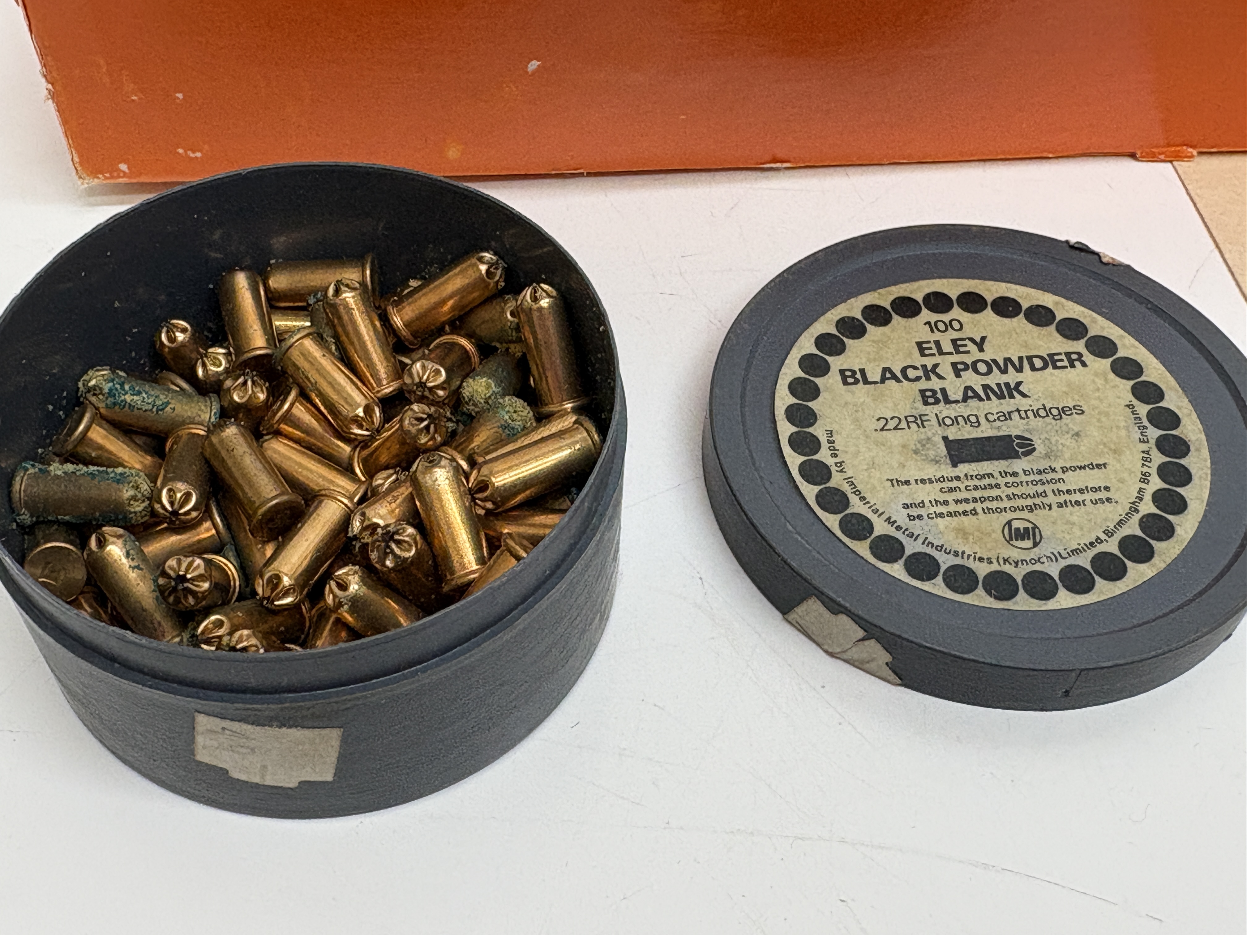 Ammunition: .22RF long black powder blanks, Eley, one tin containing a quantity of cartridges.