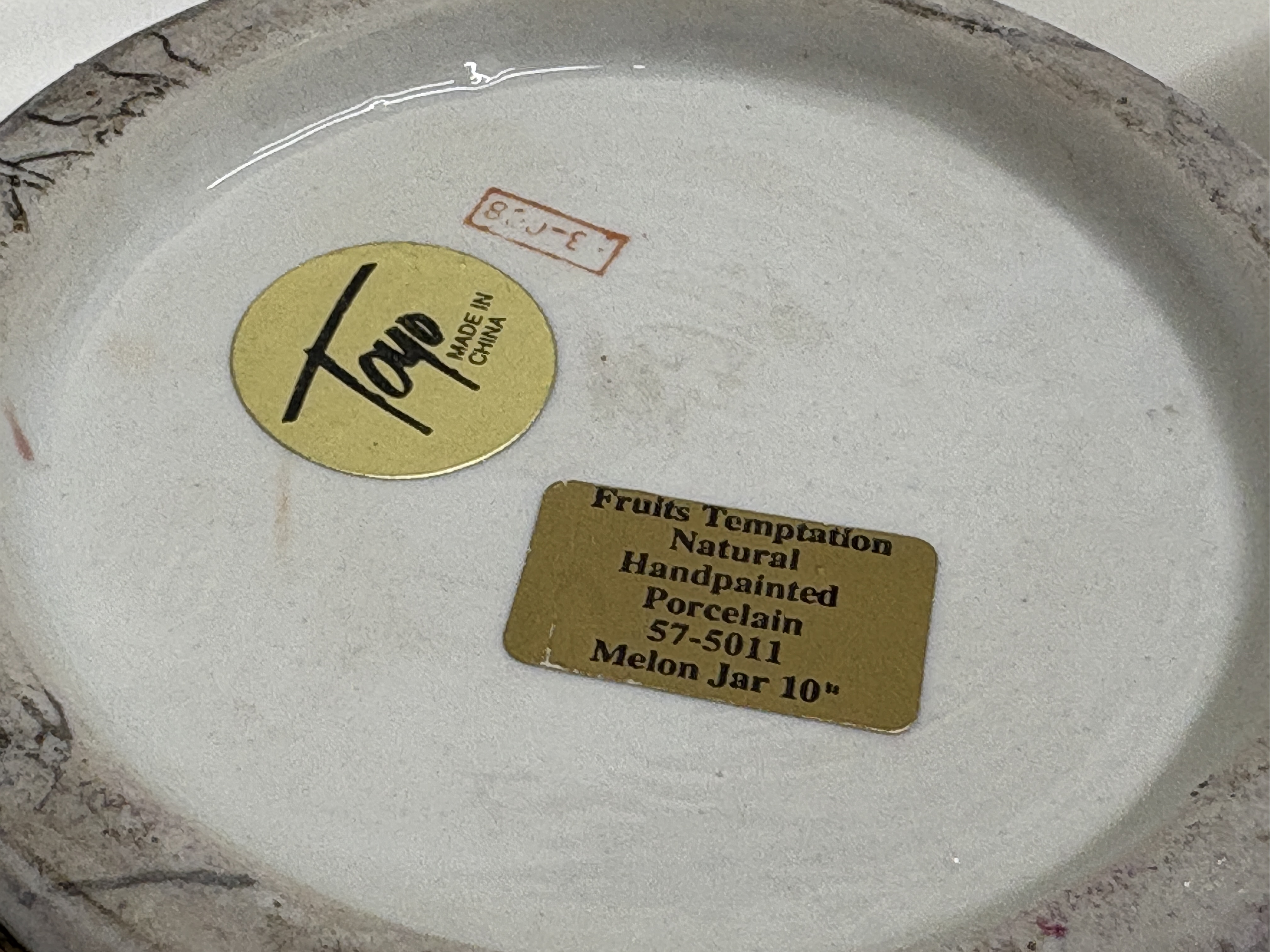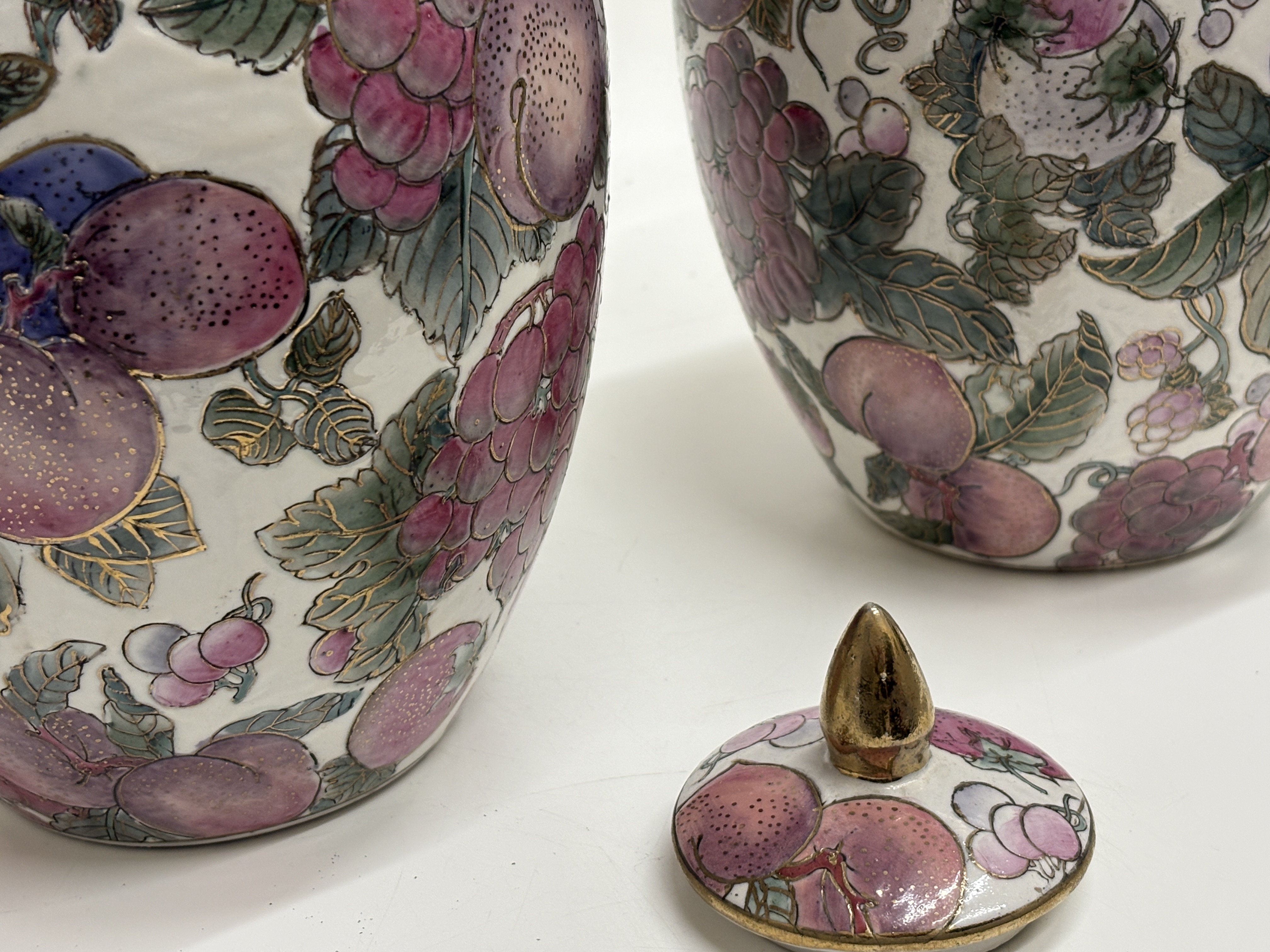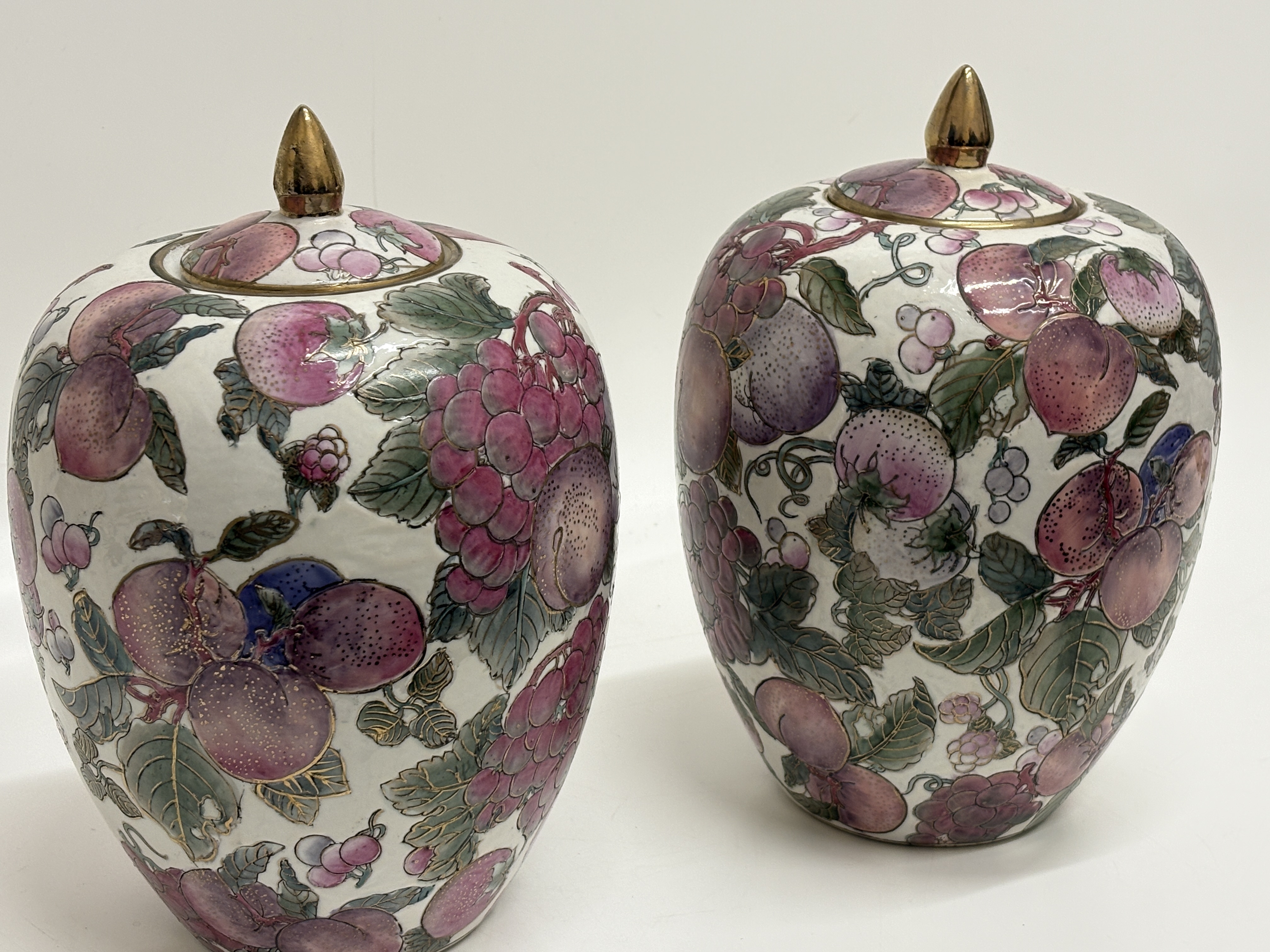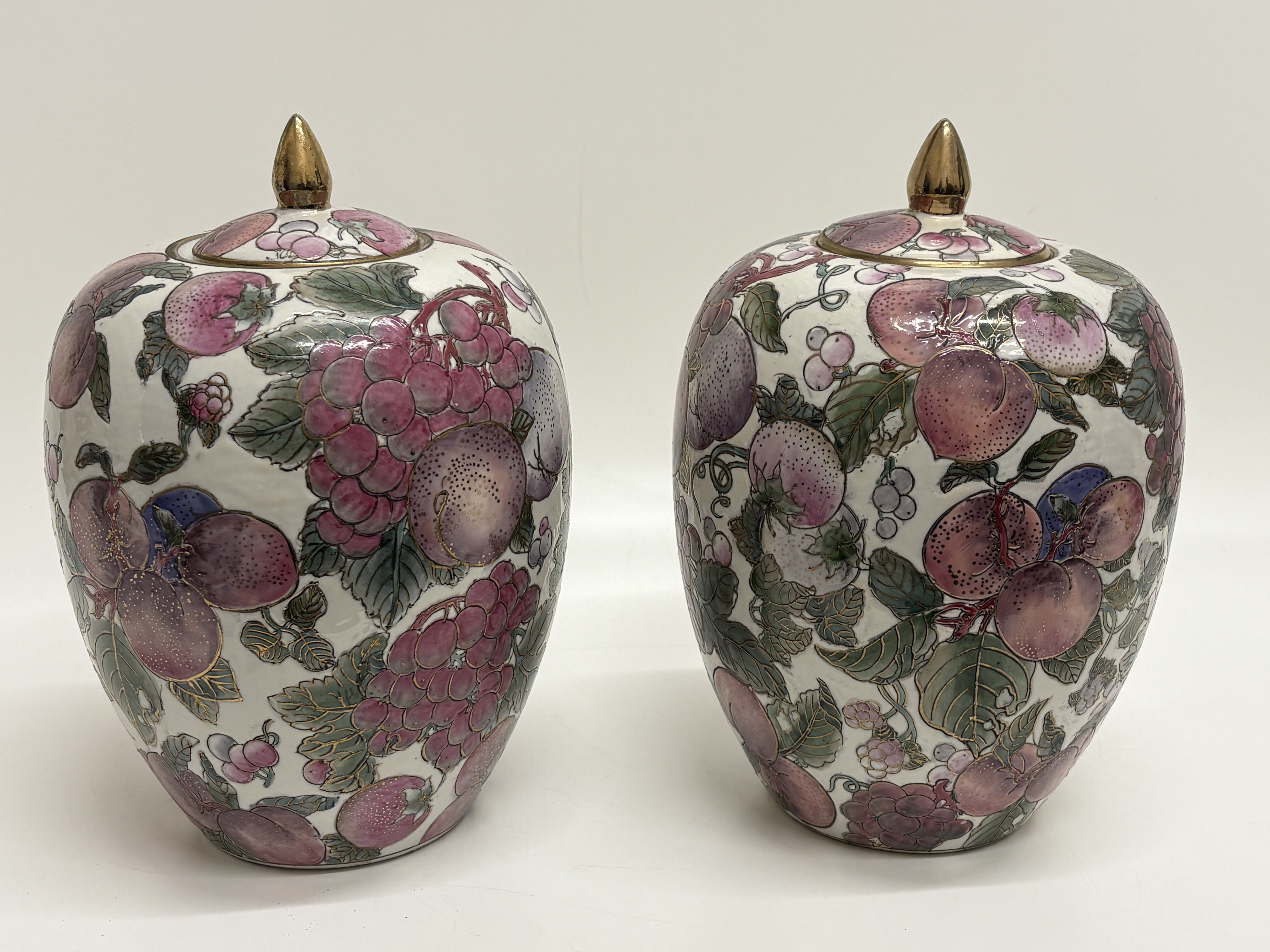 A pair of Toyo porcelain melon jars in the Fruits Temptation pattern. Each jar features an oviform body with a matching domed cover surmounted by a pointed gilt finial. The decoration consists of hand-painted polychrome enamels depicting a dense arrangement of fruit, including grapes, peaches, and berries, with shaded green foliage, all heightened with gilt outlines. The undersides retain original gold foil labels reading Toyo MADE IN CHINA and Fruits Temptation Natural Handpainted Porcelain 57-5011 Melon Jar 10″, alongside a red four-character stamped mark. Height: 10 inches.