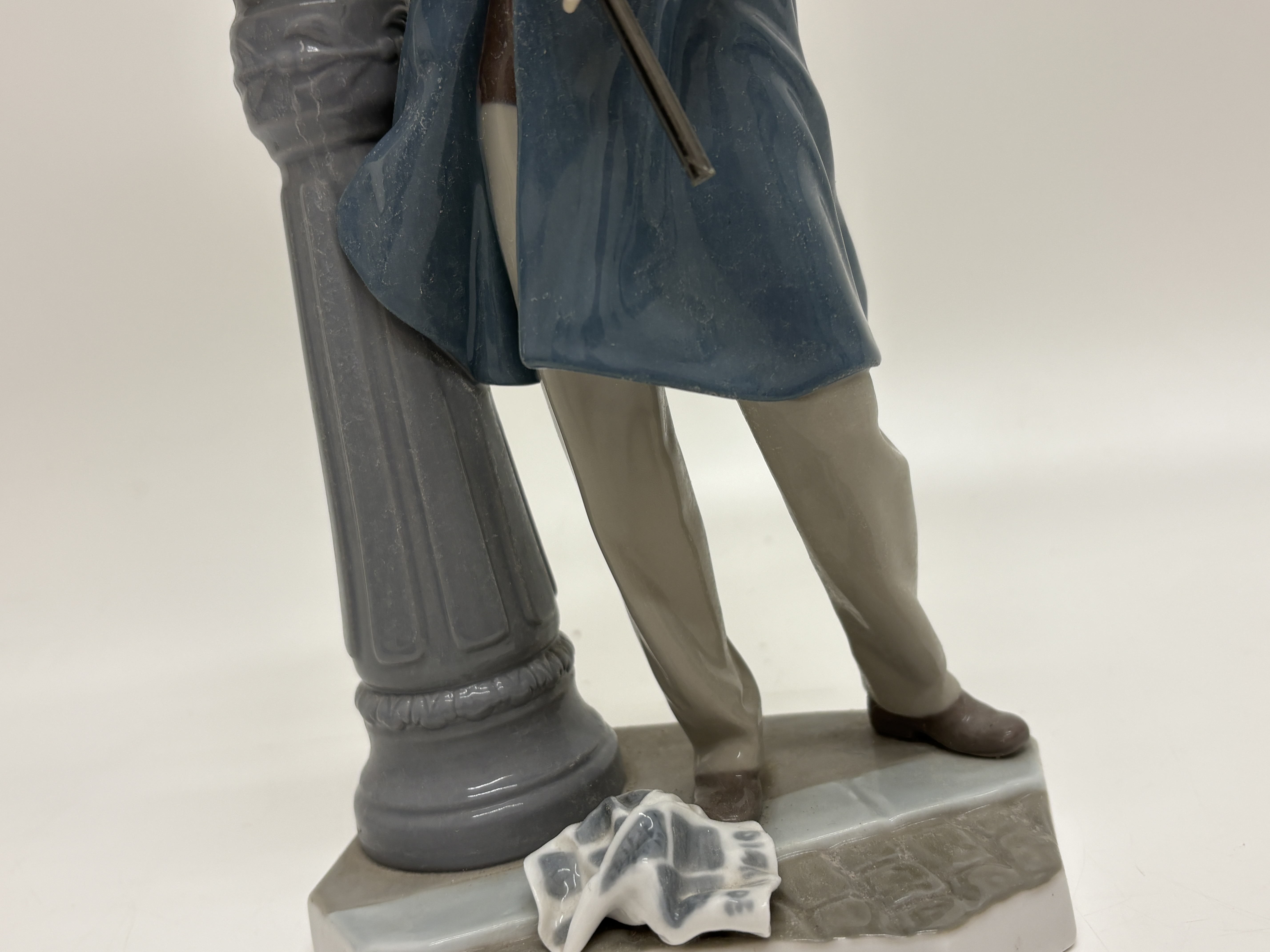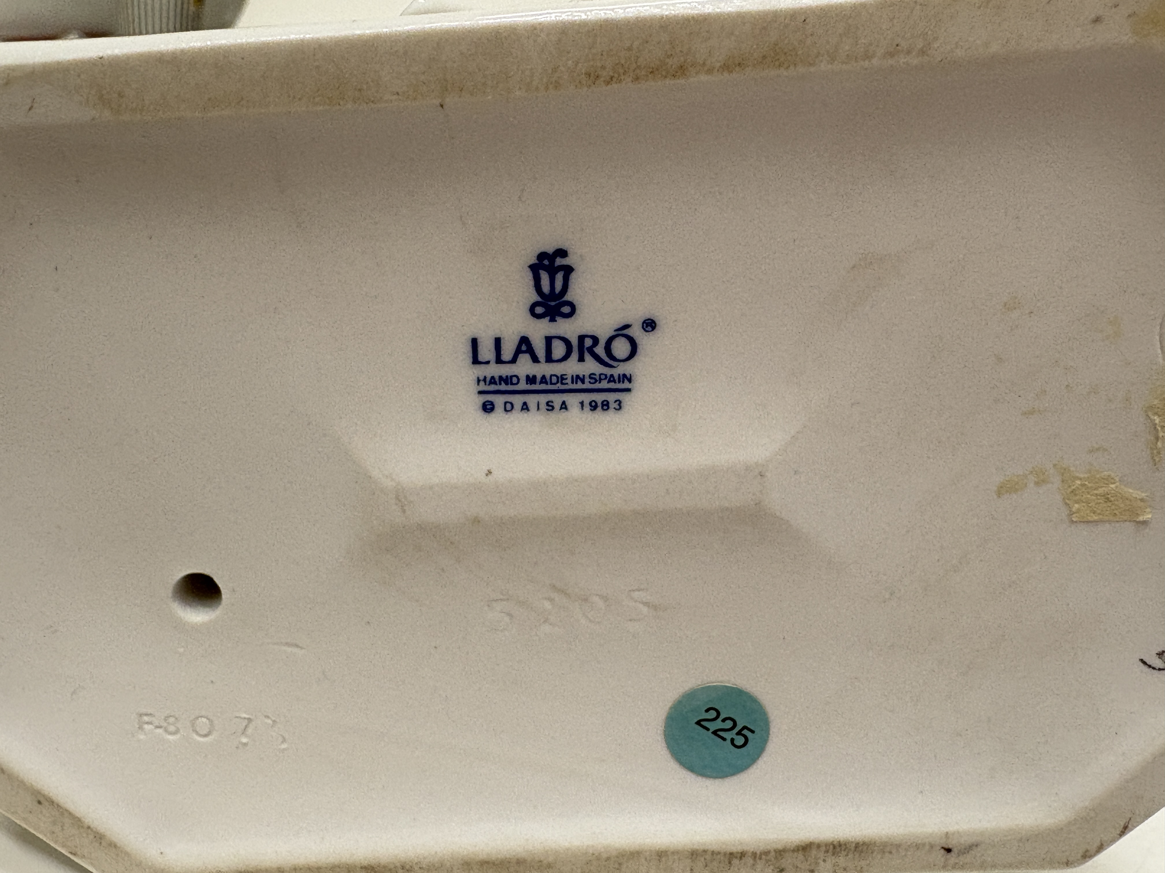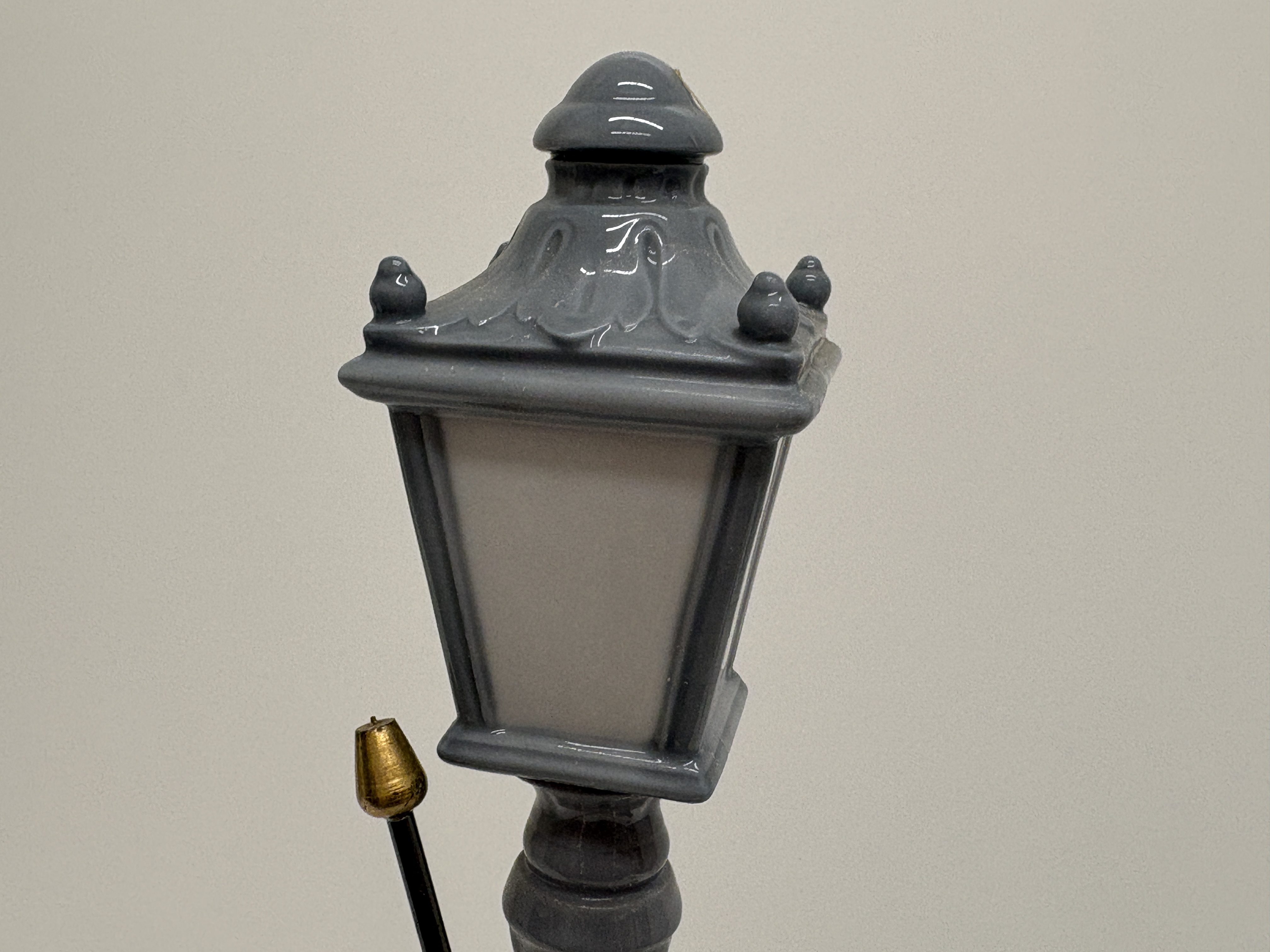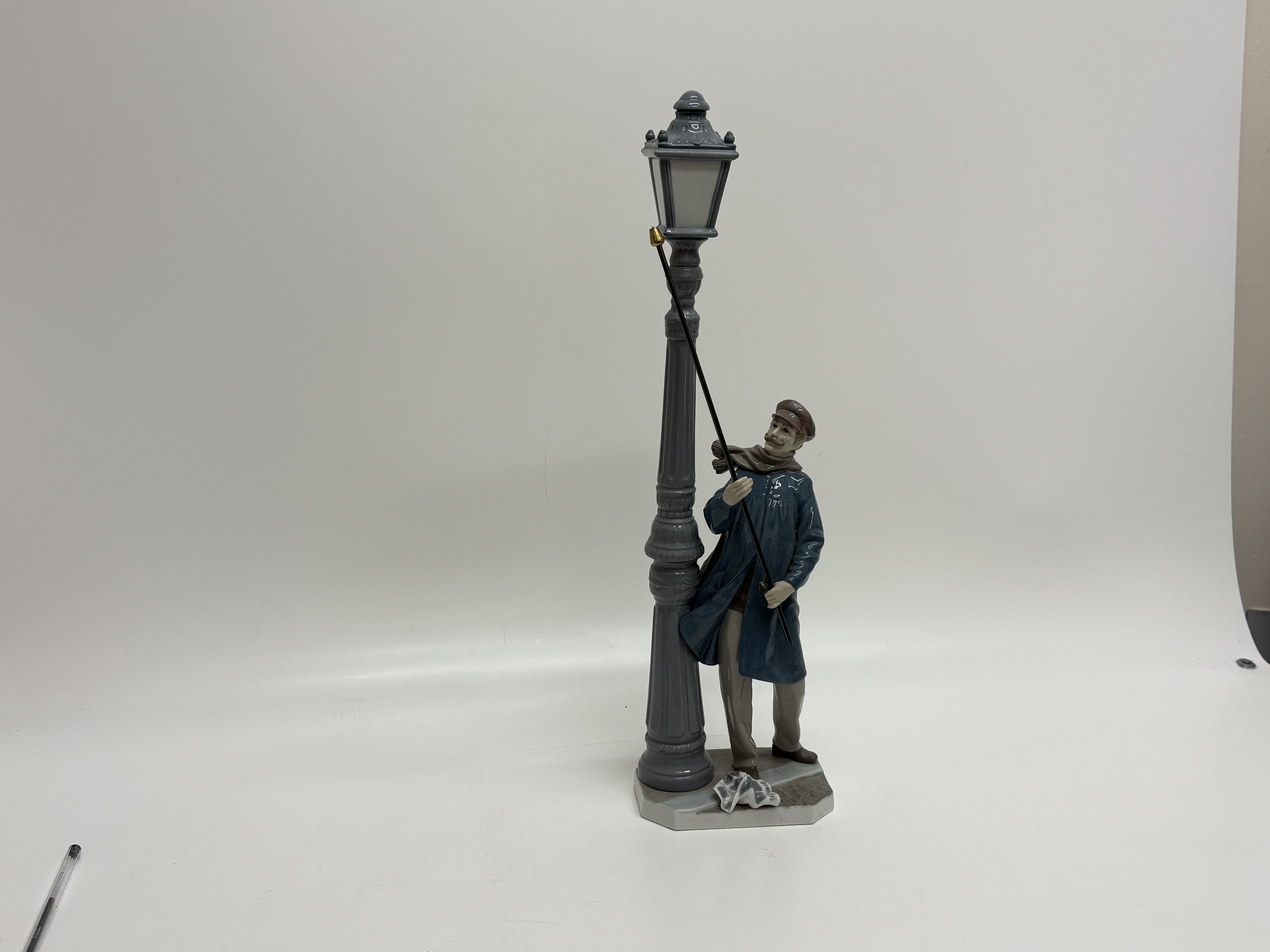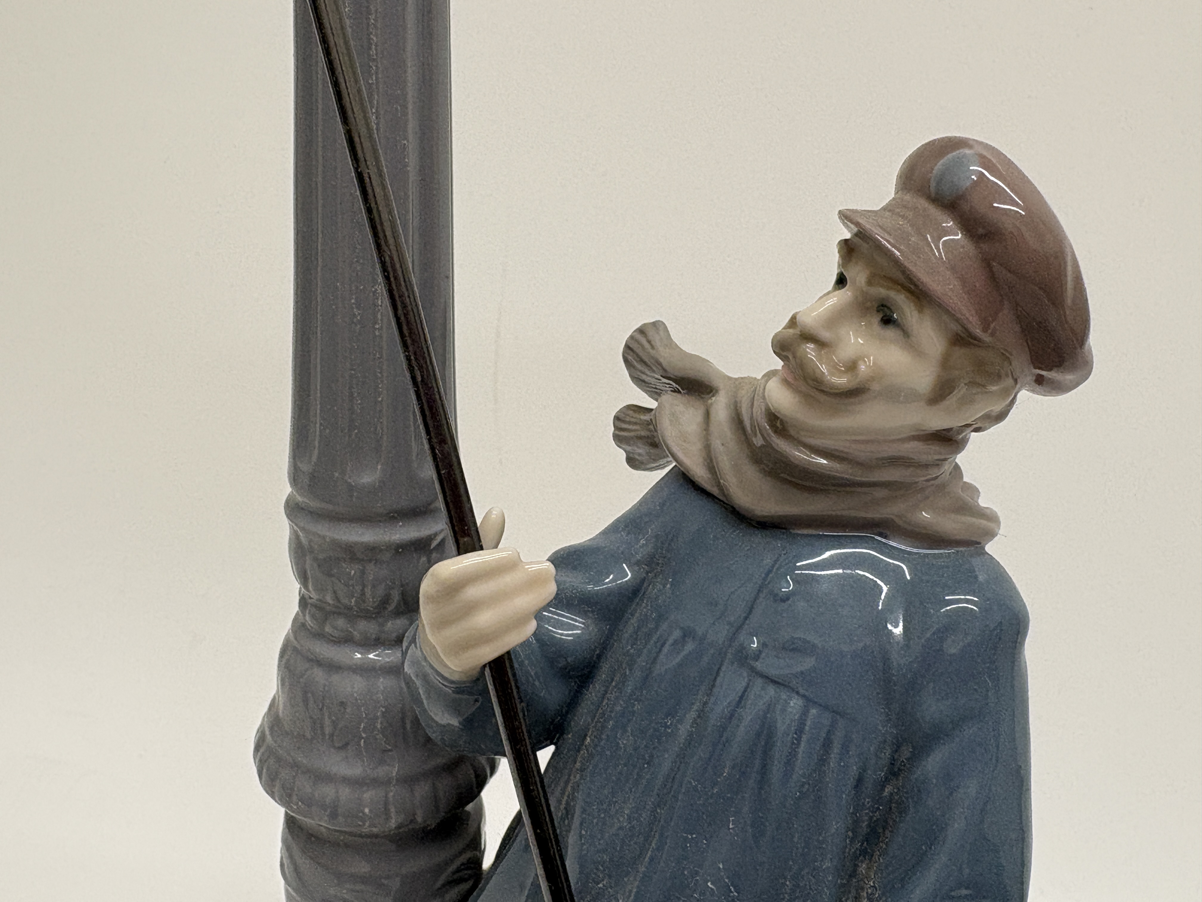 A Lladró glazed porcelain figurine titled The Lamplighter (El Farolero), model number 5205, designed by Salvador Furió. The piece depicts a moustachioed man in a blue coat, tan trousers, and a wind-swept brown scarf and cap, leaning against a tall grey street lamp. He is shown holding a long black lighting rod with a gold-toned tip, standing on a base detailed with a cobblestone pattern and a discarded newspaper. The underside features the blue Lladró bellflower mark, Hand Made in Spain, and Daisa 1983. It is incised with the model number 5205 and F-30 Z, and includes a small blue sticker numbered 225. Height: 48 cm.