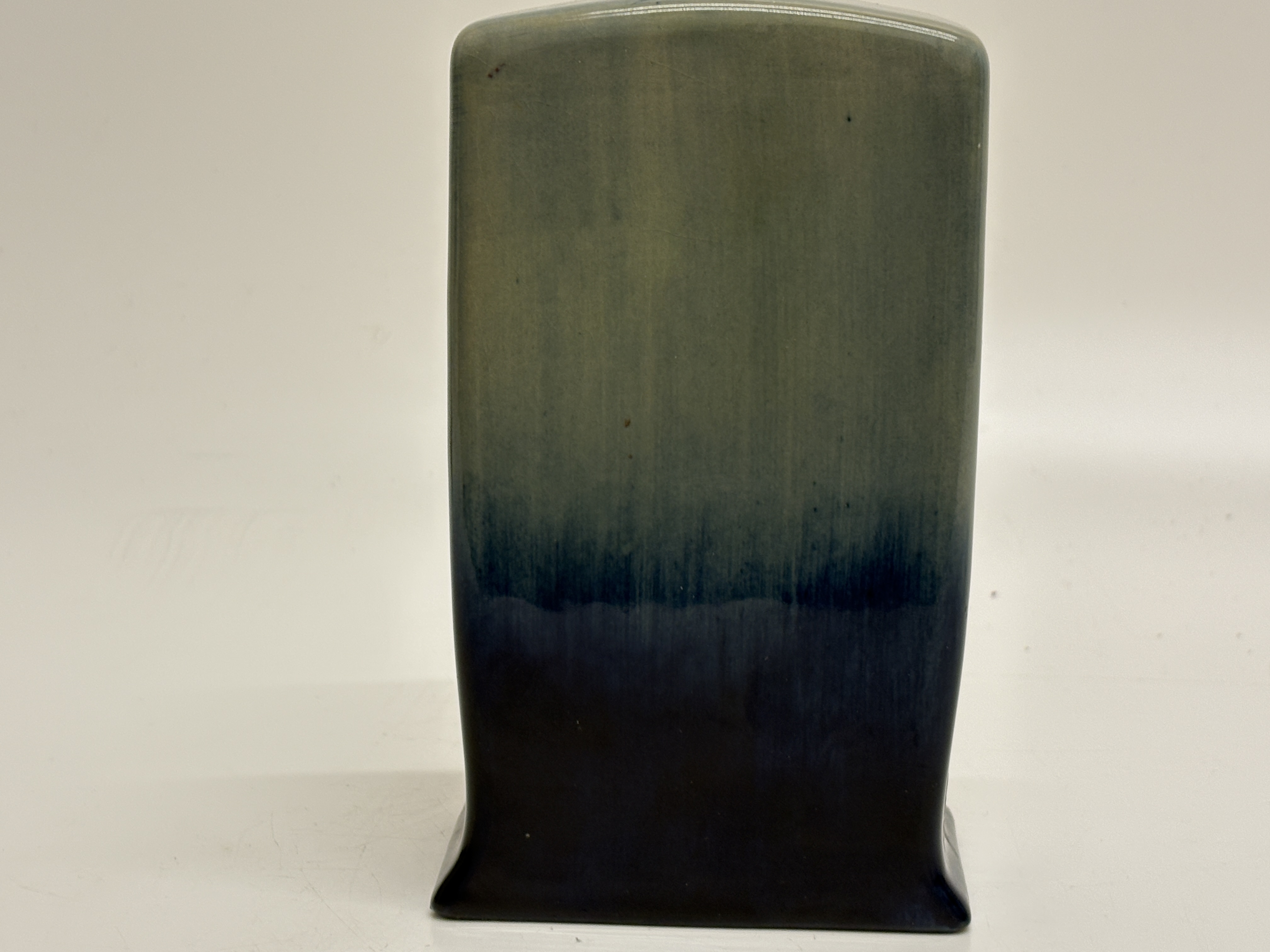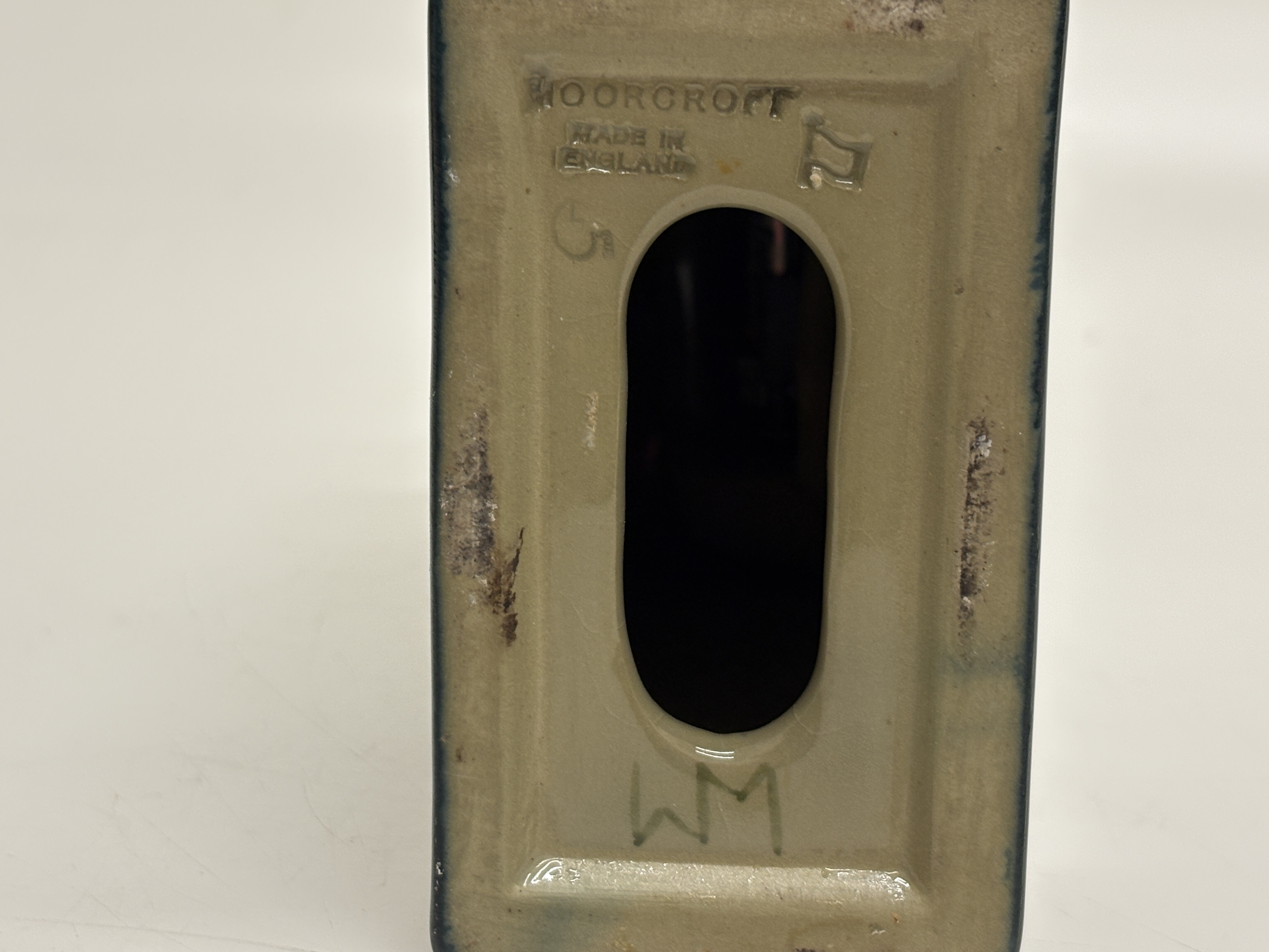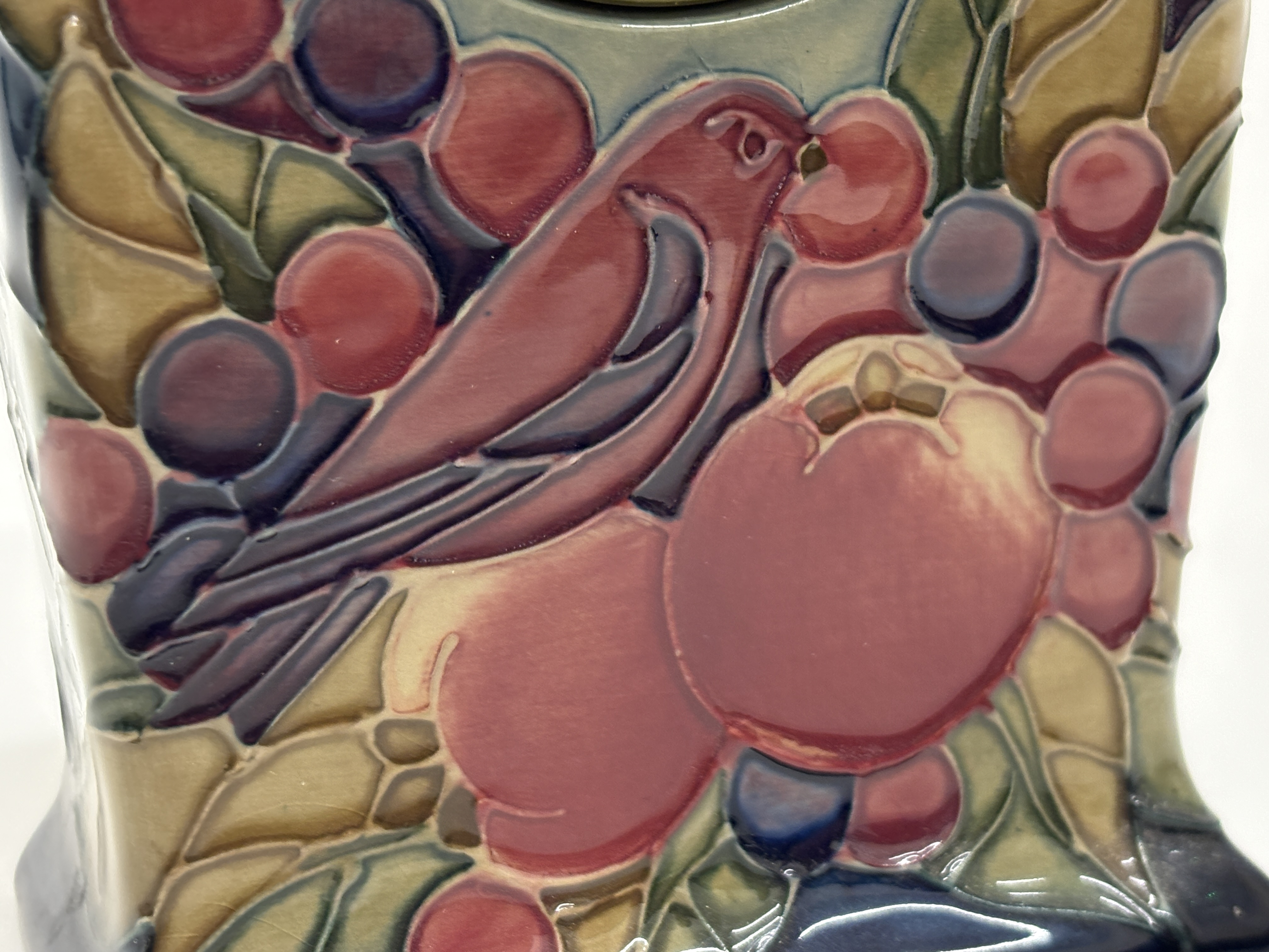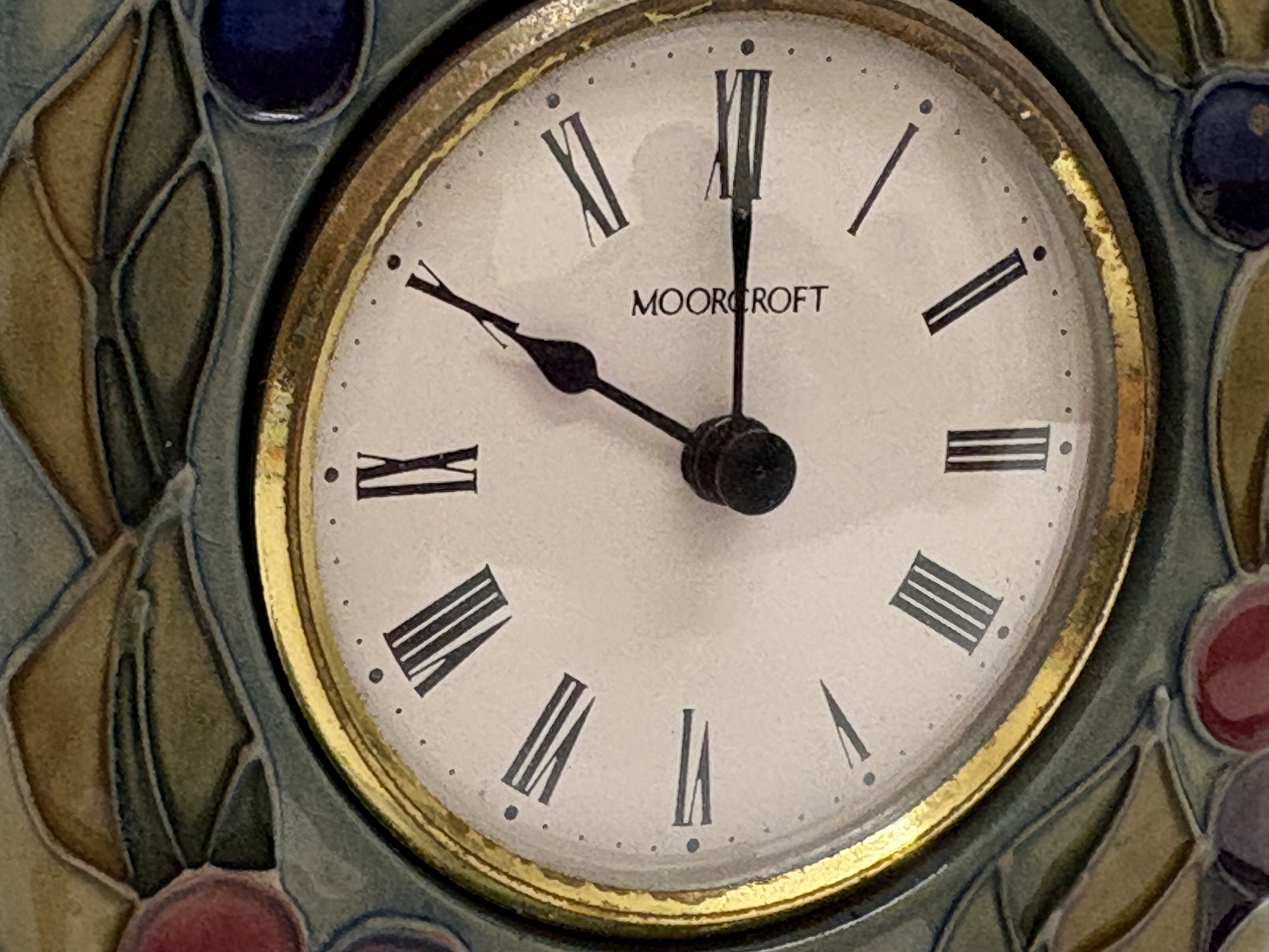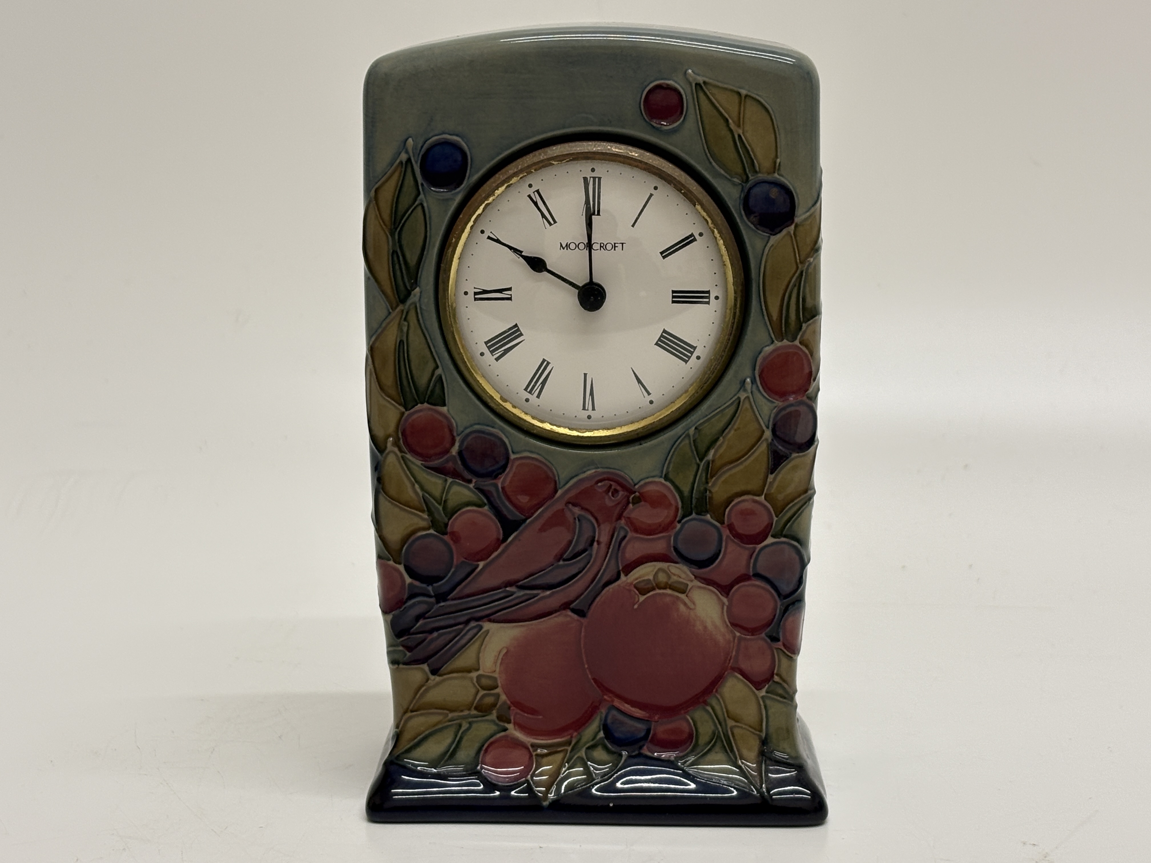 A professional Moorcroft Pottery mantel clock featuring the celebrated Finches pattern, designed by Sally Tuffin. The rectangular ceramic case is decorated with hand-painted tube-lined imagery depicting birds amongst stylized fruit and foliage, set against a graduated background transitioning from a soft sage green to a deep cobalt blue. The circular white dial is signed MOORCROFT and features black Roman numerals with spade hands, all enclosed within a brass-toned bezel. The clock is powered by a battery-operated quartz movement. The underside is fully marked with the impressed MOORCROFT and MADE IN ENGLAND stamps, alongside a painted WM monogram and an impressed bell symbol, which serves as the Moorcroft date cipher for the year 1991. Dimensions: Height 16cm, Width 9.5cm, Depth 5.5cm.