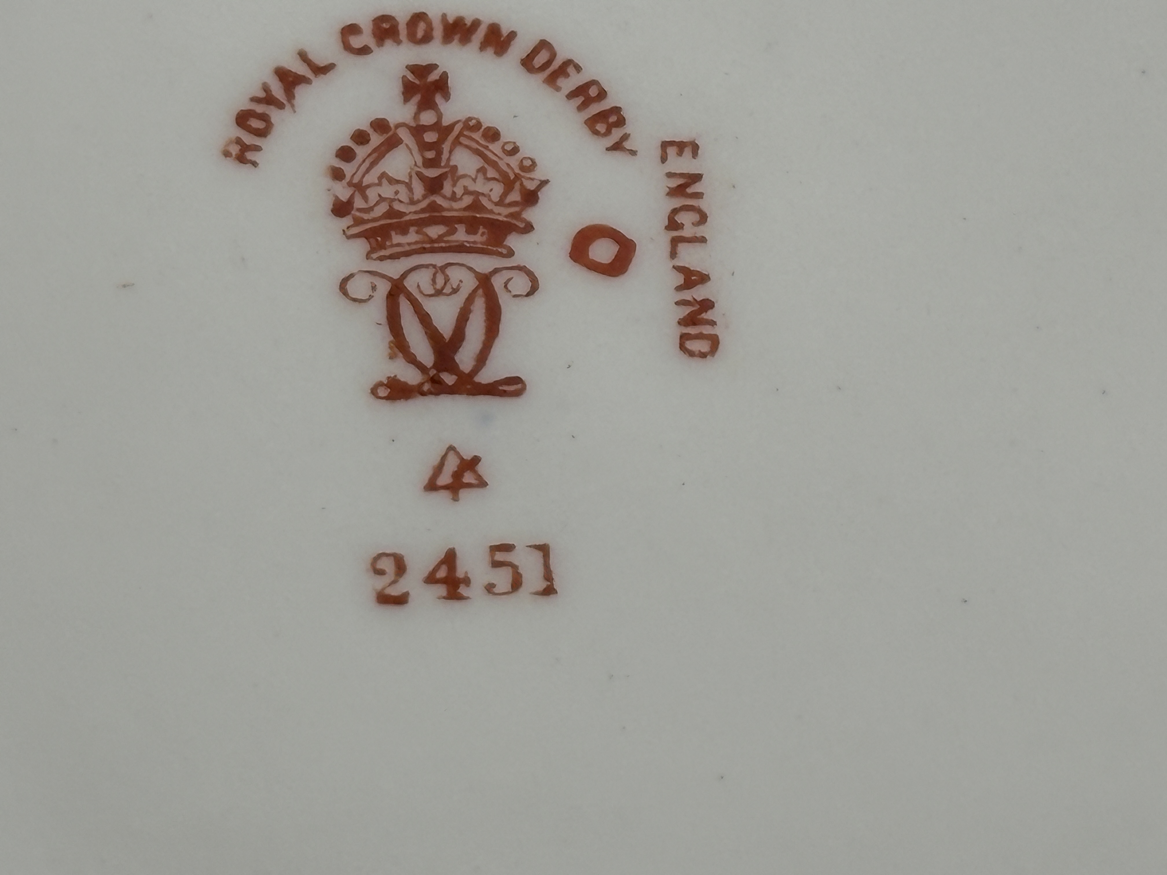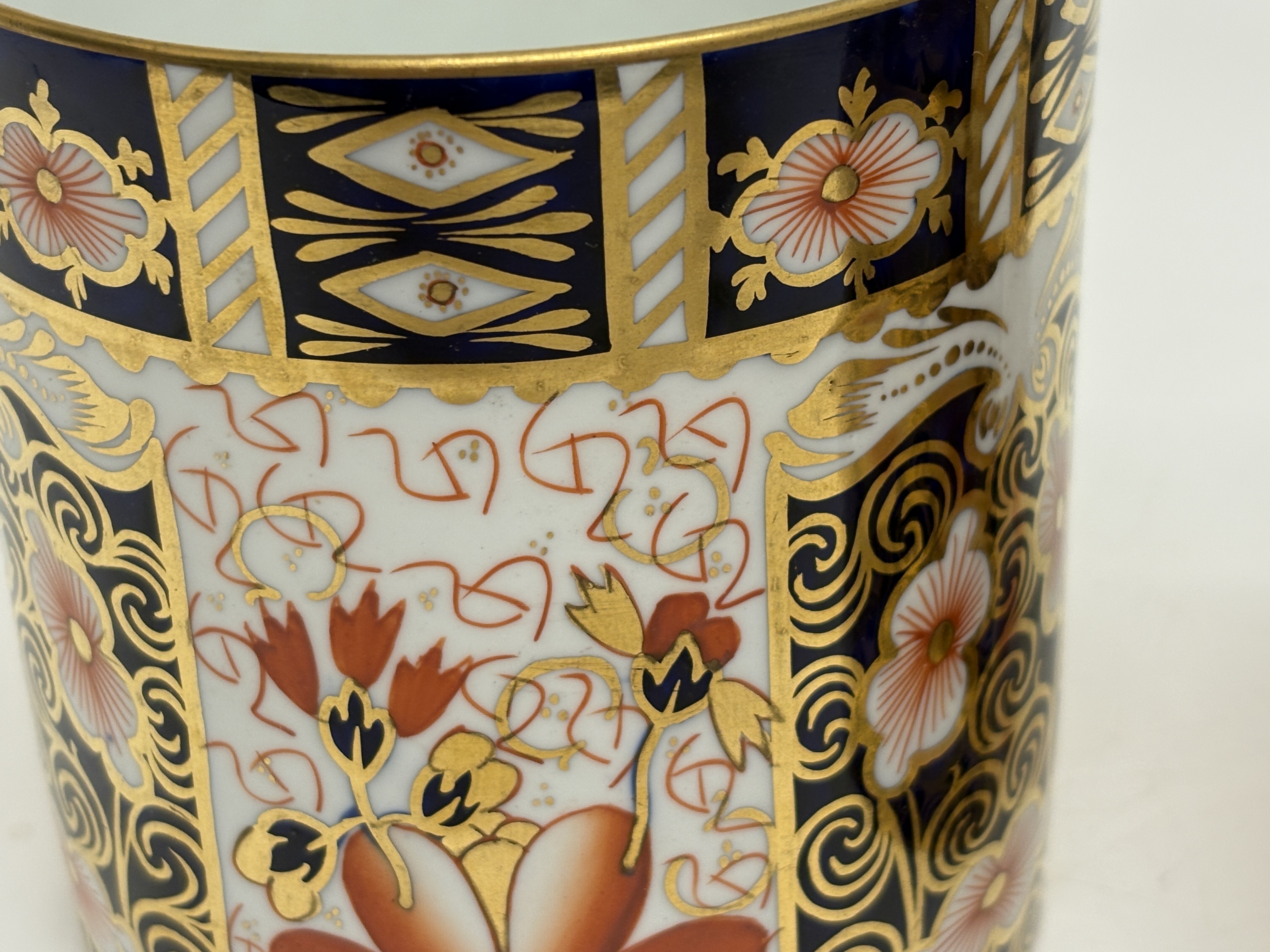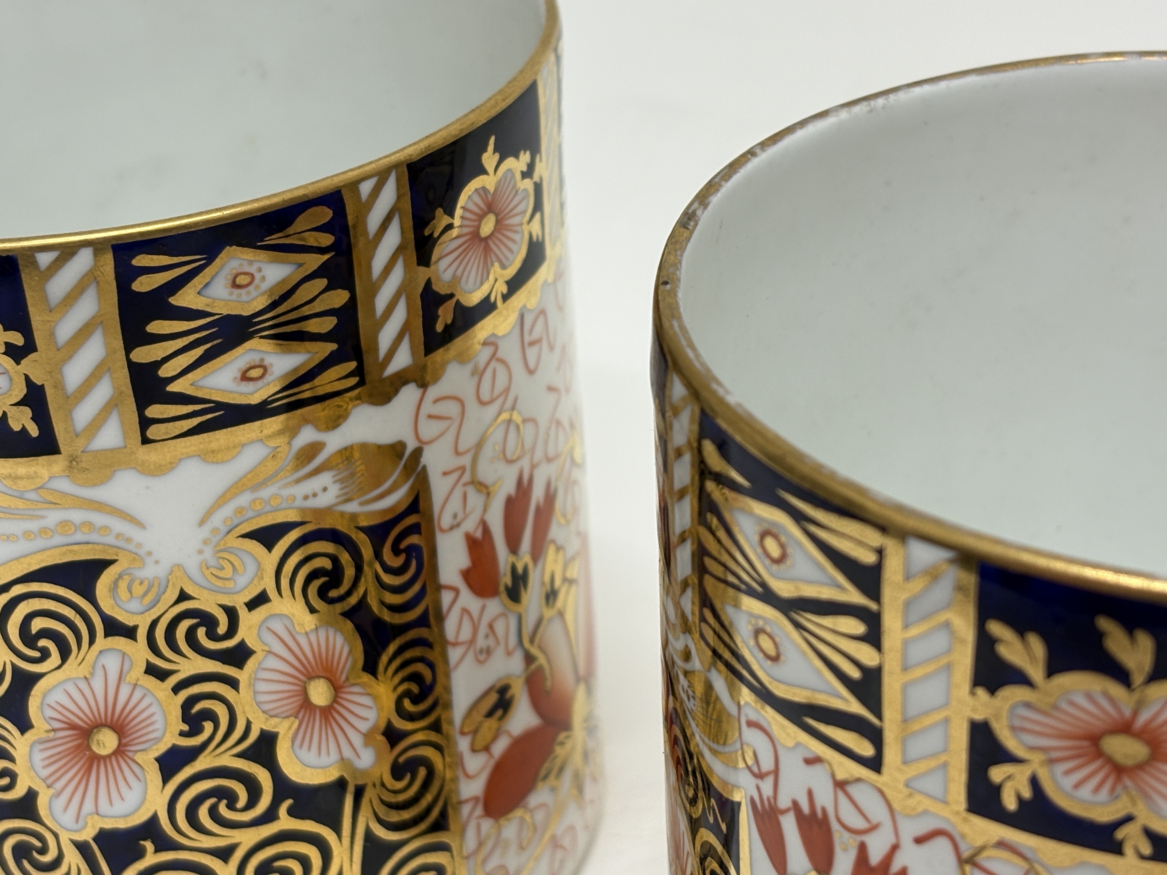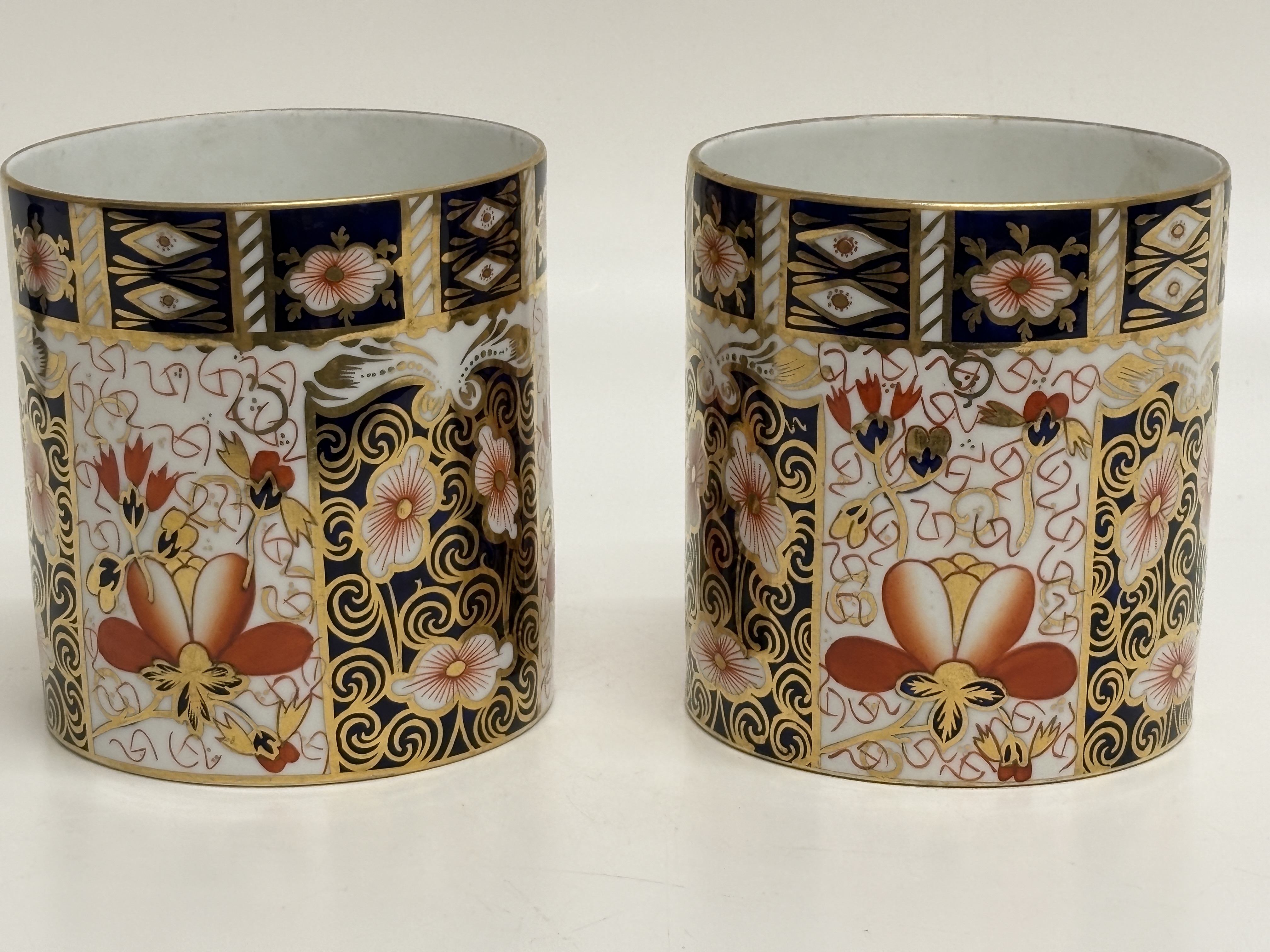 A pair of Royal Crown Derby fine bone china handleless beakers or cylindrical cups. Each piece is decorated in the celebrated Traditional Imari pattern, number 2451, featuring a palette of underglaze cobalt blue and overglaze iron-red enamel with rich hand-applied gilding. The design consists of alternating panels of stylised floral sprigs and scrolling foliate motifs against a crisp white ground. Both items bear the iron-red Royal Crown Derby factory mark to the base, including the crown and interlaced D monogram, along with the pattern number 2451. One beaker displays the date cipher for 1912, while the second bears a cipher for circa 1911. Dimensions: Not provided.