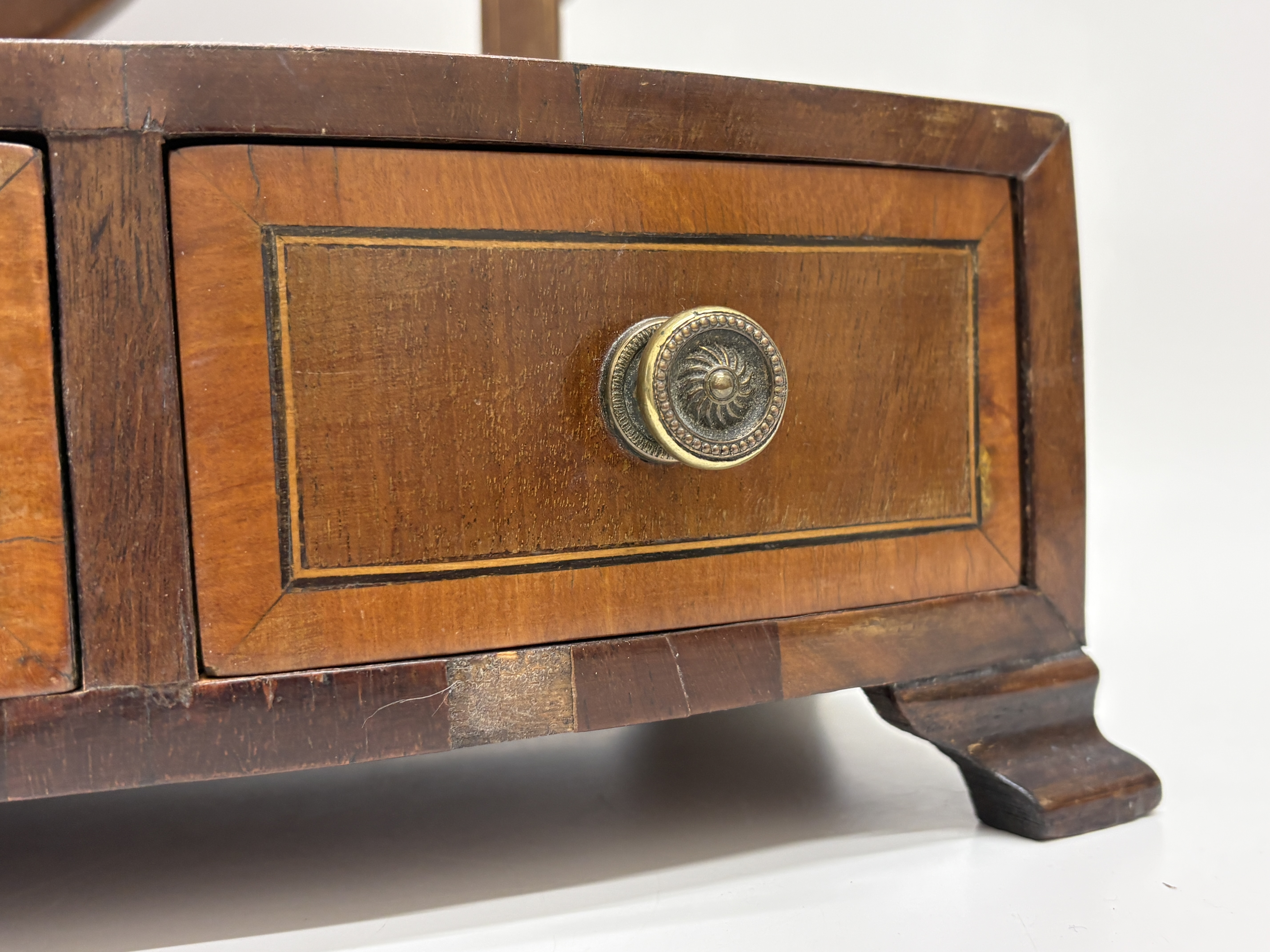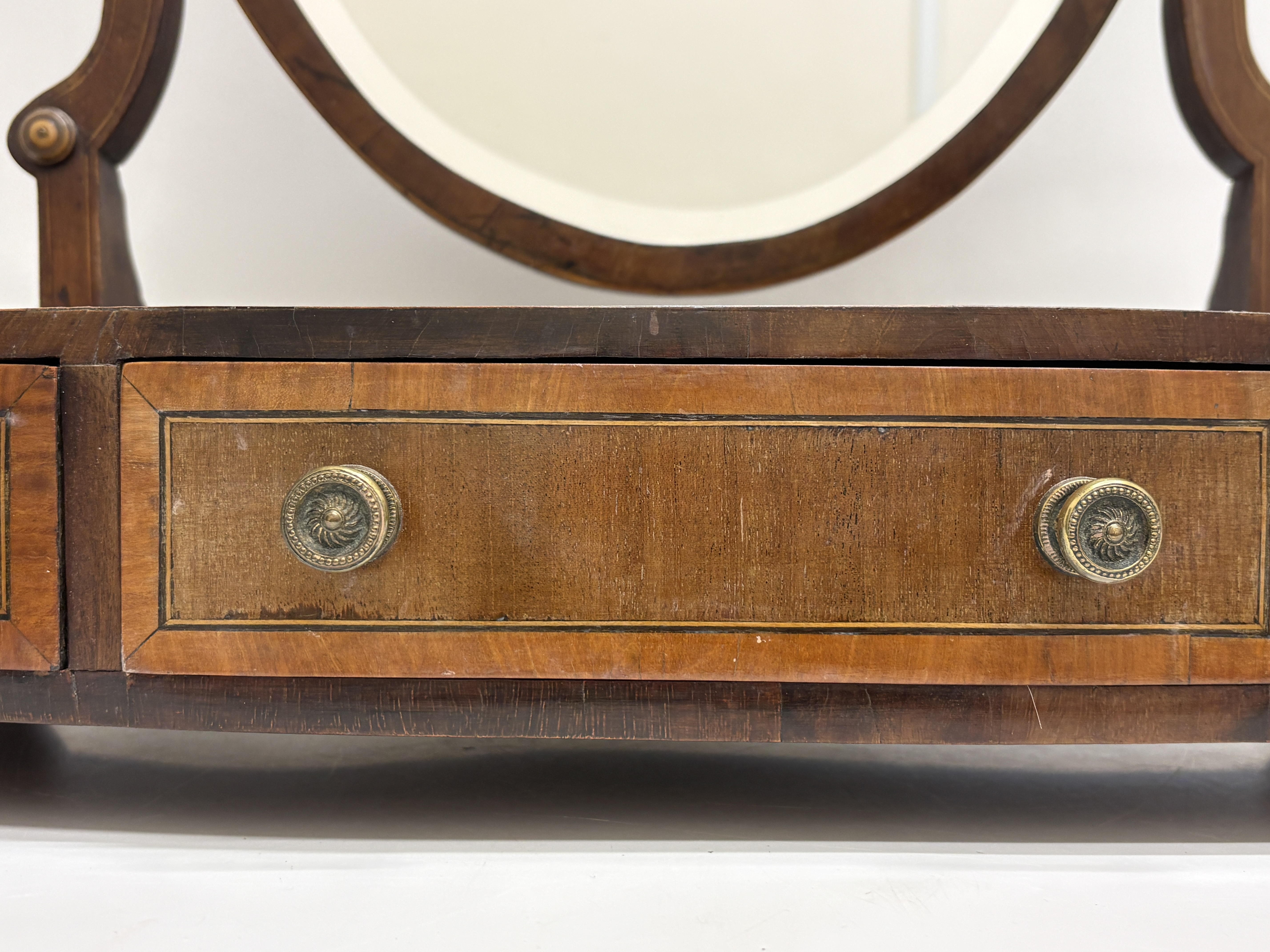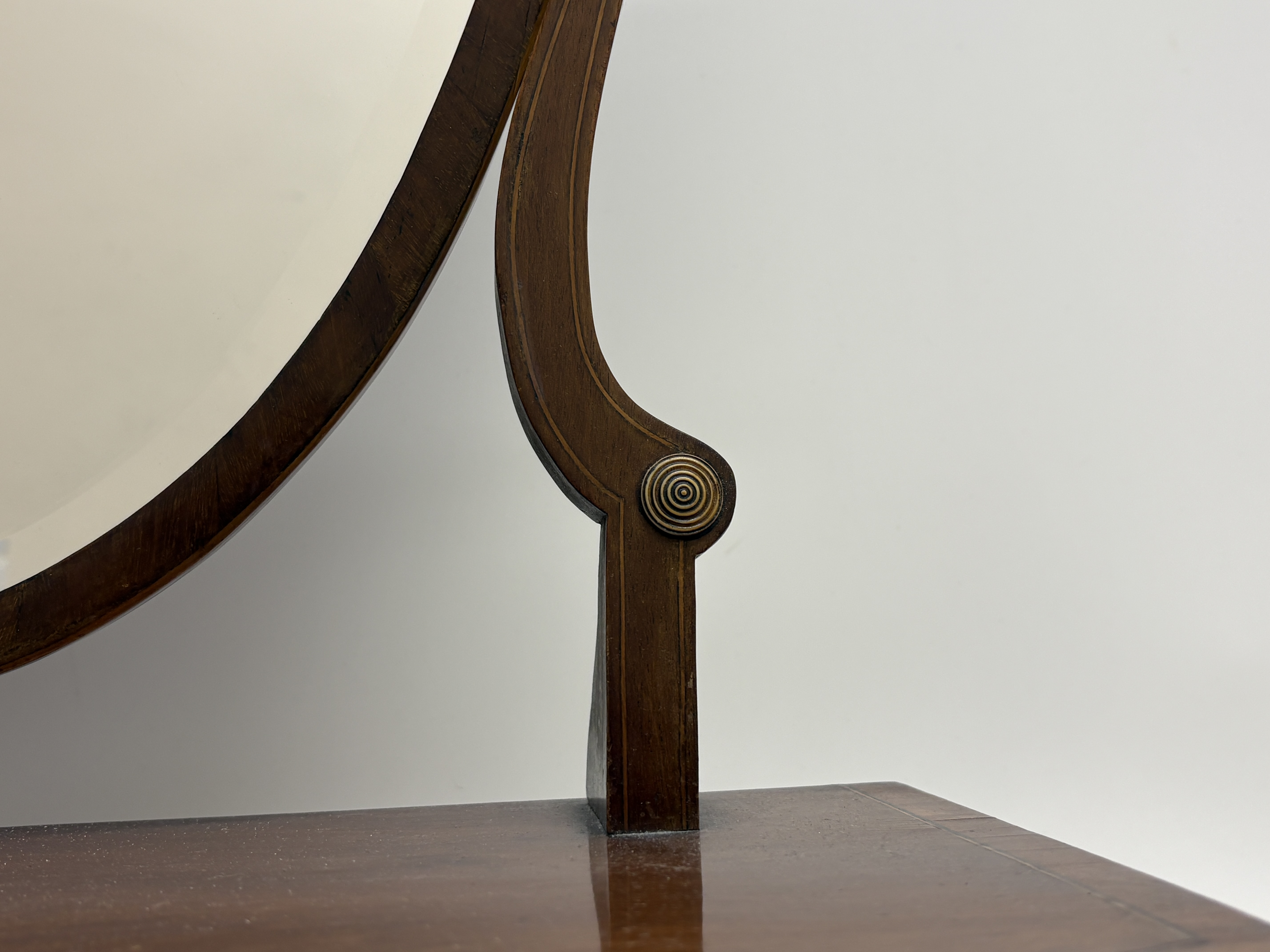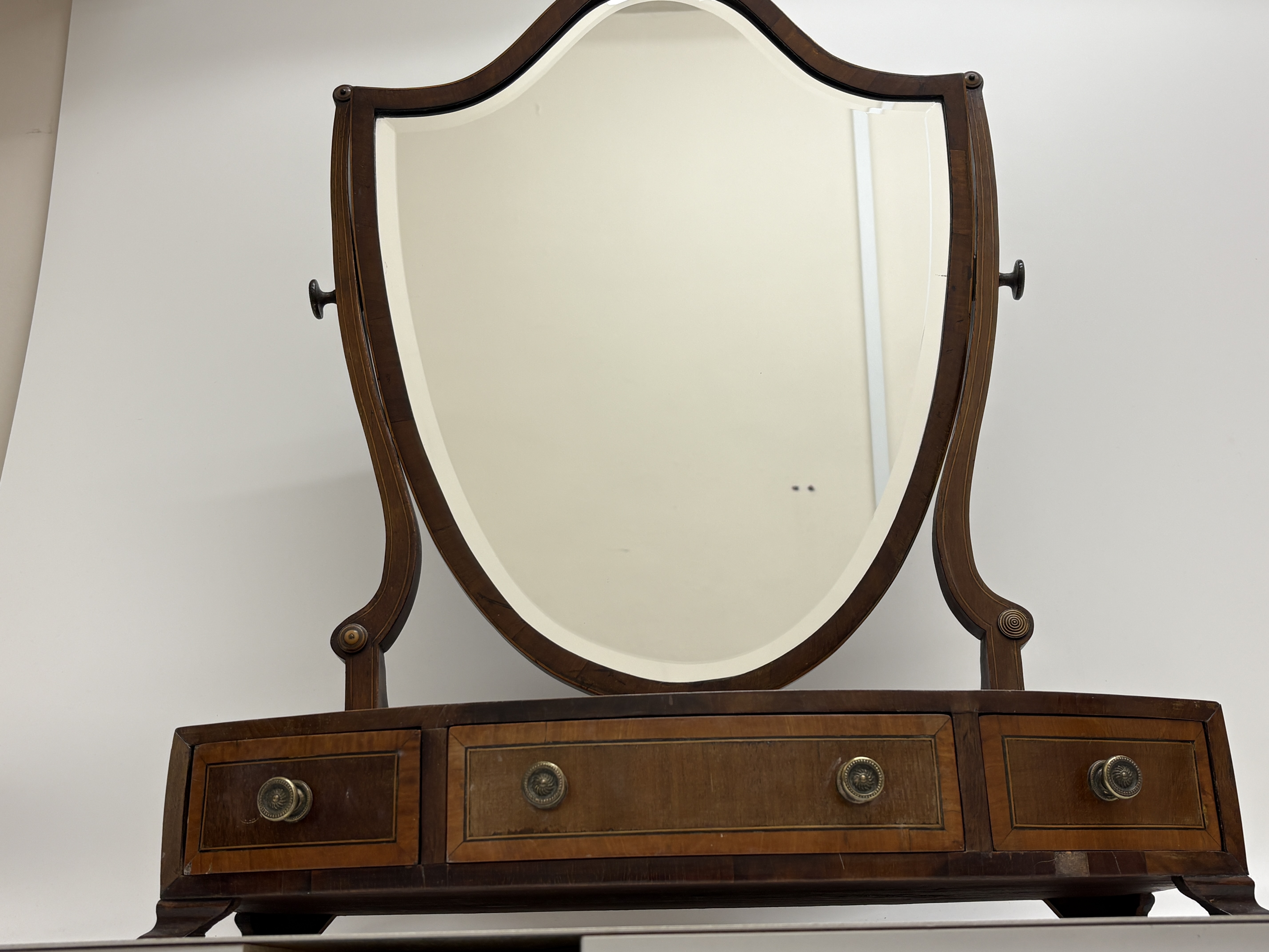 An elegant late 18th to early 19th-century George III Style mahogany dressing mirror, also known as a toilet or shaving mirror, designed in the refined Hepplewhite taste. The piece features a shield-shaped mirror plate held within a moulded mahogany frame, suspended between two raked and curved uprights capped with decorative brass terminals and accented with delicate stringing. The bow-fronted base contains three drawers, with a wide central drawer flanked by two smaller square drawers, all showcasing highly figured mahogany veneers. The construction incorporates hand-cut dovetails, with secondary woods likely being oak or pine. The exterior is further embellished with satinwood crossbanding and boxwood and ebony stringing throughout the frame and base. The drawers are fitted with circular brass knobs featuring a radiating sunburst motif, and the mirror pivots on matching adjustable brass screws. The entire unit is raised on traditional ogee bracket feet. Dimensions: [Dimensions not provided