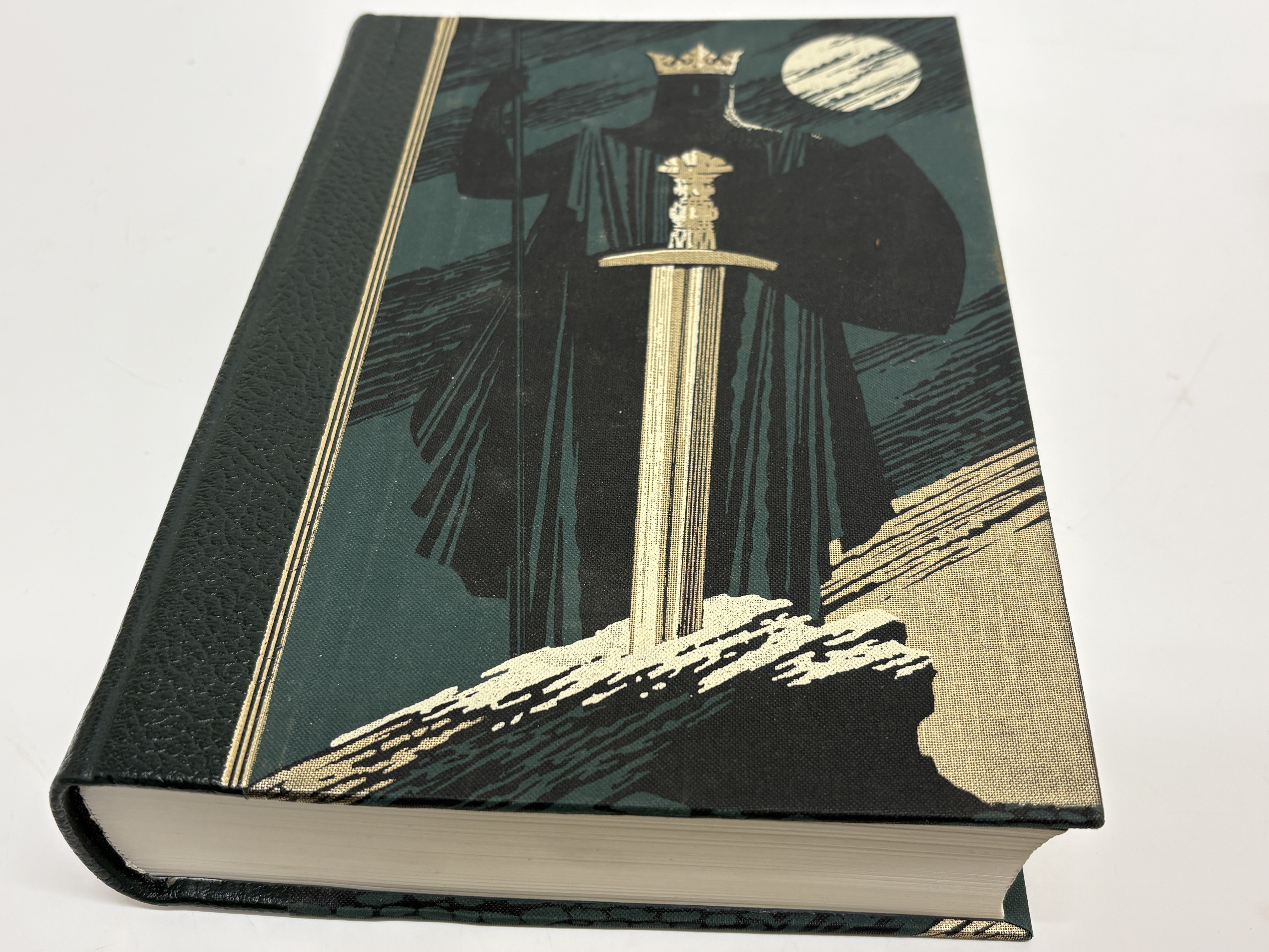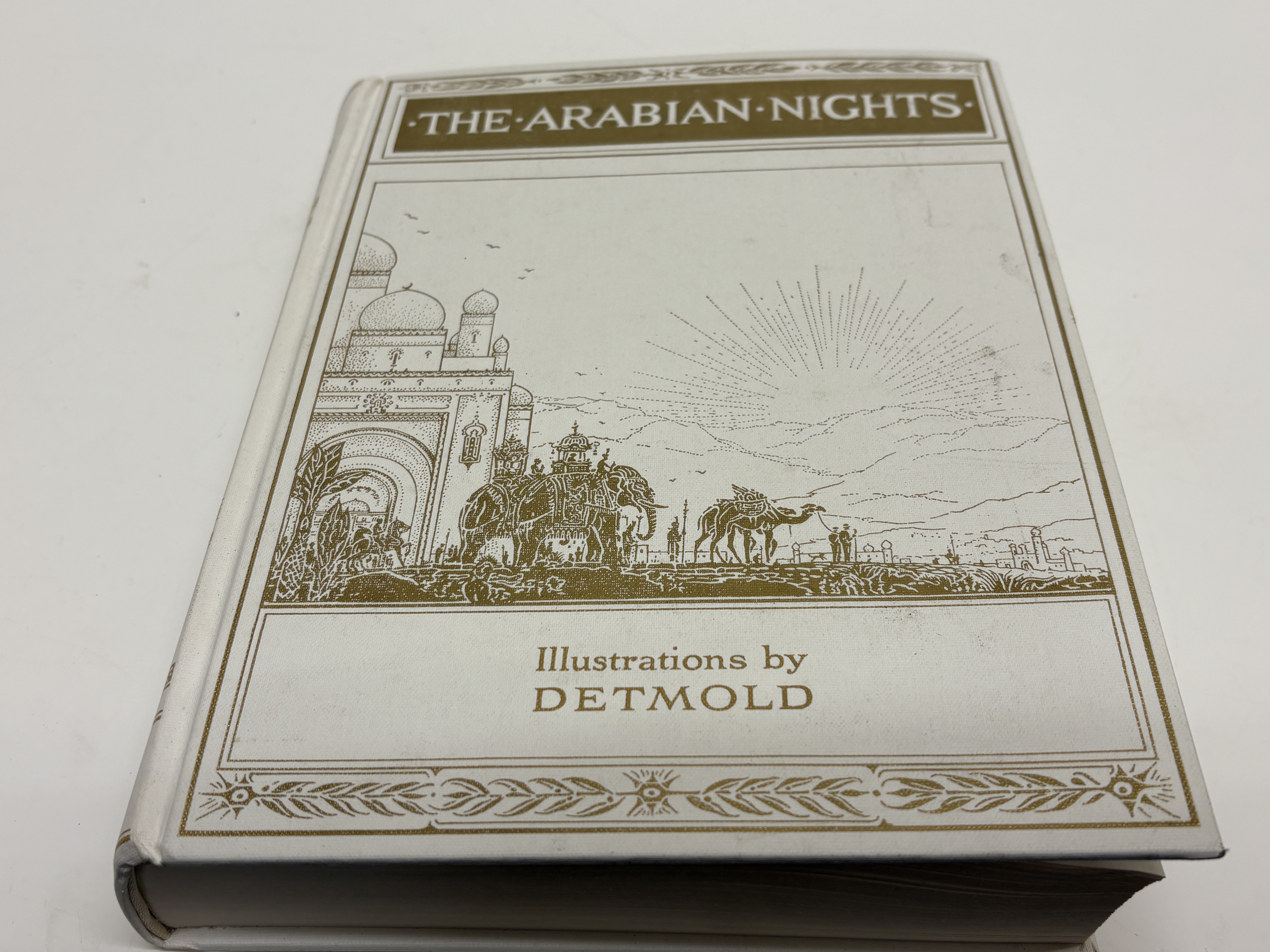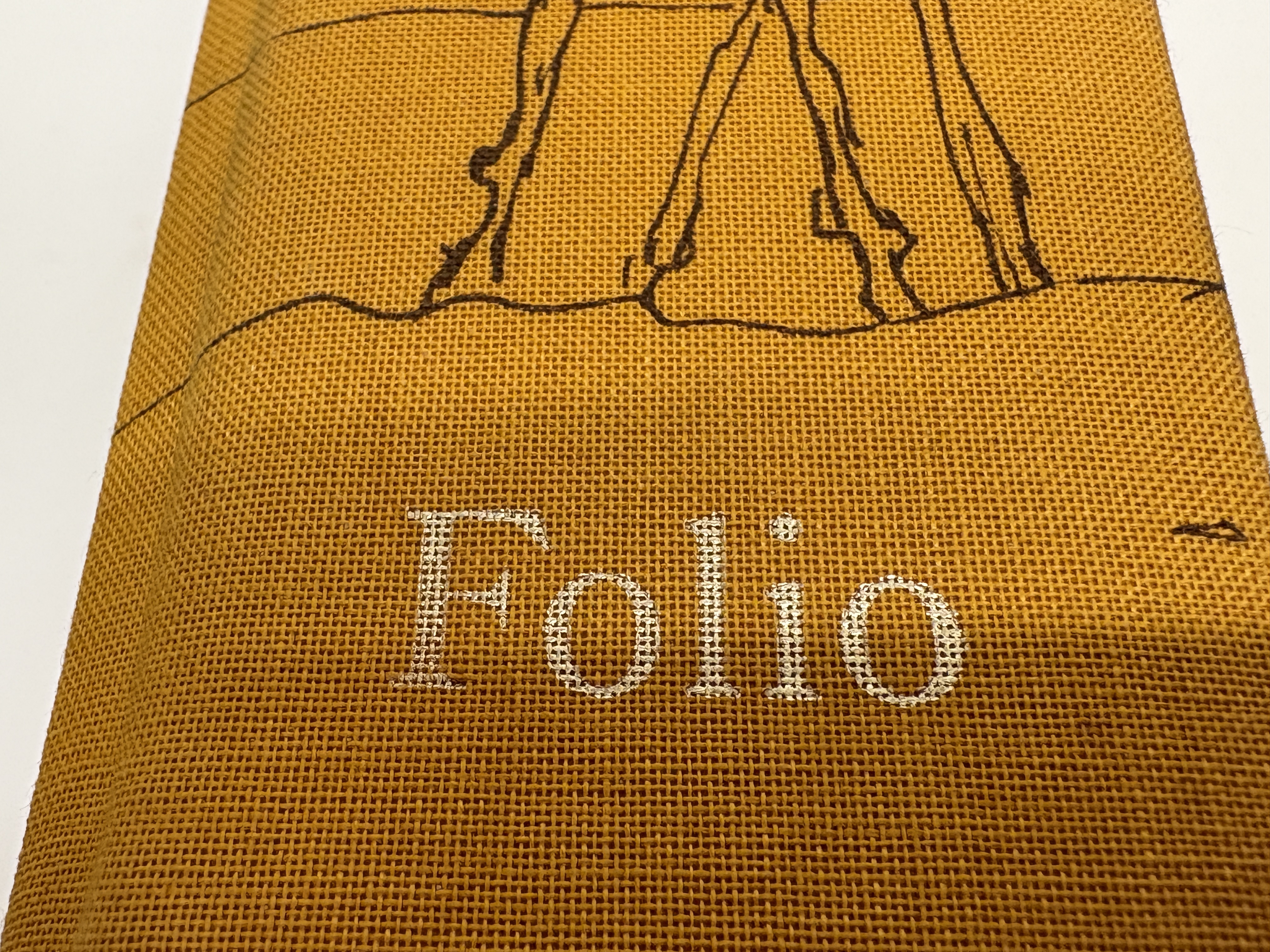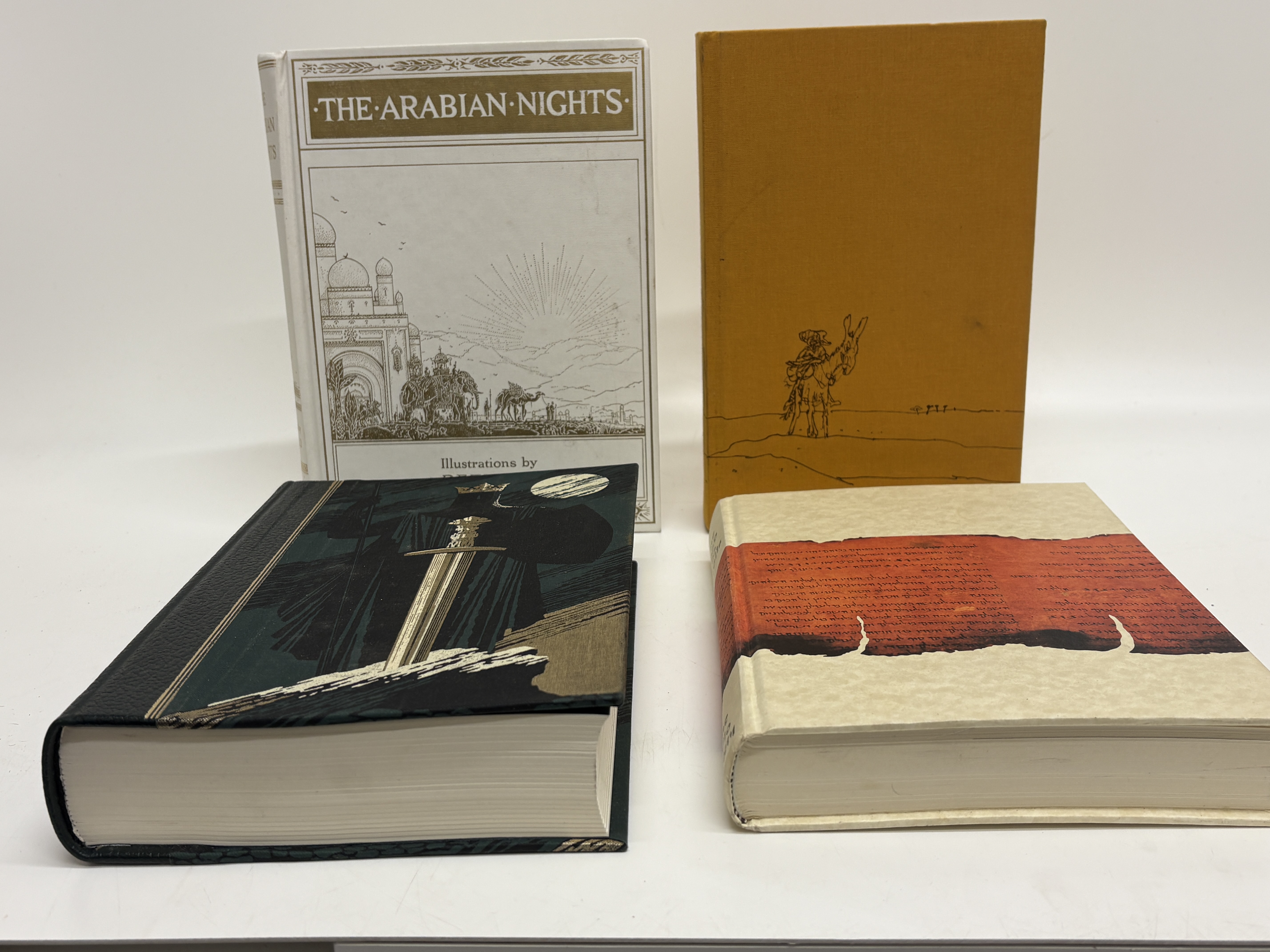A collection of four modern hardcover volumes published by The Folio Society, London, featuring specialised decorative bindings. 1. Anonymous. The Arabian Nights. Illustrated by E.J. Detmold. London: The Folio Society, 2003. Bound in publisher’s white cloth with gold-toned pictorial decorations to the upper board and spine. 2. Cervantes, Miguel de. Don Quixote. London: The Folio Society, 1995. Bound in mustard-yellow cloth with a minimalist black line illustration to the upper board and white lettering to the spine. 3. Malory, Sir Thomas. Le Morte d’Arthur. London: The Folio Society, 2003. Quarter-bound in black textured material with pictorial cloth boards depicting a crowned knight with a sword. 4. Vermes, Geza (editor). The Dead Sea Scrolls. London: The Folio Society, 2003. Bound in cream pictorial boards with a central decorative band depicting a fragment of an ancient manuscript. All volumes are octavo or quarto in size. Published without dust jackets as issued; slipcases are not present with this lot. No signatures, inscriptions, or previous ownership marks are visible.