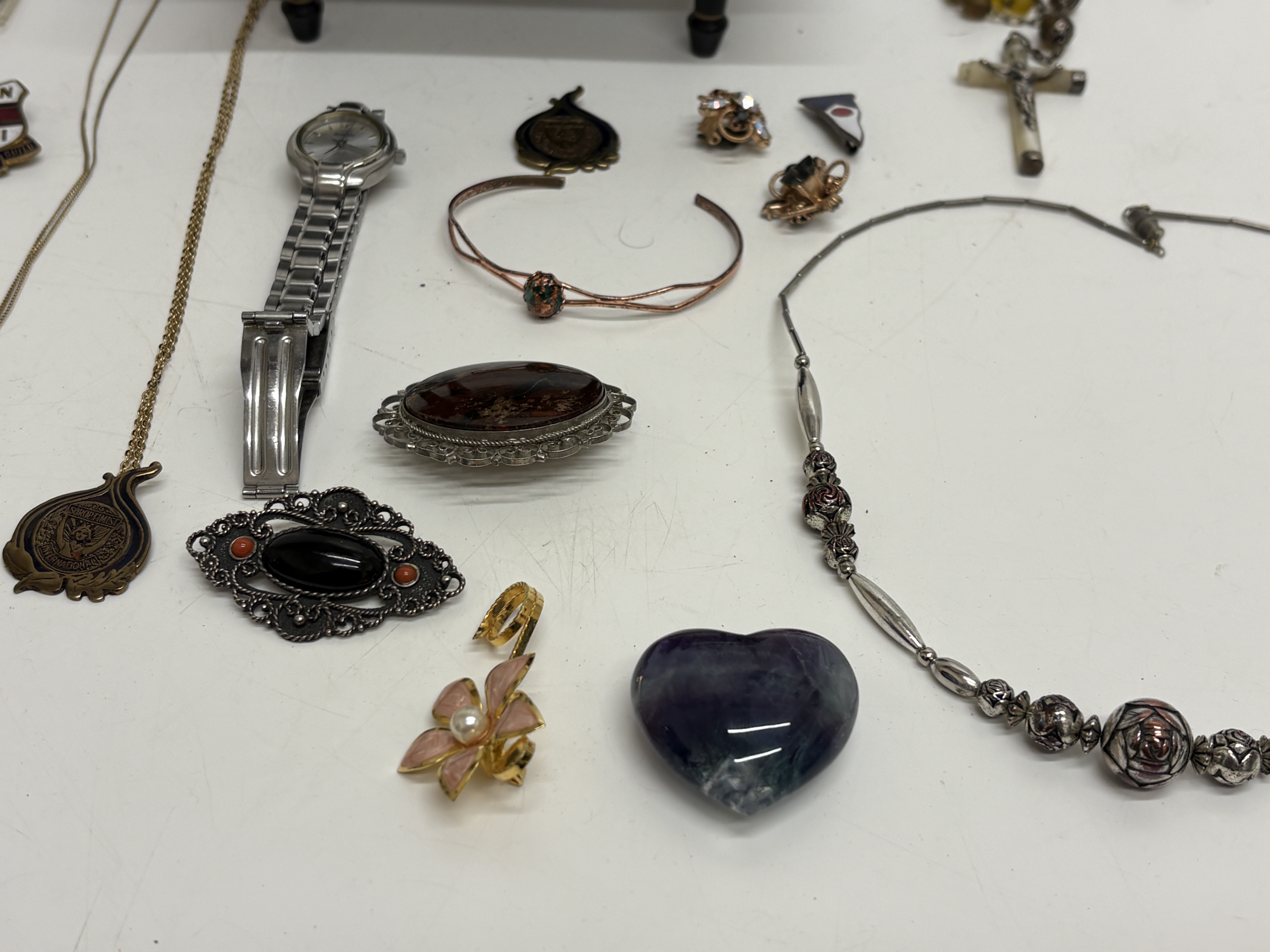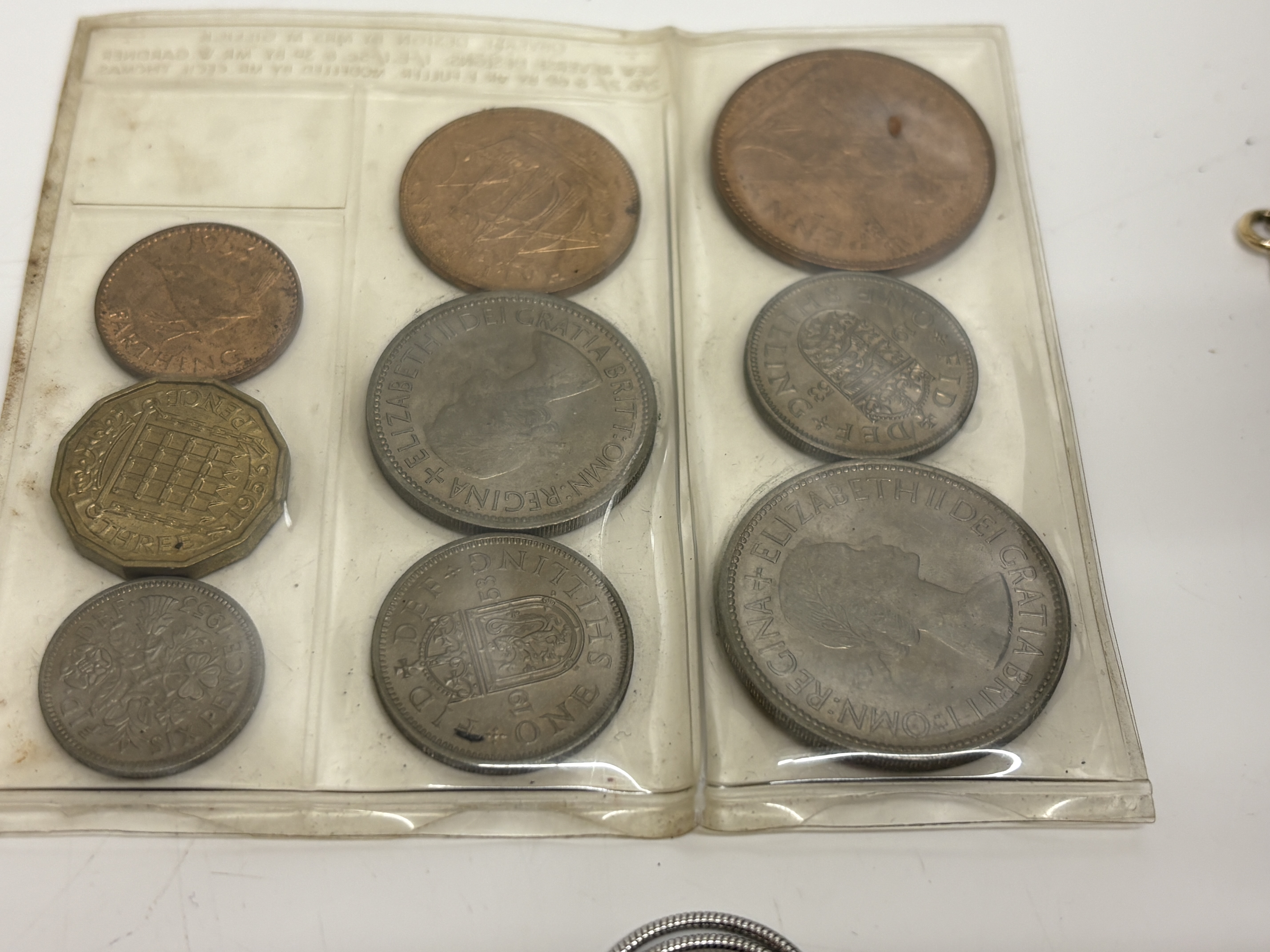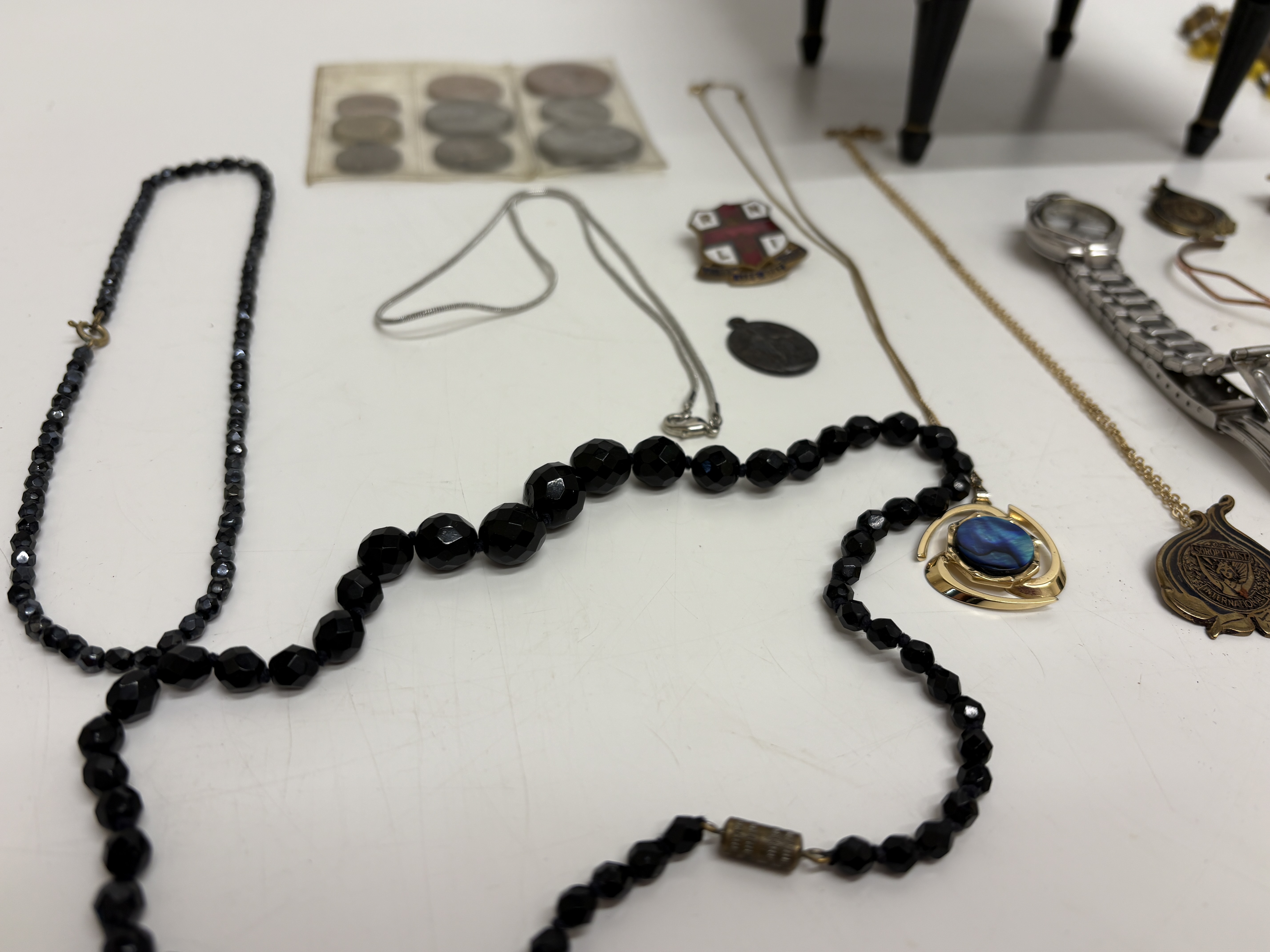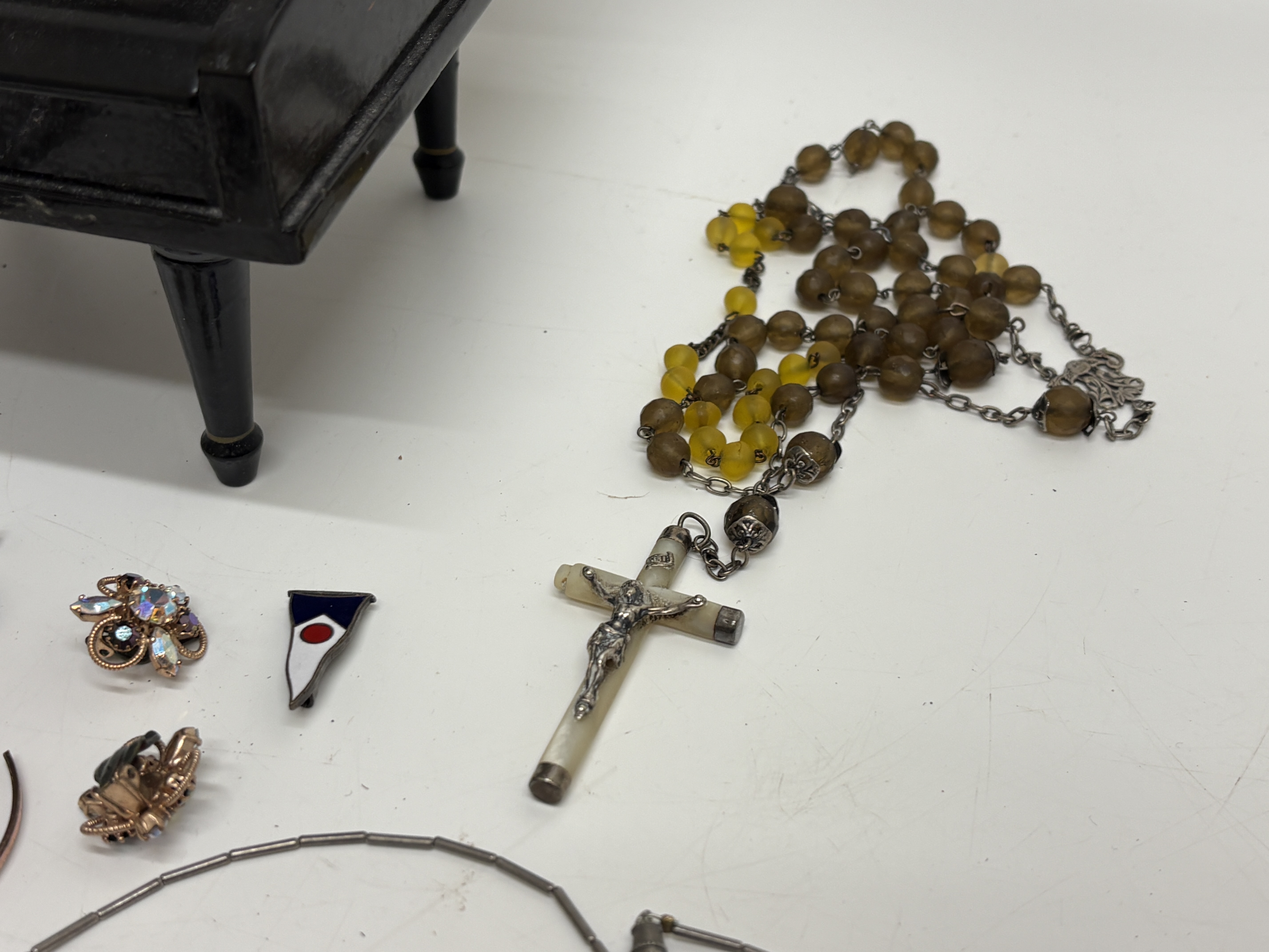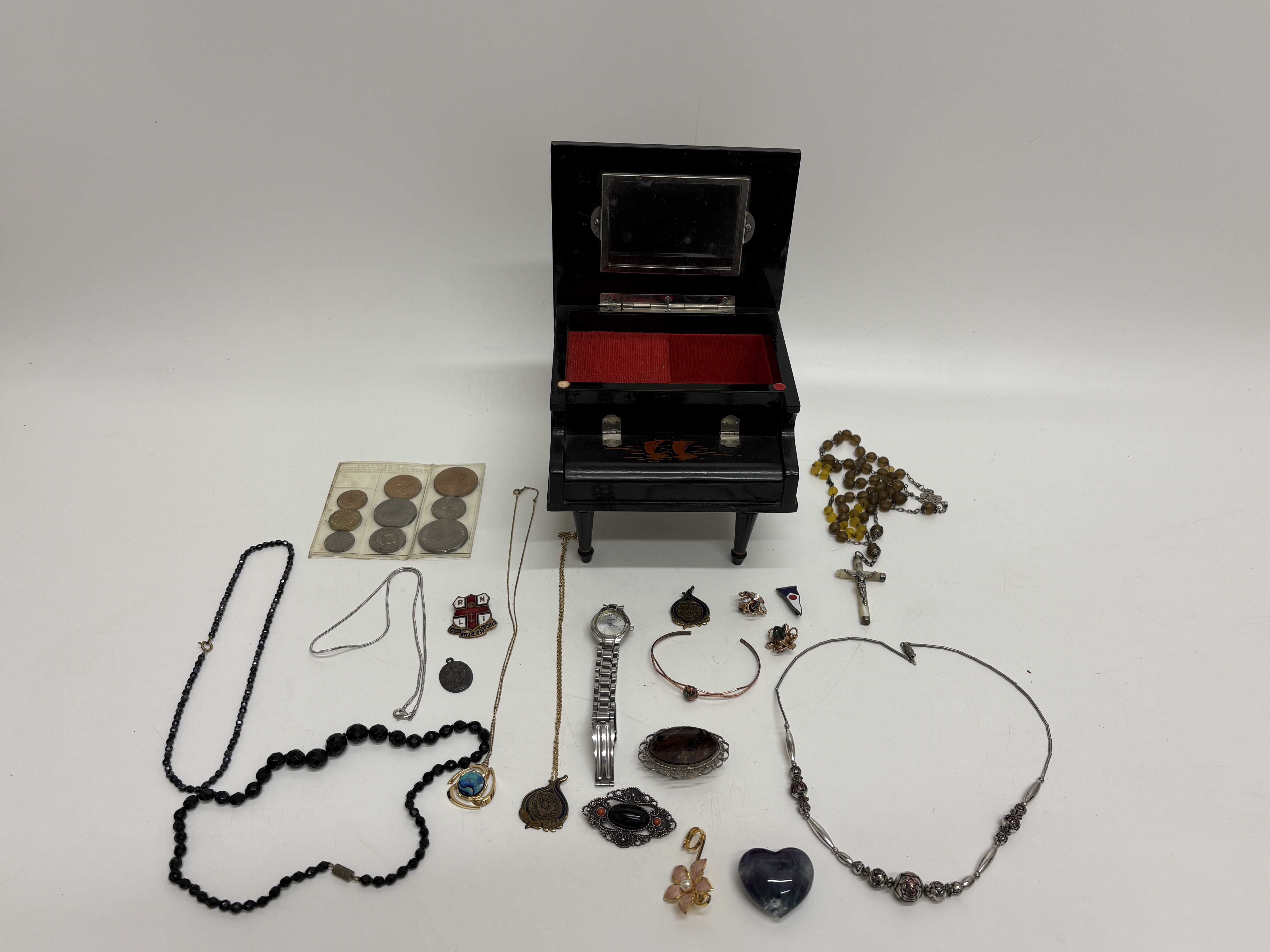 A mid-century Japanese black lacquer miniature grand piano jewellery box featuring a hand-painted decorative motif of sailboats to the keyboard cover, opening to reveal a red velvet-lined interior with an inset mirror. The lot includes a numismatic collection of eleven British coins, featuring a 1953 Elizabeth II coronation year set (Half Crown, Two Shillings, One Shilling, Sixpence, and Threepence), a 1947 George VI Farthing, and a bronze One Penny. Featured jewellery includes a ladies’ Avia silver-tone wristwatch with baton indices and a stainless steel link bracelet; a faceted black glass bead necklace; a gold-tone open-work pendant set with an iridescent abalone cabochon on black beads; and a “liquid silver” style necklace with embossed floral spherical beads. Religious items include a rosary with amber-coloured translucent beads and a mother-of-pearl panelled cross. Assorted pins and brooches include a Soroptimist International medallion, a Royal National Lifeboat Institution (R.N.L.I.) enamel shield pin, a nautical flag pin, aurora borealis rhinestone floral pins, a pink enamel flower pin with faux pearl, and a large silver-tone filigree brooch set with a mottled brown jasper-style stone.