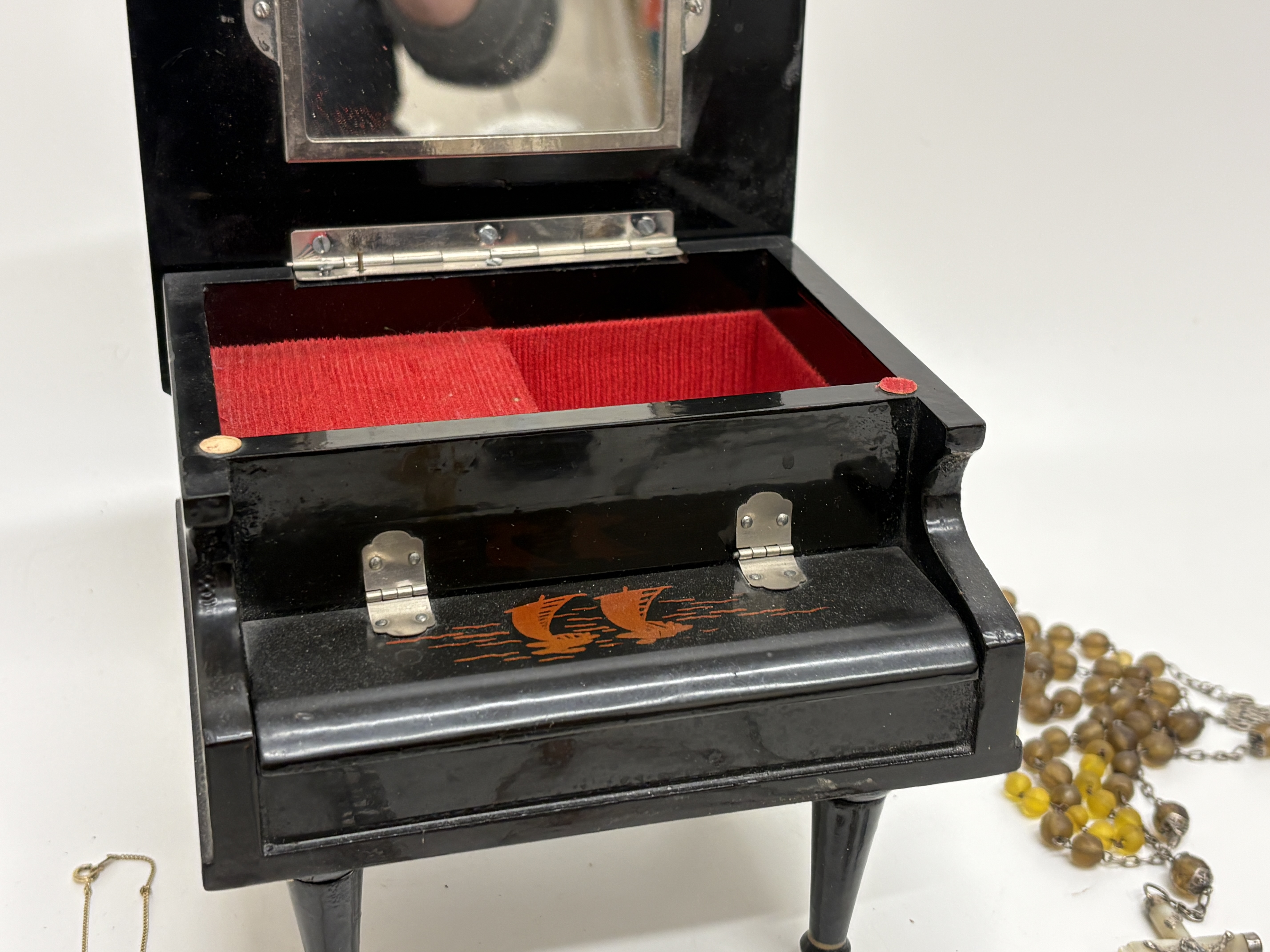 Lot 489: Vintage Japanese Lacquer Piano Jewellery Box, 1953 British Coronation Coinage, and Assorted Costume Jewellery