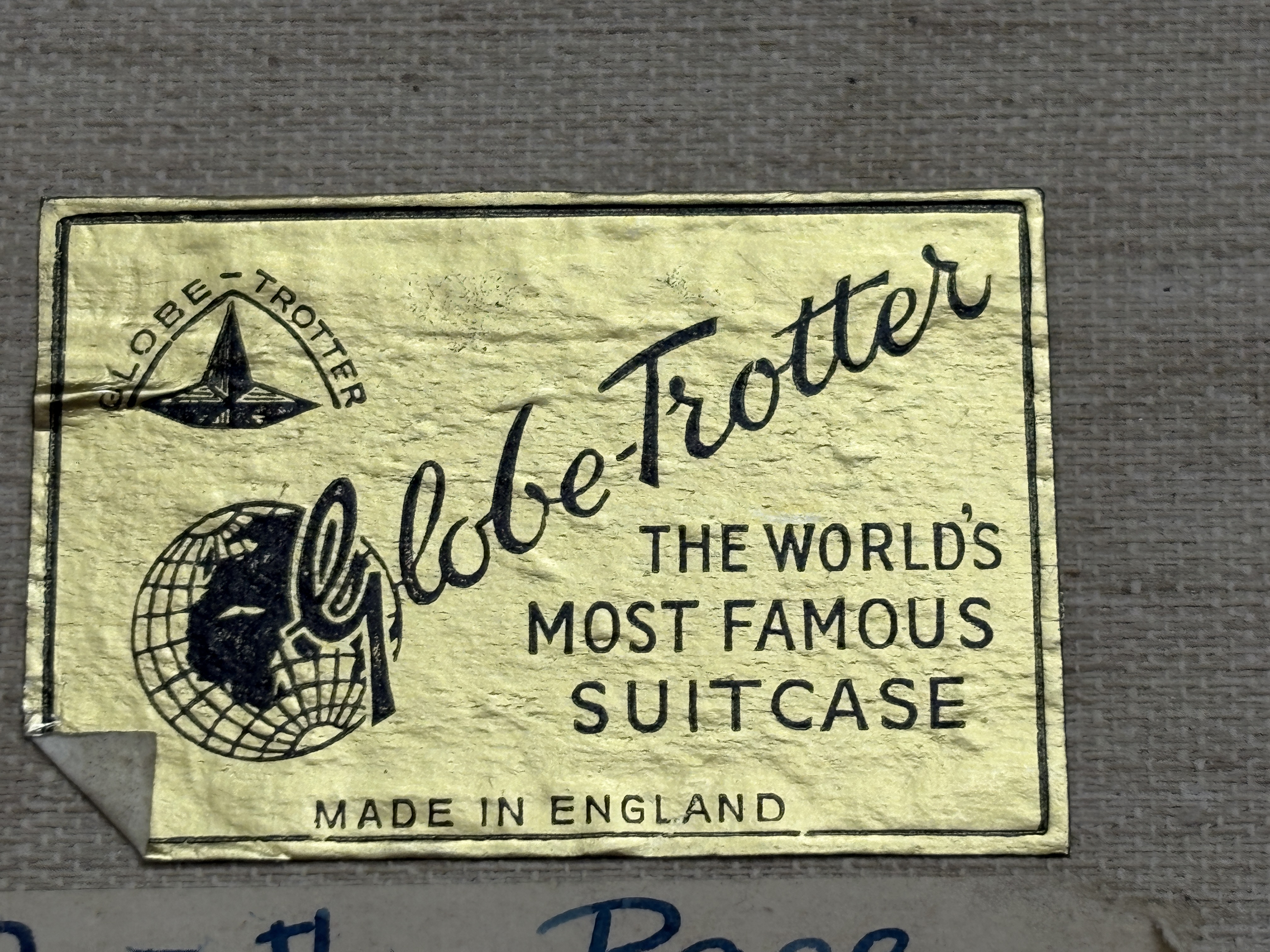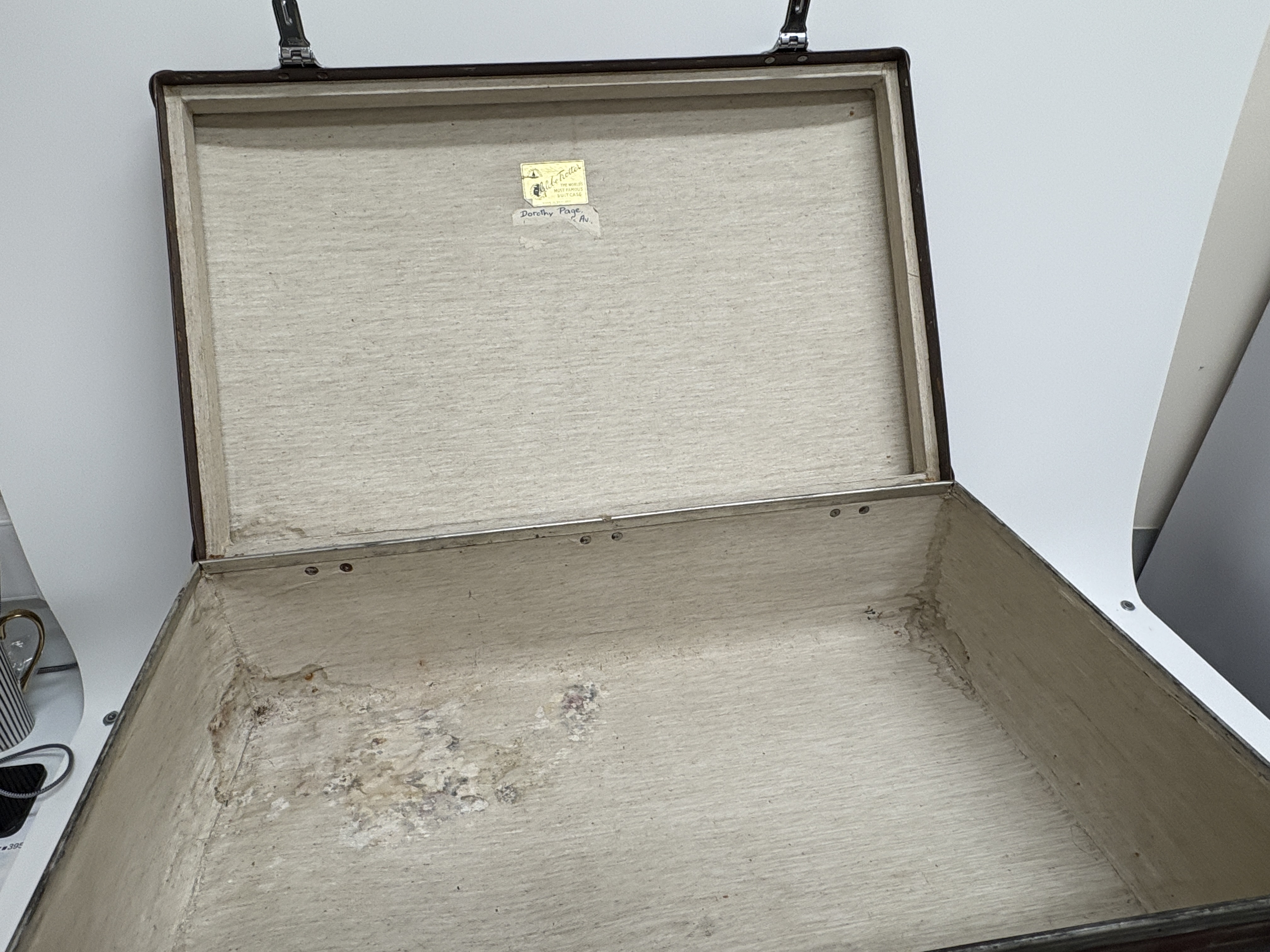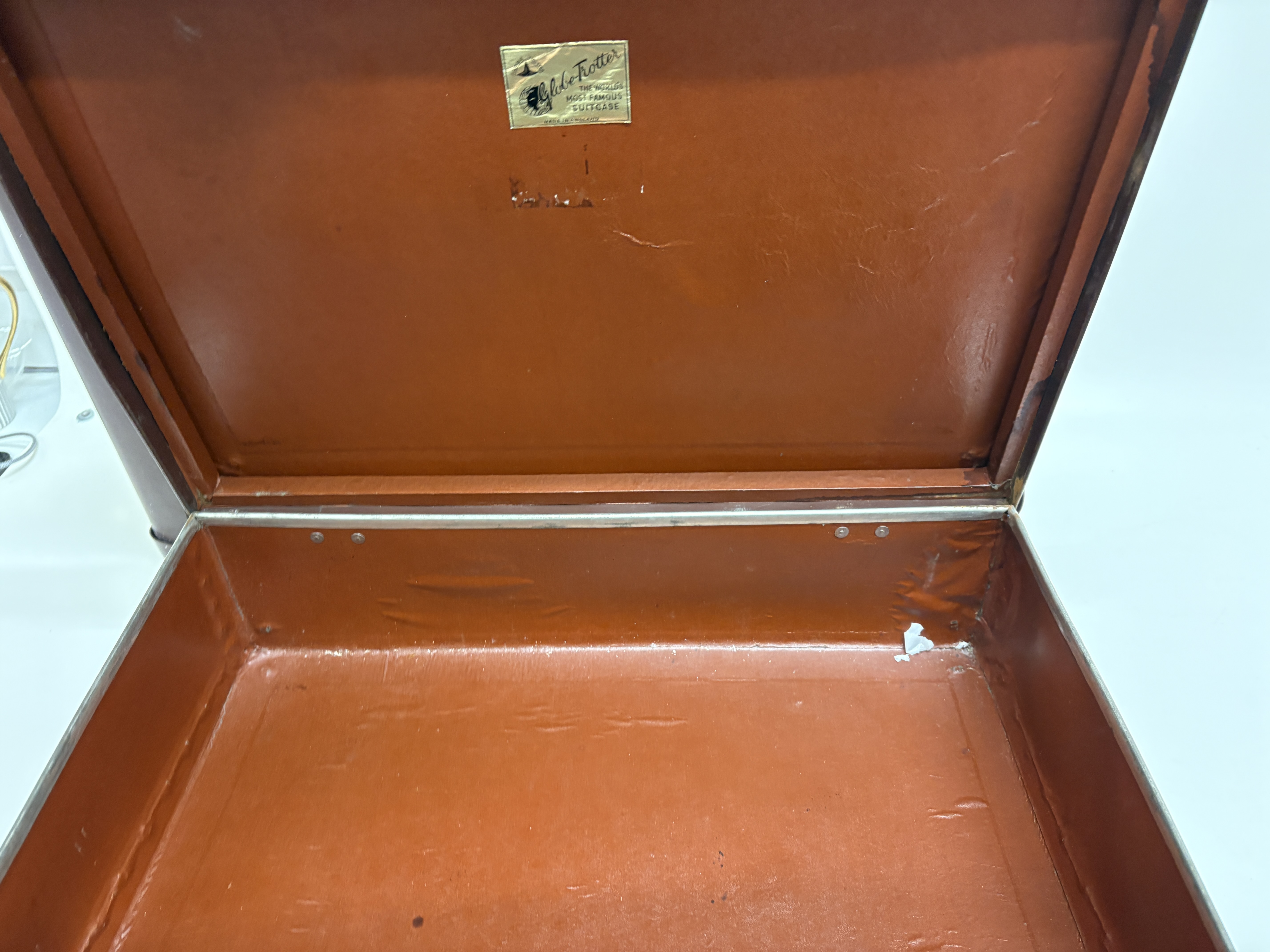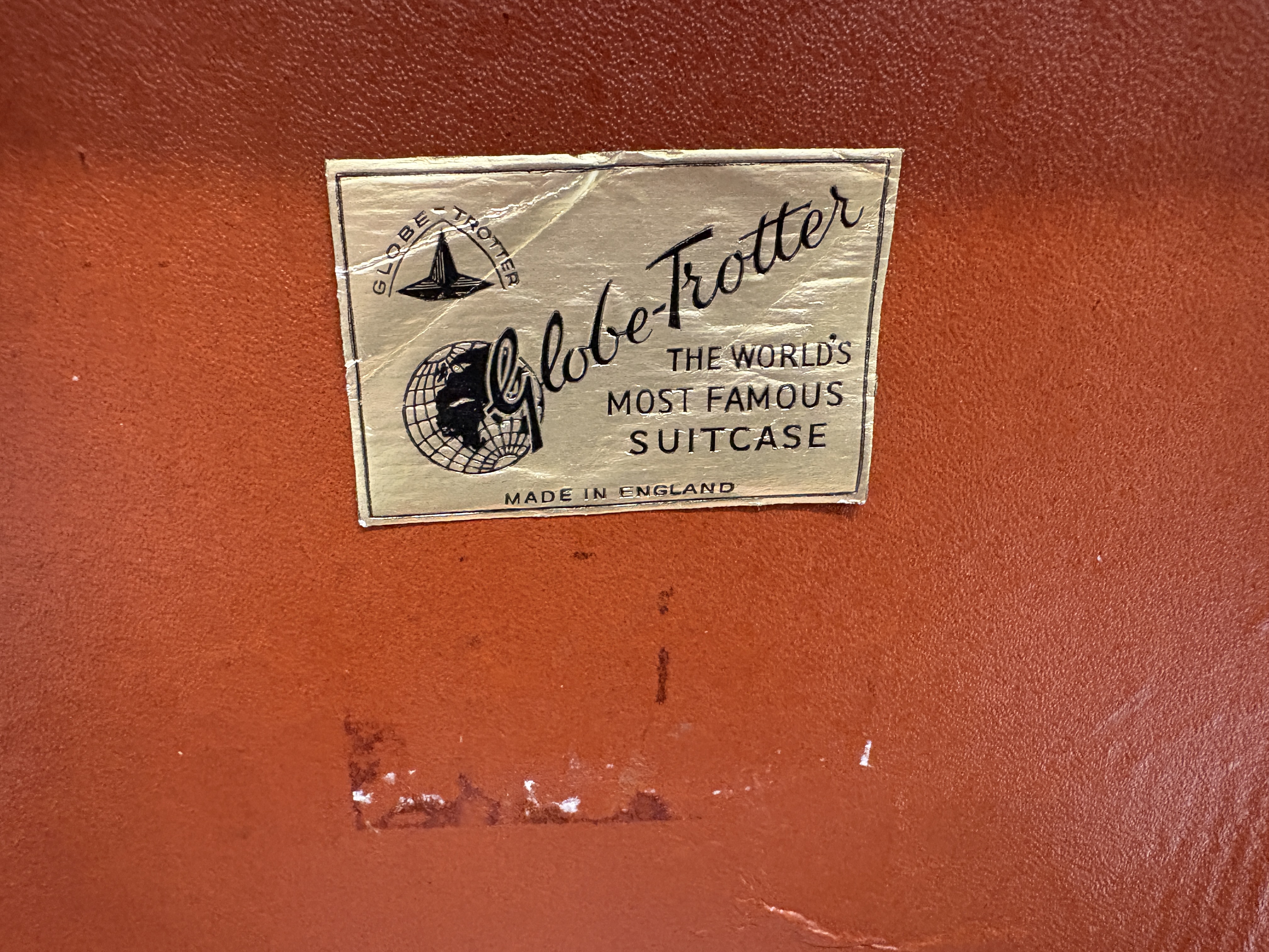 A pair of classic British travel cases manufactured by Globe-Trotter. These suitcases are constructed from the brand’s signature dark brown vulcanised fibreboard, featuring reinforced protective corners and leather-wrapped carrying handles. Each piece is fitted with metal flip-lock fasteners. The interiors are distinct: one case is lined with a vibrant orange material, while the other features a cream-coloured fabric lining. Both cases retain their original gold-toned interior foil labels identifying the maker as “Globe-Trotter, The World’s Most Famous Suitcase, Made in England.” The cream-lined case includes a small, partially obscured handwritten provenance label for a “Dorothy Page” fixed just below the manufacturer’s mark. These pieces represent the durable, lightweight luggage design that made the brand a staple of luxury travel and are frequently sought after for vintage car displays and period-correct set dressing.