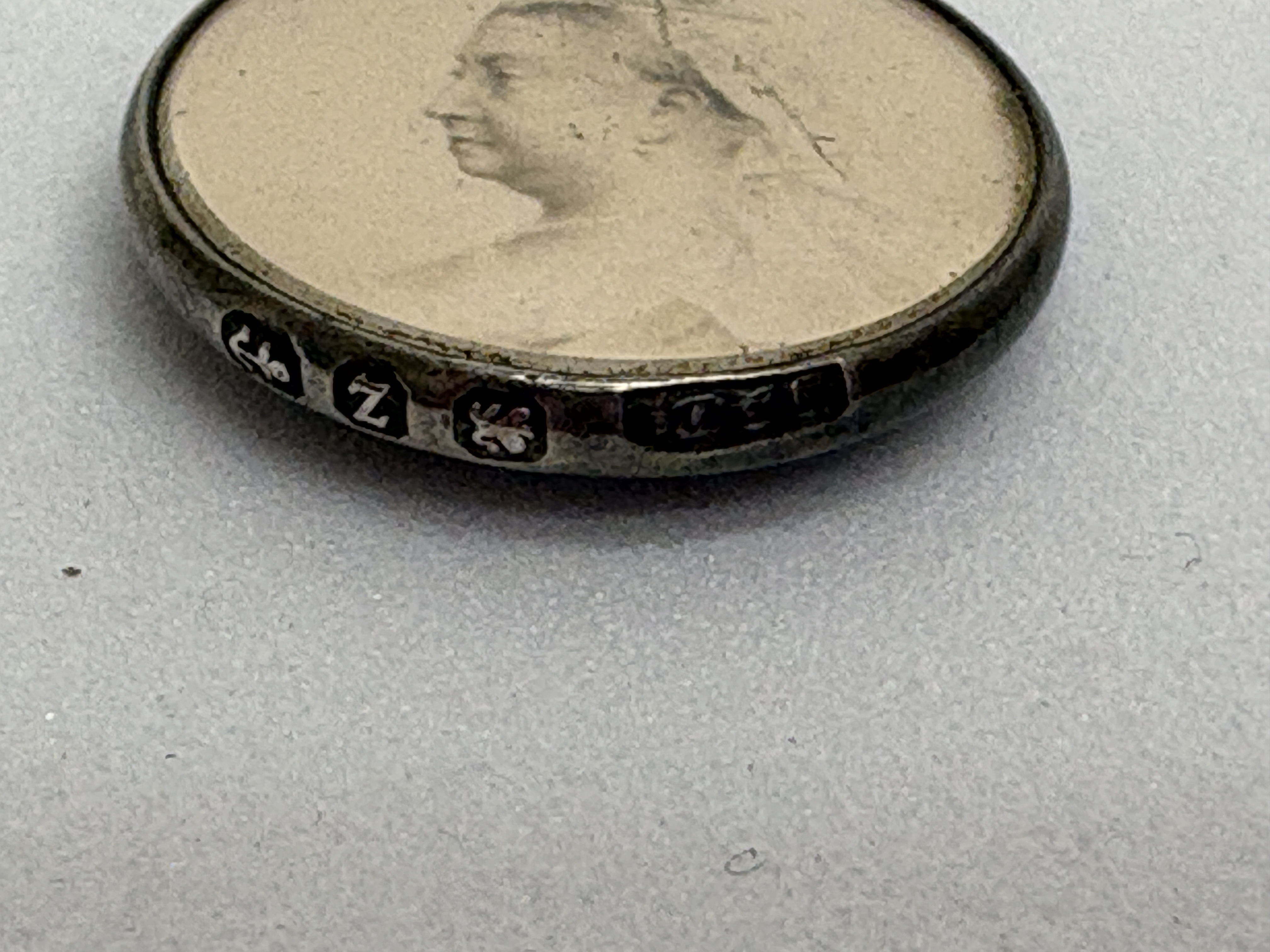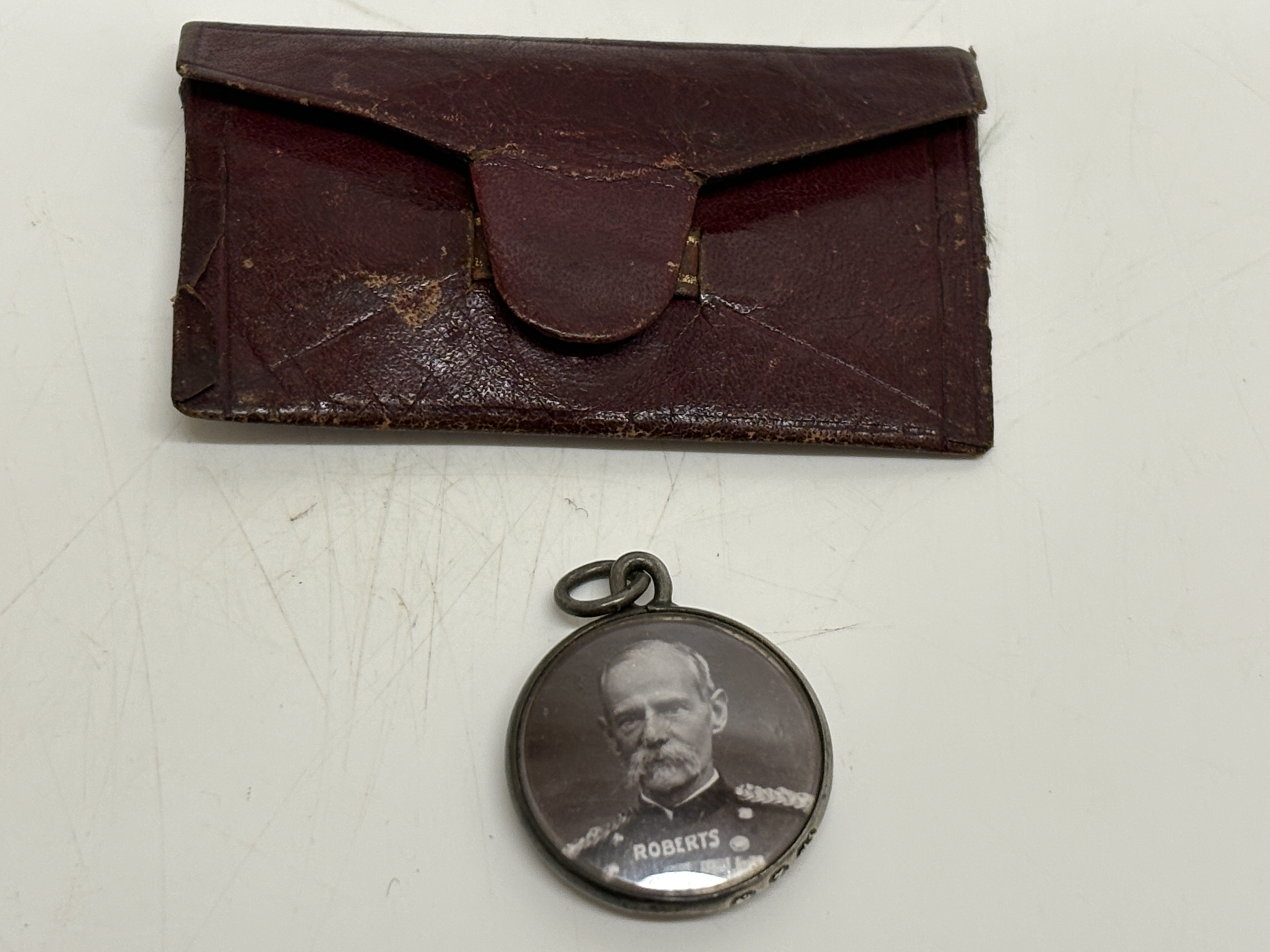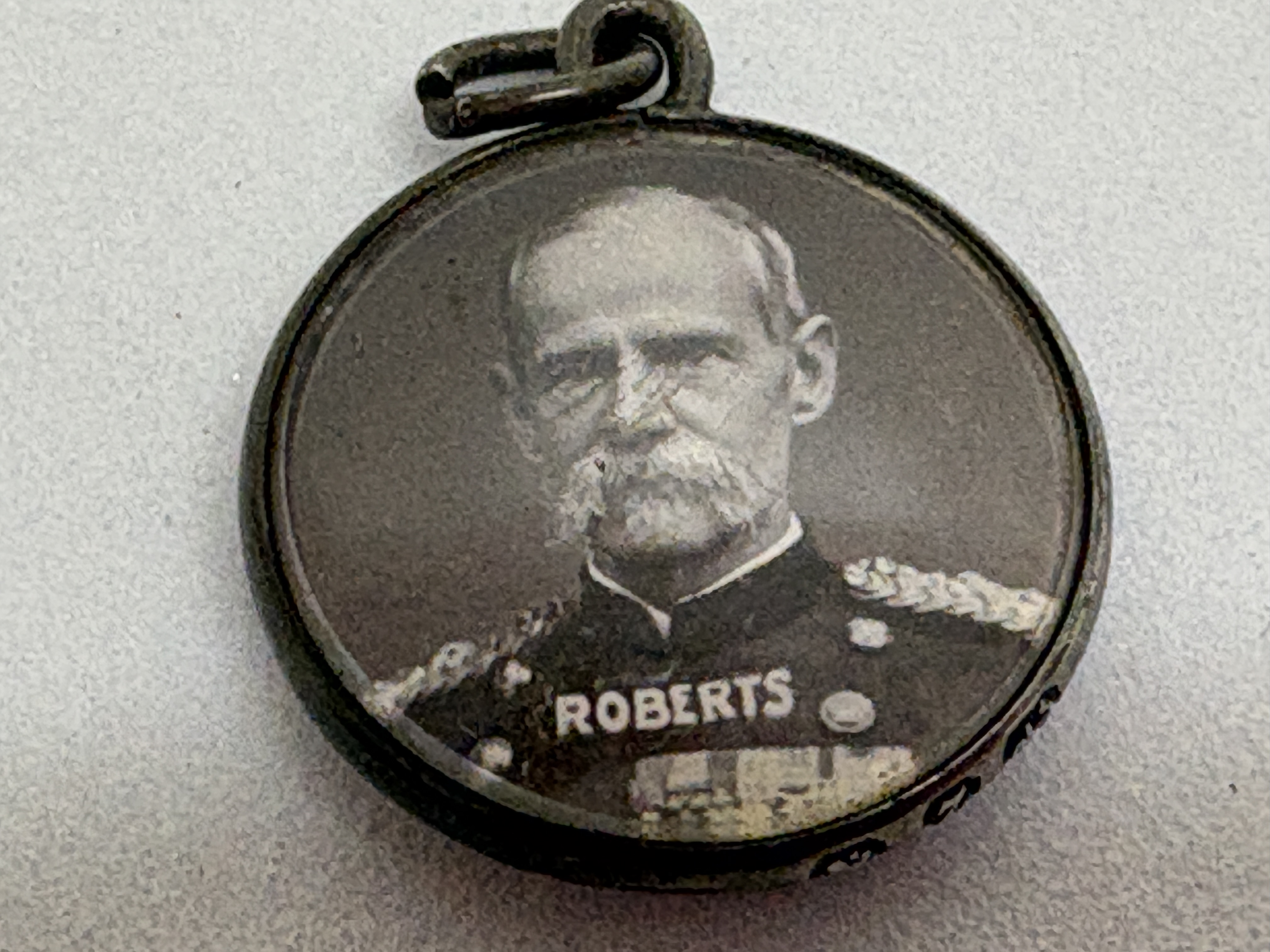 A Victorian sterling silver double-sided commemorative photo pendant or watch fob, issued as a patriotic souvenir during the Second Boer War. The obverse features a monochromatic profile portrait of Queen Victoria in her later years, depicted veiled and crowned. The reverse features a monochromatic portrait of Field Marshal Frederick Roberts, 1st Earl Roberts, captioned ROBERTS in full military dress with campaign medals. The portraits are housed within a circular silver frame with a bevelled edge, protected by transparent covers. The pendant is fitted with a fixed bail and an attached circular jump ring. The outer rim is fully hallmarked with the Birmingham anchor, the lion passant for sterling silver, the date letter z for 1899-1900, and the maker’s mark L&S for the silversmiths Levi and Salaman. The item is accompanied by a period maroon leather pouch. Diameter: 27mm.