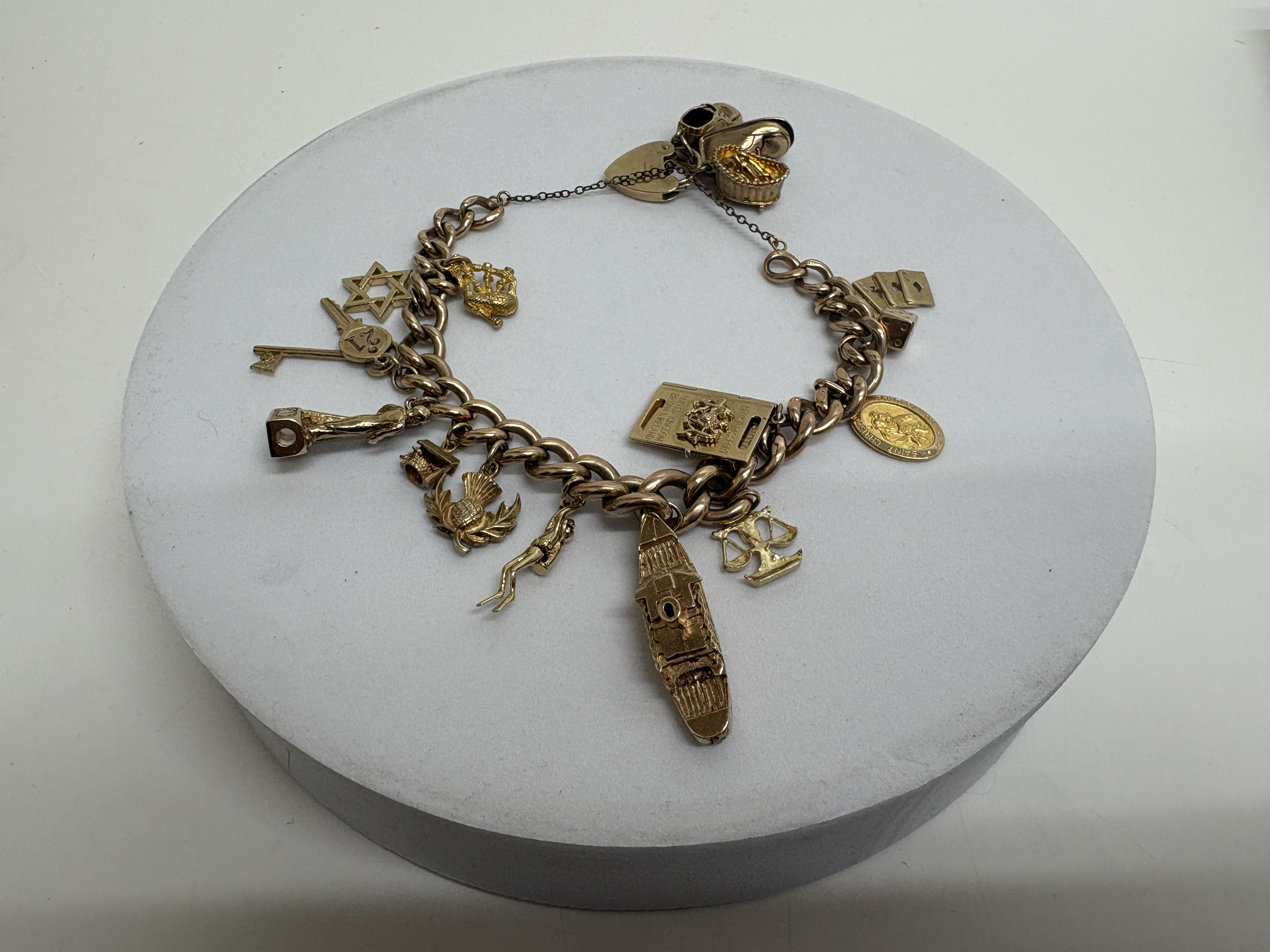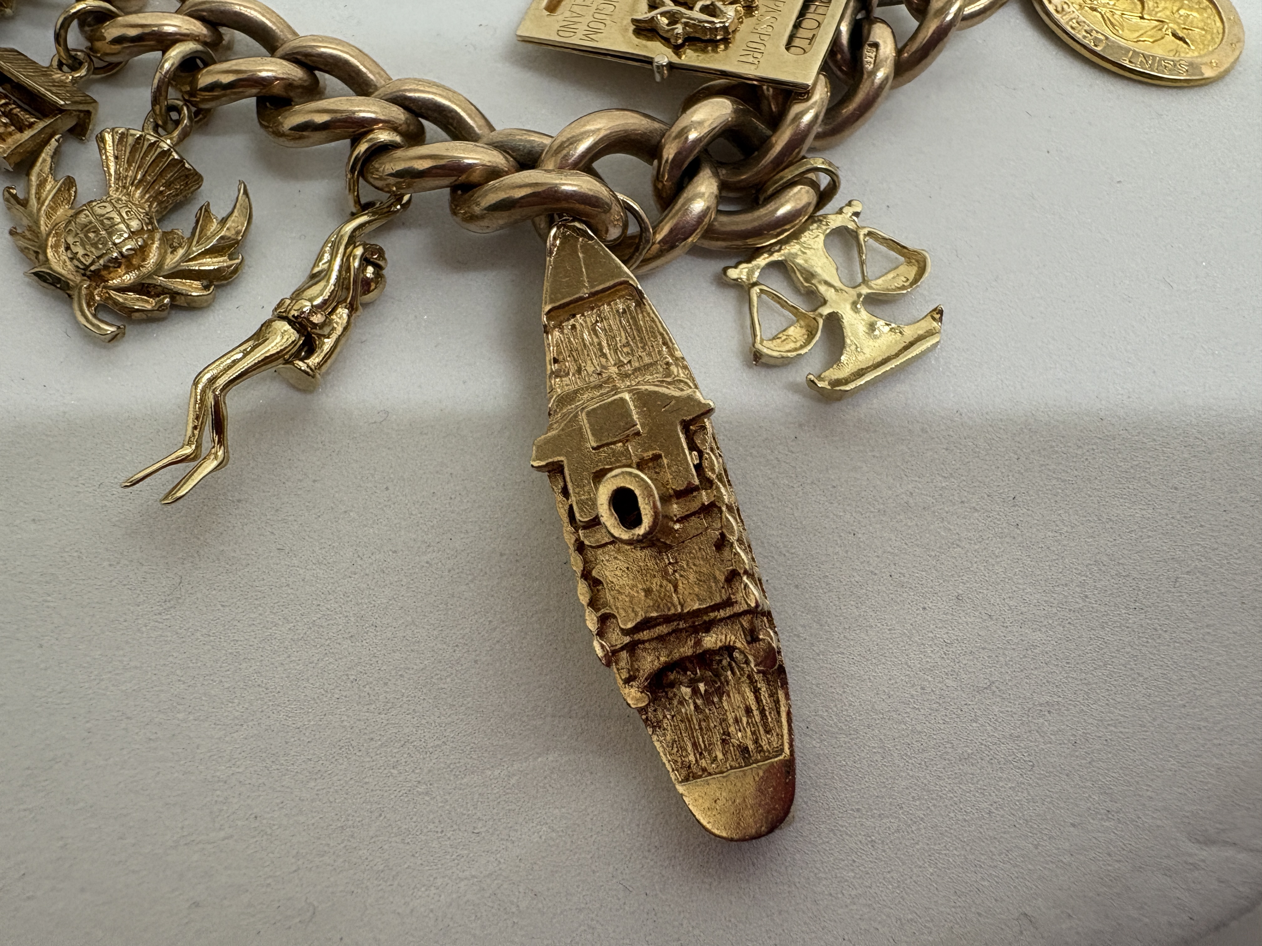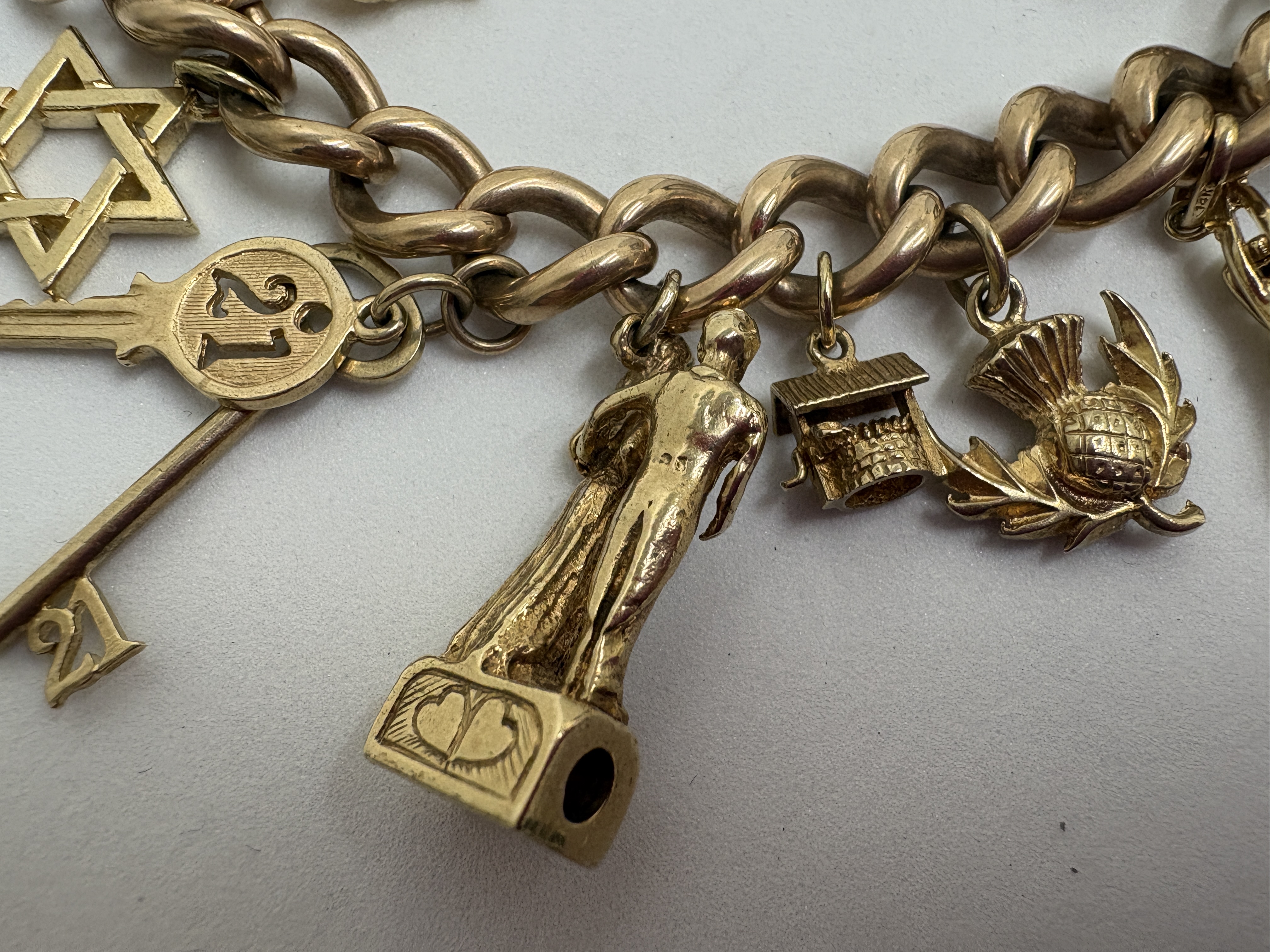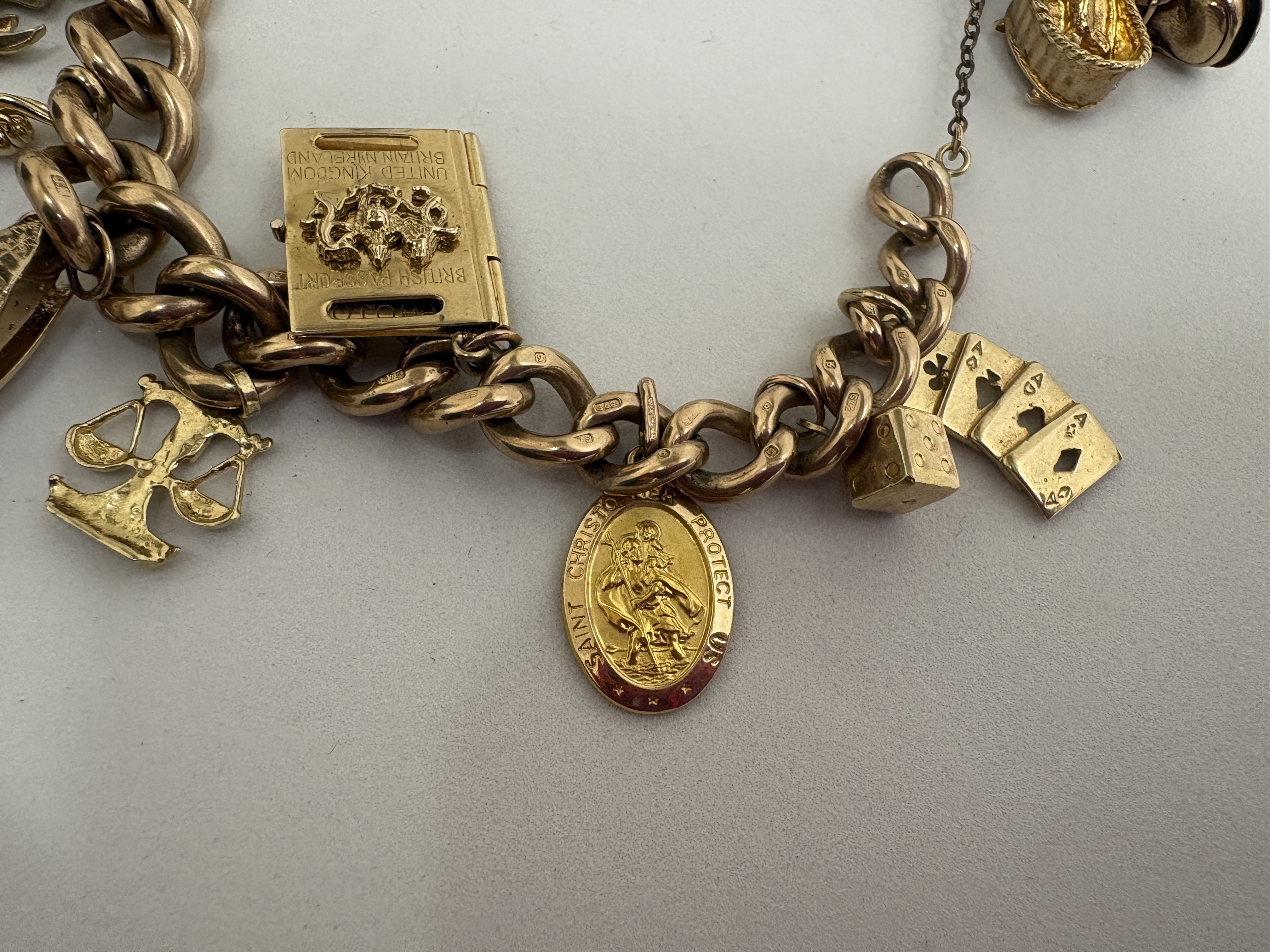 A vintage 9ct yellow gold charm bracelet of curb link design. The bracelet is secured by a heart-shaped padlock clasp, hallmarked 9 and .375 for 9-carat gold, bearing the maker’s mark LC&S and fitted with a fine link safety chain. Multiple links of the bracelet are individually struck with 375 British assay marks. The bracelet features fifteen assorted commemorative and decorative charms, to include a Star of David, a 21 birthday key, a male and female figure on a pedestal, a wishing well, a Scottish thistle, a skin diver, a detailed ocean liner, the Scales of Justice, a locket-style British Passport, a Saint Christopher medal inscribed SAINT CHRISTOPHER PROTECT US, a set of playing cards with a single die, a pair of baby shoes, Moses in a basket, bagpipes, and a crown. Weight not determined.