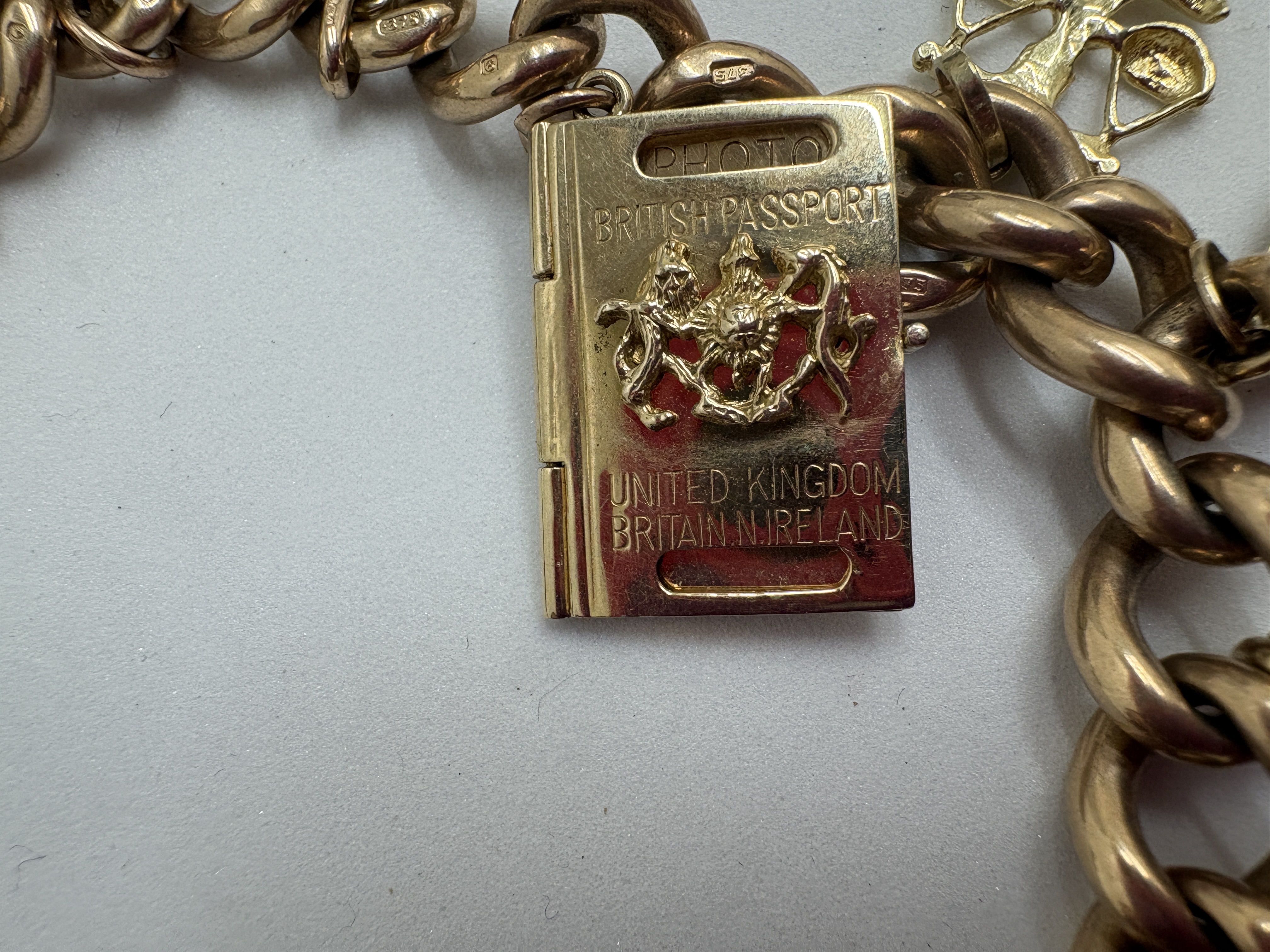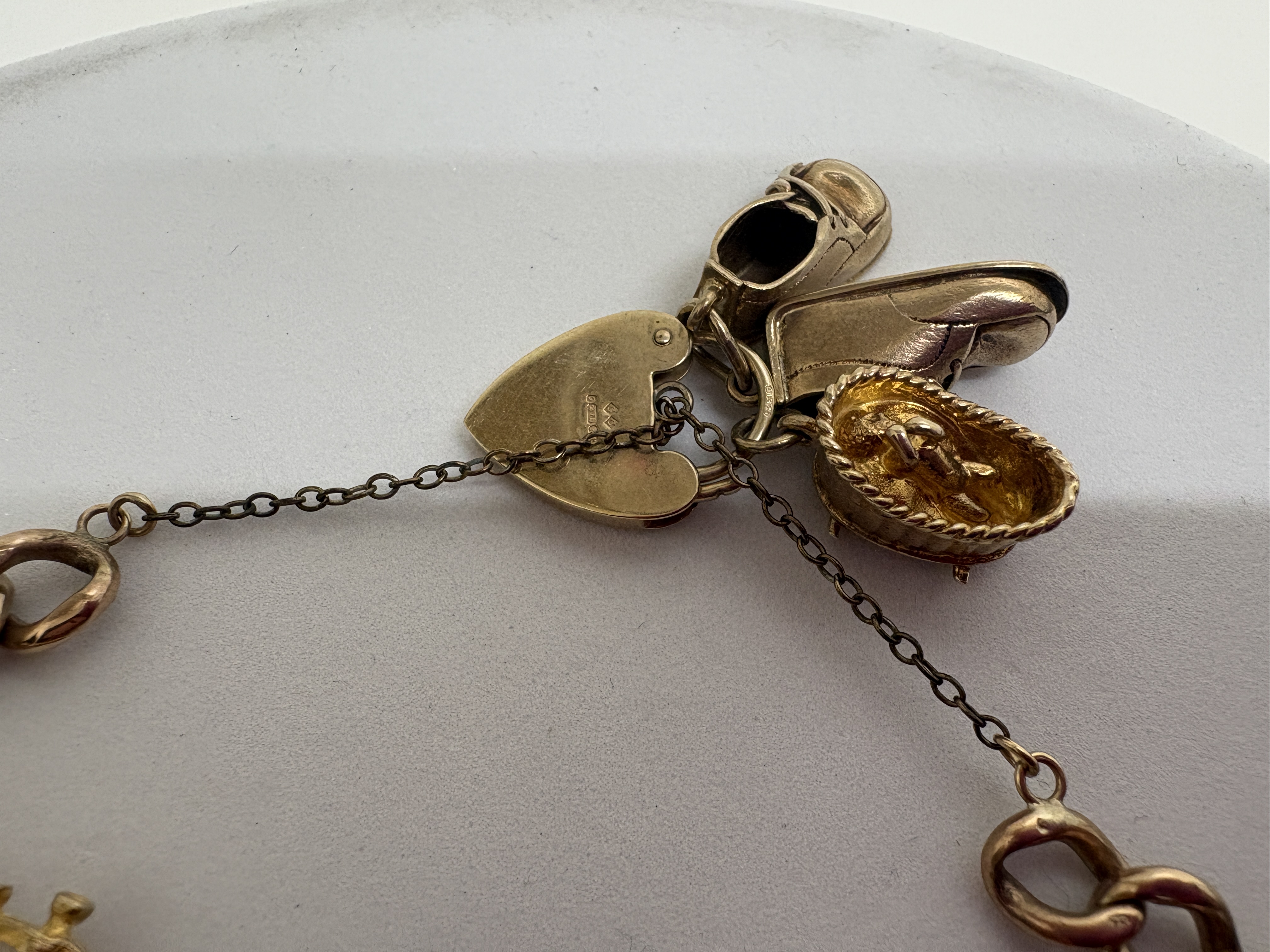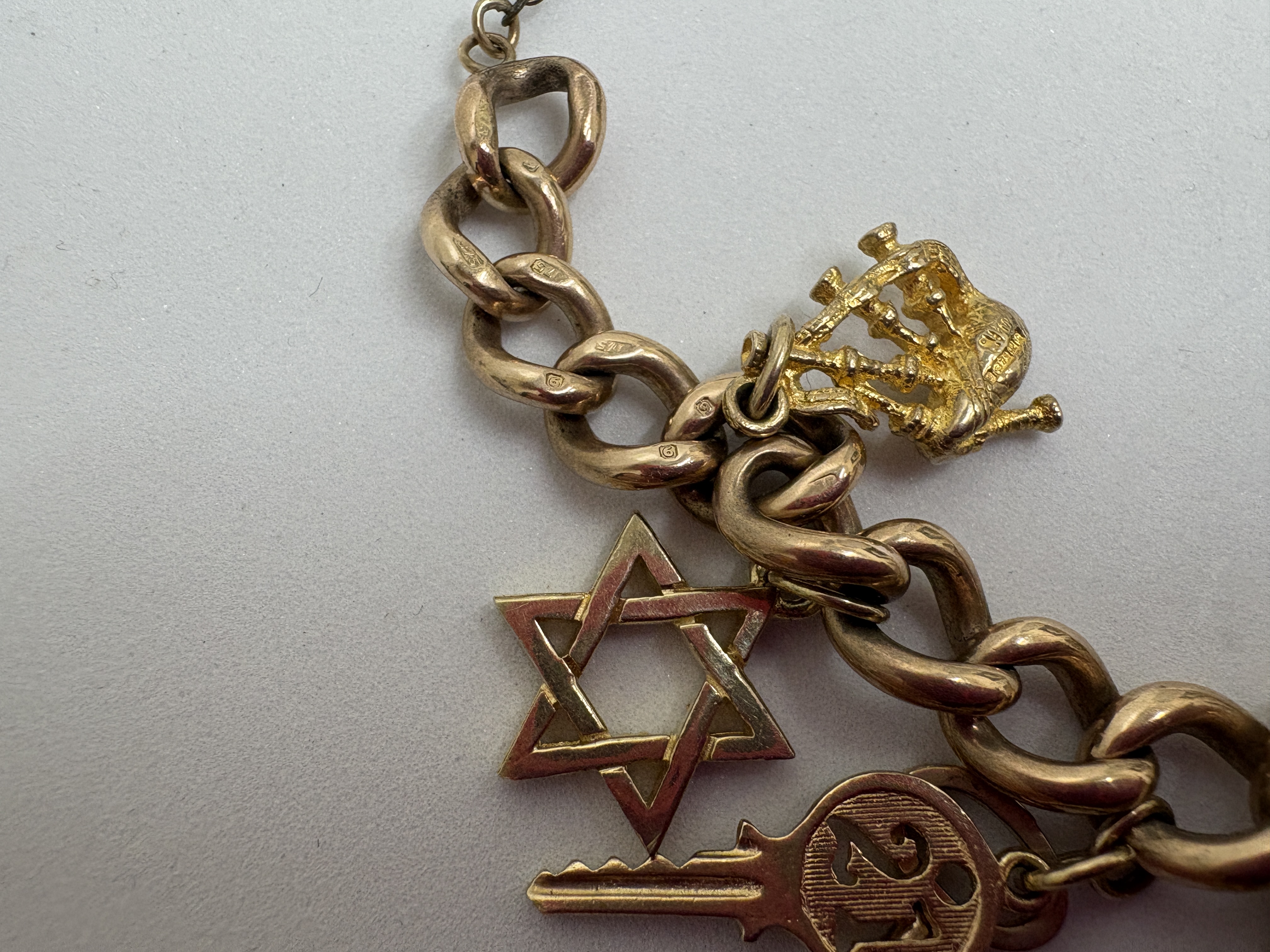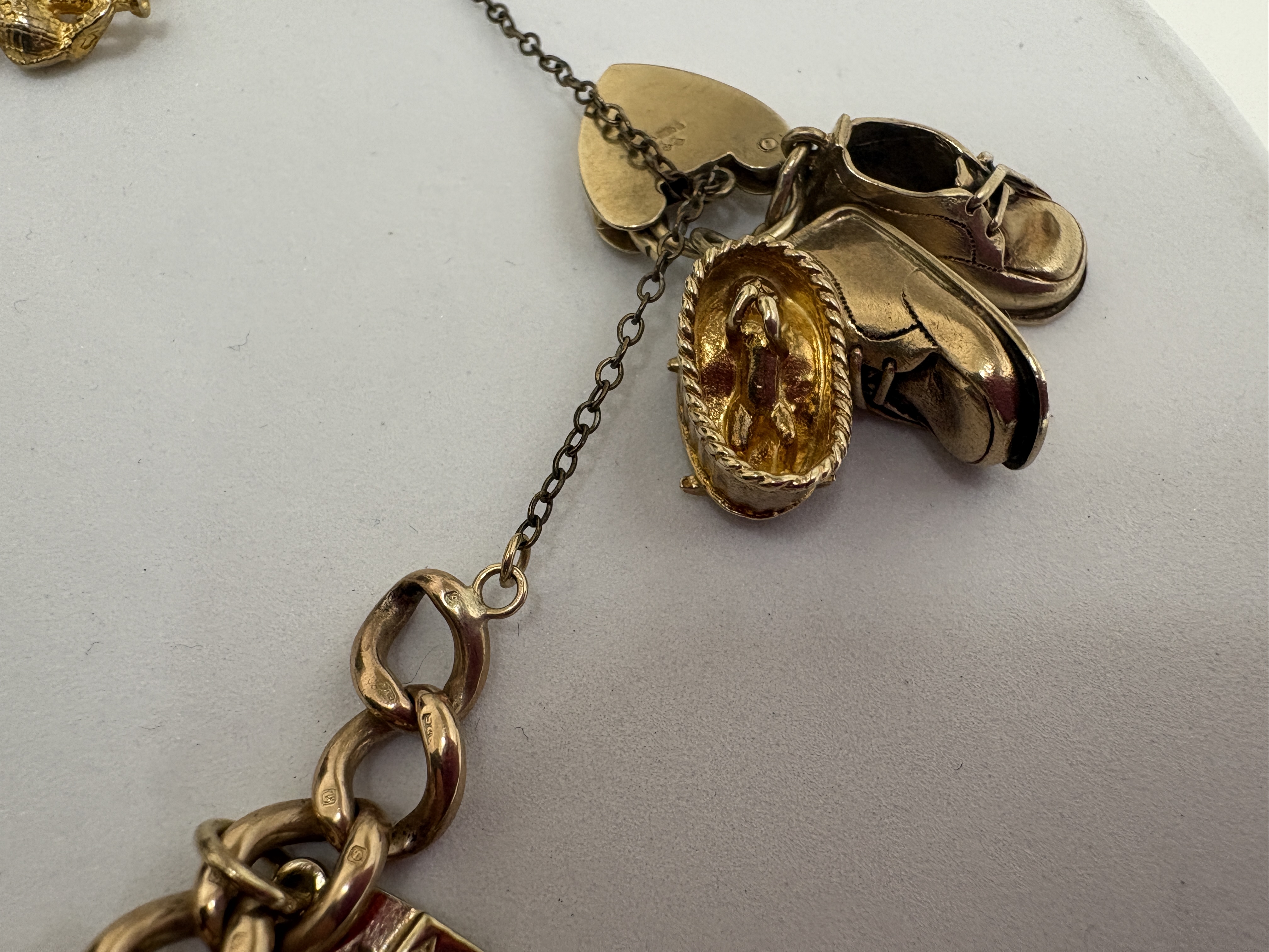 A vintage 9ct yellow gold charm bracelet of curb link design. The bracelet is secured by a heart-shaped padlock clasp, hallmarked 9 and .375 for 9-carat gold, bearing the maker’s mark LC&S and fitted with a fine link safety chain. Multiple links of the bracelet are individually struck with 375 British assay marks. The bracelet features fifteen assorted commemorative and decorative charms, to include a Star of David, a 21 birthday key, a male and female figure on a pedestal, a wishing well, a Scottish thistle, a skin diver, a detailed ocean liner, the Scales of Justice, a locket-style British Passport, a Saint Christopher medal inscribed SAINT CHRISTOPHER PROTECT US, a set of playing cards with a single die, a pair of baby shoes, Moses in a basket, bagpipes, and a crown. Weight not determined.