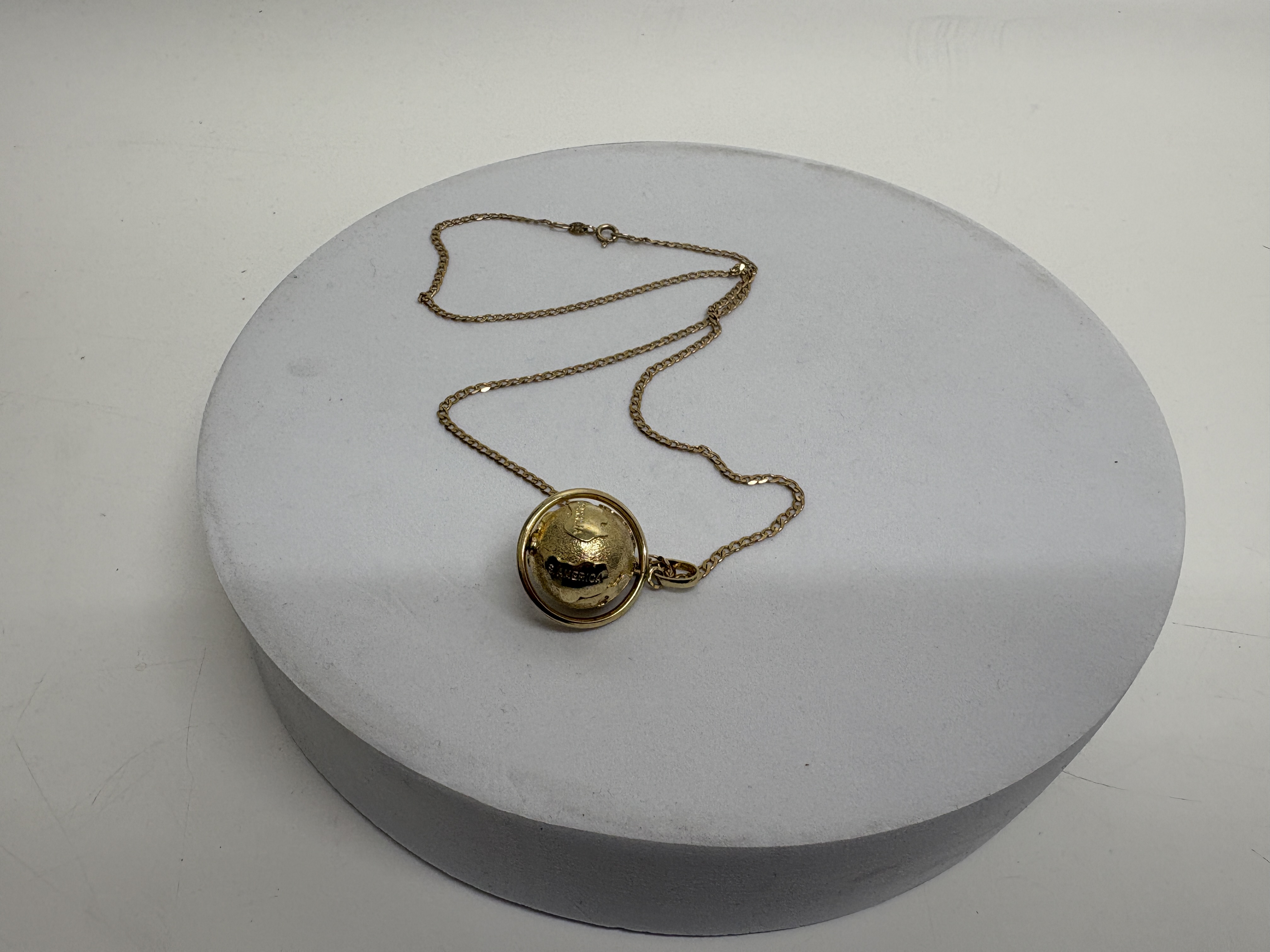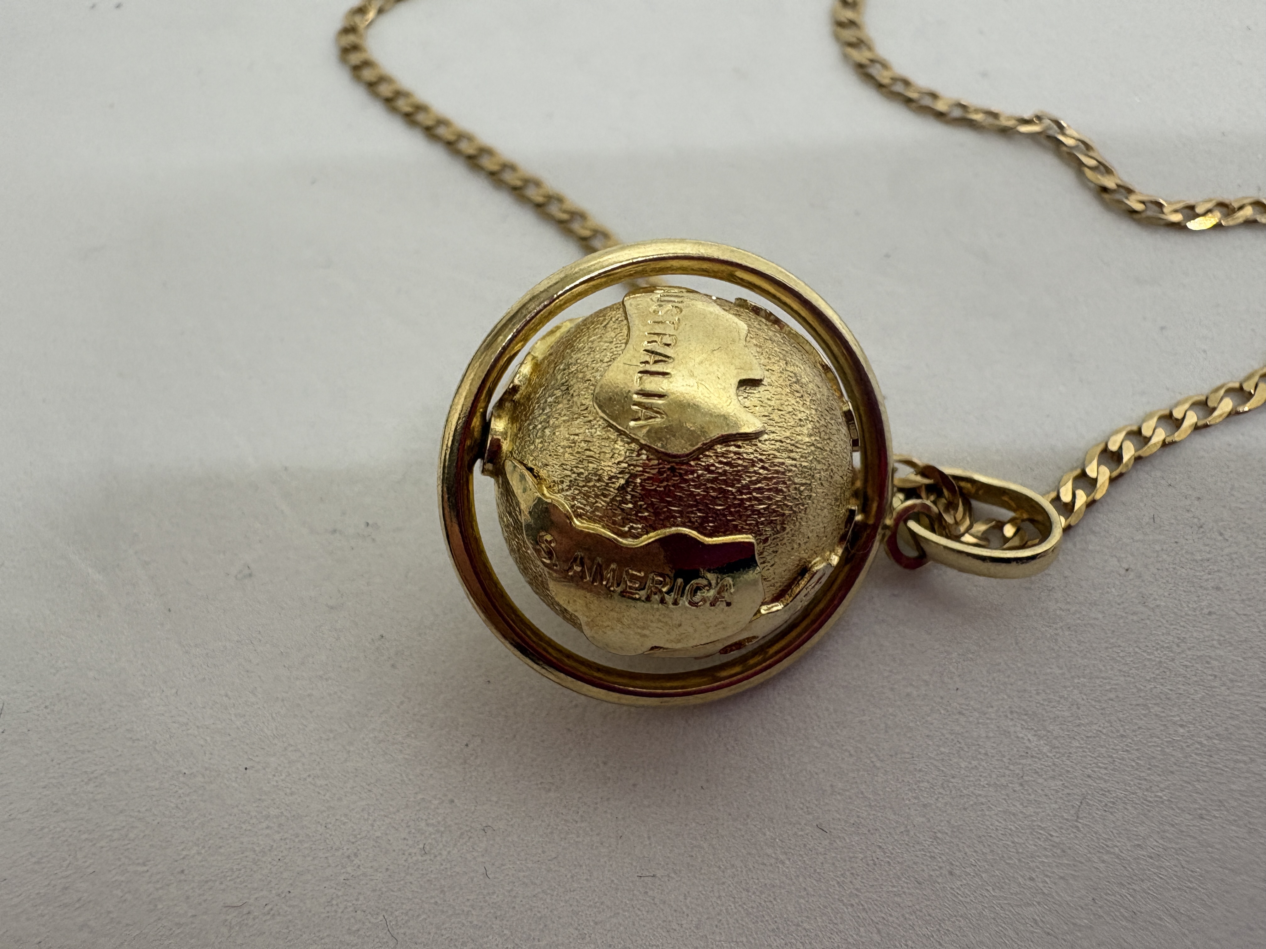 A 9ct yellow gold necklace comprising a fine curb-link chain and a rotating globe pendant. The spherical globe is mounted within a circular gimbal-style frame, allowing it to spin freely. The pendant features polished raised relief continents against a stippled textured ground, with continents including AUSTRALIA and S. AMERICA clearly labelled. The necklace is secured by a spring ring clasp and is hallmarked on an oval tag with 9KT and an indistinct maker’s mark. Chain length approximately 45.7cm (18 inches). Pendant diameter approximately 15mm.