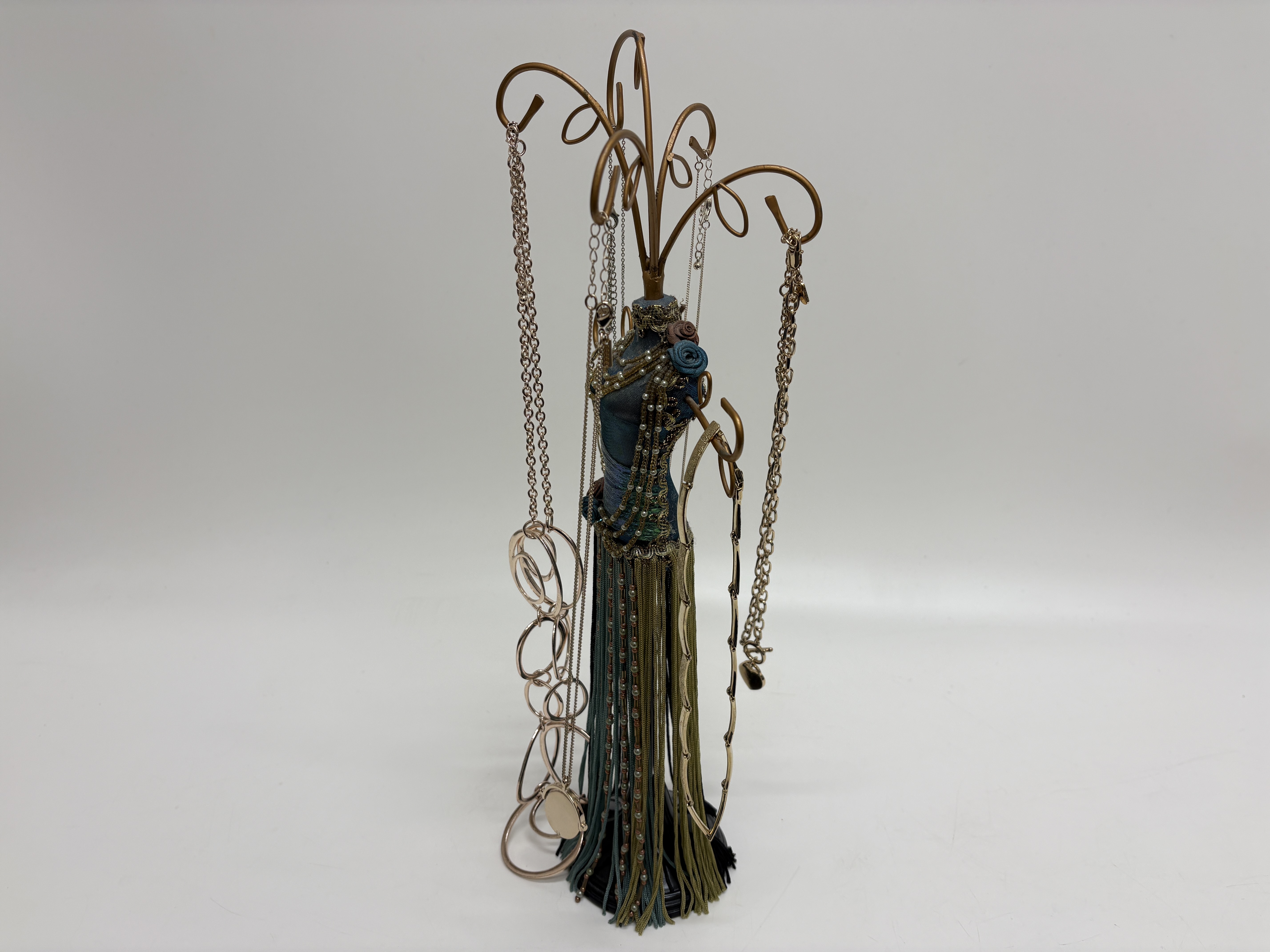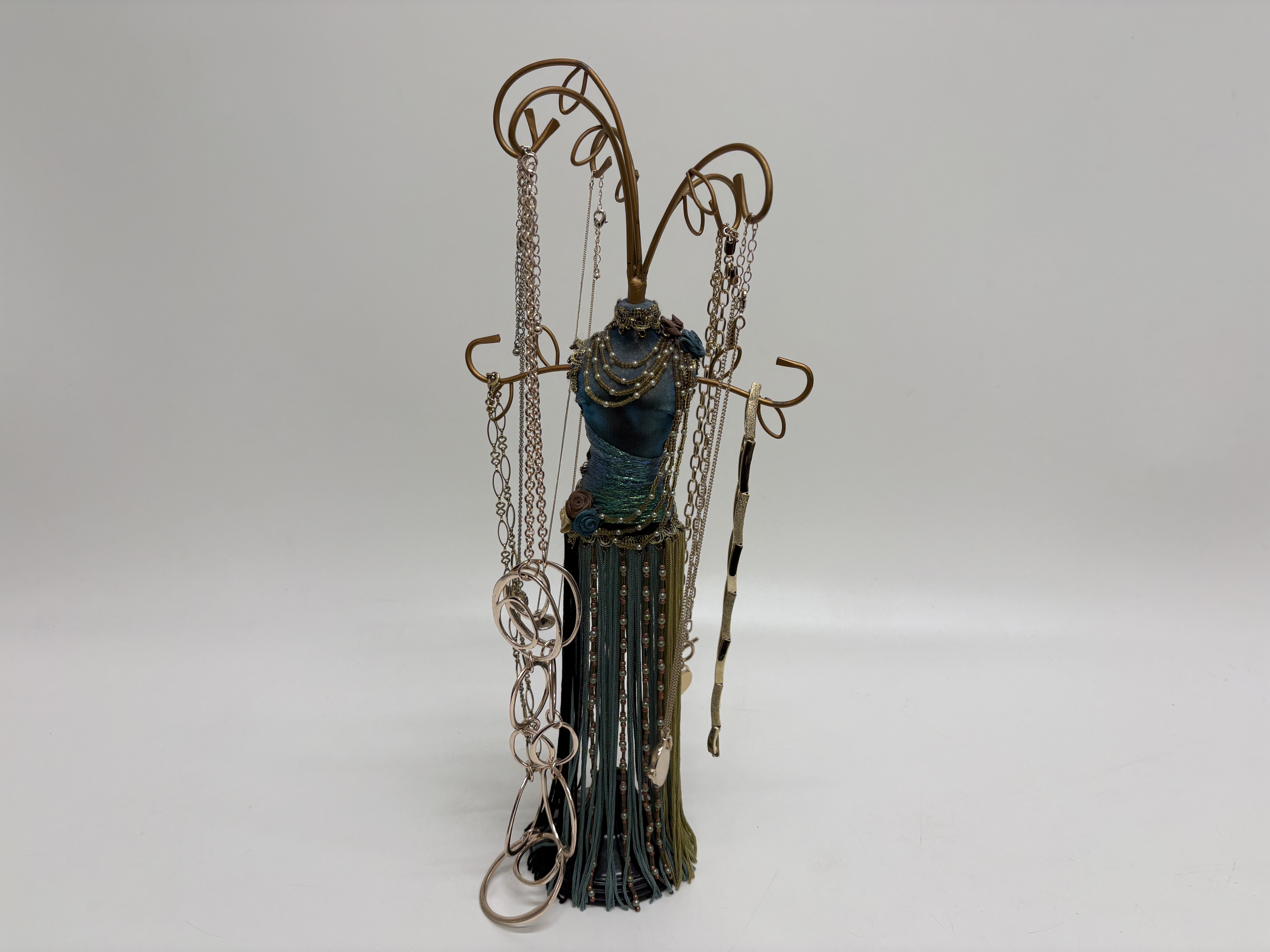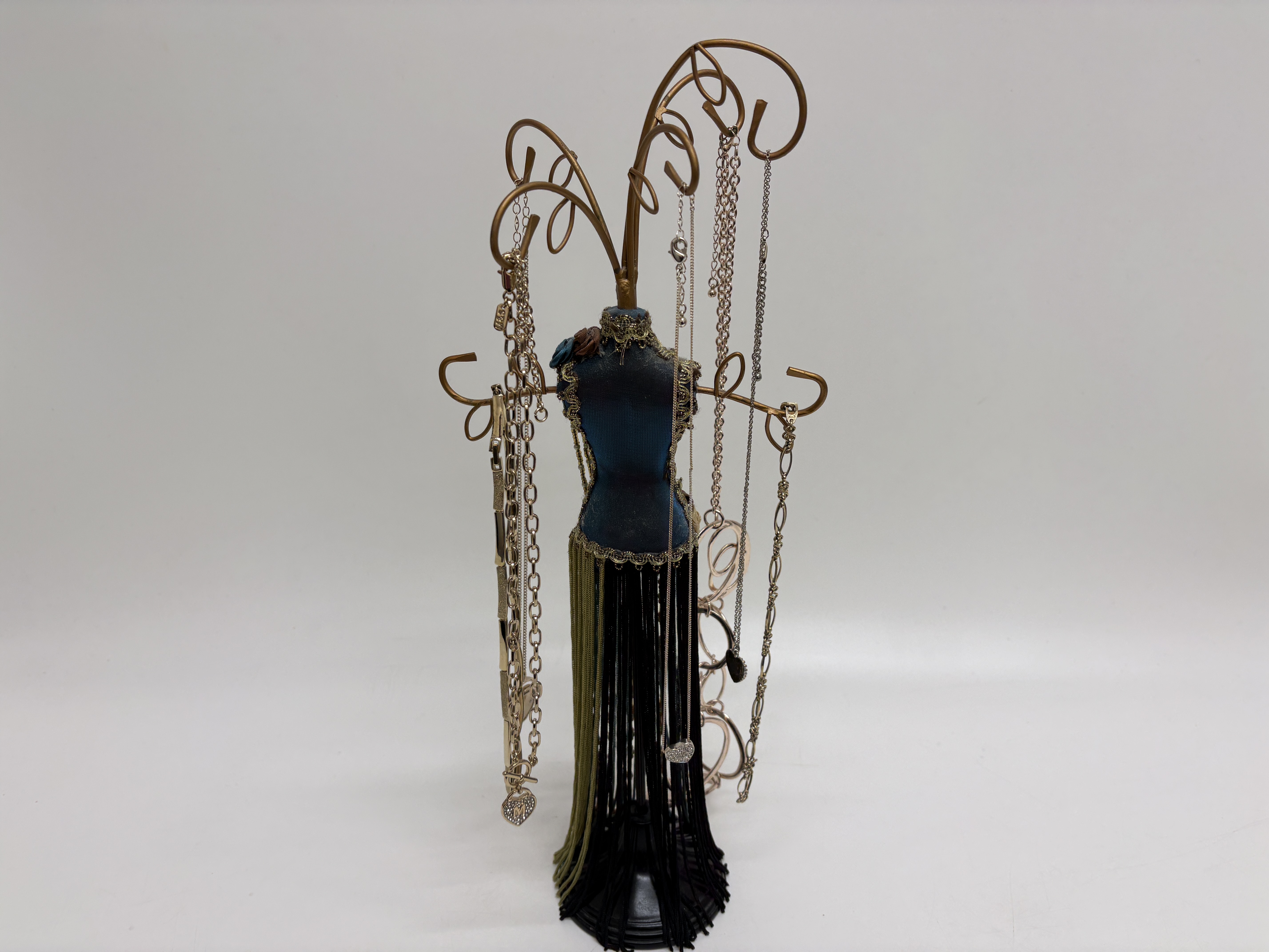 A collection of contemporary fashion jewellery featuring various necklaces and pendants presented on a decorative mannequin stand. The set includes a long rose gold-tone necklace with oversized interlocking open-circle and oval links, finished with a solid round medallion pendant. Also included is a gold-tone cable chain necklace featuring a toggle clasp and a heart-shaped pendant set with clear synthetic crystals and a central letter M. The collection further comprises at least four delicate silver-tone and gold-tone cable chains with small heart and circular charms, alongside a gold-tone necklace with flat geometric links. The items are displayed on a decorative miniature mannequin stand featuring a teal and iridescent green fabric torso with a multi-tonal fringe skirt and gold-tone wire scrollwork. No hallmarks are present. Lengths range from approximately 40 cm to 91 cm.