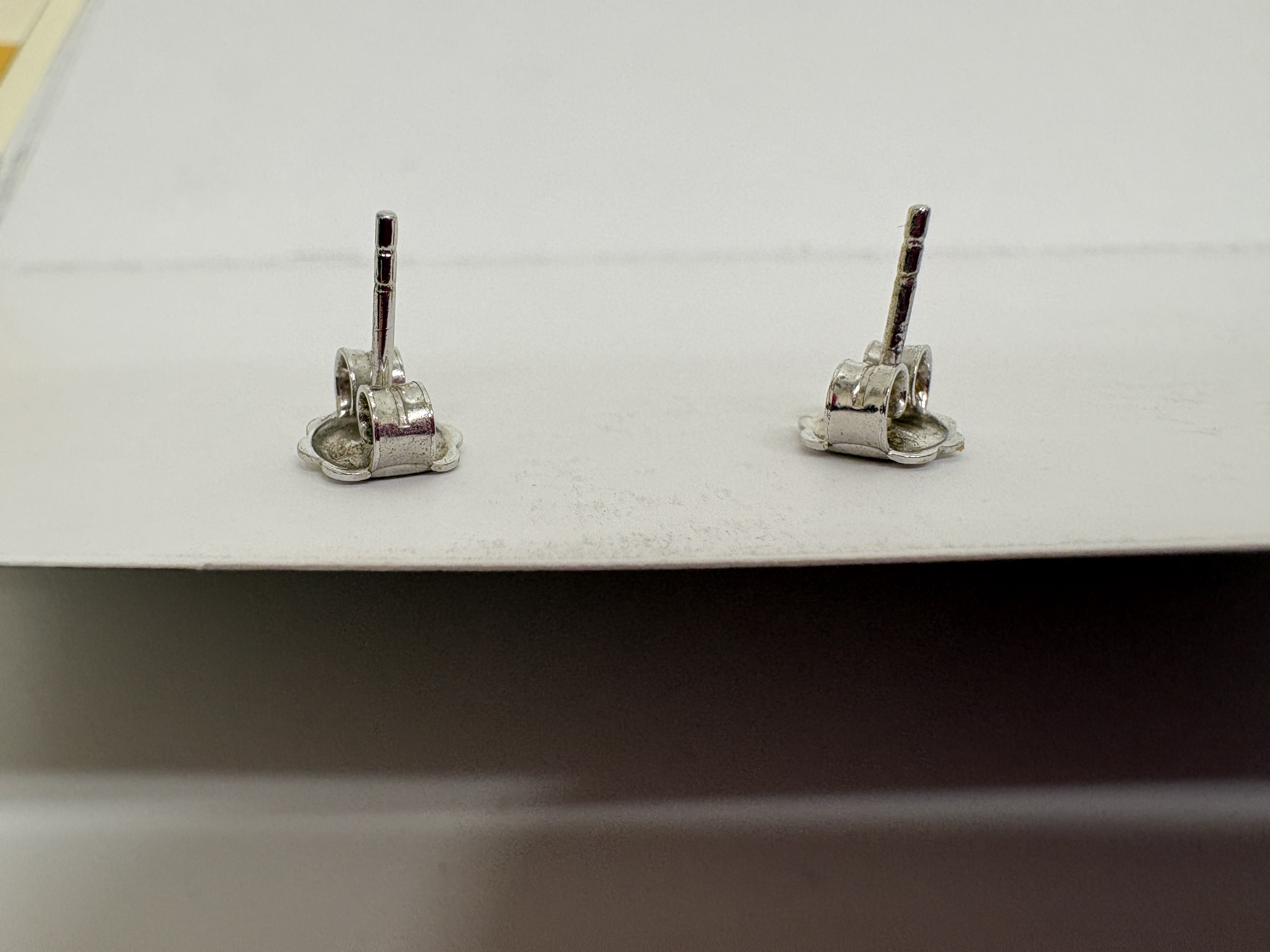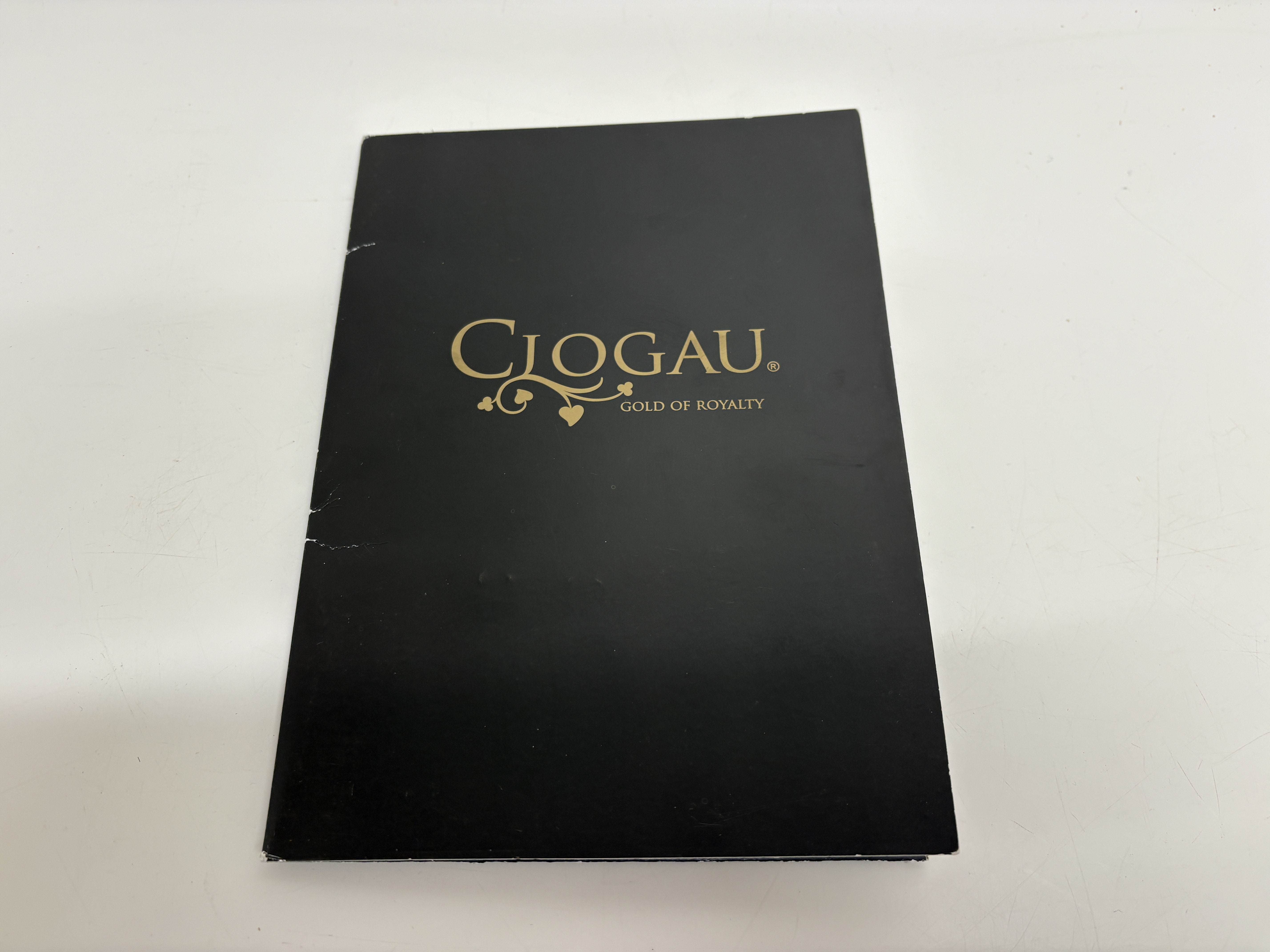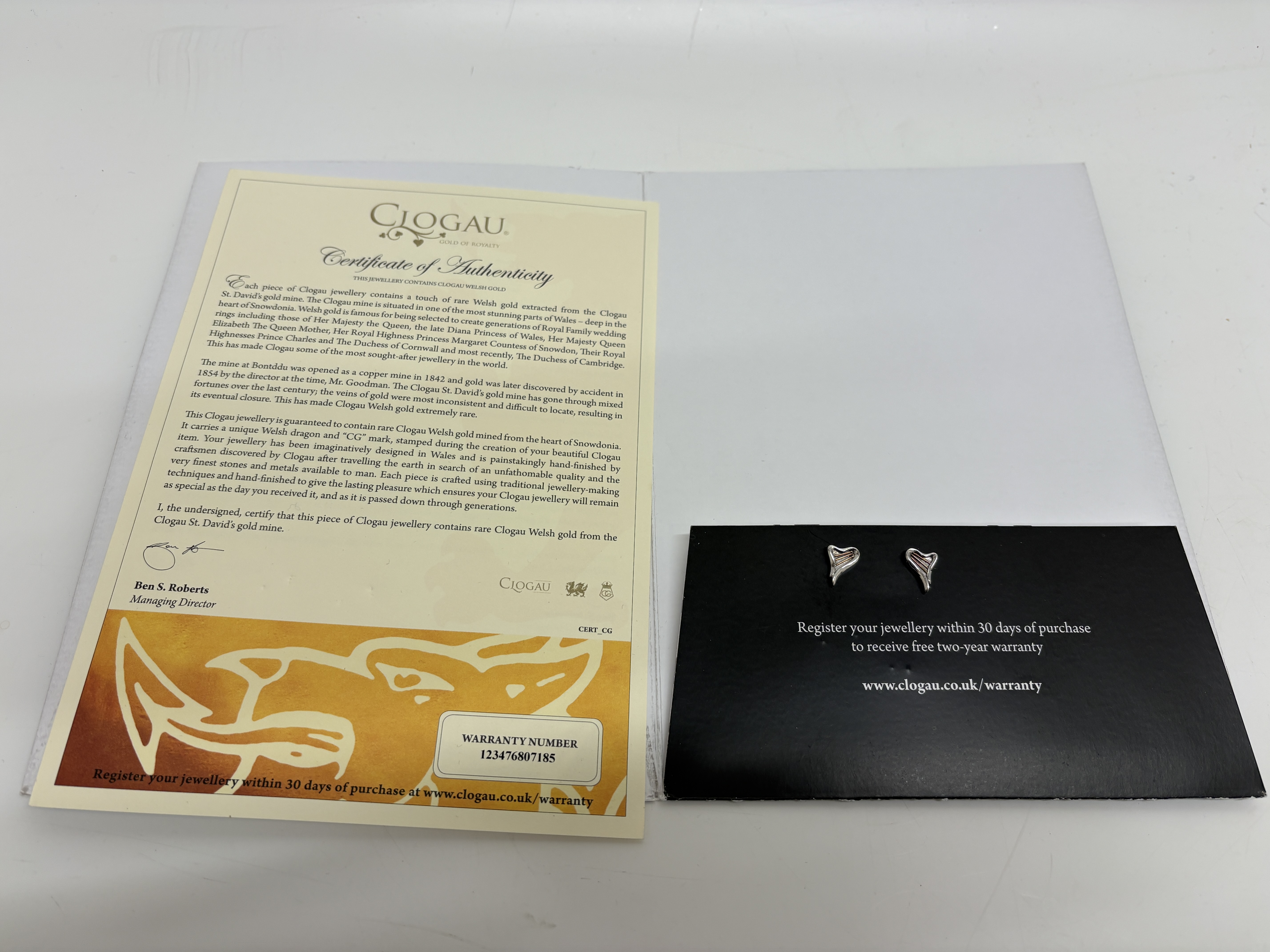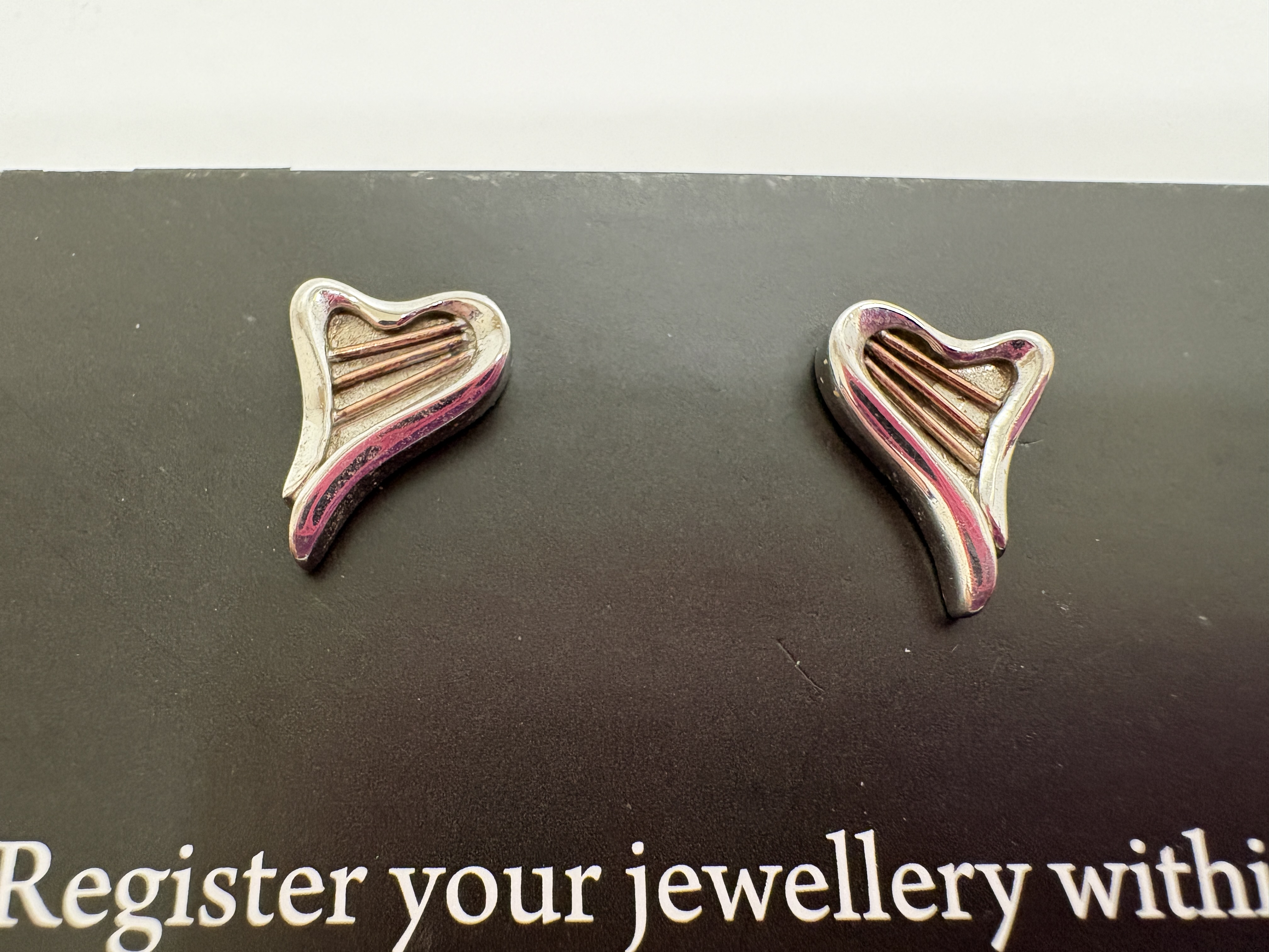 A matched pair of bi-metal stud earrings by Clogau Gold of Royalty. Each earring is designed in the form of a Celtic harp, featuring a sterling silver frame accented with 9ct rose gold strings, which contain a portion of rare Welsh gold. The earrings are secured with straight posts and butterfly friction backs. Although specific hallmarks on the posts are not clearly legible, the lot is accompanied by a genuine Clogau Certificate of Authenticity and an original presentation folder. No gemstones are present. Weight: Not recorded.