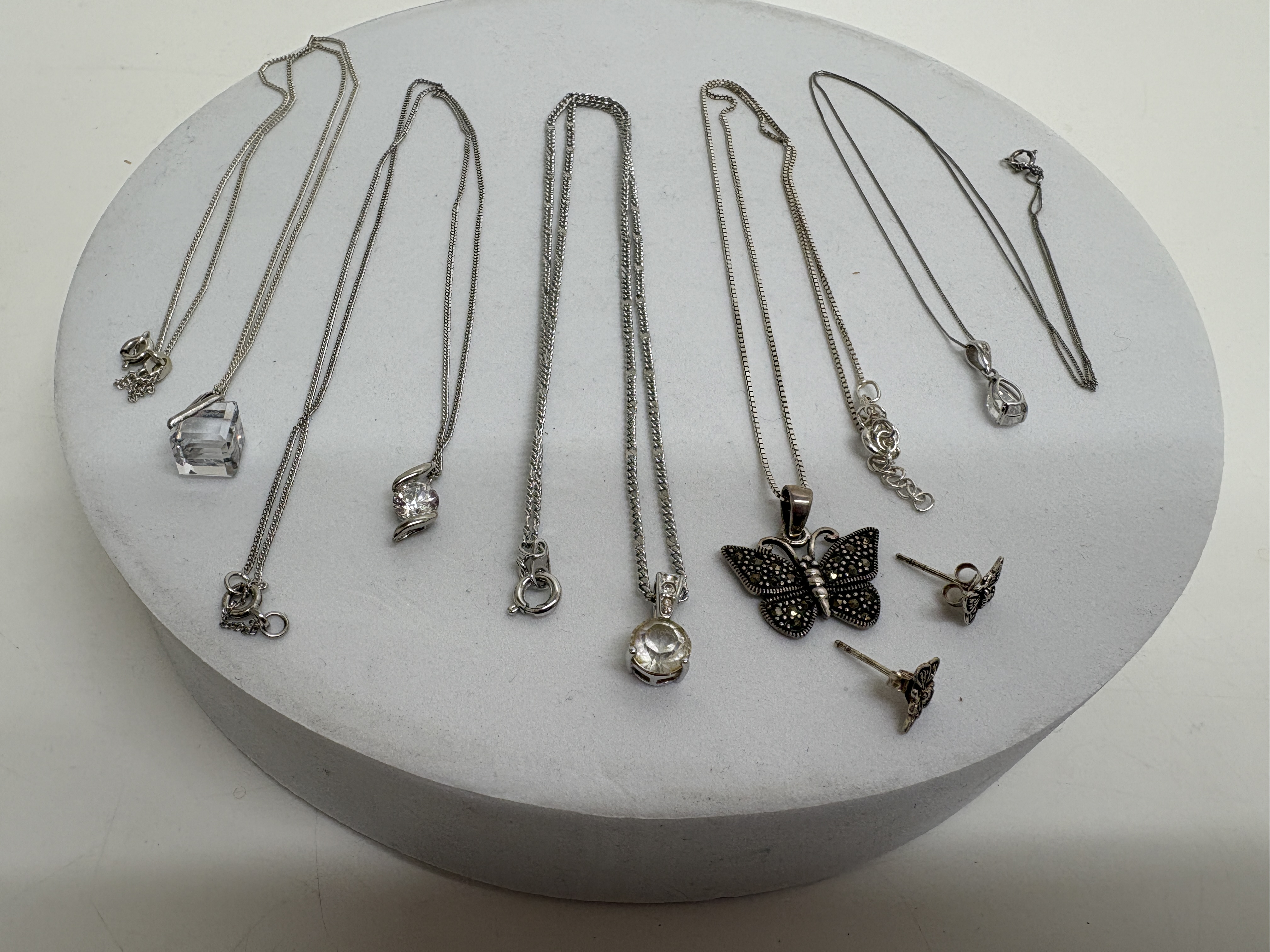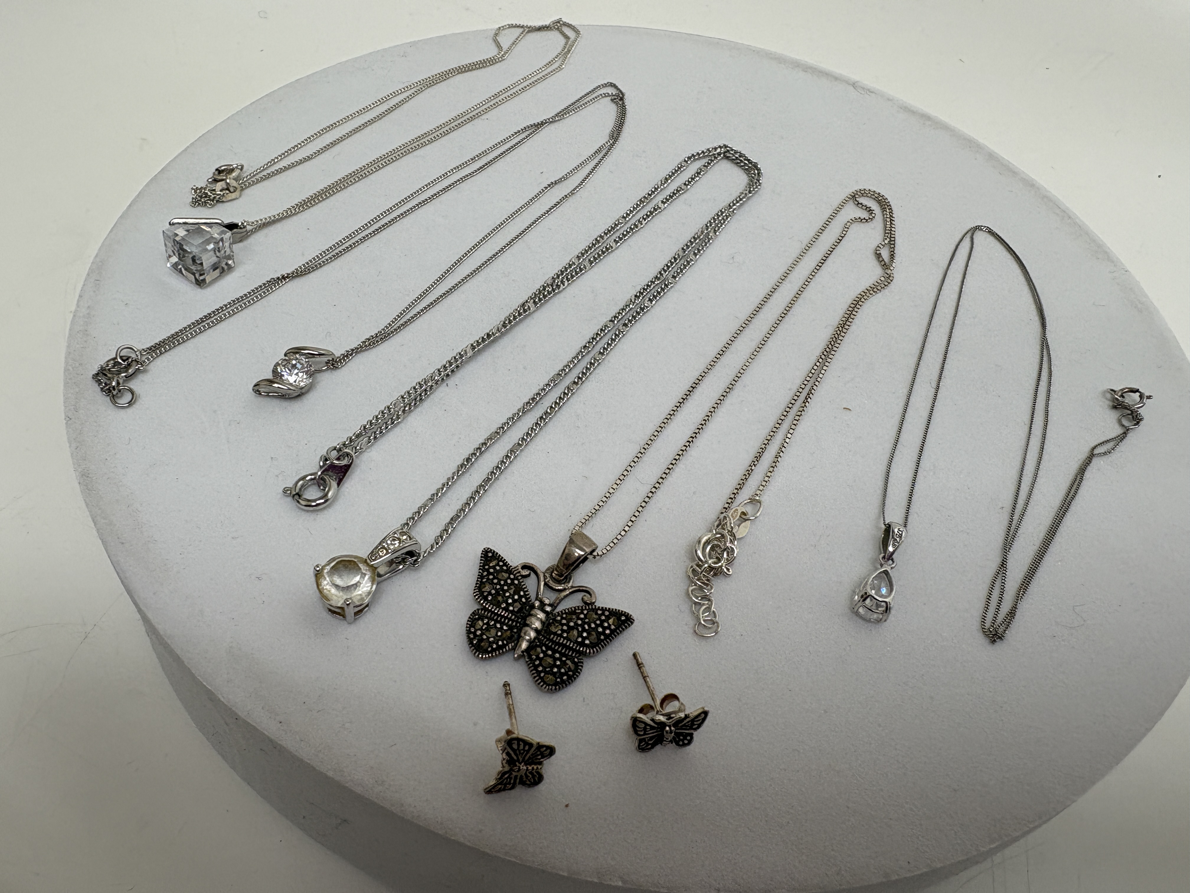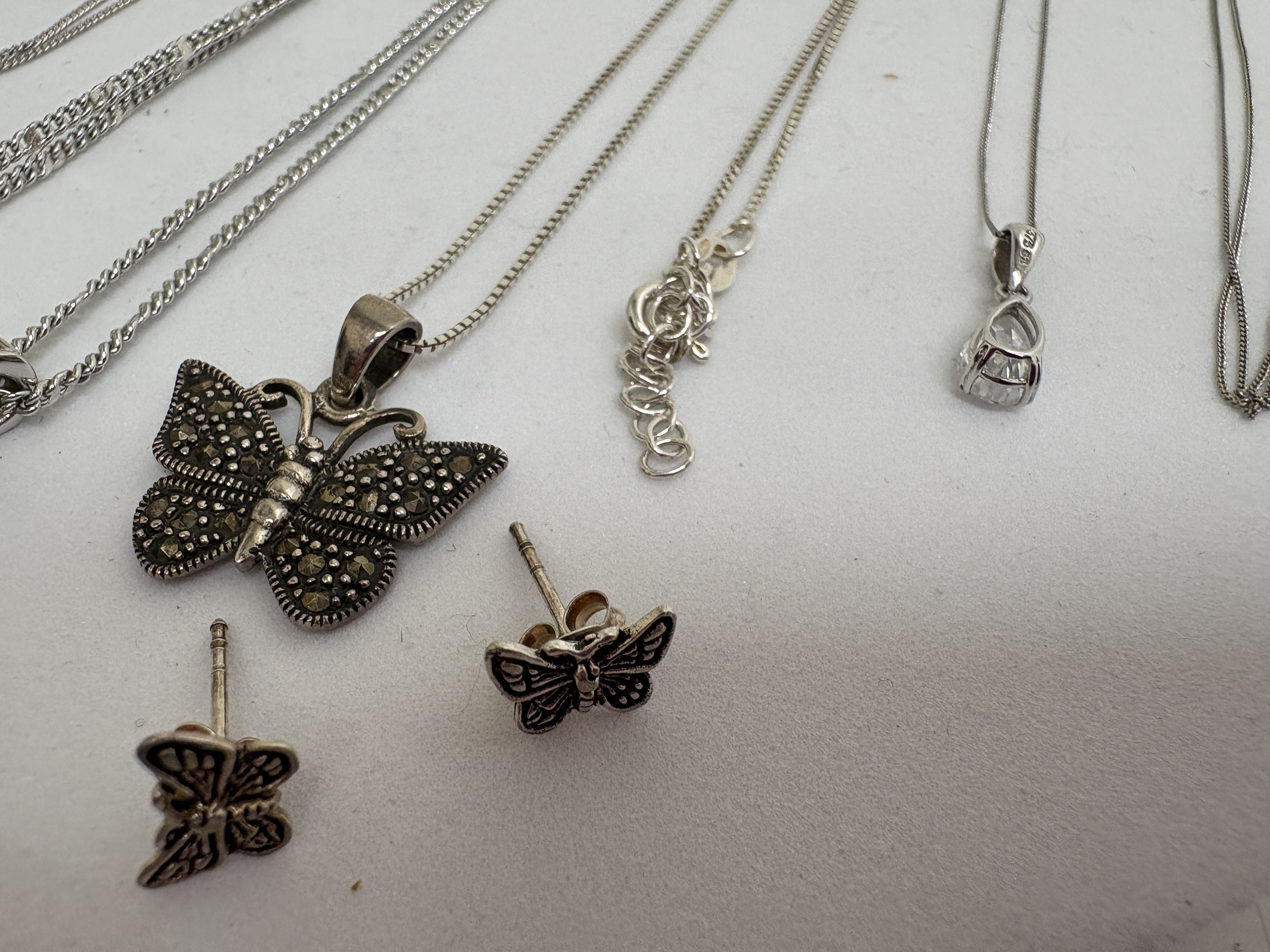 A collection of five contemporary pendant necklaces and a matching pair of stud earrings. The lot includes a sterling silver butterfly suite featuring a pendant and matching stud earrings, both set with numerous small marcasite stones, suspended from a sterling silver box chain with an adjustable extender. Also included is a sterling silver necklace featuring a pear-cut faceted clear stone in a prong setting on a fine curb chain. The collection further comprises three silver-tone necklaces: one with a large emerald-cut clear crystal in a geometric setting on a fine curb chain; one featuring a round brilliant-cut clear stone in a modern swirl tension-style setting on a fine curb chain; and a prominent round faceted clear stone in a four-prong basket setting on a double curb link chain. Hallmarks include 925 on the butterfly suite bail and chain tag, and 925 on the pear-cut pendant bail. Lengths approximately 40.5 cm to 50.8 cm.