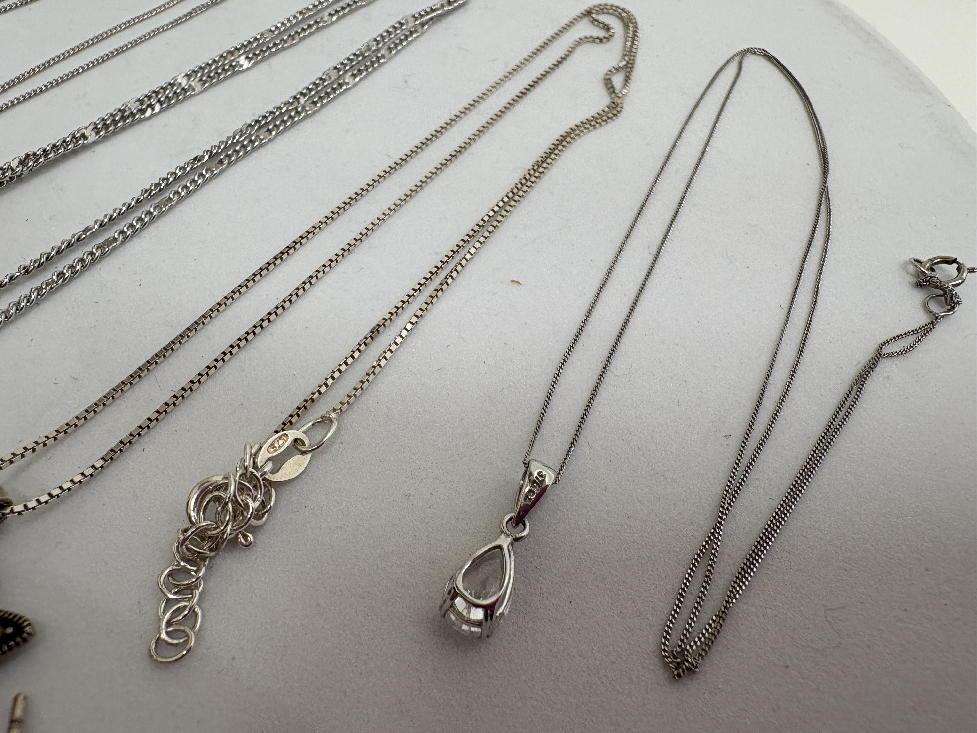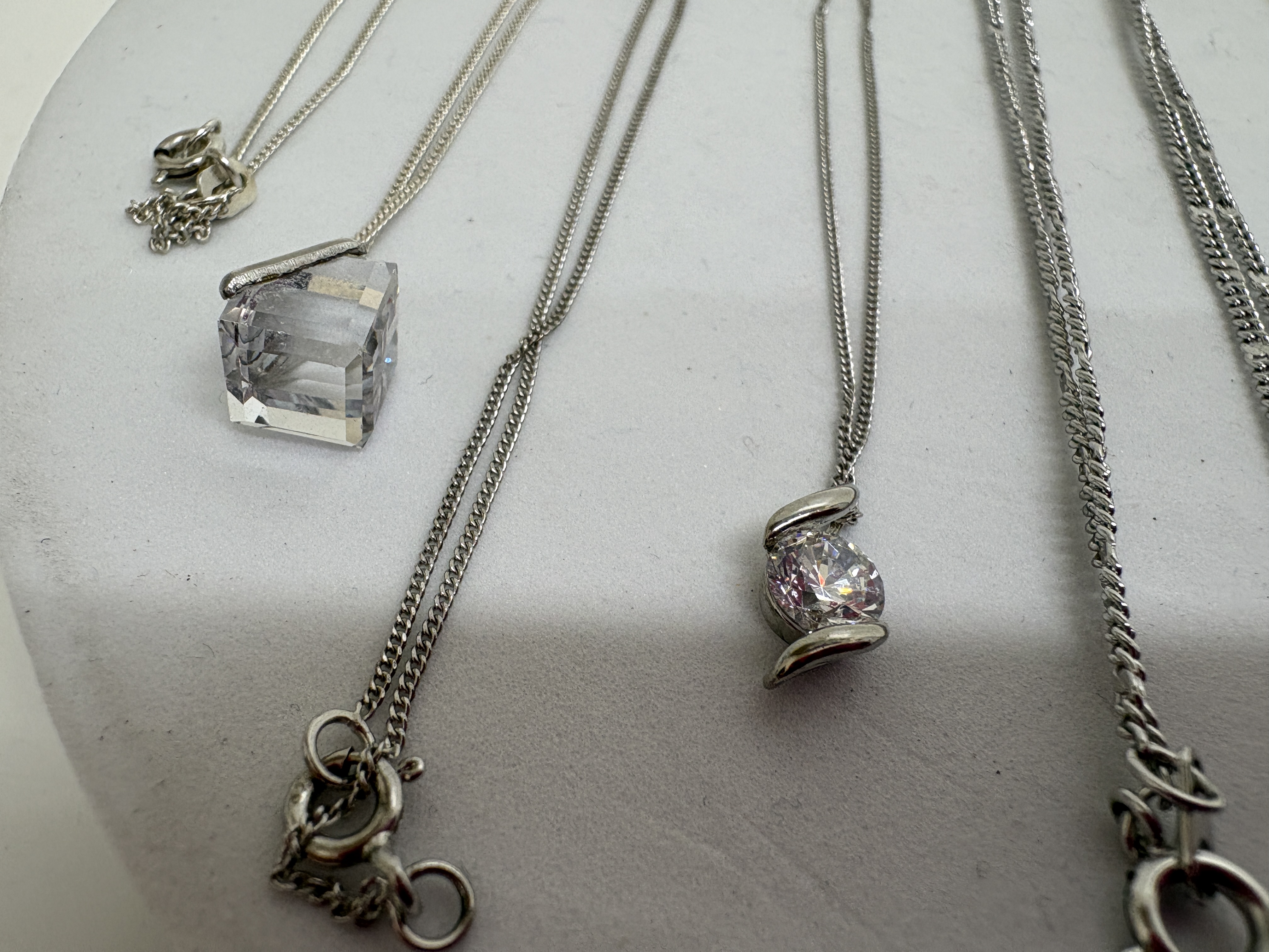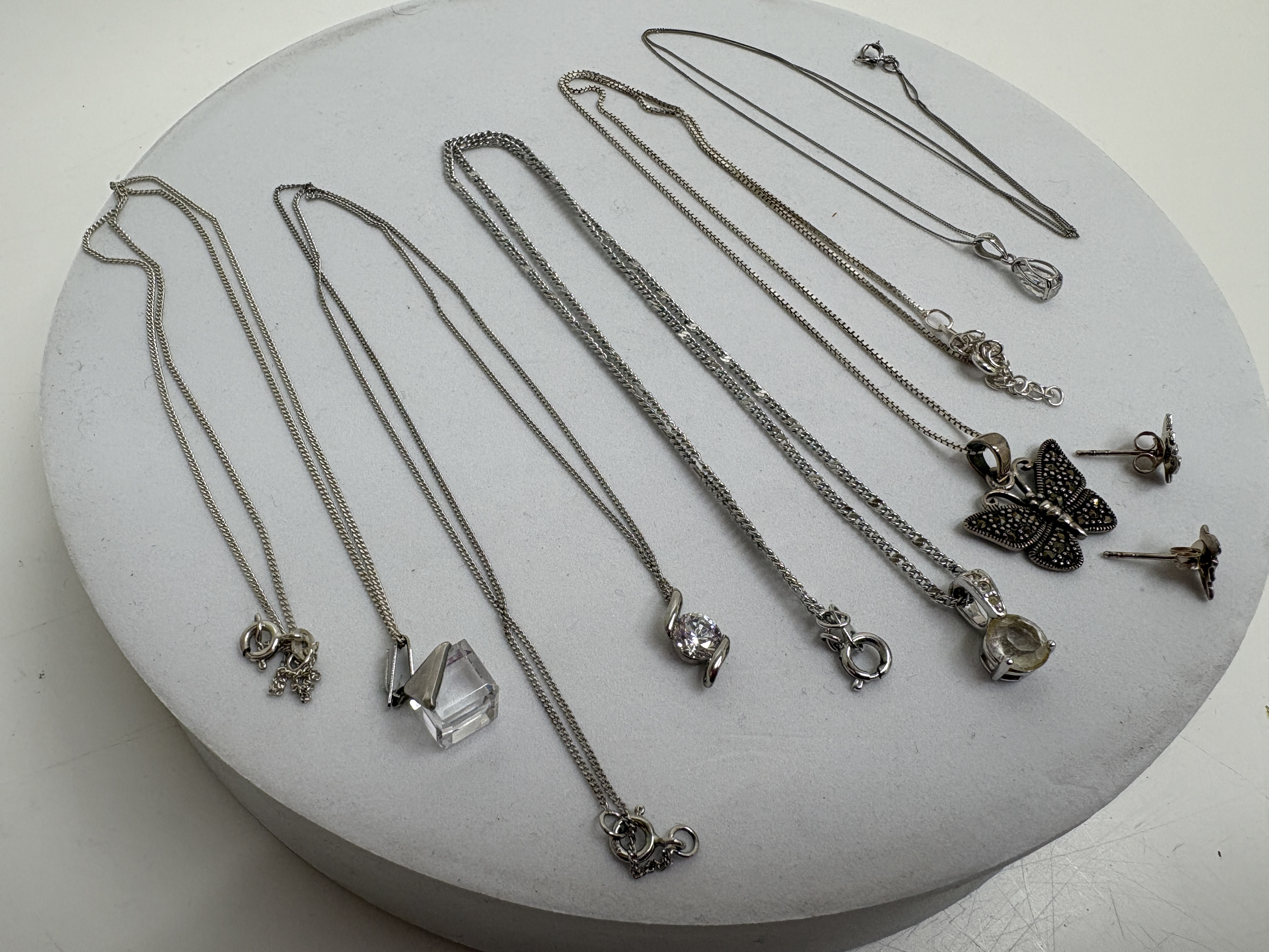 A collection of five contemporary pendant necklaces and a matching pair of stud earrings. The lot includes a sterling silver butterfly suite featuring a pendant and matching stud earrings, both set with numerous small marcasite stones, suspended from a sterling silver box chain with an adjustable extender. Also included is a sterling silver necklace featuring a pear-cut faceted clear stone in a prong setting on a fine curb chain. The collection further comprises three silver-tone necklaces: one with a large emerald-cut clear crystal in a geometric setting on a fine curb chain; one featuring a round brilliant-cut clear stone in a modern swirl tension-style setting on a fine curb chain; and a prominent round faceted clear stone in a four-prong basket setting on a double curb link chain. Hallmarks include 925 on the butterfly suite bail and chain tag, and 925 on the pear-cut pendant bail. Lengths approximately 40.5 cm to 50.8 cm.