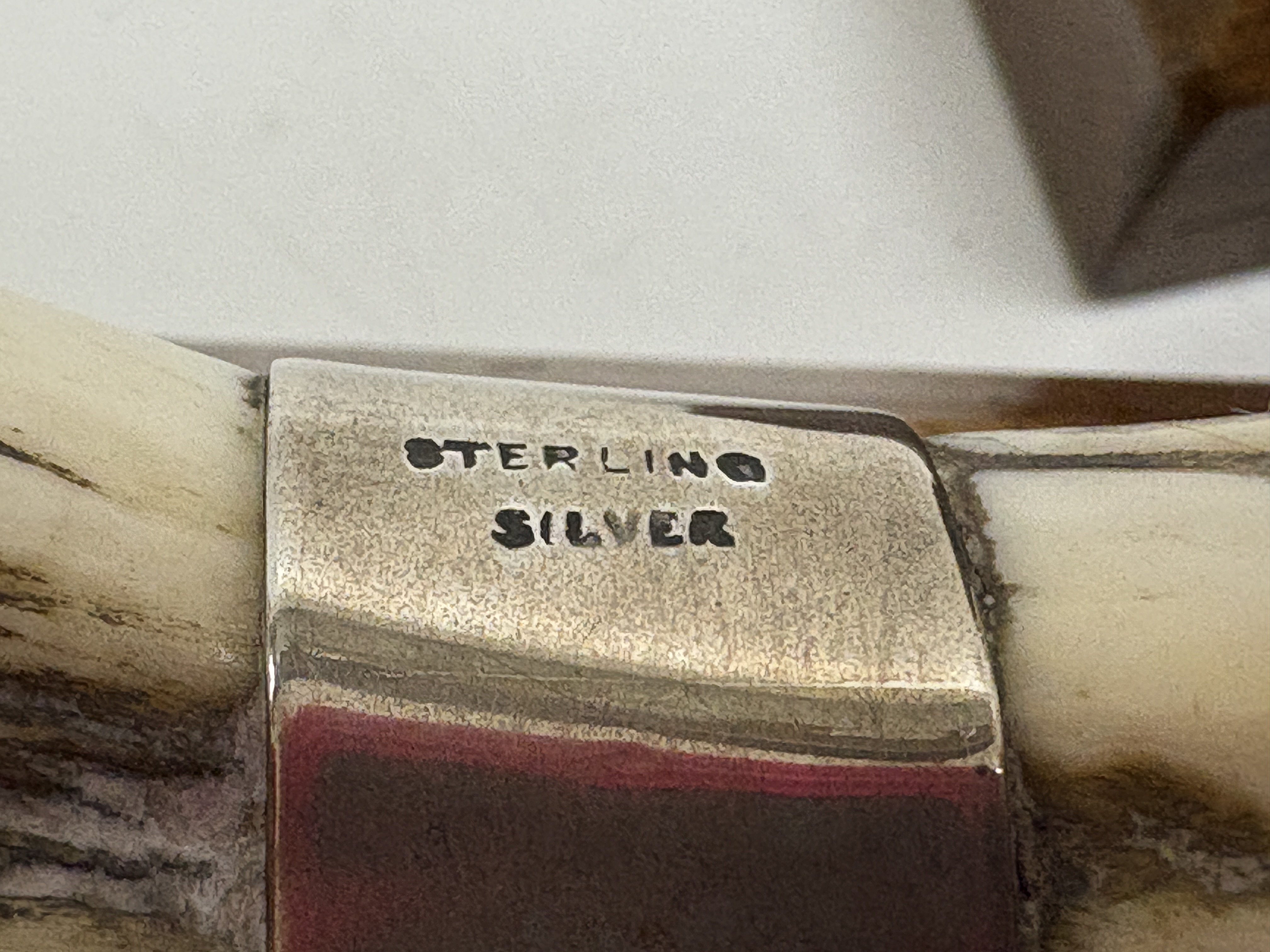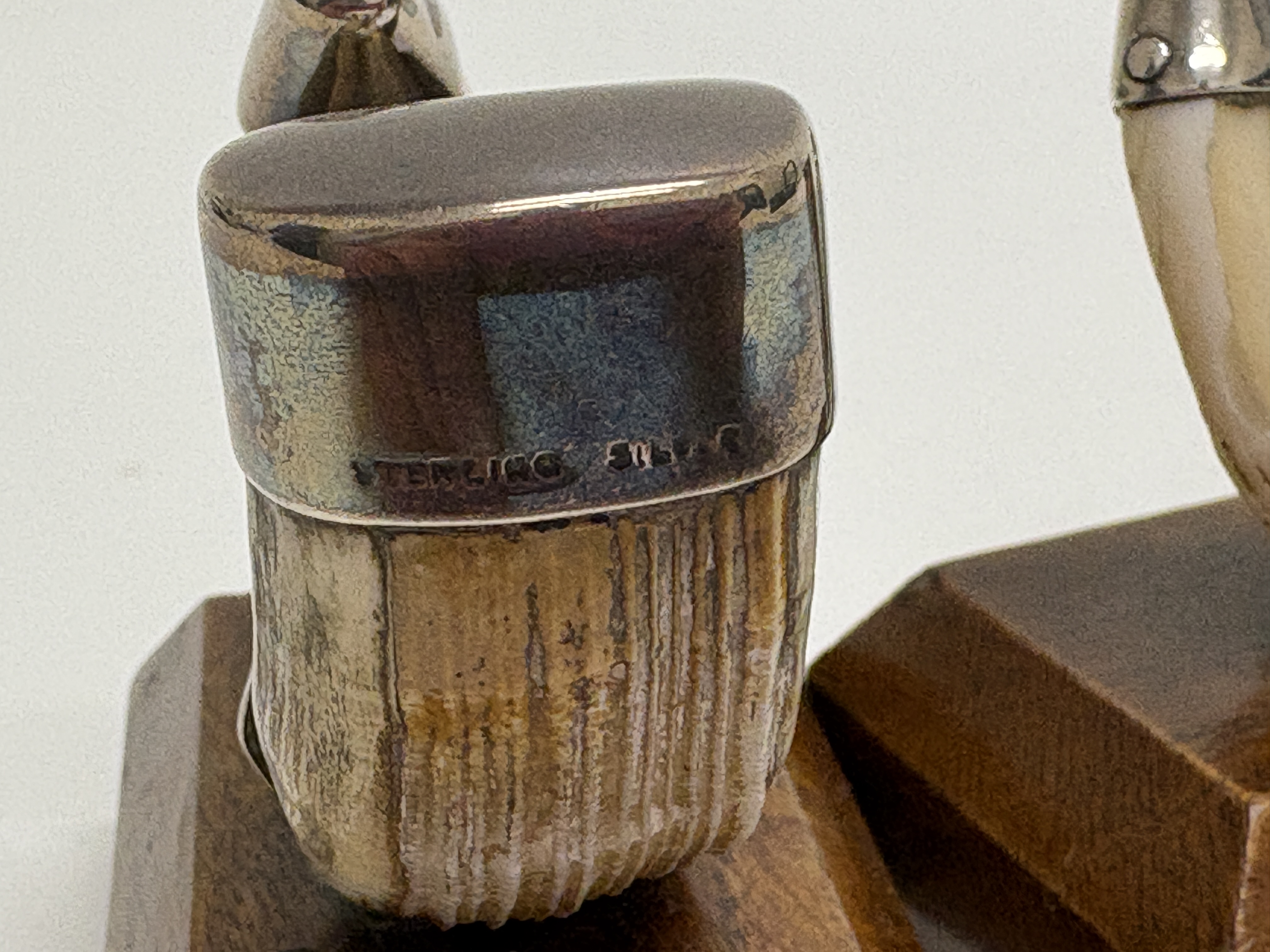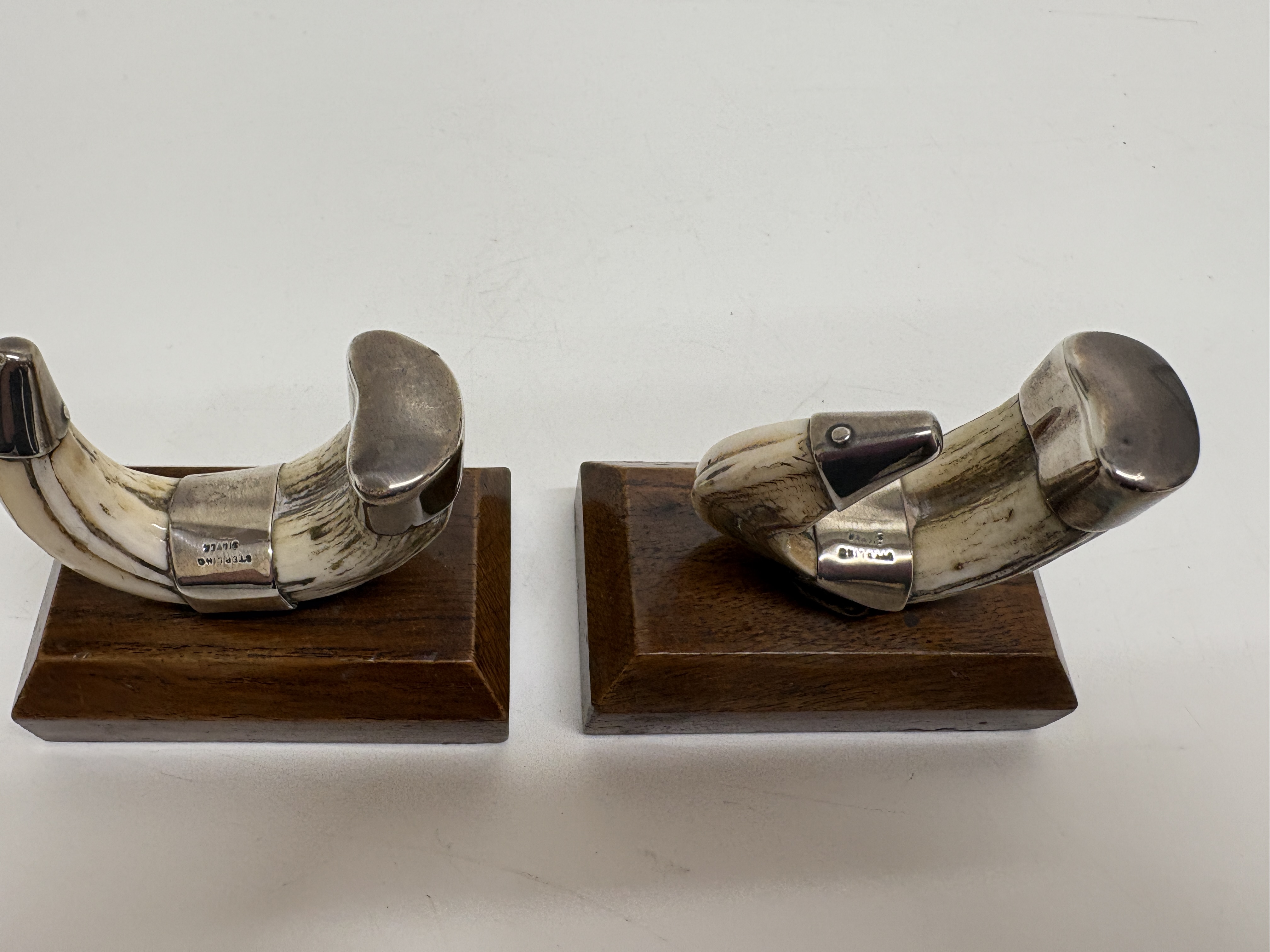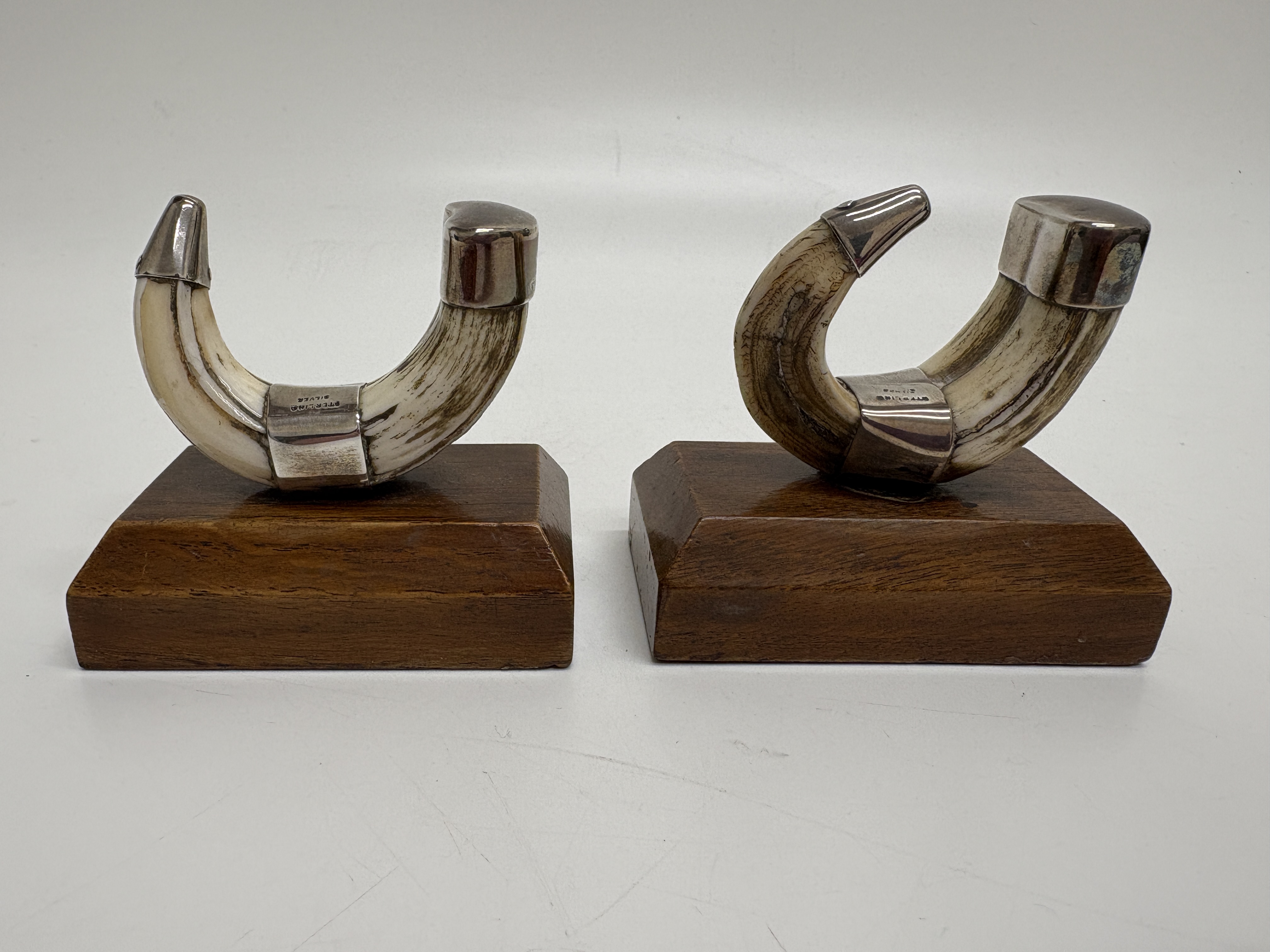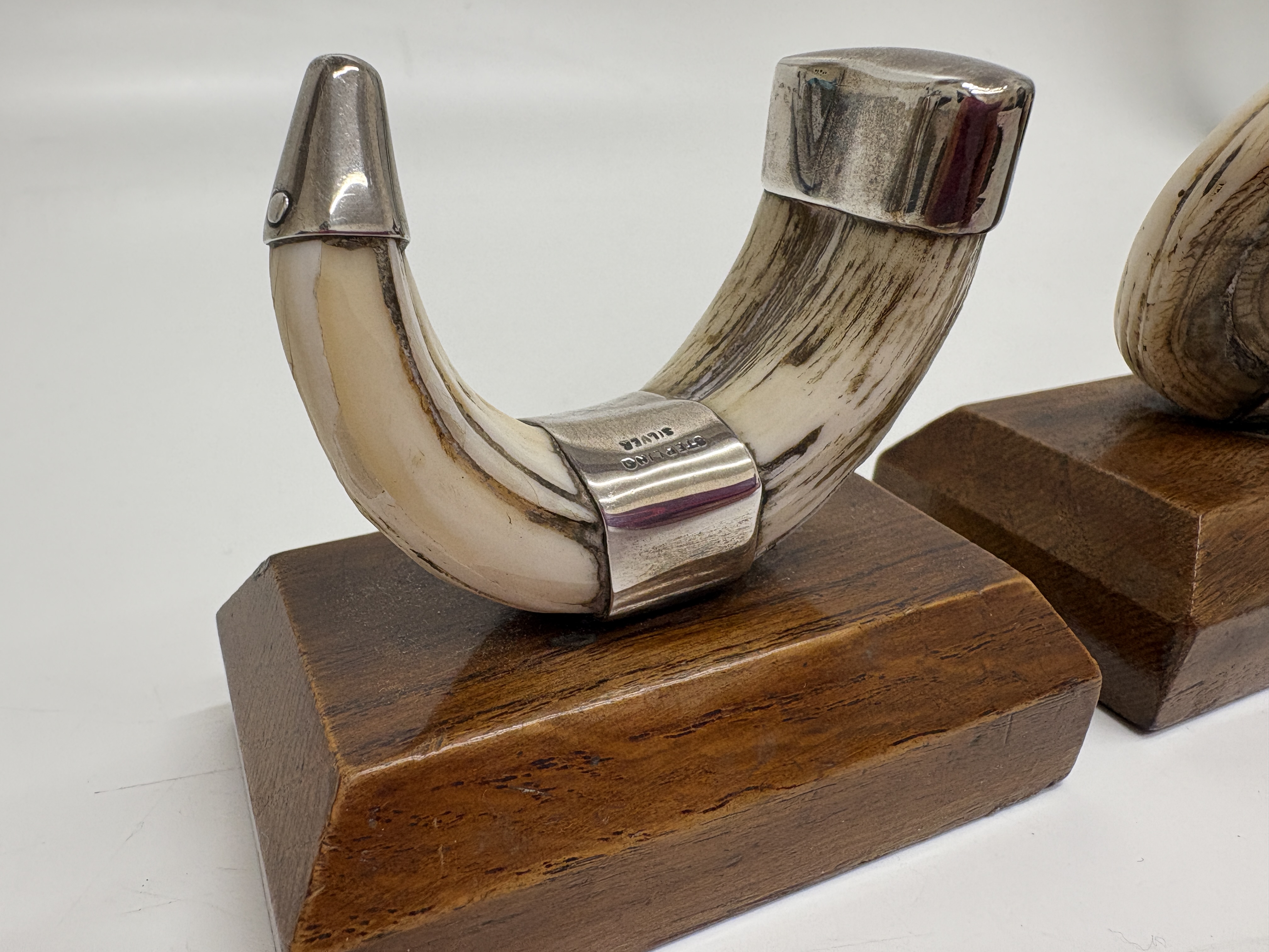 A pair of decorative desktop ornaments or bookends, designed in the Sporting or Naturalist style. Each ornament features a natural curved boar tusk secured by three solid sterling silver mounts, comprising a conical terminal, a central joining band, and a shaped cap at the root. The silver fittings are stamped STERLING SILVER in a block serif font, indicating a non-British origin, likely American. The tusks are mounted upon rectangular, bevelled hardwood bases with a polished finish. Weight not provided.