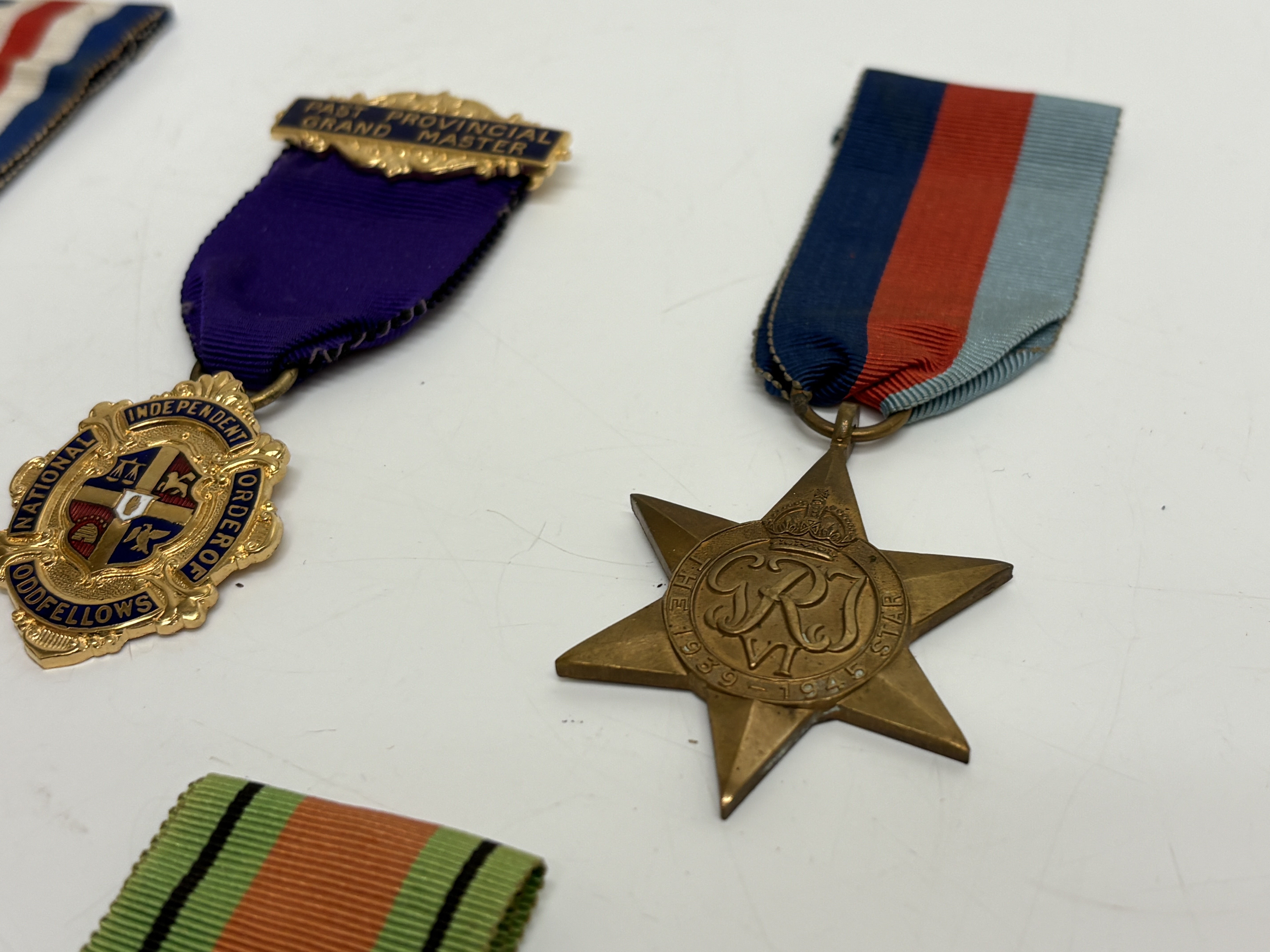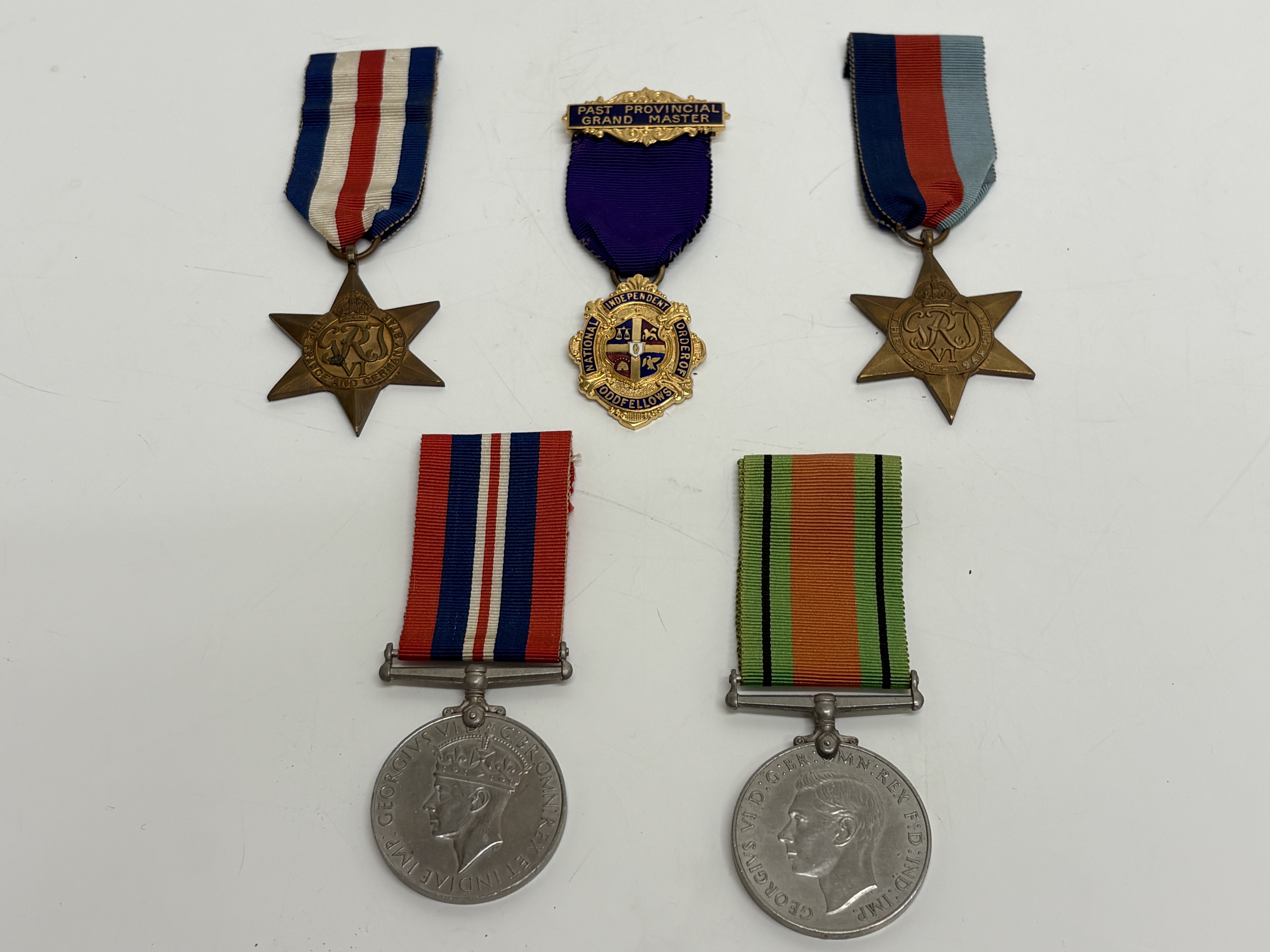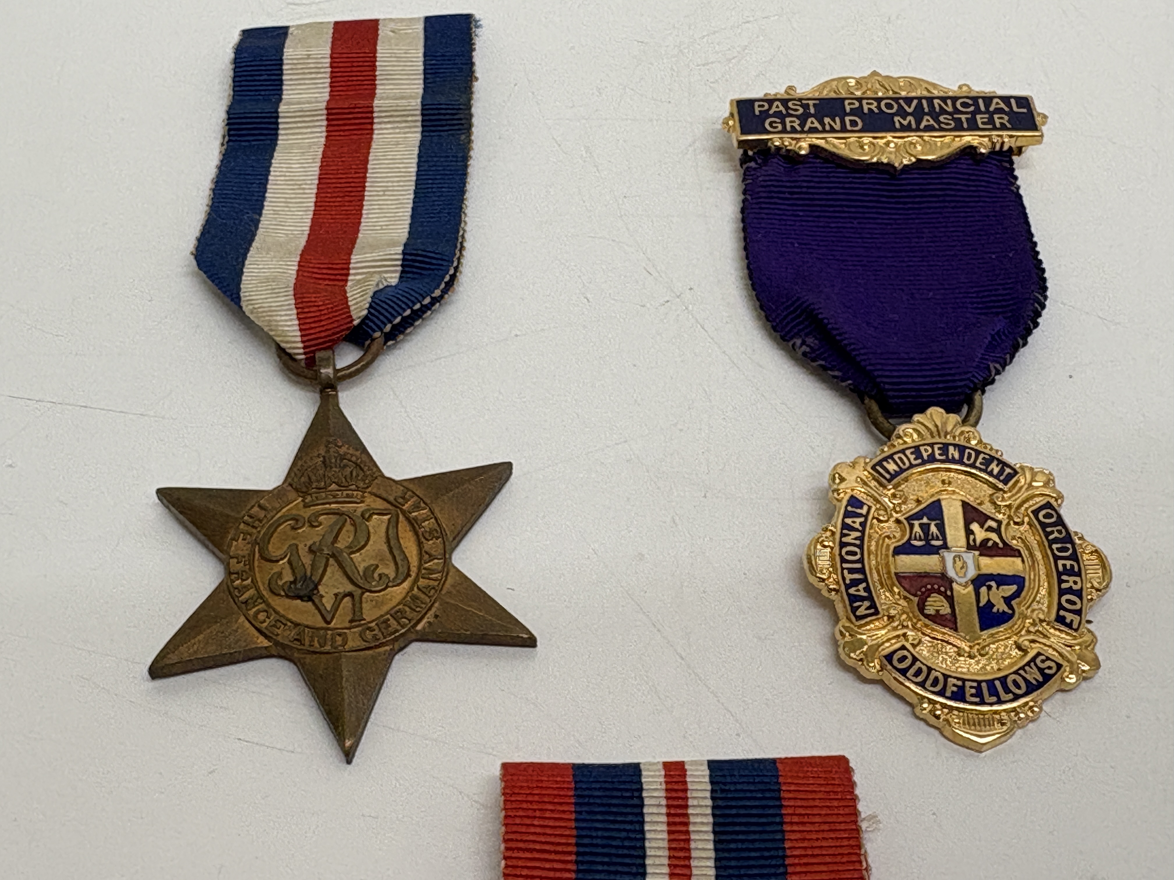 A collection featuring a four-medal British campaign group and a fraternal society jewel. The military group includes the France and Germany Star, the 1939-1945 Star, the 1939-1945 War Medal, and the 1939-1945 Defence Medal. This specific grouping is characteristic of a serviceman engaged in operational duties in the Northwest Europe theatre, including France, the Low Countries, and Germany, during the final stages of the conflict between 1944 and 1945. Accompanying the medals is a Past Provincial Grand Master jewel from the National Independent Order of Oddfellows (NIOOF). This gilt-metal and enamel piece features a central shield with symbolic icons including scales, a lion, a beehive, and an eagle, surrounded by a blue enamel border and suspended from a purple silk ribbon with a titled top bar.