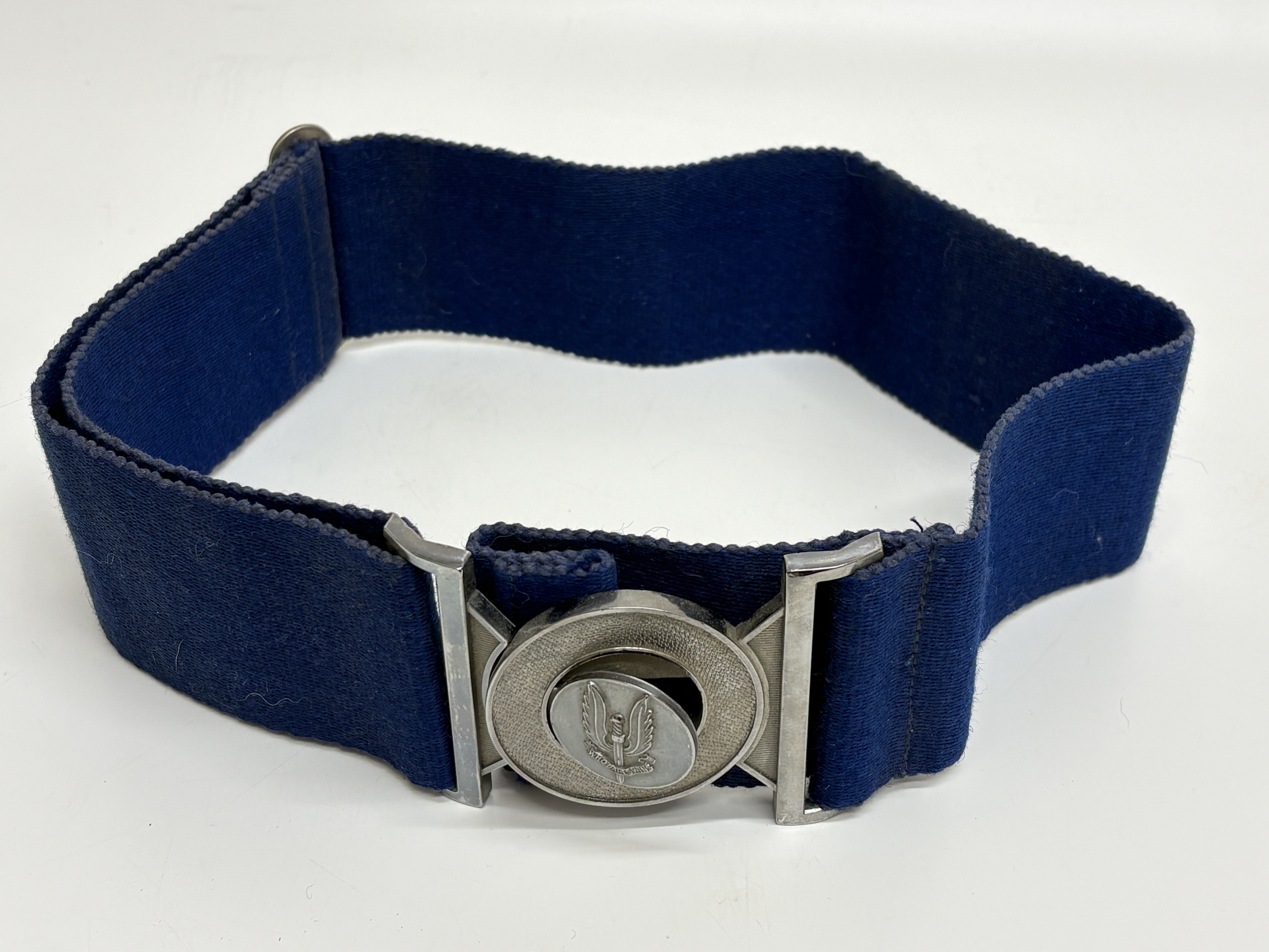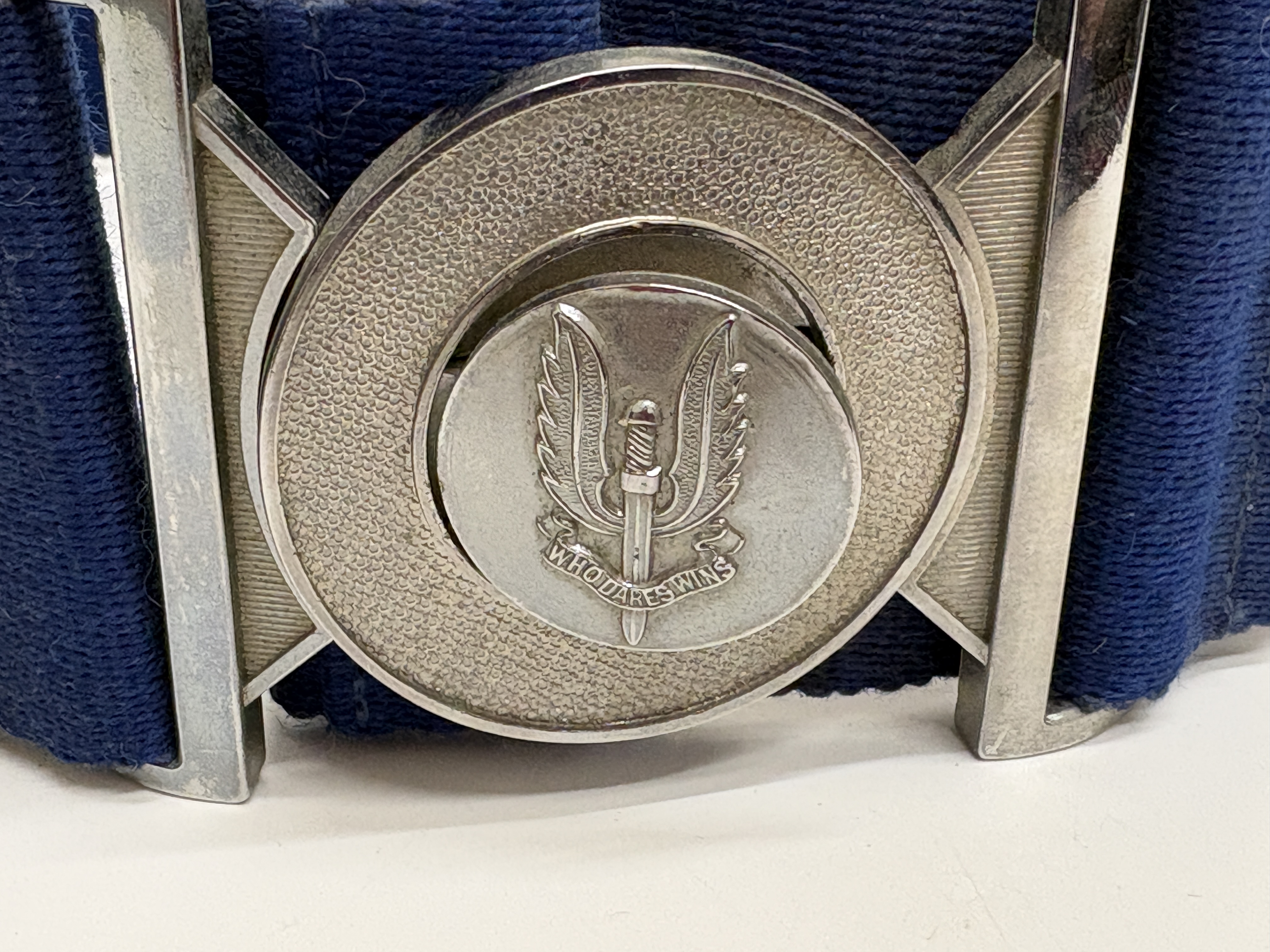 Special Air Service (SAS), stable belt, featuring a downward-pointing Fairbairn-Sykes style dagger flanked by wings, with a scroll below bearing the regimental motto WHO DARES WINS.