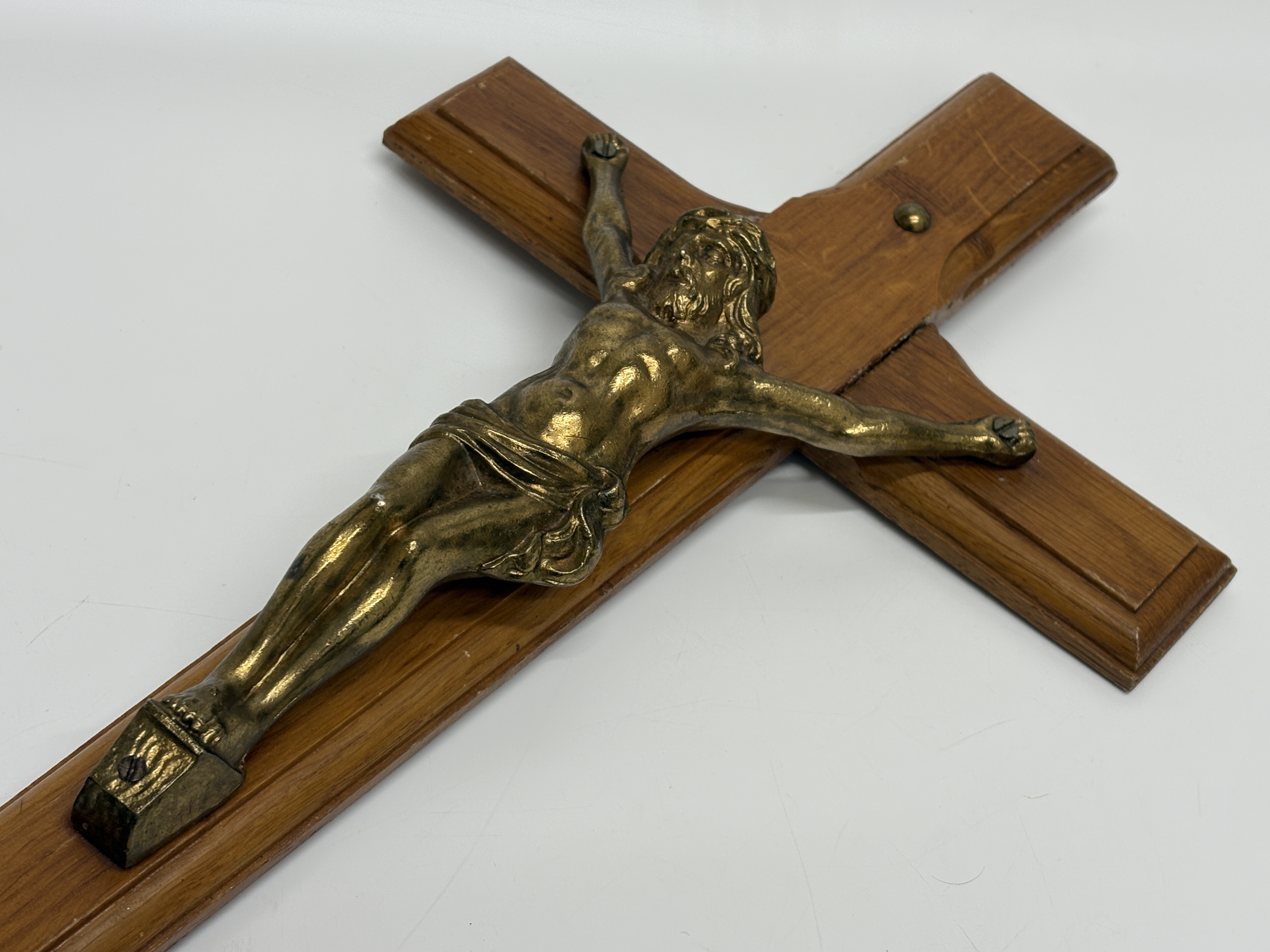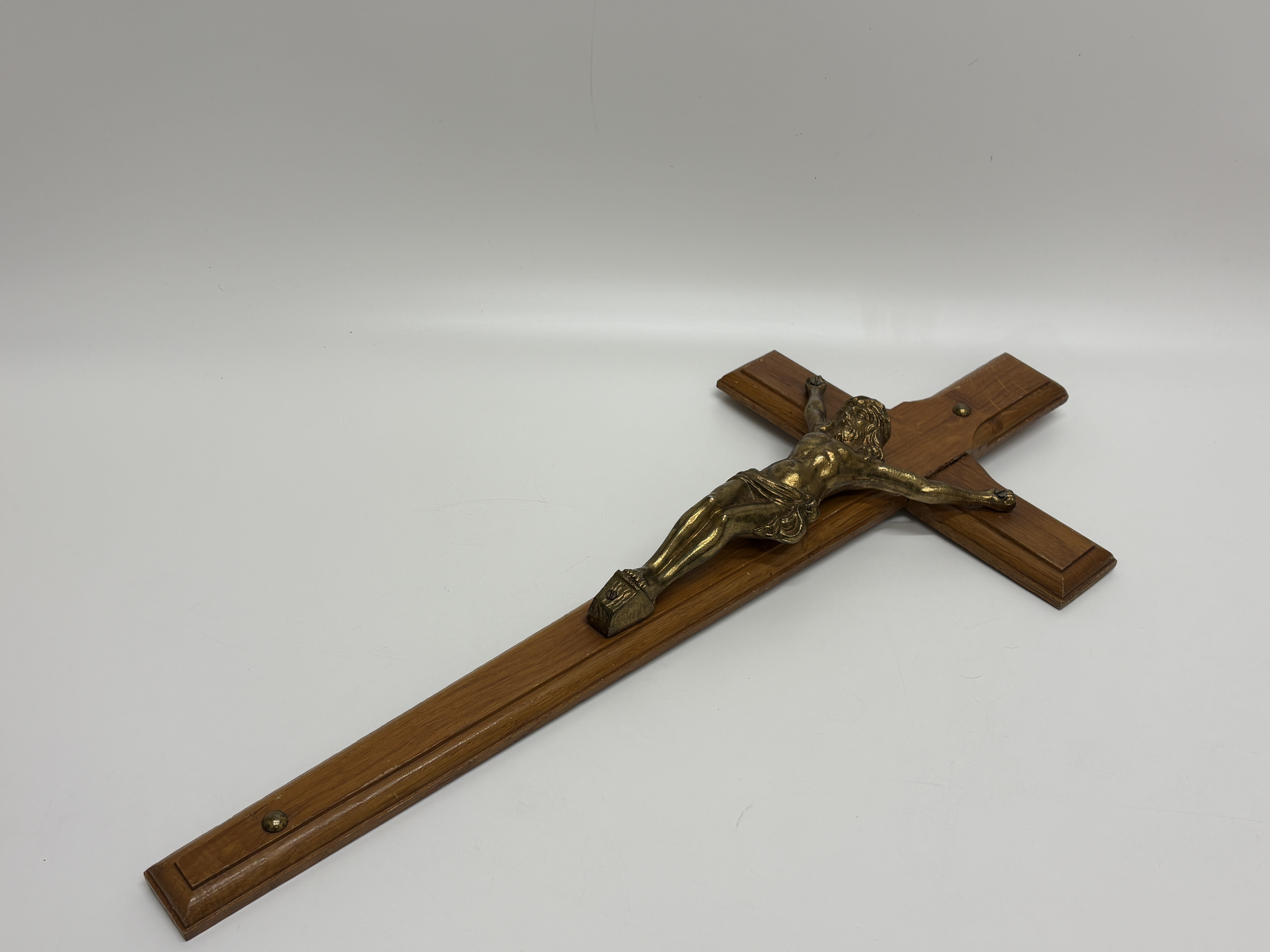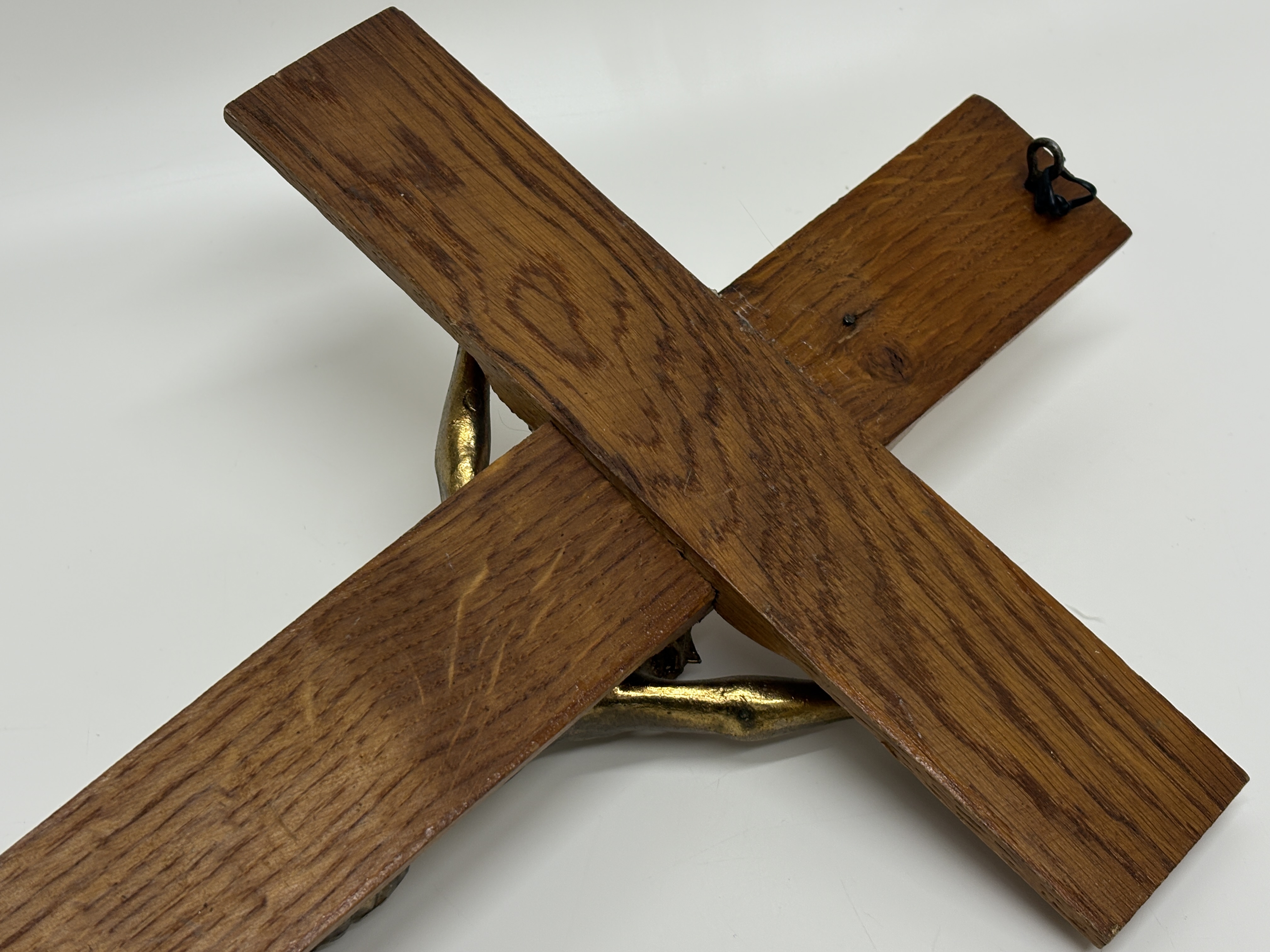 This wall-mounted devotional object is identified as a Catholic sick call or last rites crucifix, typical of the mid-20th century. The item features a cast metal corpus with a gold-toned finish, secured to a wooden cross. The cross is constructed from two pieces of wood, likely oak, displaying a prominent grain and a bevelled decorative edge on the front face. The figure of Christ is attached via screws through the hands and feet. The reverse side reveals the unfinished wood texture and includes a simple wire hanging loop.