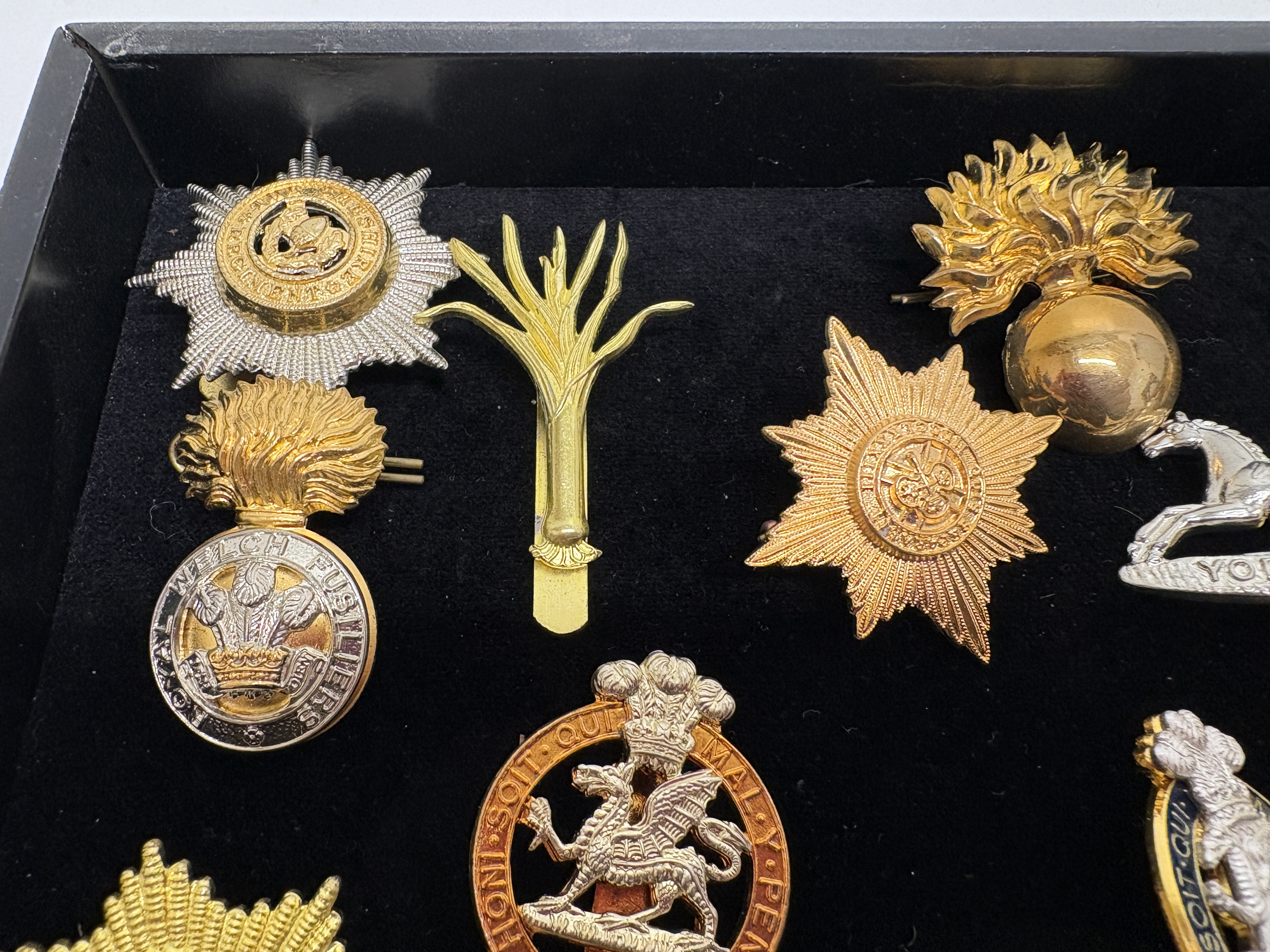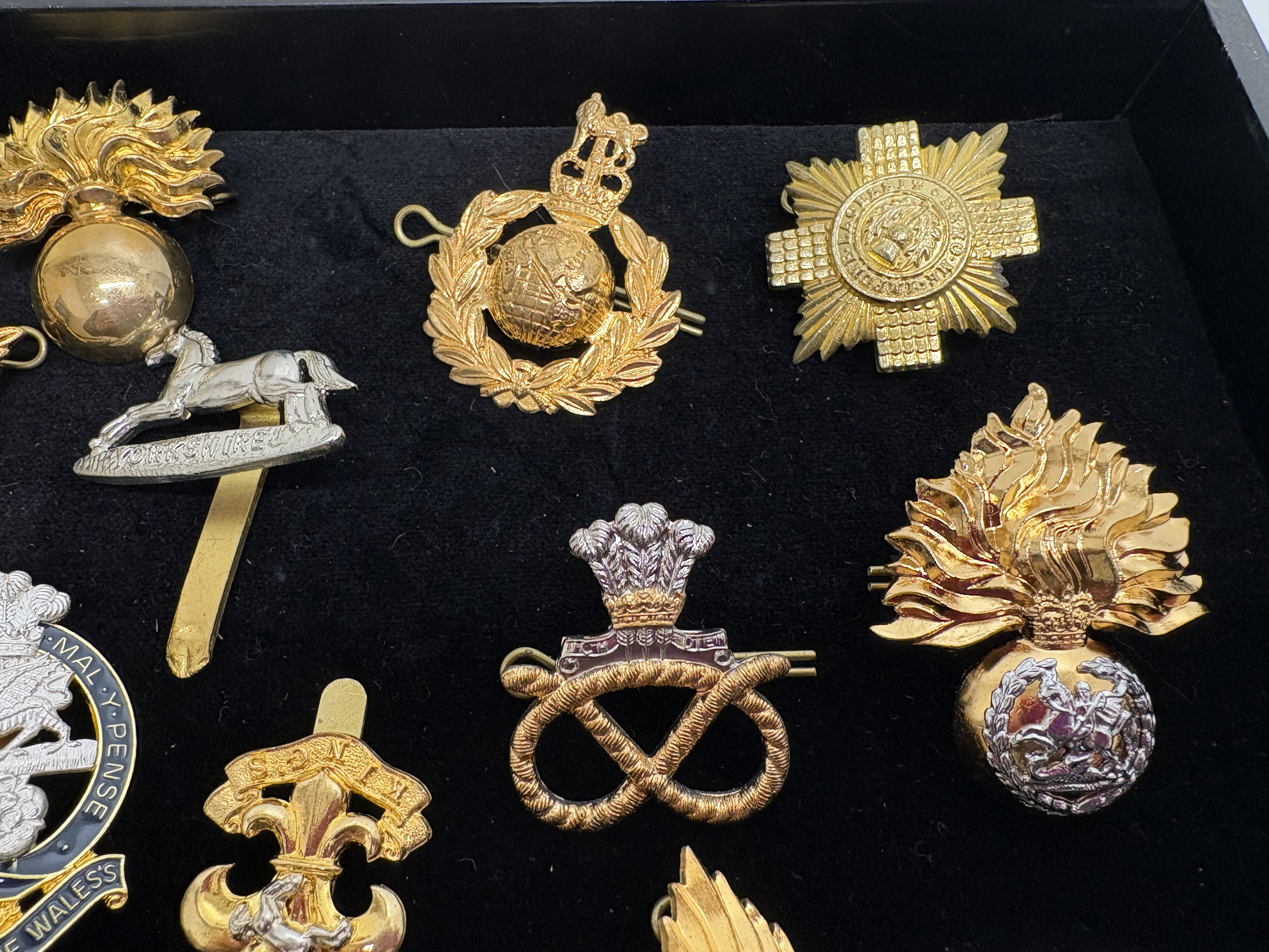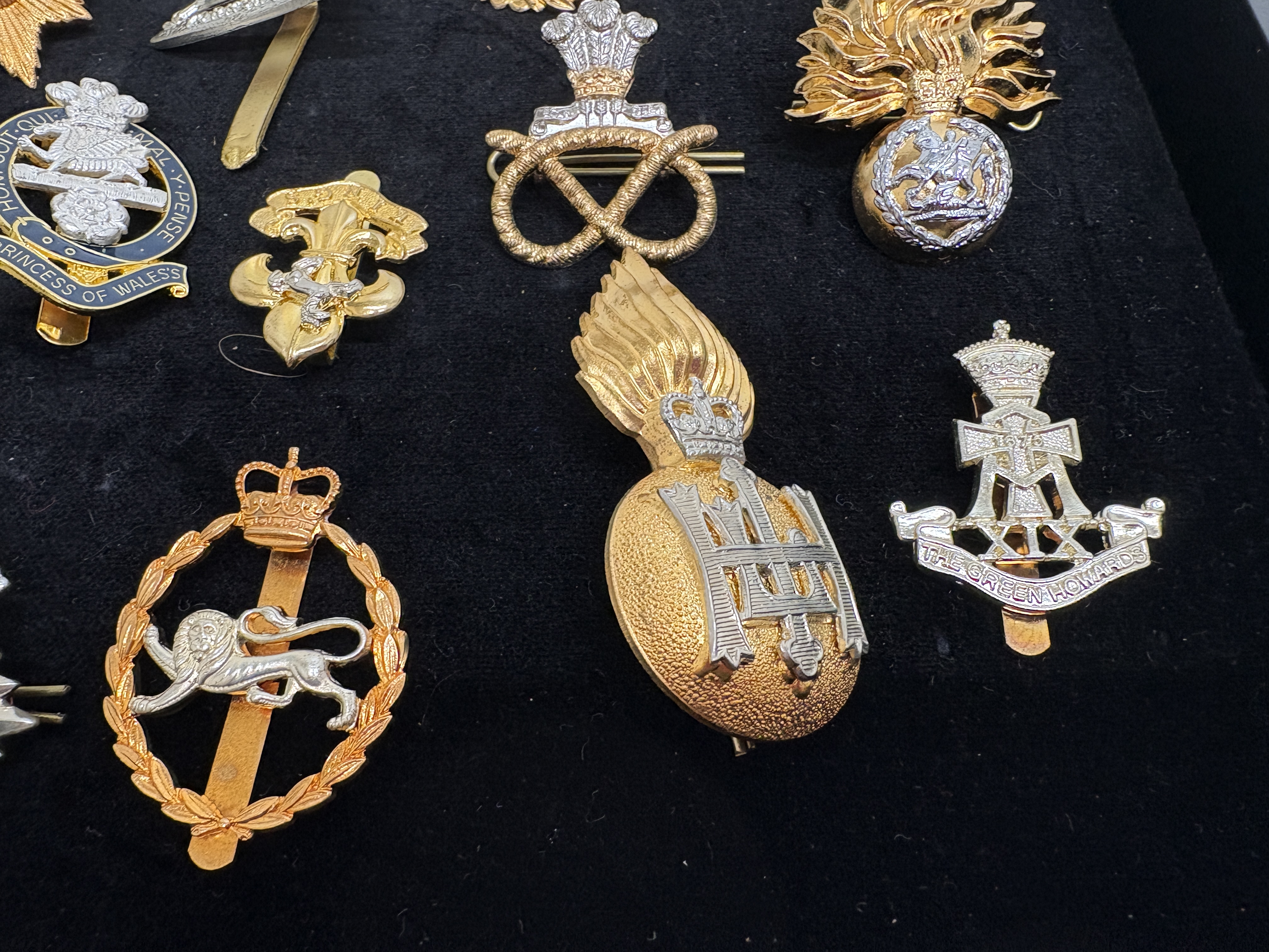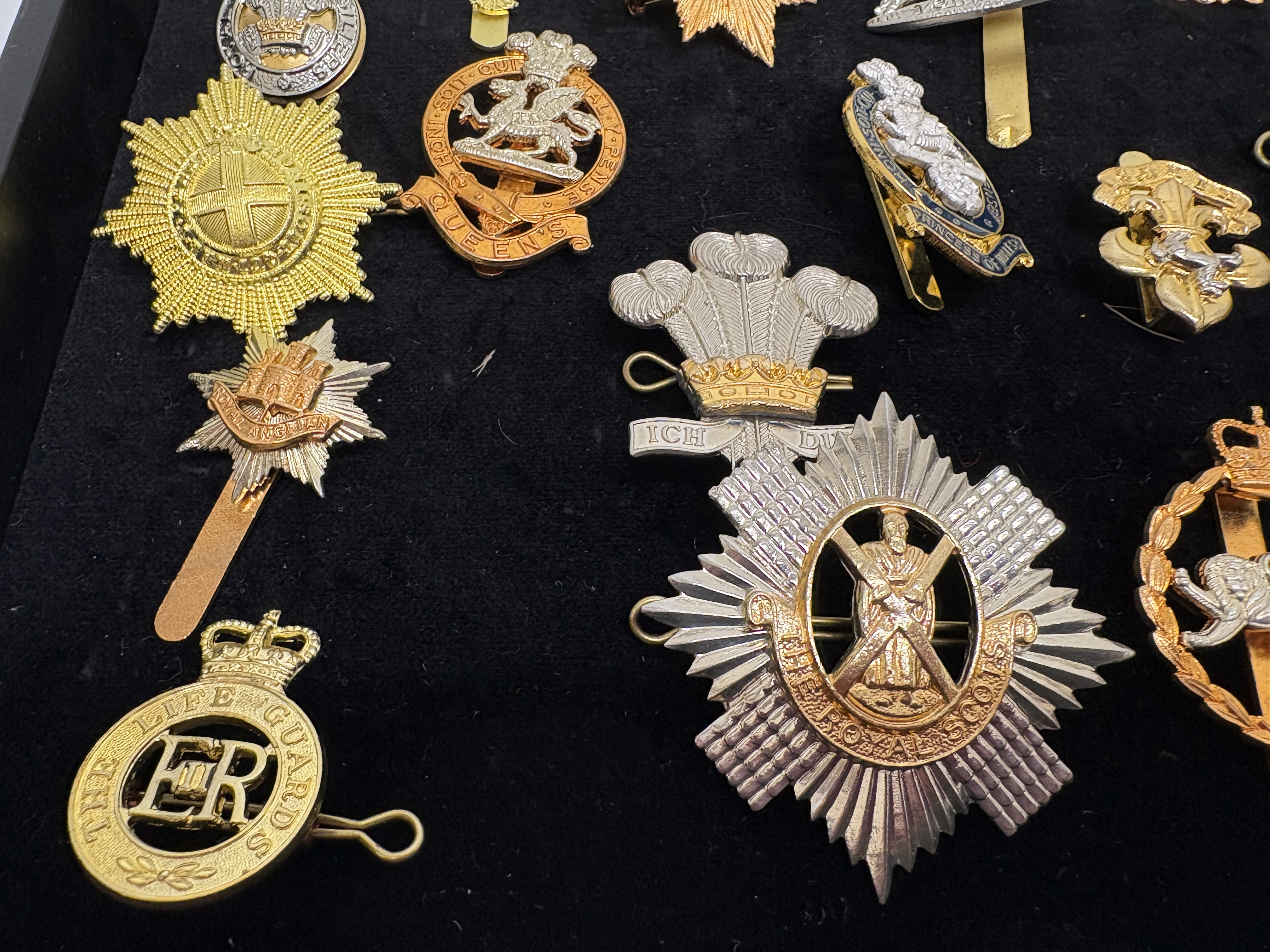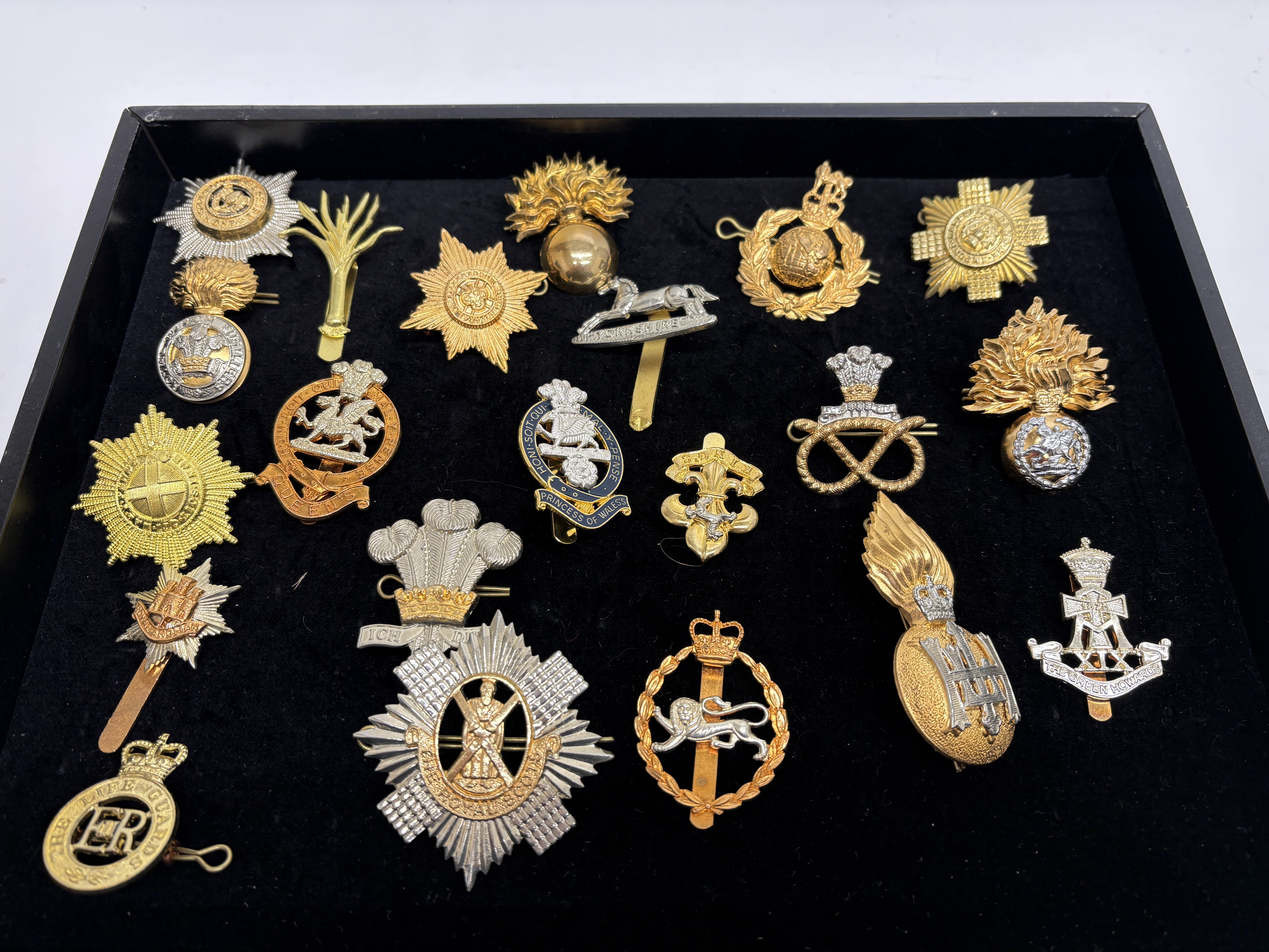 A comprehensive collection of approximately twenty British Army and Royal Marines cap badges and insignia, primarily dating from the mid-to-late 20th century. This assembly features a significant selection of anodised aluminium Staybright examples alongside earlier bi-metal and white metal variants, illustrating the heraldic evolution of the British infantry. Notable highlights include a Royal Marines Globe and Laurel badge surmounted by the Tudor Crown (King’s Crown), indicating a pre-1953 issue. The Household Division is represented by a Life Guards badge with the Elizabeth II (EIIR) cypher and a Welsh Guards leek. The collection extensively covers the restructuring of the infantry, featuring the Royal Scots Glengarry star, the Queen’s Regiment with Paschal Lamb, and an enamelled Princess of Wales’s Royal Regiment badge. Other identified units include the Royal Anglian Regiment (including the Gibraltar castle grenade), Royal Regiment of Fusiliers, Royal Welch Fusiliers, The Green Howards (XIX), The Staffordshire Regiment, The Prince of Wales’s Own Regiment of Yorkshire, York and Lancaster Regiment, Devonshire and Dorset Regiment, and The Loyal Regiment (North Lancashire). This lot serves as an excellent representative group for collectors of modern British military history and regimental amalgamations.