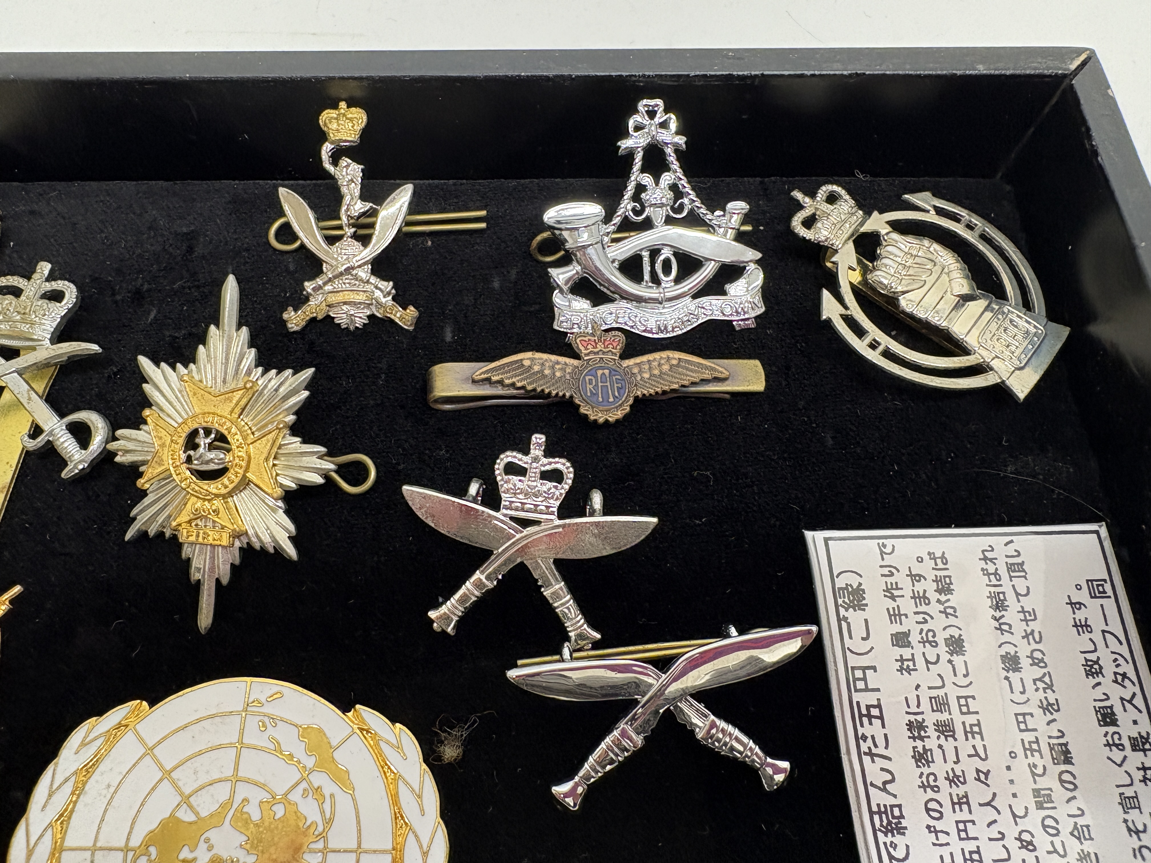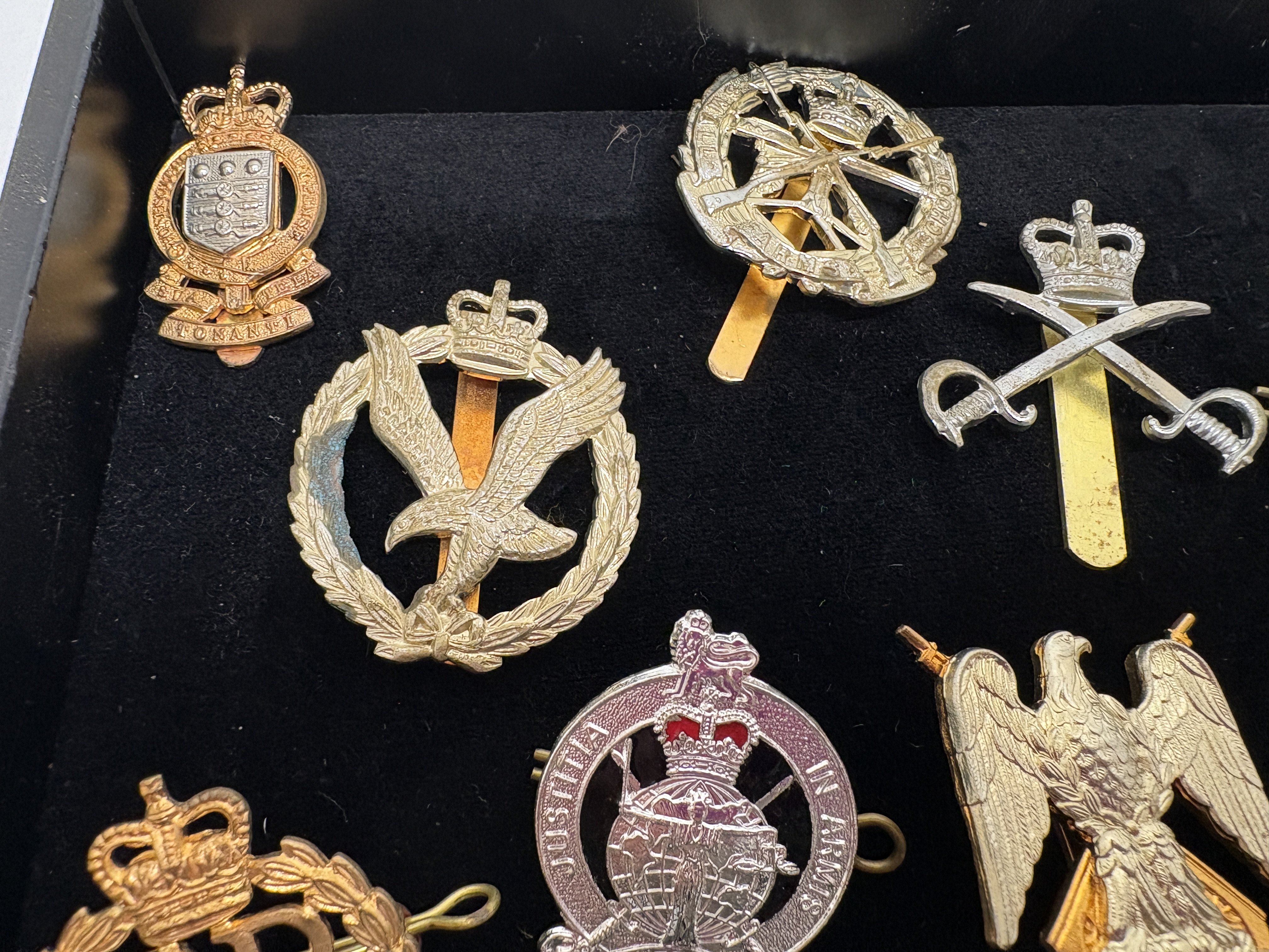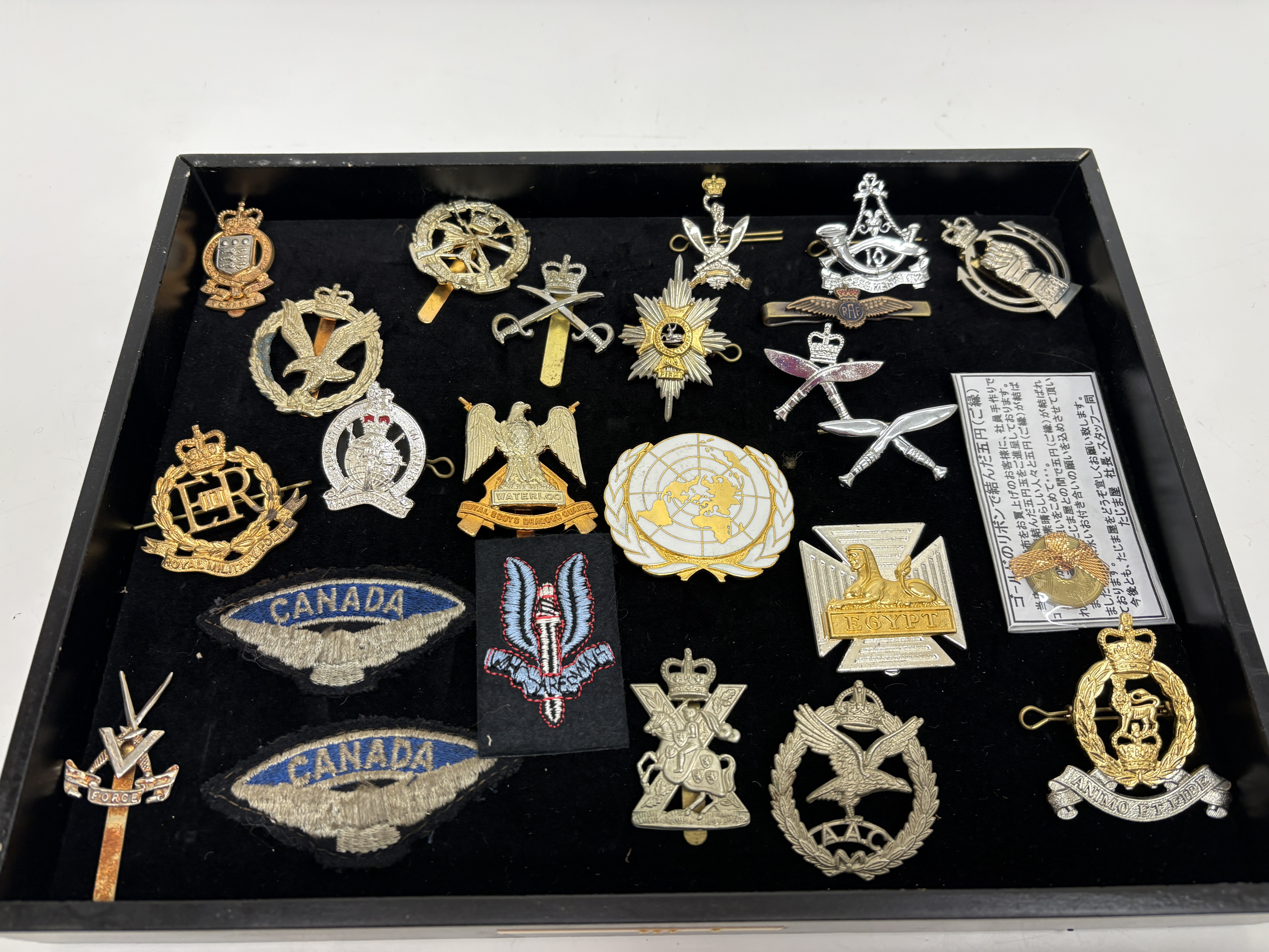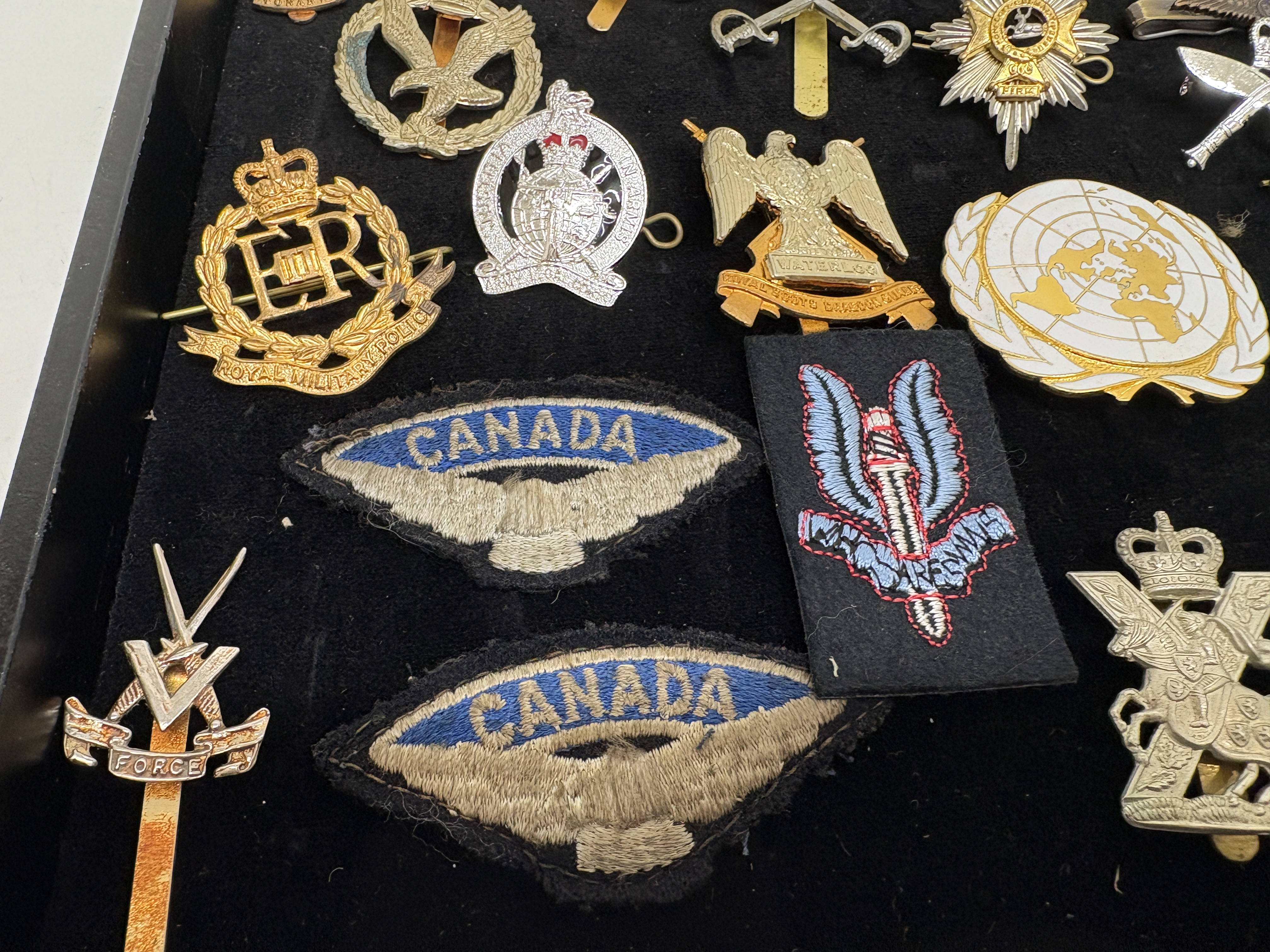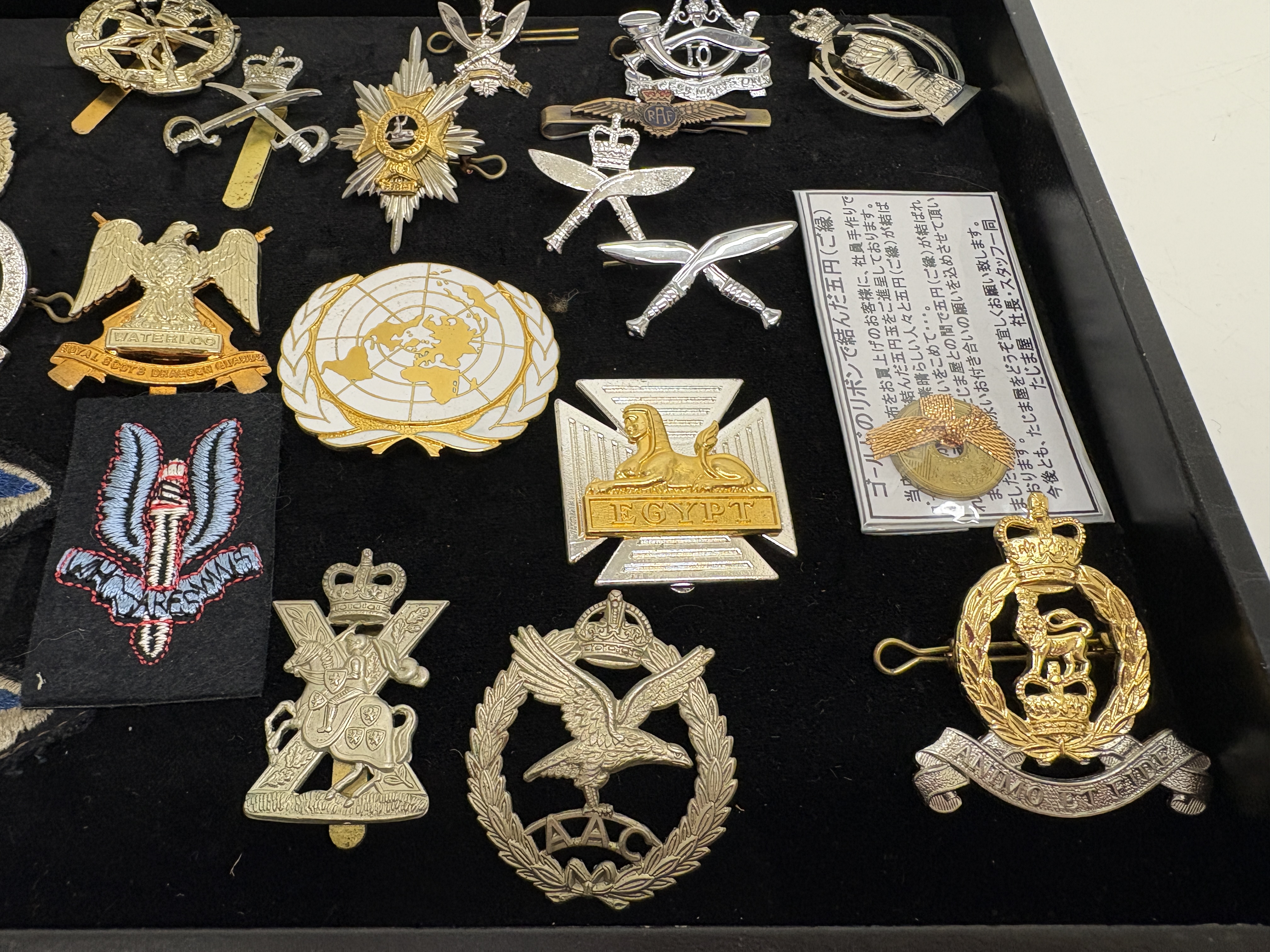 A comprehensive collection of British and Commonwealth military insignia, primarily dating from the mid-20th century to the modern era. This significant lot features elite unit items including an embroidered Special Air Service (SAS) “Who Dares Wins” winged dagger patch on a black ground and three Army Air Corps (AAC) cap badges in white metal and bimetal finishes. Commonwealth representation includes a pair of Royal Canadian Air Force (RCAF) “CANADA” eagle shoulder titles. The Gurkha Brigade is represented by a bimetal cap badge for the 10th Princess Mary’s Own Gurkha Rifles and two pairs of crossed kukri badges, one surmounted by a Queen’s Crown. Cavalry and armoured units include the Royal Scots Dragoon Guards (Eagle of Waterloo), the Royal Armoured Corps (armoured gauntlet), and the Royal Scots Greys (mounted figure on St Andrew’s Cross). Infantry and service corps items comprise the Gloucestershire Regiment “Back Badge” (Sphinx/Egypt), the Worcestershire Regiment star badge (“FIRM”), two variations of the Royal Military Police (RMP) including the ERII cypher and the “Justitia in Armis” globe badge, the Royal Army Veterinary Corps (RAVC) (“Animo et Fide”), the Royal Corps of Transport (RCT) wagon wheel, and the Royal Army Pay Corps (RAPC) shield badge. Miscellaneous items include a large enamel United Nations (