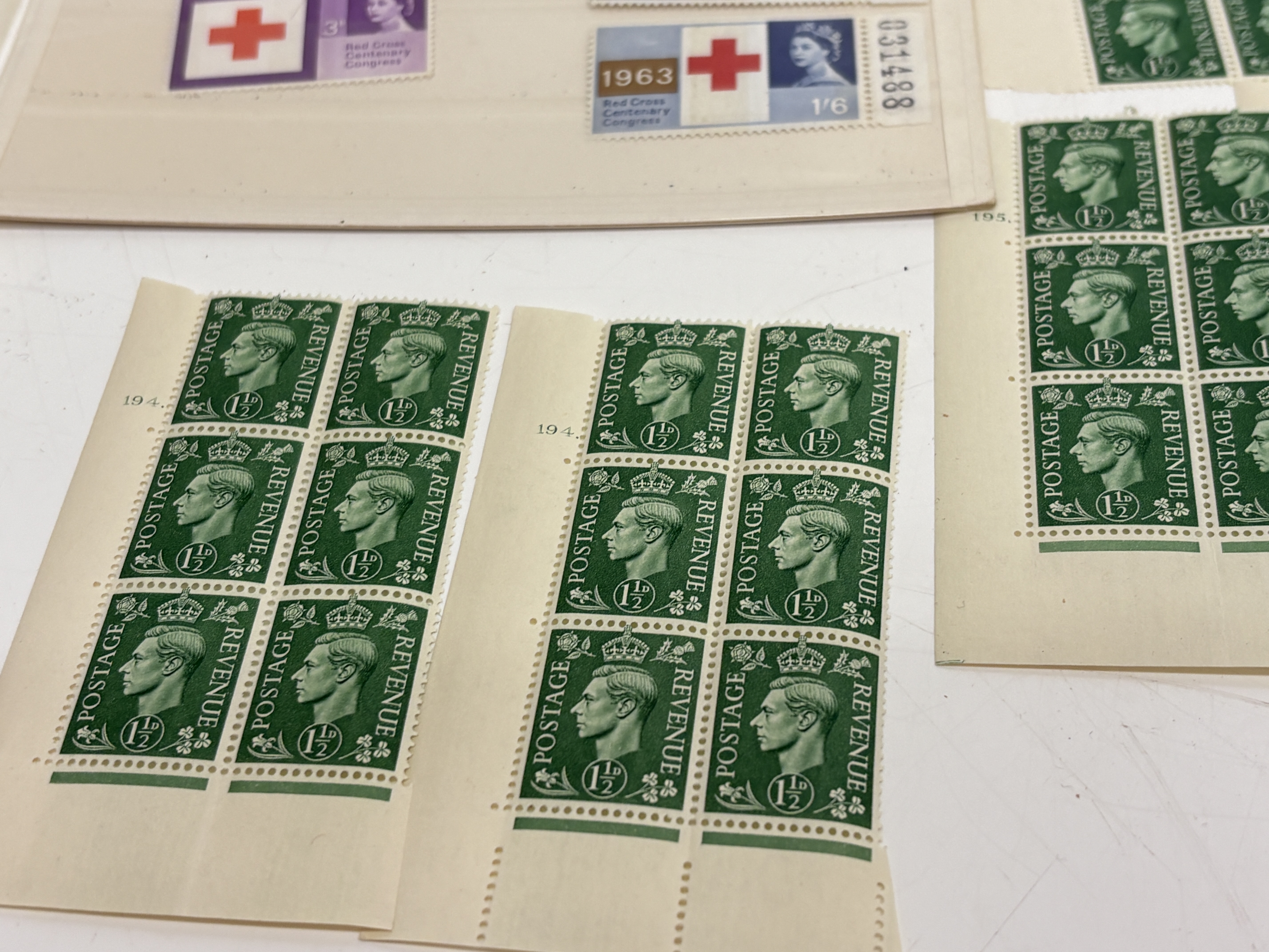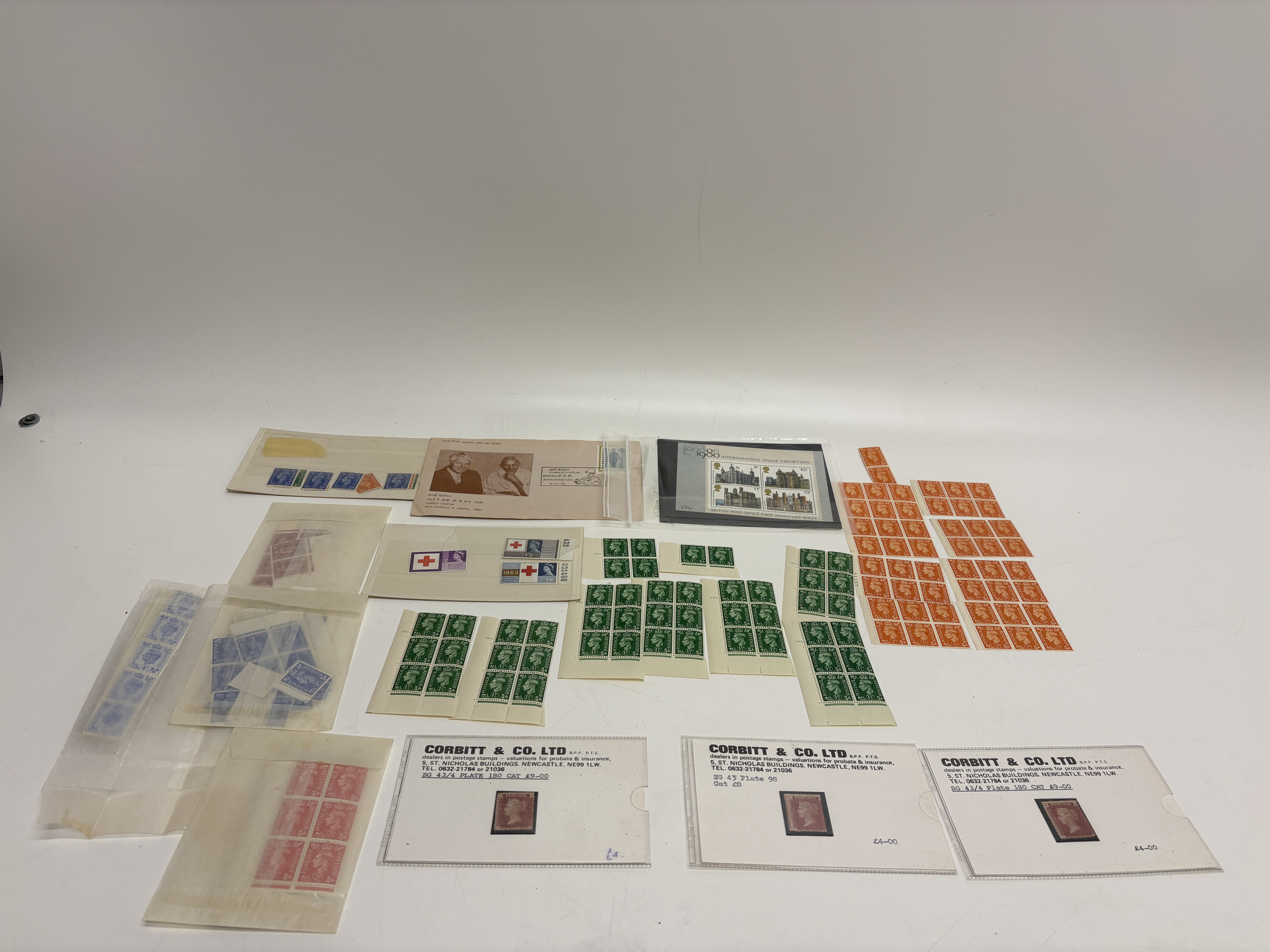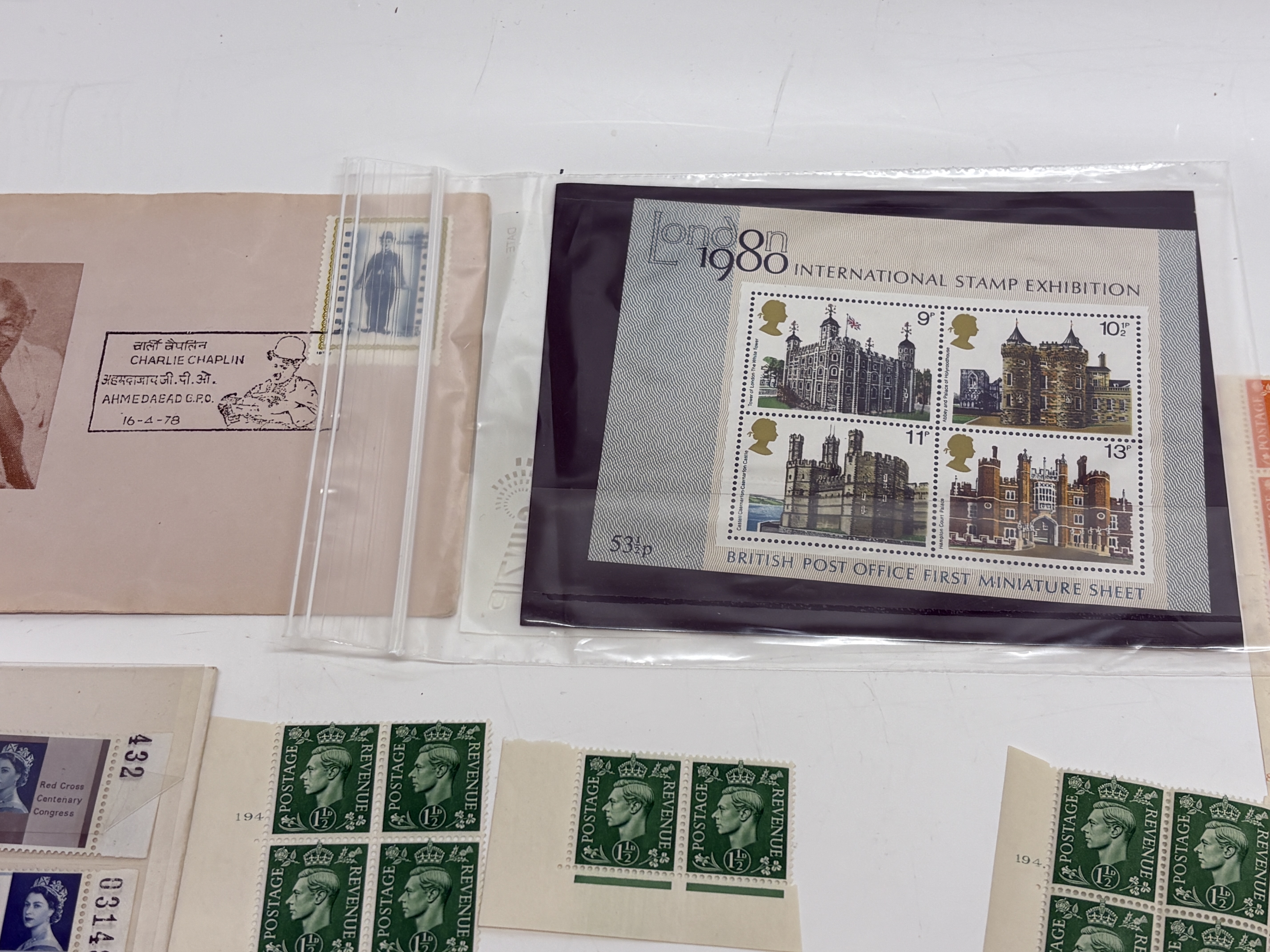 A diverse philatelic assembly featuring Queen Victoria 1d Red issues, SG 43, from Plate 98 (corner letters L-J) and Plate 180 (corner letters J-J and K-S). The collection includes multiple mint blocks and strips of King George VI definitive issues, denominations 1/2d orange, 1 1/2d green, 2 1/2d pale scarlet, and 4d light blue, all inscribed Postage Revenue. Featured is the London 1980 International Stamp Exhibition miniature sheet containing four perforated values (9p, 10p, 11p, and 13p). Postal history includes a 1963 Red Cross Centenary Congress philatelic cover with 3d, 1/3, and 1/6 commemoratives, and a 1978 commemorative cover from Ahmedabad G.P.O. featuring Charlie Chaplin and Mahatma Gandhi with a circular date stamp. Additional stamps and multiples are contained within several semi-transparent glassine envelopes.