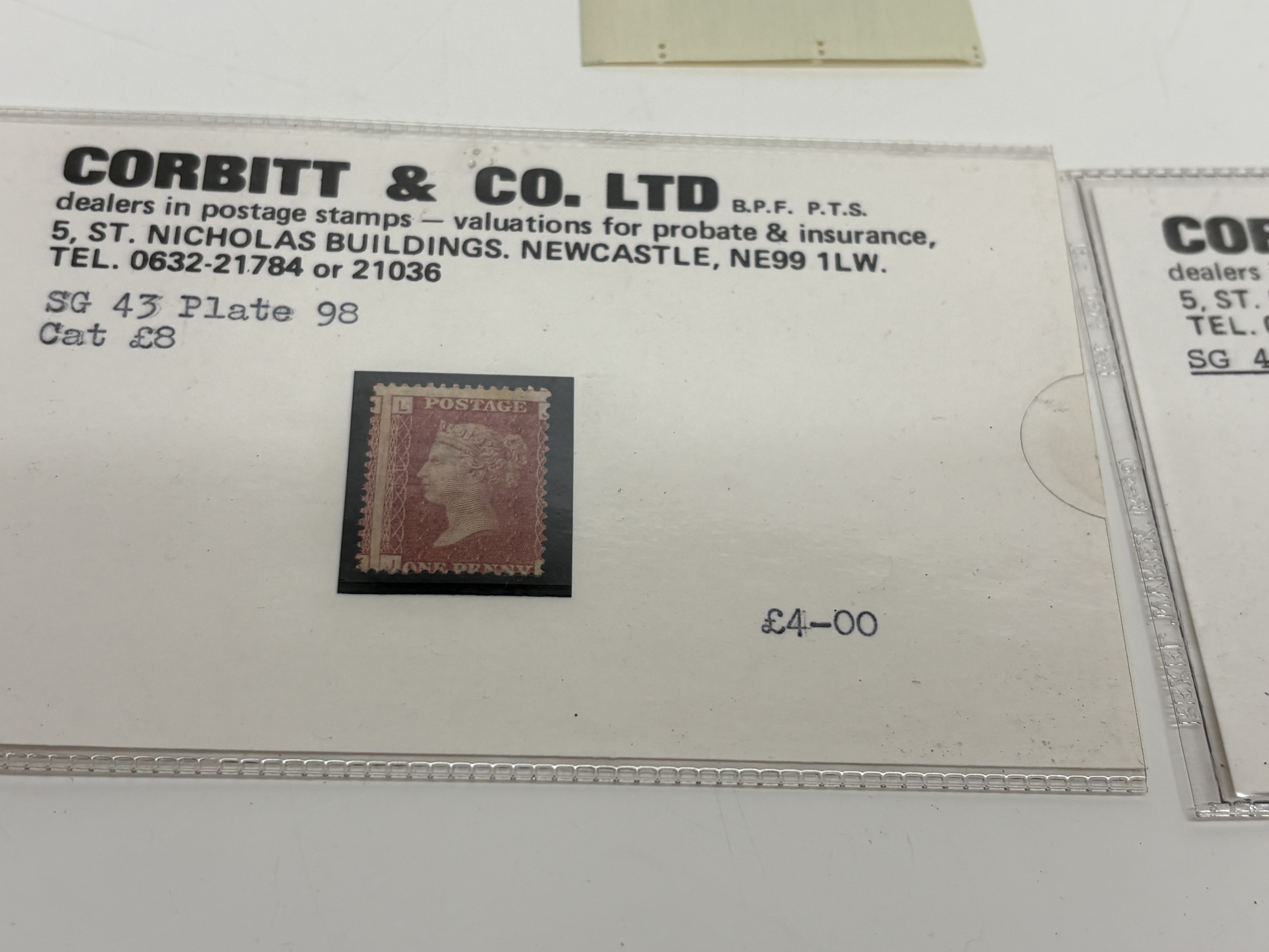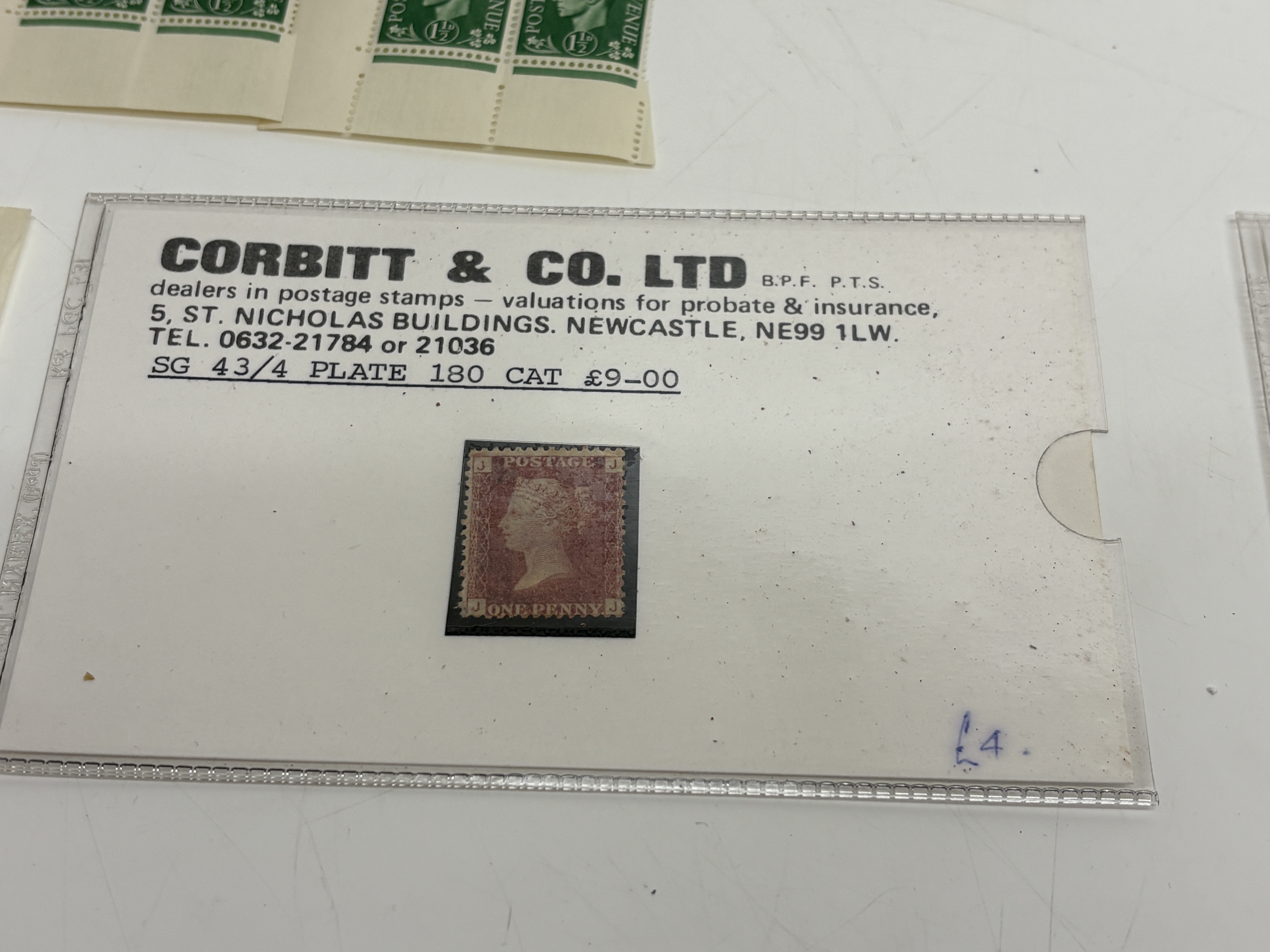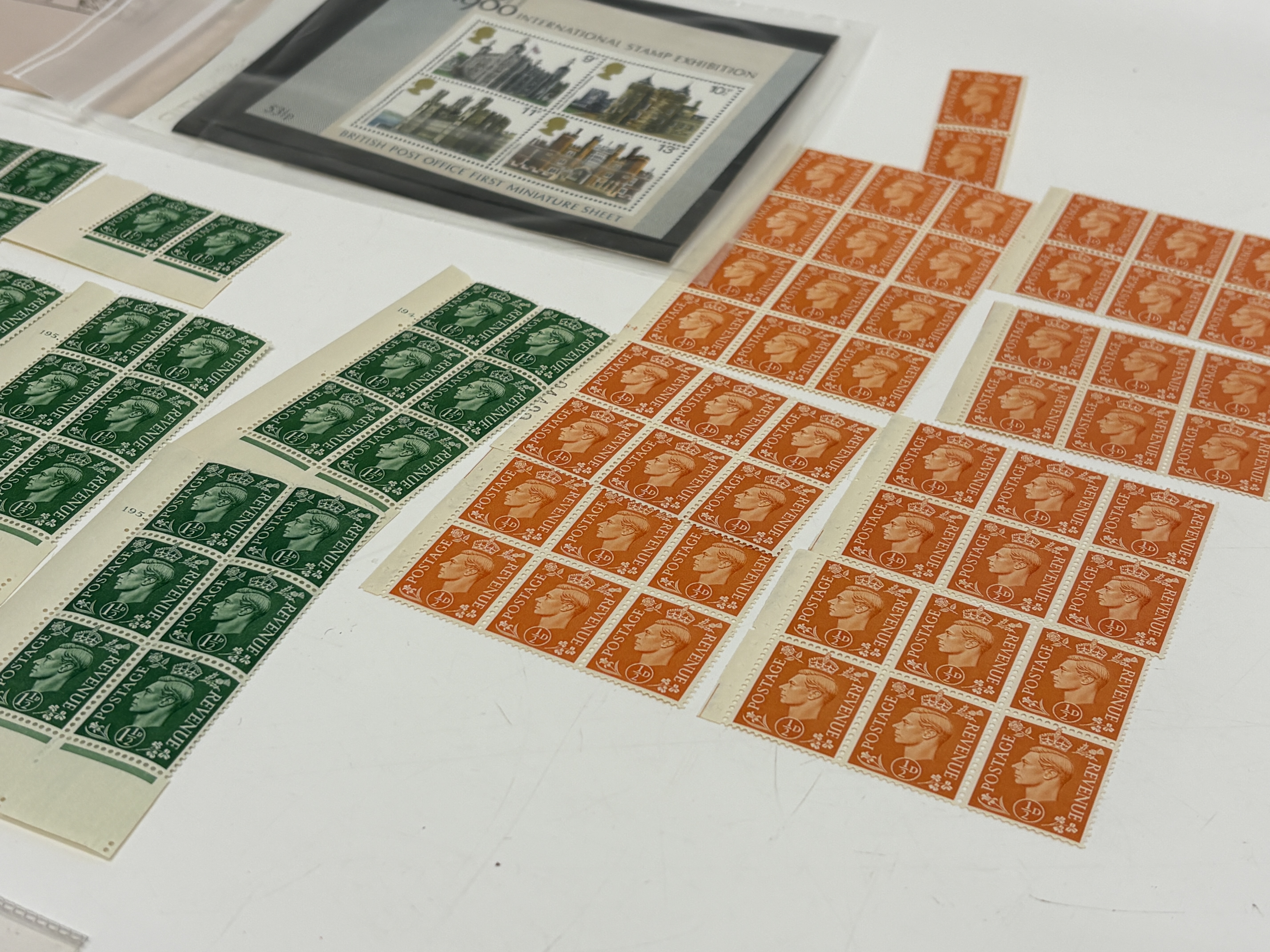 A diverse philatelic assembly featuring Queen Victoria 1d Red issues, SG 43, from Plate 98 (corner letters L-J) and Plate 180 (corner letters J-J and K-S). The collection includes multiple mint blocks and strips of King George VI definitive issues, denominations 1/2d orange, 1 1/2d green, 2 1/2d pale scarlet, and 4d light blue, all inscribed Postage Revenue. Featured is the London 1980 International Stamp Exhibition miniature sheet containing four perforated values (9p, 10p, 11p, and 13p). Postal history includes a 1963 Red Cross Centenary Congress philatelic cover with 3d, 1/3, and 1/6 commemoratives, and a 1978 commemorative cover from Ahmedabad G.P.O. featuring Charlie Chaplin and Mahatma Gandhi with a circular date stamp. Additional stamps and multiples are contained within several semi-transparent glassine envelopes.