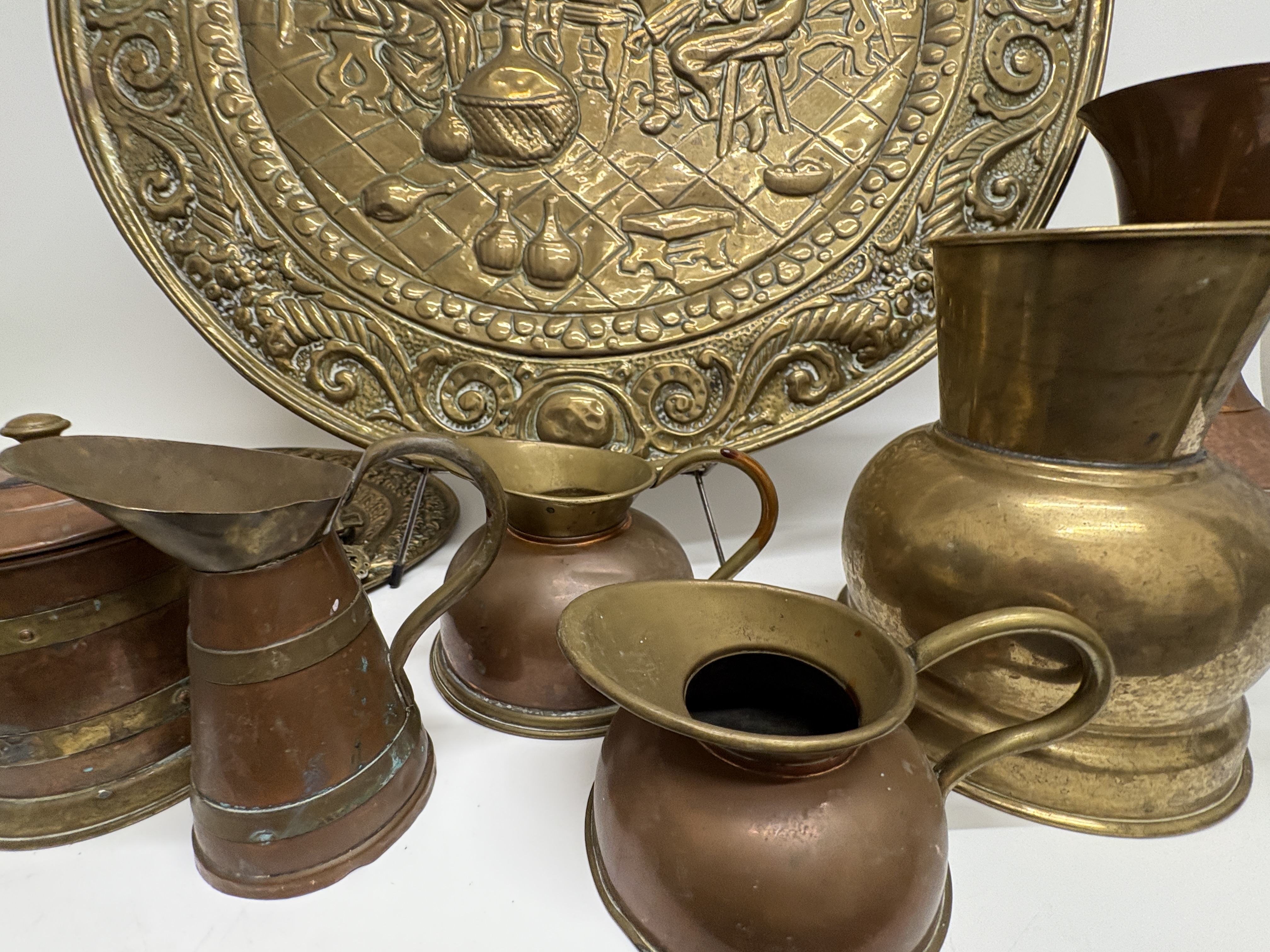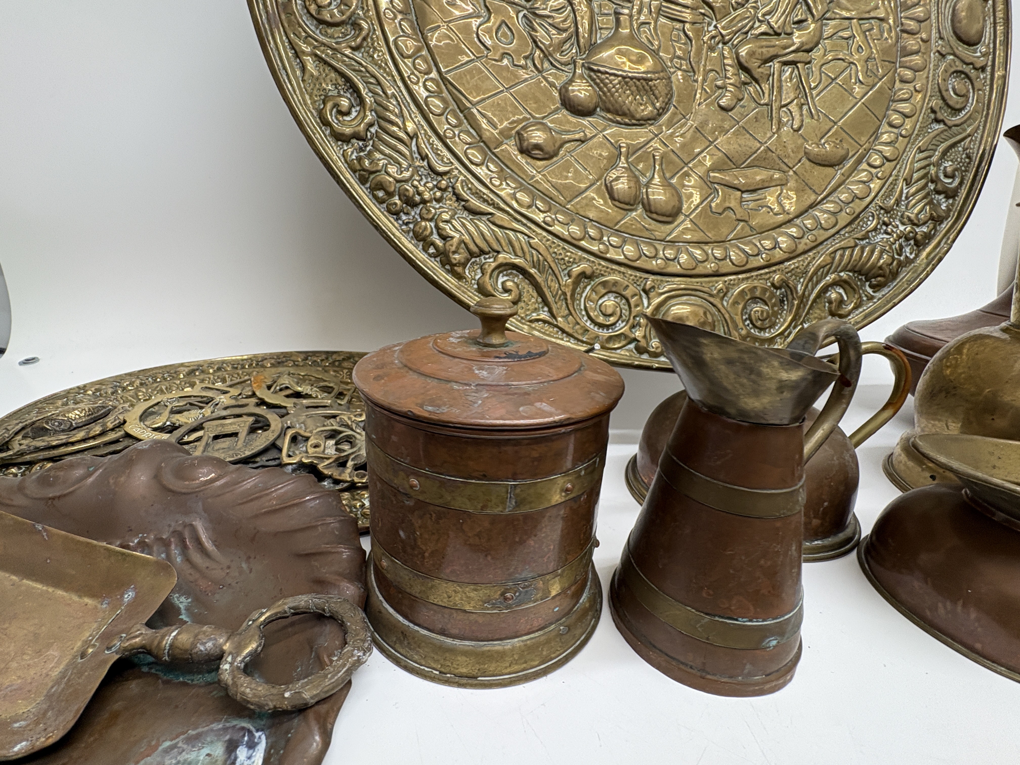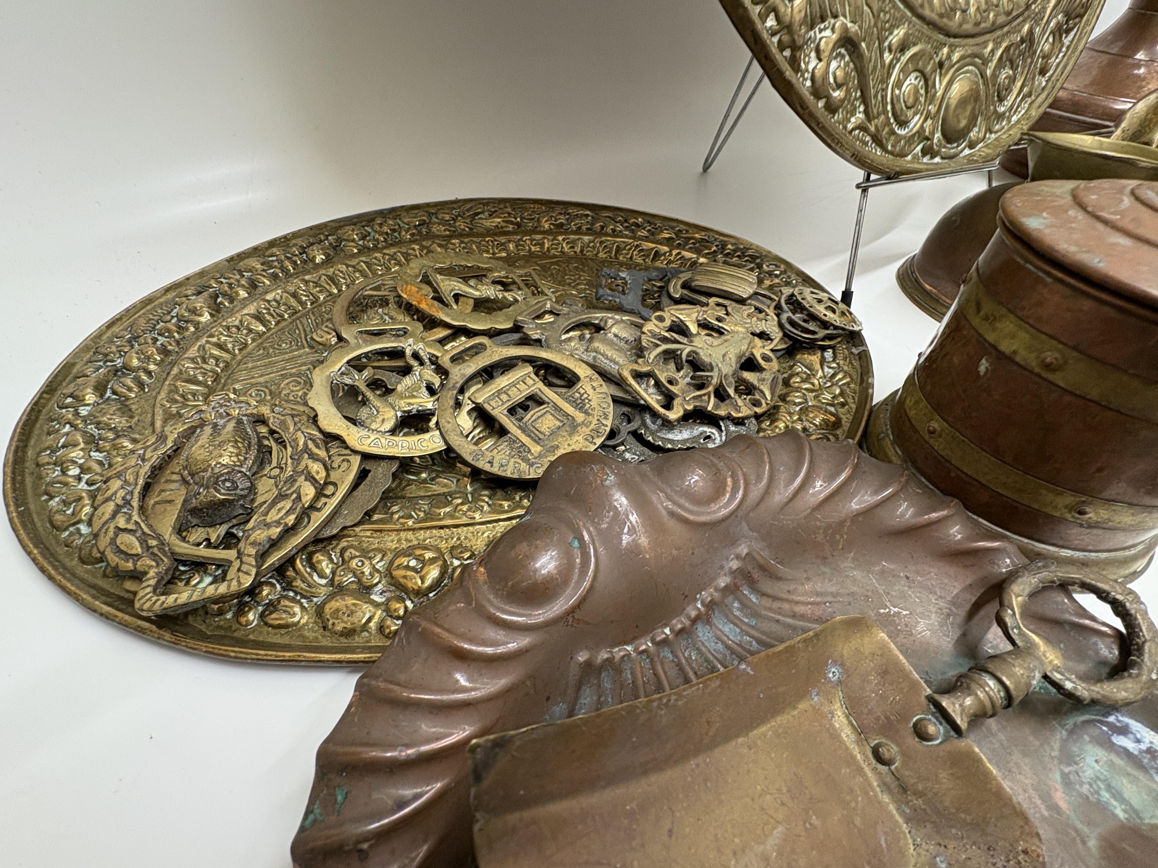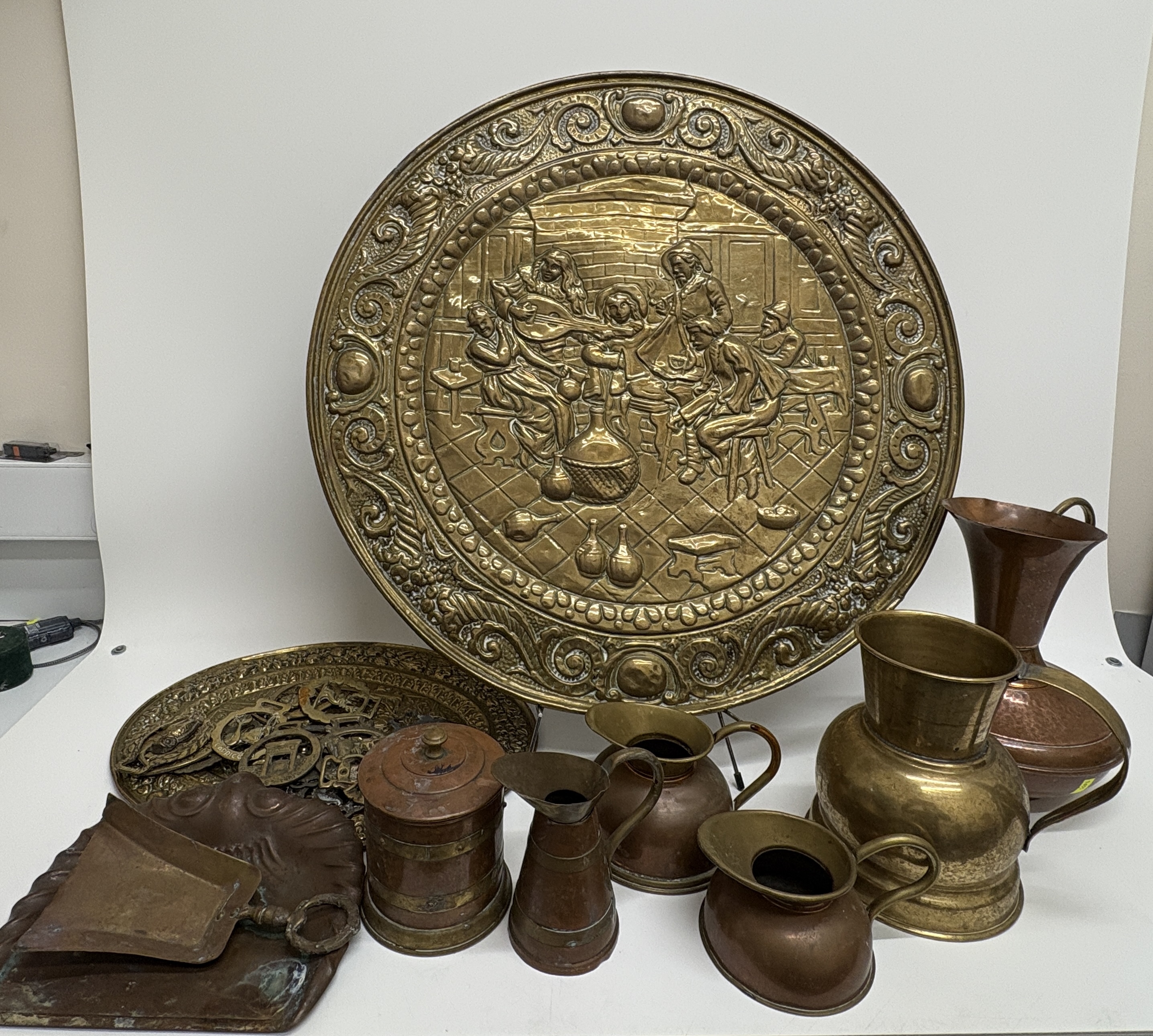 A comprehensive collection of Victorian and Edwardian revival decorative and functional metalware, primarily in brass and copper. The lot features a large circular Peerage brass wall charger with a high-relief repoussé central medallion depicting a 17th-century tavern scene with musicians and drinkers, bordered by scrolling acanthus leaves and raised bosses. Included is a further oval brass tray with an embossed figurative scene. The hollowware comprises an assortment of graduated copper and brass pitchers, jugs, and a copper lidded canister reinforced with horizontal brass bands. The collection also contains a quantity of cast brass horse brasses with various motifs including Capricorn, Plymouth, Gretna Green, and John Peel. Additional items include a variety of brass fireplace implements such as a hearth brush, fire fork, and poker, alongside small bells, chambersticks, and decorative vases. One brass handle bears the stamped mark G V. Dimensions: Charger diameter 58cm, Tray width 45cm.