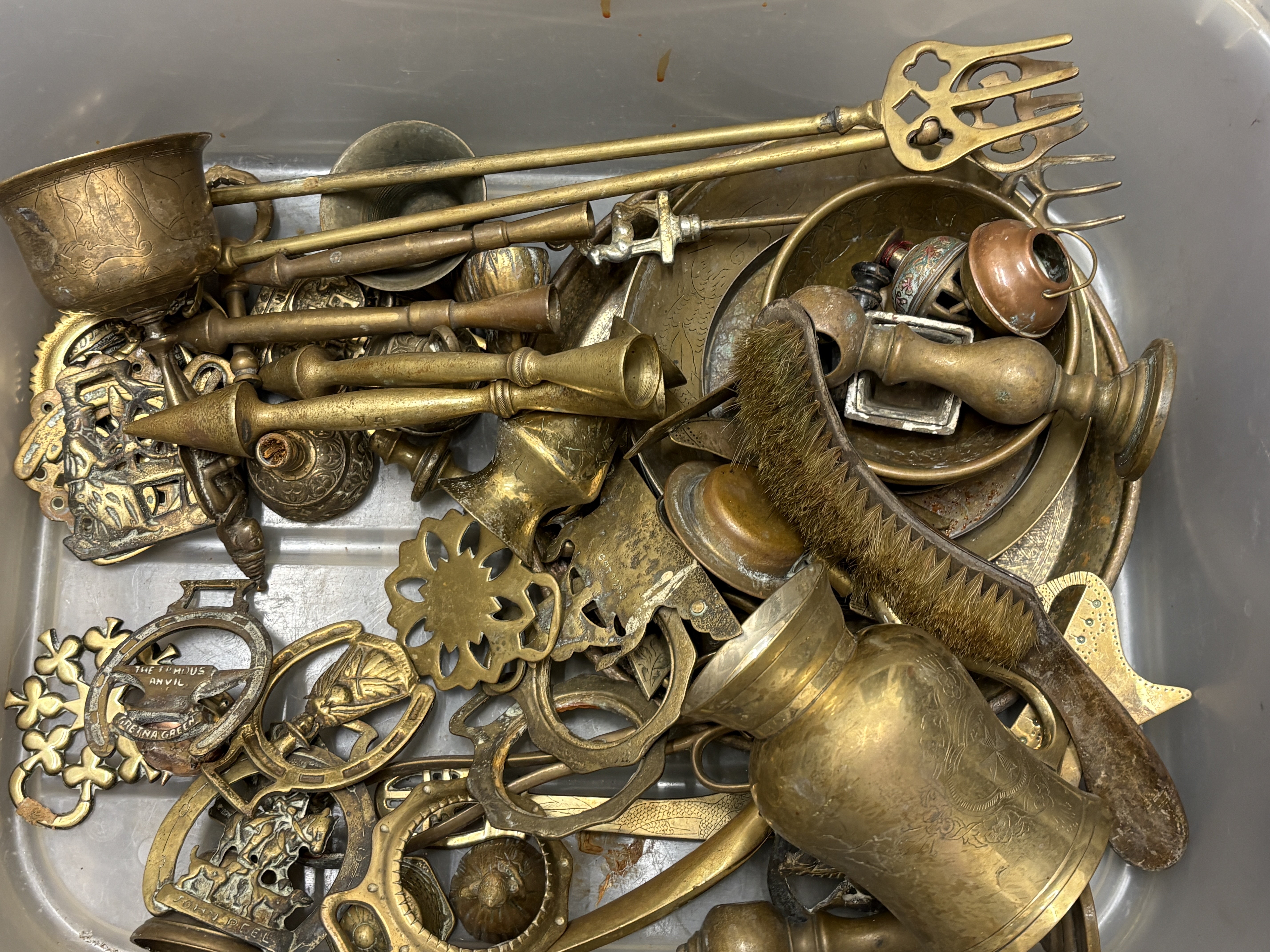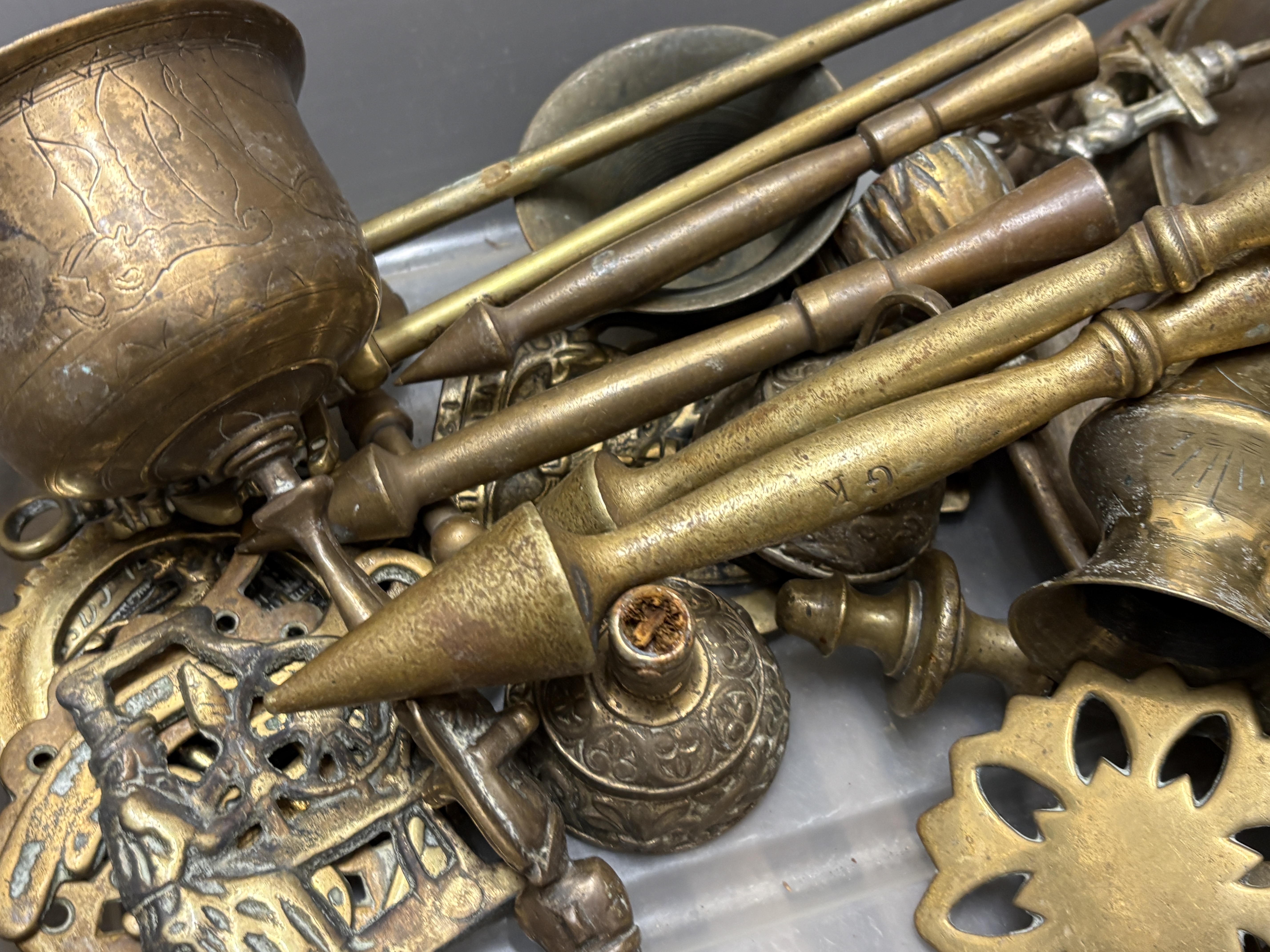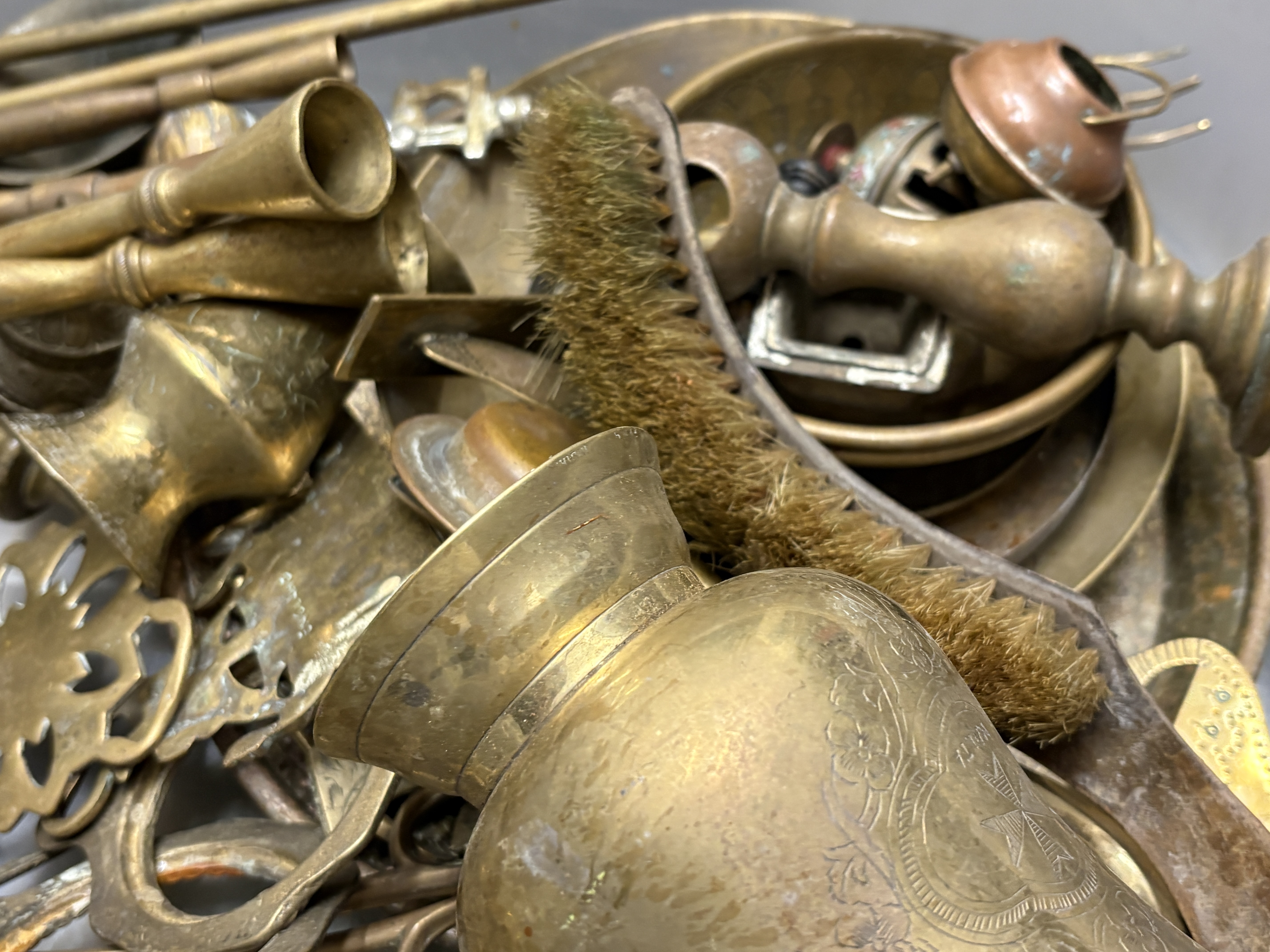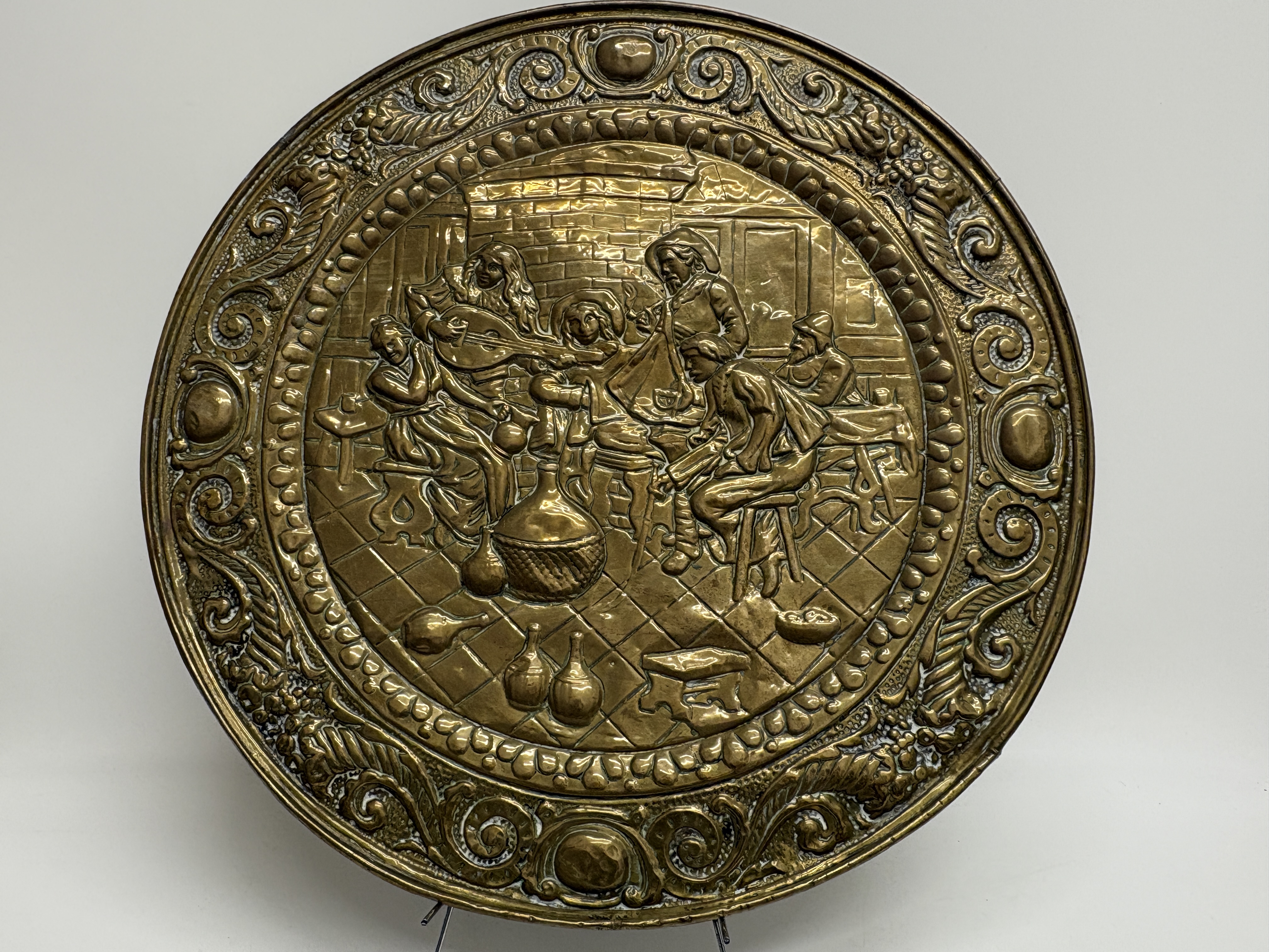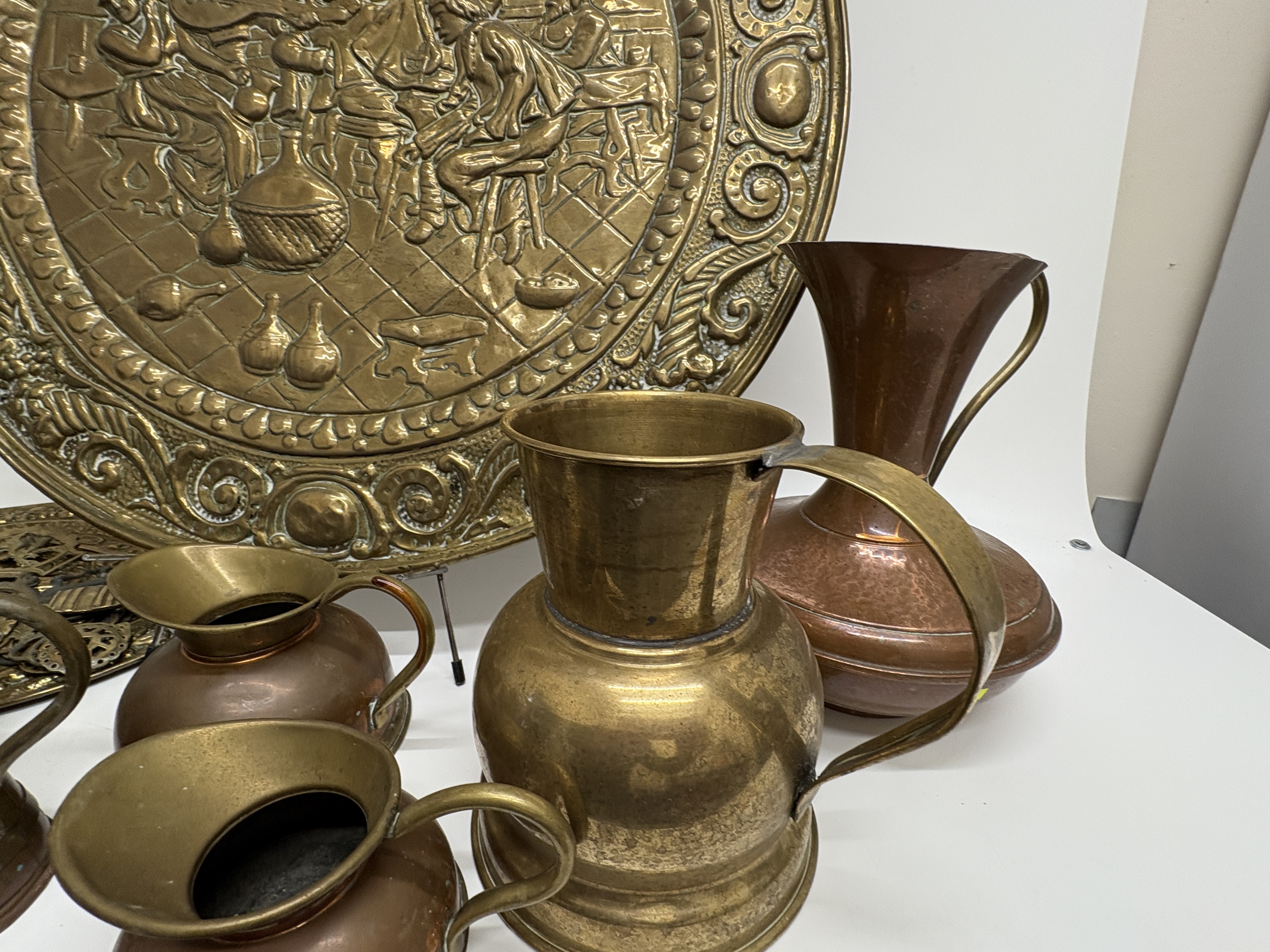 A comprehensive collection of Victorian and Edwardian revival decorative and functional metalware, primarily in brass and copper. The lot features a large circular Peerage brass wall charger with a high-relief repoussé central medallion depicting a 17th-century tavern scene with musicians and drinkers, bordered by scrolling acanthus leaves and raised bosses. Included is a further oval brass tray with an embossed figurative scene. The hollowware comprises an assortment of graduated copper and brass pitchers, jugs, and a copper lidded canister reinforced with horizontal brass bands. The collection also contains a quantity of cast brass horse brasses with various motifs including Capricorn, Plymouth, Gretna Green, and John Peel. Additional items include a variety of brass fireplace implements such as a hearth brush, fire fork, and poker, alongside small bells, chambersticks, and decorative vases. One brass handle bears the stamped mark G V. Dimensions: Charger diameter 58cm, Tray width 45cm.