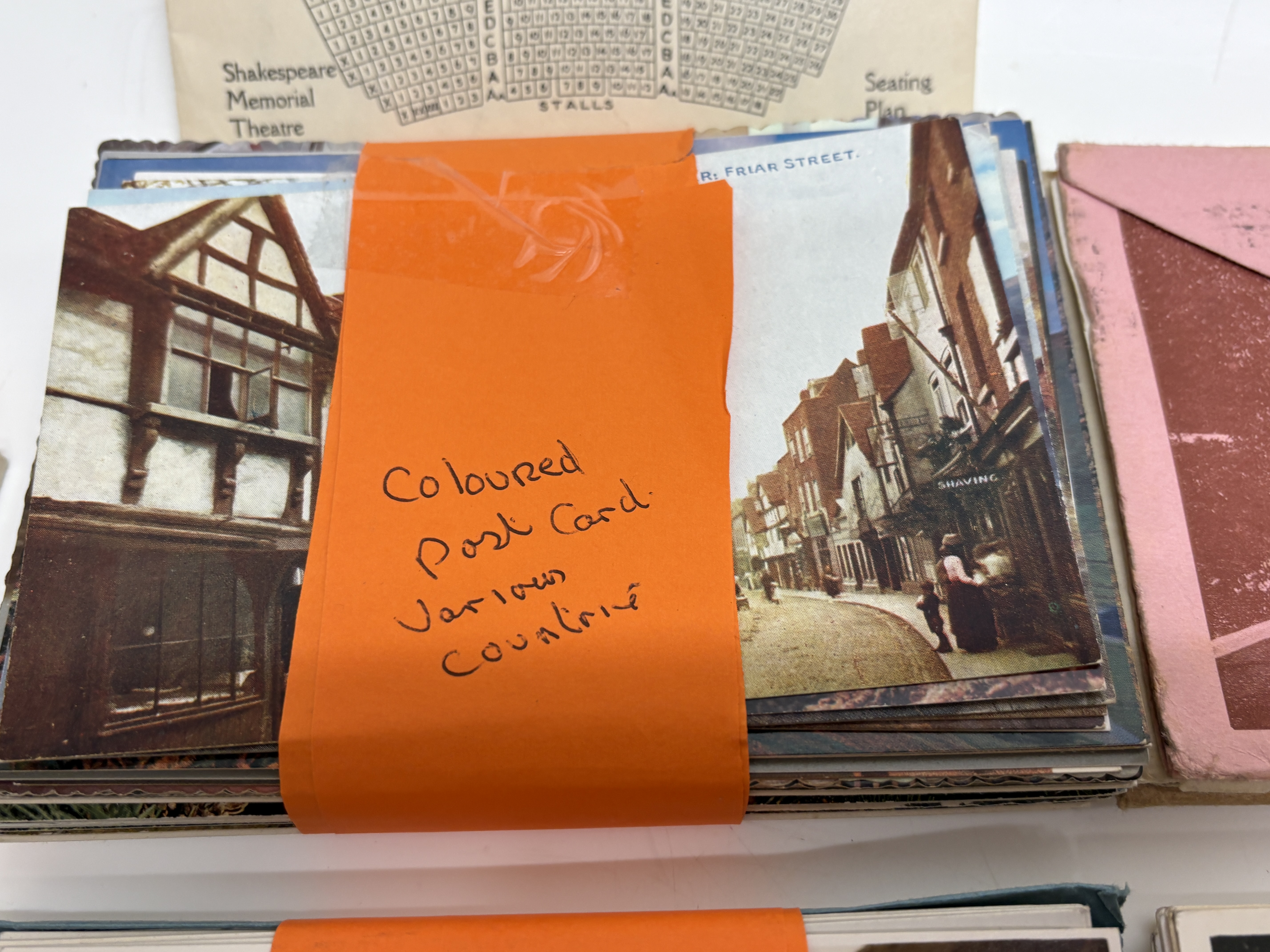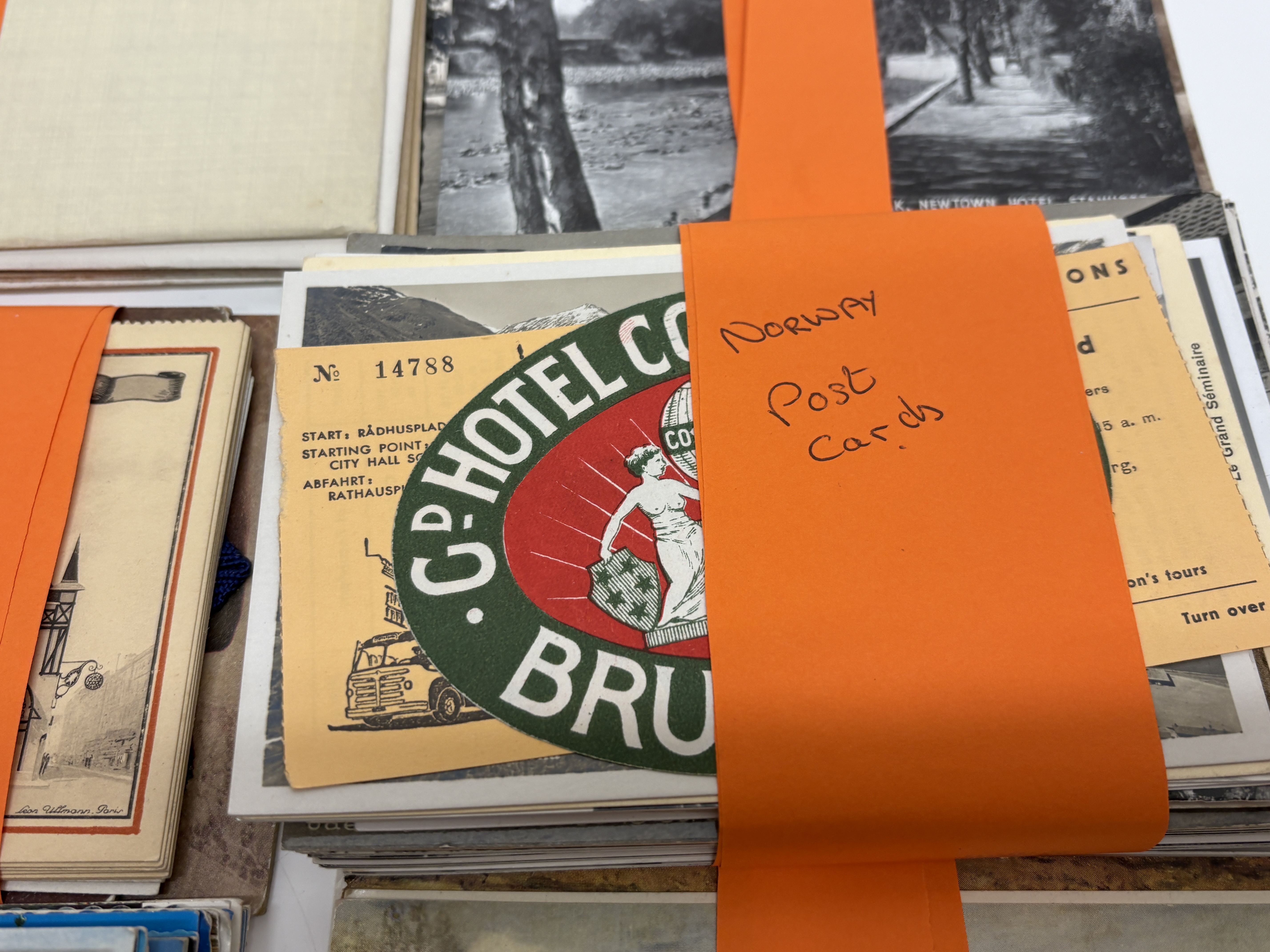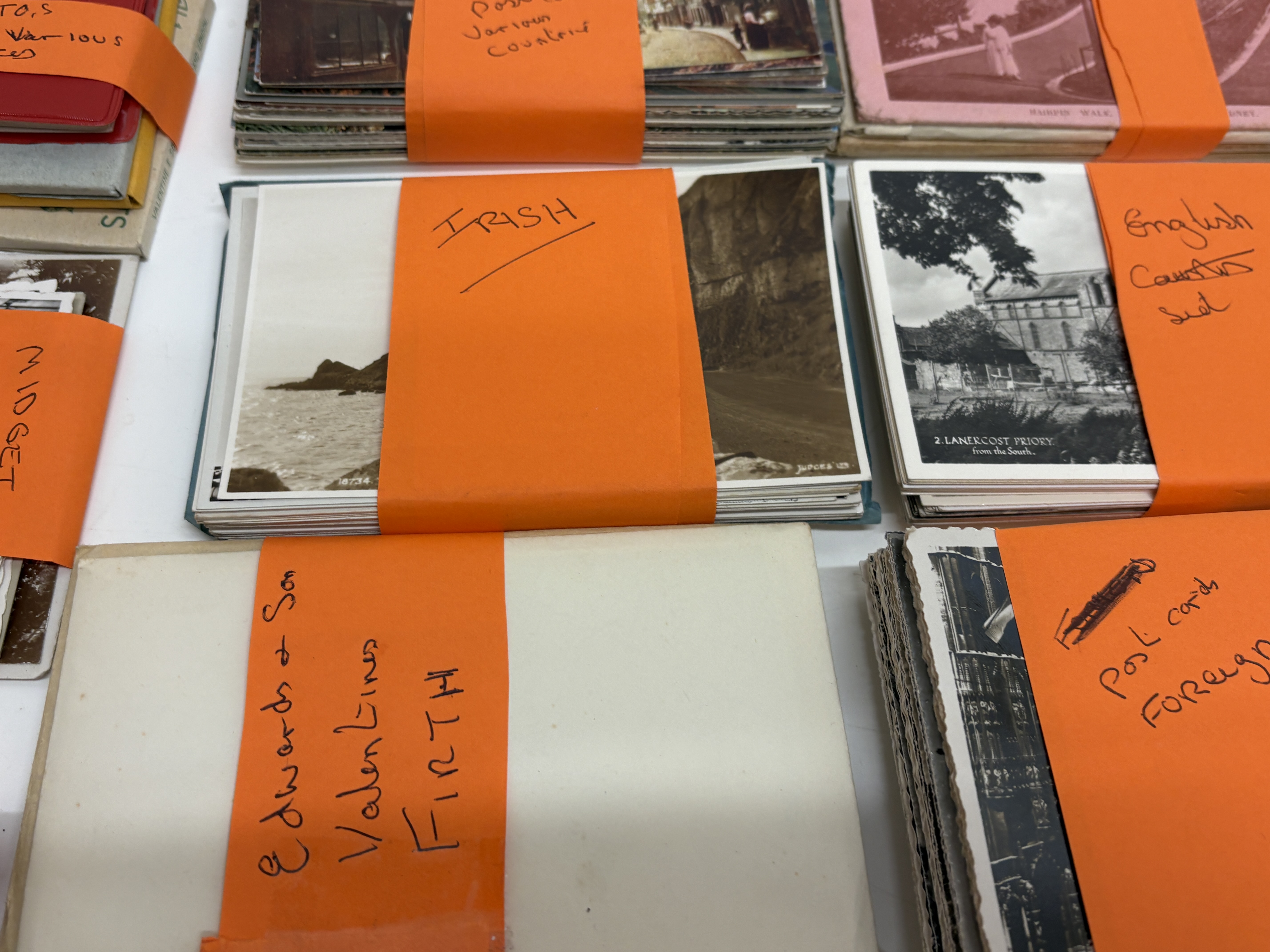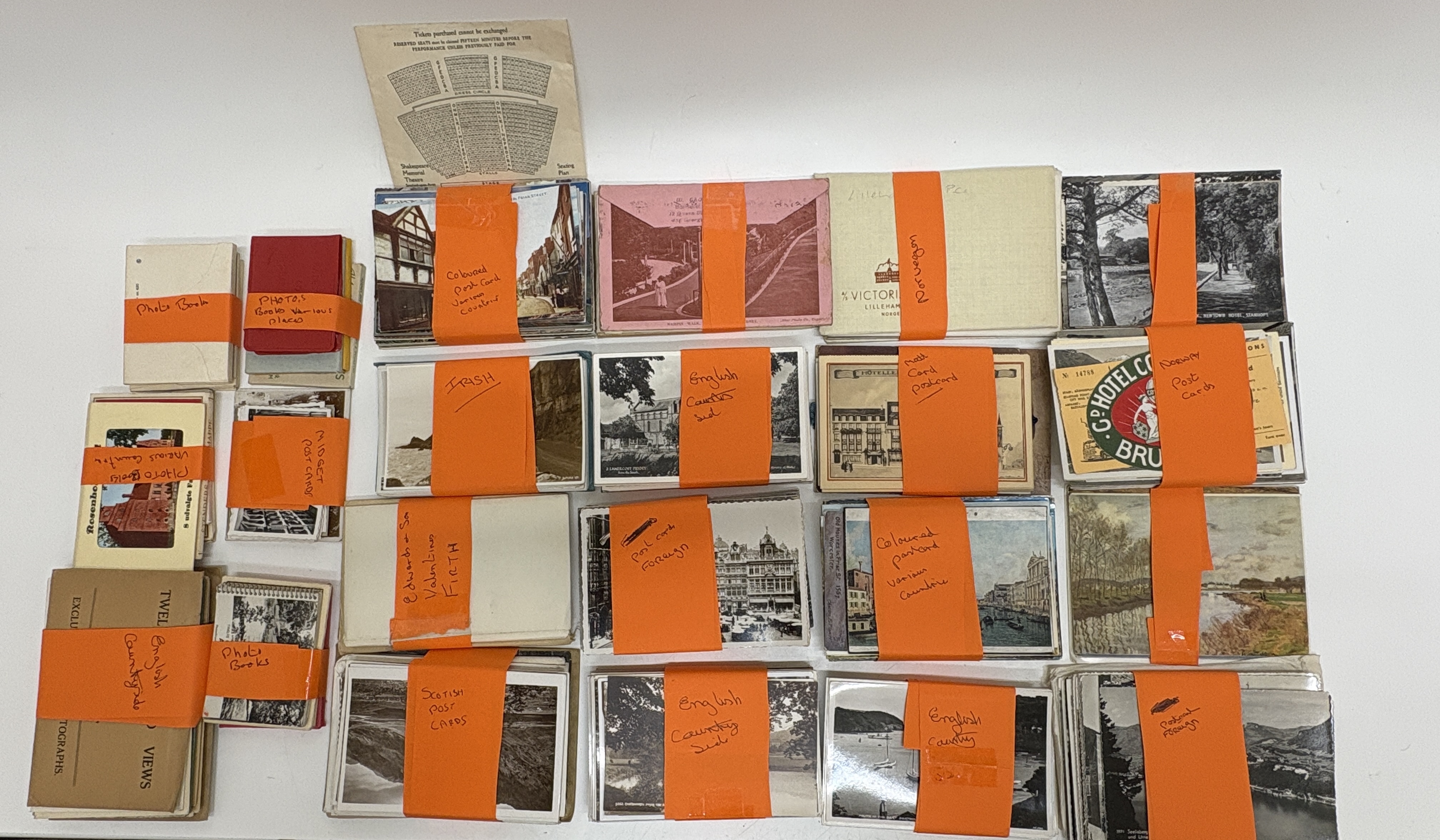 A substantial collection of early to mid-20th-century travel ephemera, comprising approximately 20 organised bundles of topographical postcards and souvenir photo booklets. This diverse archive provides a comprehensive visual record of British and European tourism, featuring a high volume of postcards from the English Countryside (notably Chatsworth and Lanercost Priory), Scotland, Ireland, and international destinations including Norway, Italy (Venice), and Belgium (Brussels). The assortment includes real photographic postcards (RPPC), early coloured lithographic views, and “midget” small-format cards. Prominent publishers represented include Valentine & Sons Ltd., Francis Frith & Co., Judges’ Ltd., Photochrom Co. Ltd., and Edwards & Son. Supplementary items of interest include a vintage seating plan for the Shakespeare Memorial Theatre in Stratford-upon-Avon and a luggage sticker for the Hotel Grand Central, Brussels. The lot also contains several small-format souvenir photo booklets, such as “Twelve English Countryside Views” and “Rosenborg” guides. Dimensions: Various sizes, primarily standard postcard format (approx. 140mm x 90mm) and small-format booklets.