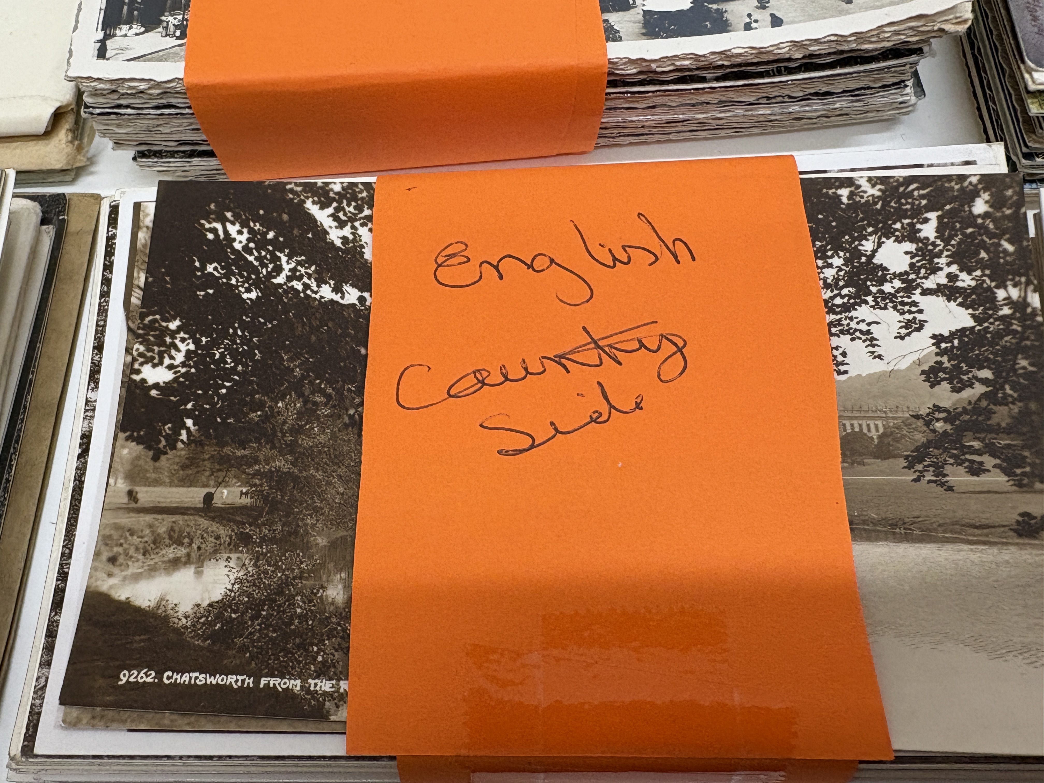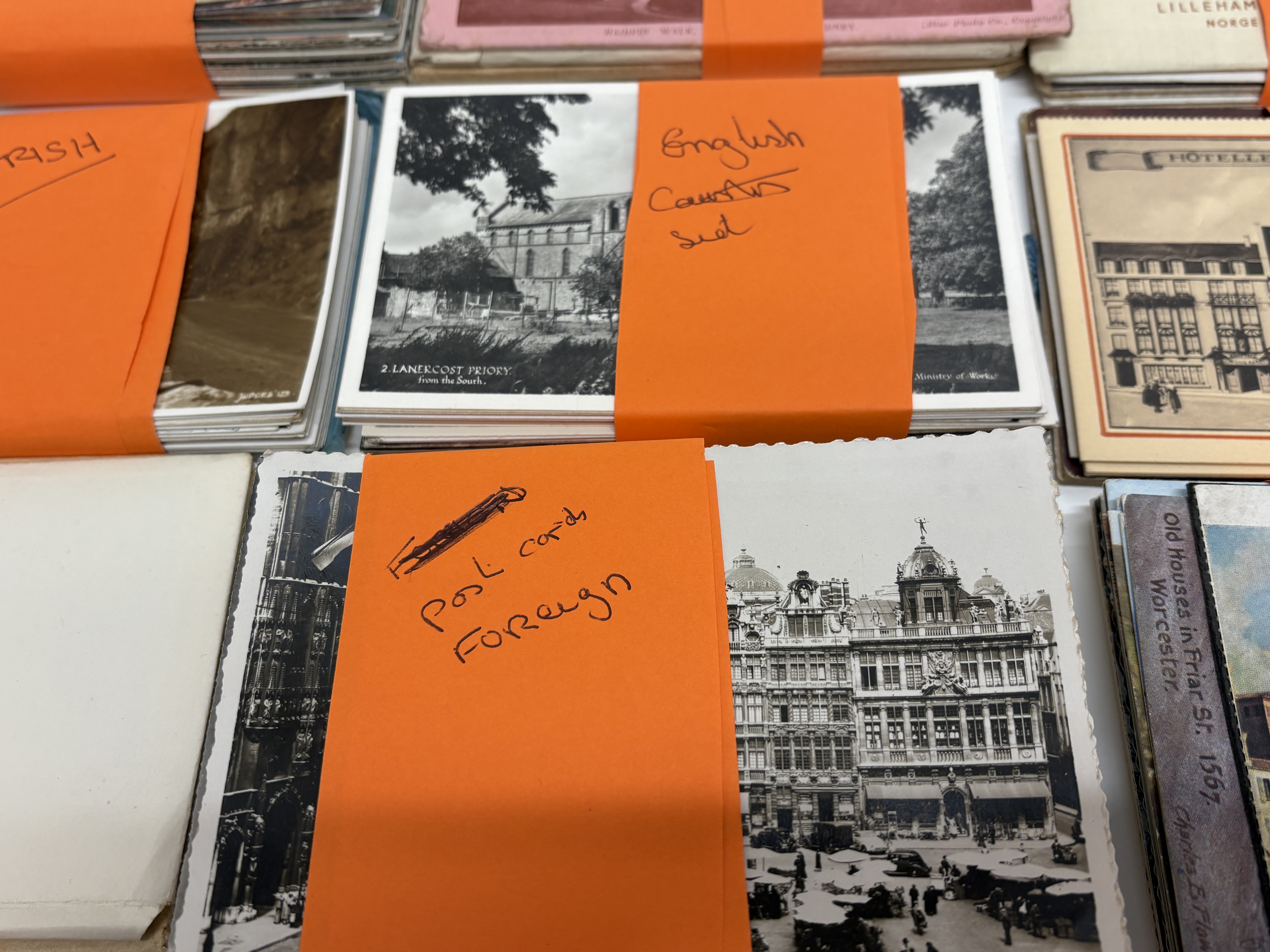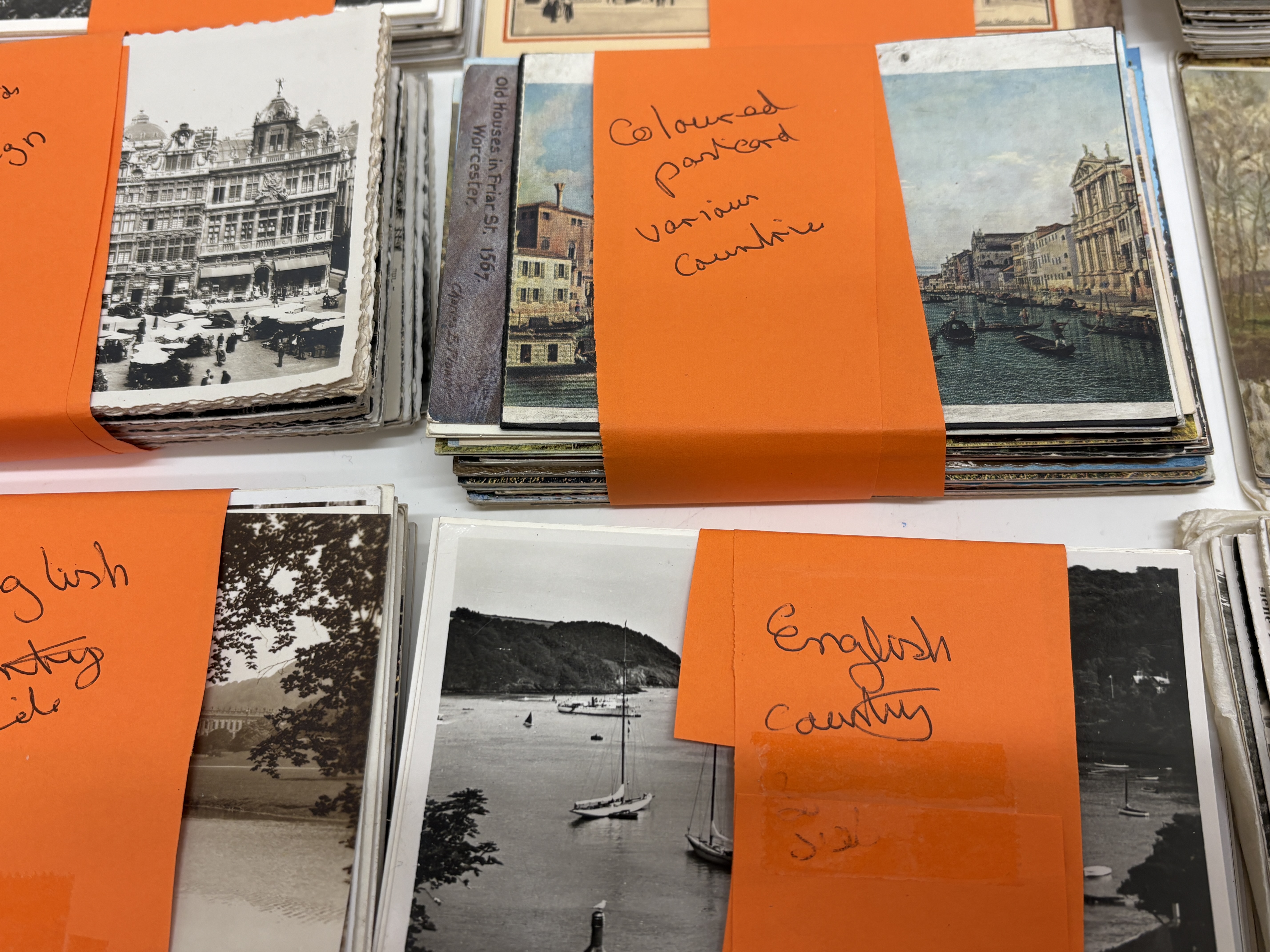 A substantial collection of early to mid-20th-century travel ephemera, comprising approximately 20 organised bundles of topographical postcards and souvenir photo booklets. This diverse archive provides a comprehensive visual record of British and European tourism, featuring a high volume of postcards from the English Countryside (notably Chatsworth and Lanercost Priory), Scotland, Ireland, and international destinations including Norway, Italy (Venice), and Belgium (Brussels). The assortment includes real photographic postcards (RPPC), early coloured lithographic views, and “midget” small-format cards. Prominent publishers represented include Valentine & Sons Ltd., Francis Frith & Co., Judges’ Ltd., Photochrom Co. Ltd., and Edwards & Son. Supplementary items of interest include a vintage seating plan for the Shakespeare Memorial Theatre in Stratford-upon-Avon and a luggage sticker for the Hotel Grand Central, Brussels. The lot also contains several small-format souvenir photo booklets, such as “Twelve English Countryside Views” and “Rosenborg” guides. Dimensions: Various sizes, primarily standard postcard format (approx. 140mm x 90mm) and small-format booklets.
