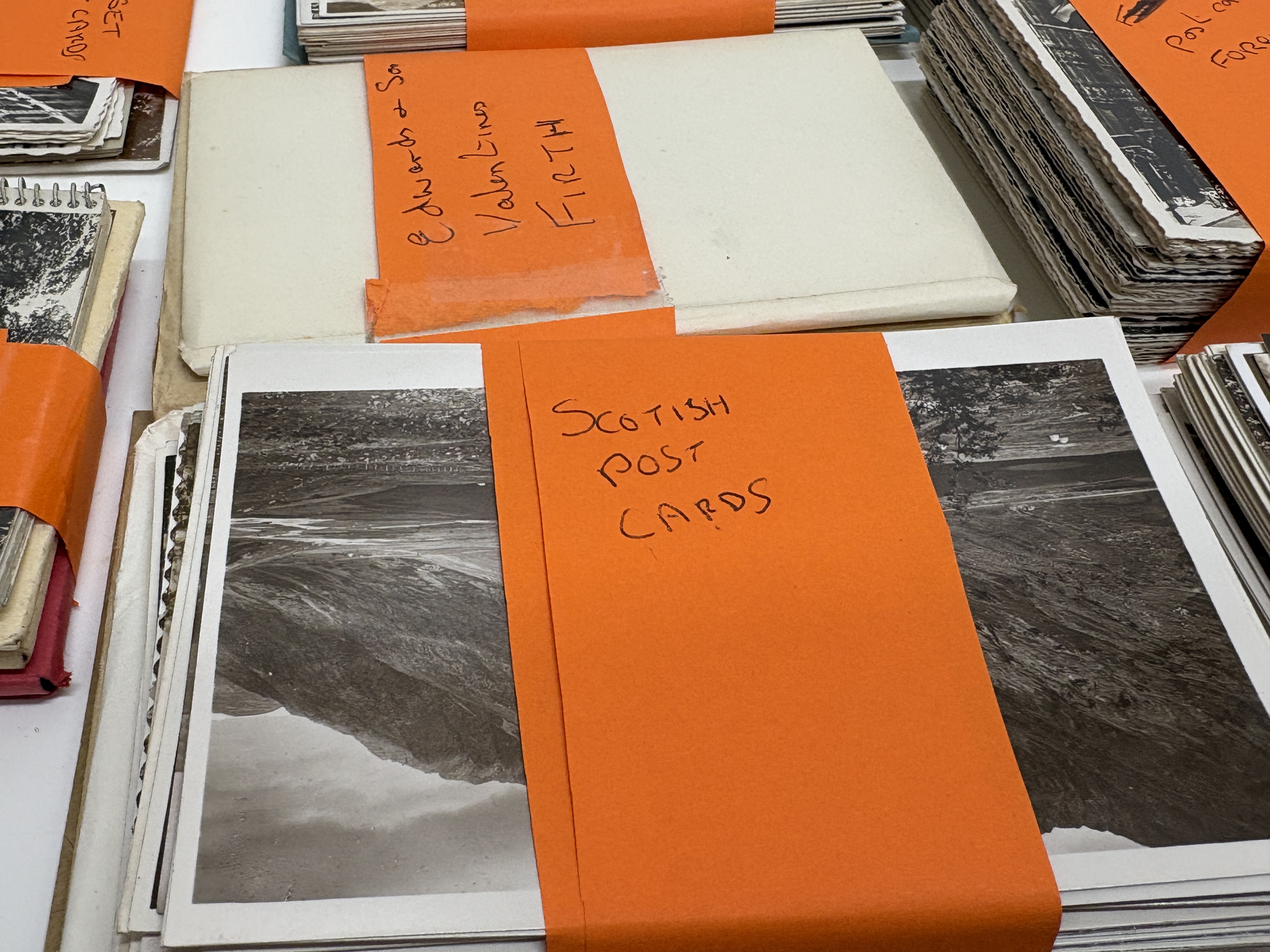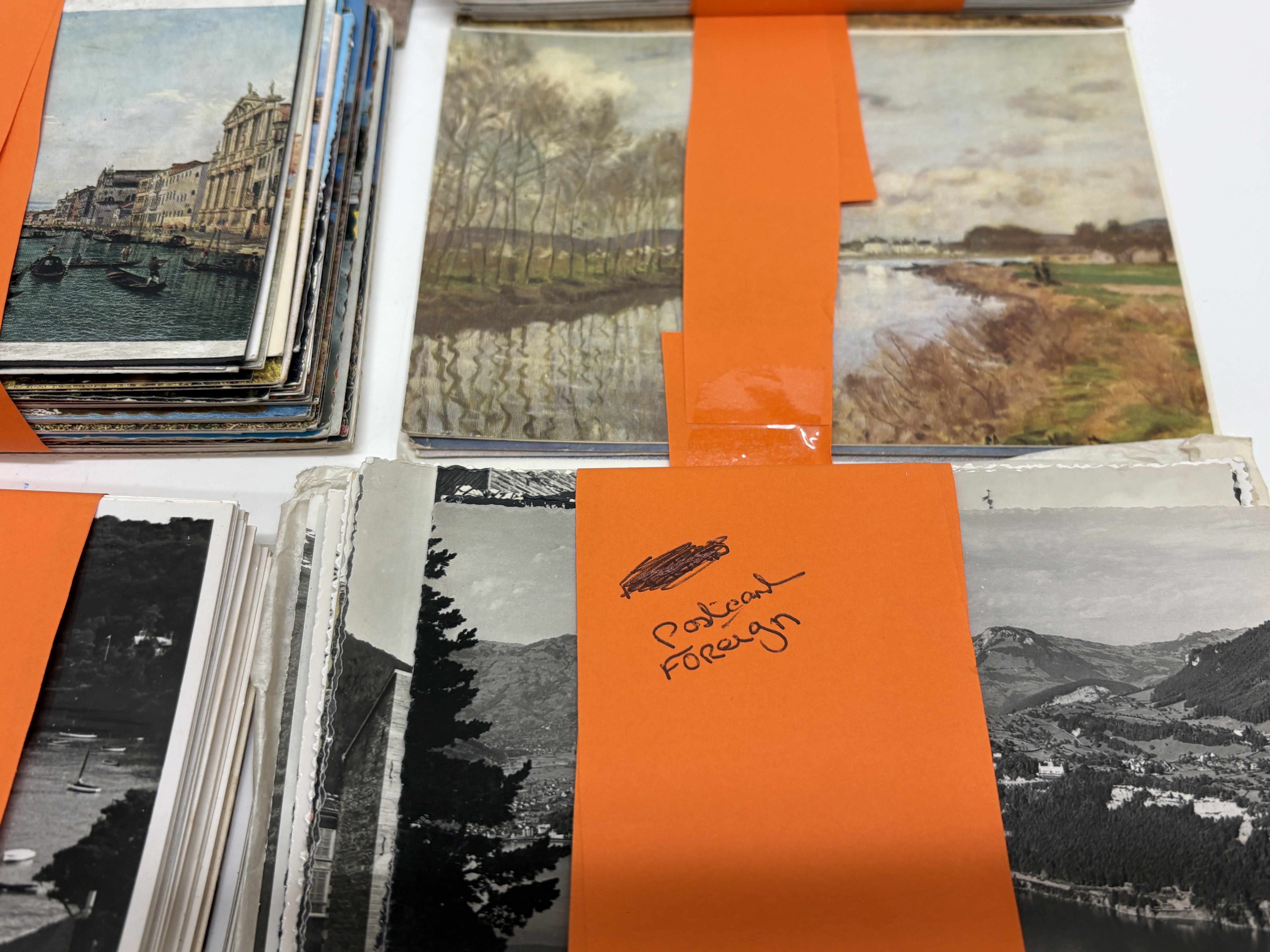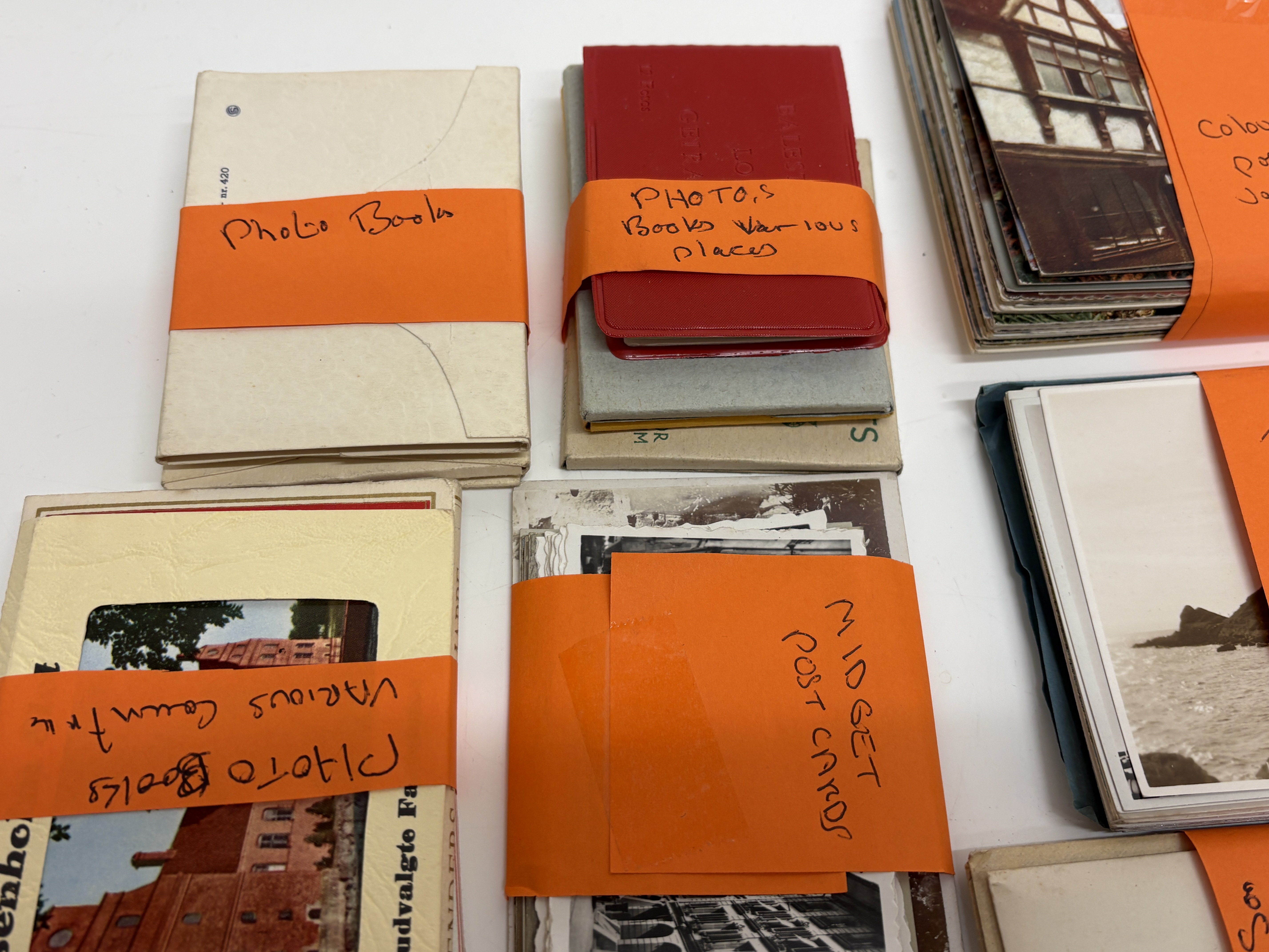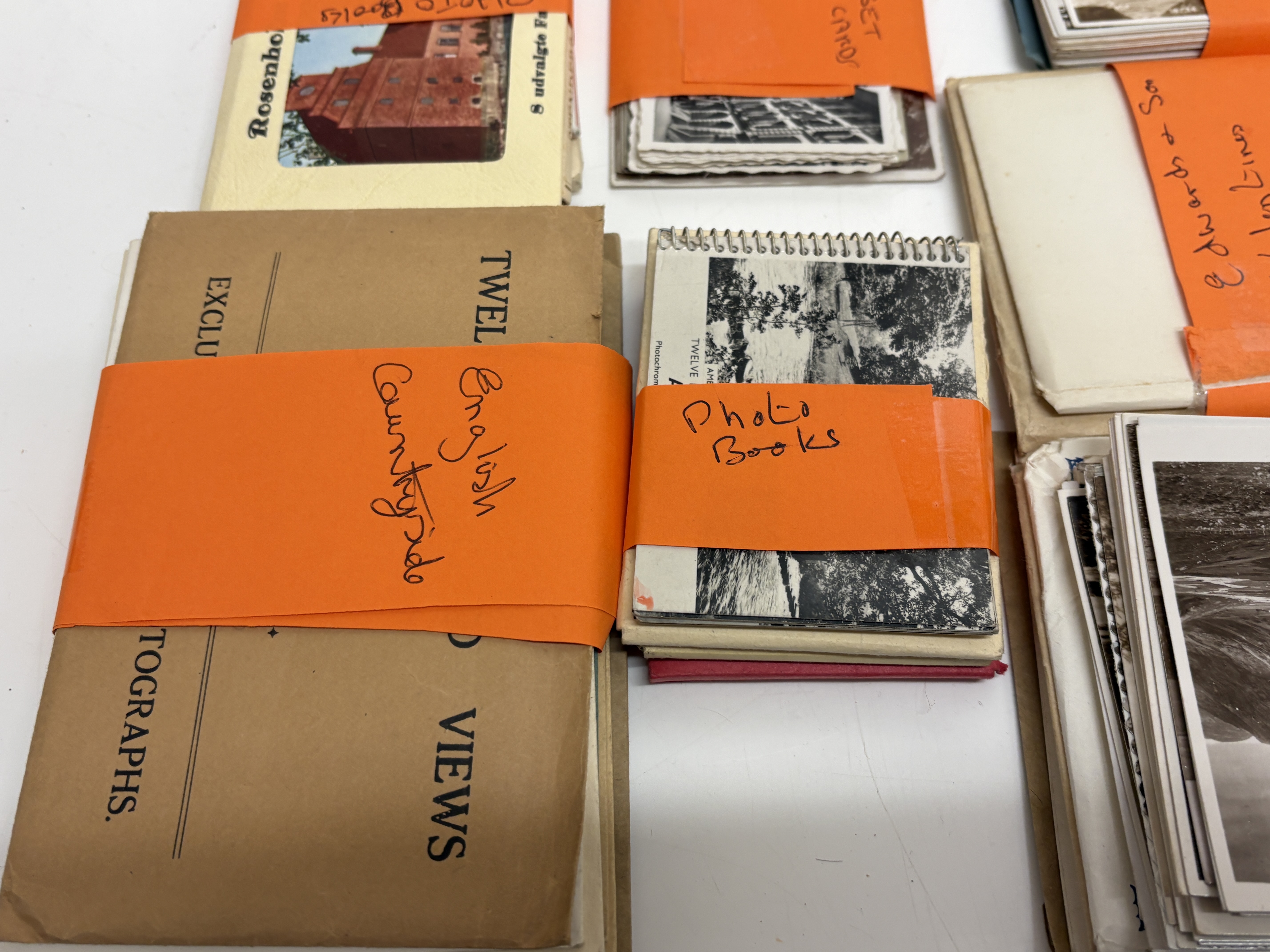 A substantial collection of early to mid-20th-century travel ephemera, comprising approximately 20 organised bundles of topographical postcards and souvenir photo booklets. This diverse archive provides a comprehensive visual record of British and European tourism, featuring a high volume of postcards from the English Countryside (notably Chatsworth and Lanercost Priory), Scotland, Ireland, and international destinations including Norway, Italy (Venice), and Belgium (Brussels). The assortment includes real photographic postcards (RPPC), early coloured lithographic views, and “midget” small-format cards. Prominent publishers represented include Valentine & Sons Ltd., Francis Frith & Co., Judges’ Ltd., Photochrom Co. Ltd., and Edwards & Son. Supplementary items of interest include a vintage seating plan for the Shakespeare Memorial Theatre in Stratford-upon-Avon and a luggage sticker for the Hotel Grand Central, Brussels. The lot also contains several small-format souvenir photo booklets, such as “Twelve English Countryside Views” and “Rosenborg” guides. Dimensions: Various sizes, primarily standard postcard format (approx. 140mm x 90mm) and small-format booklets.