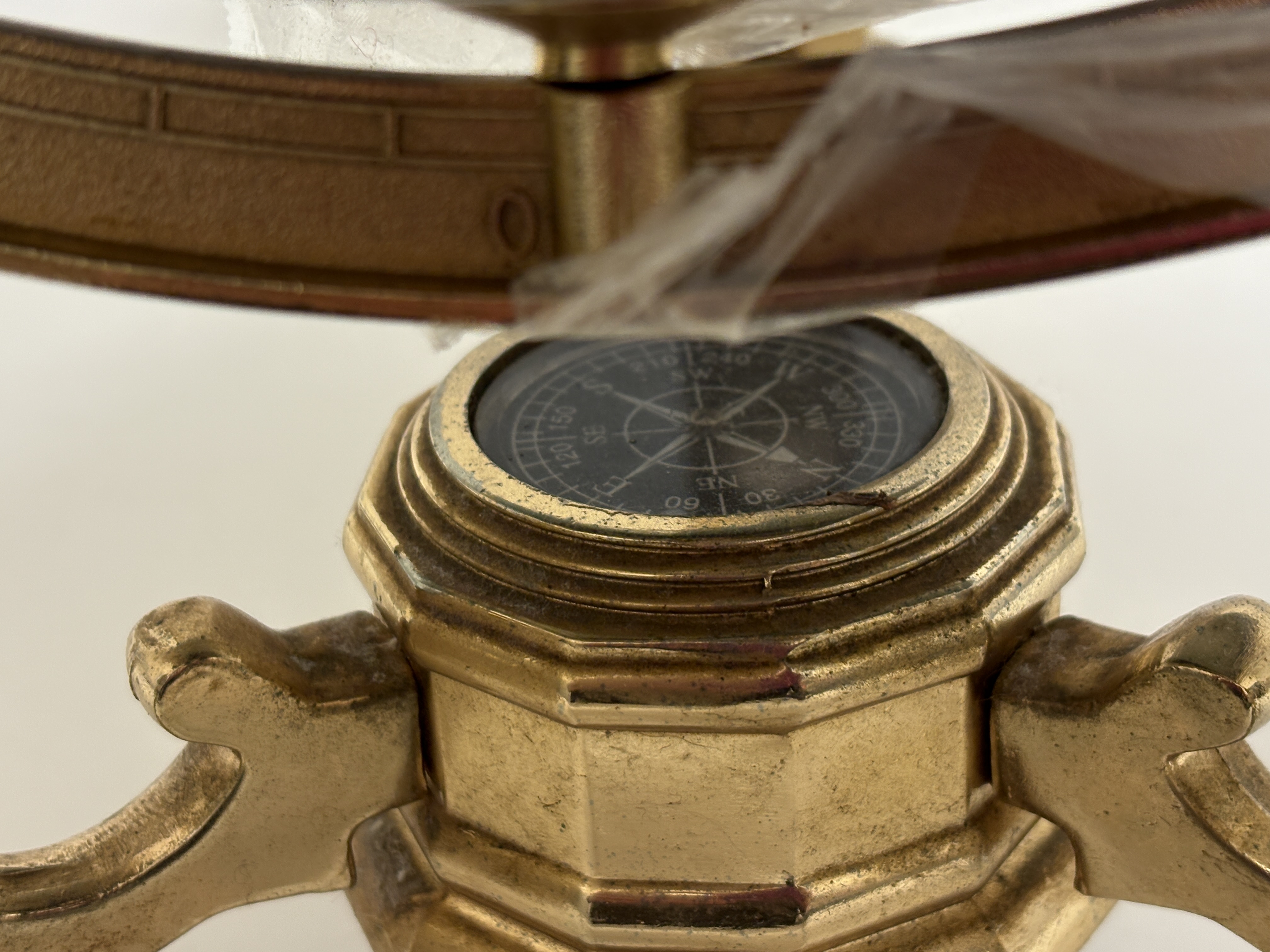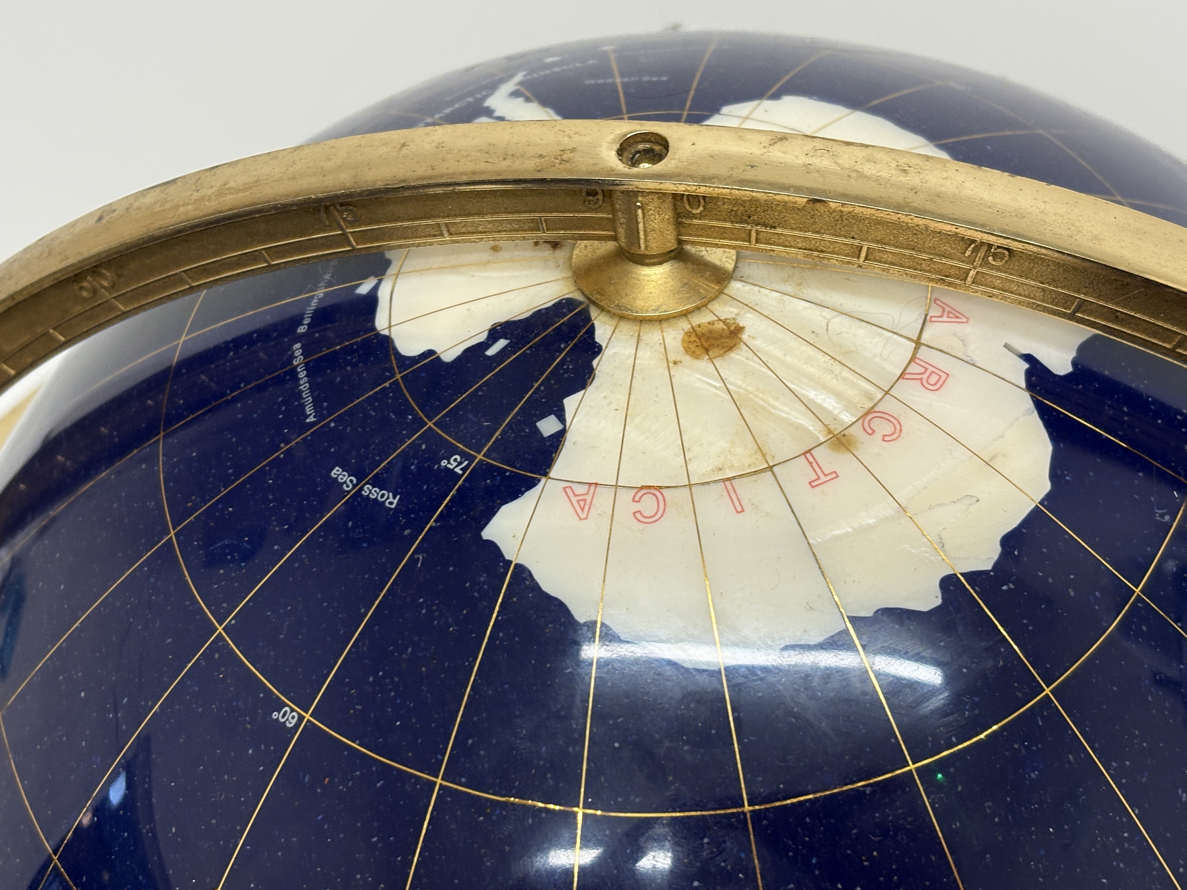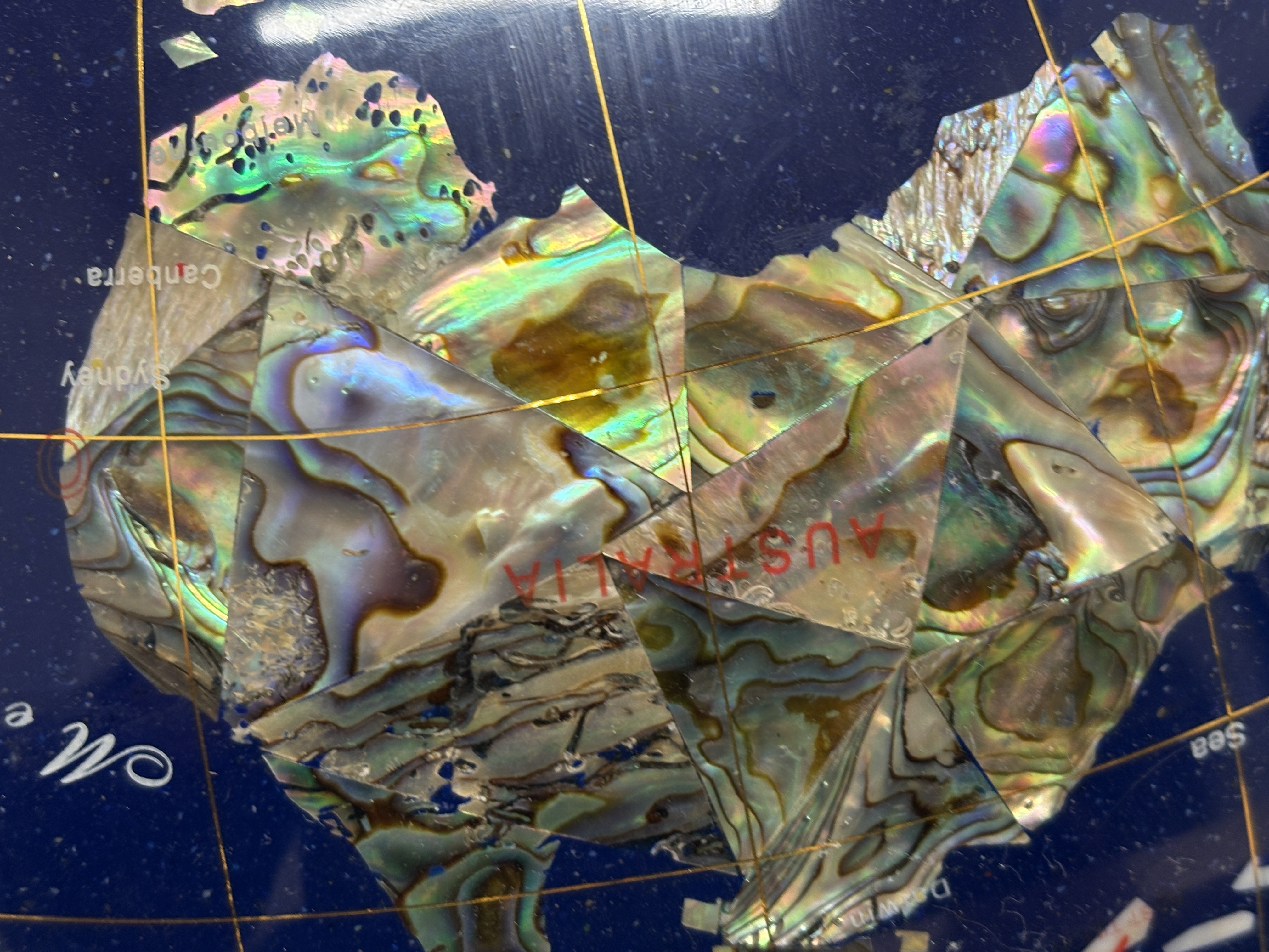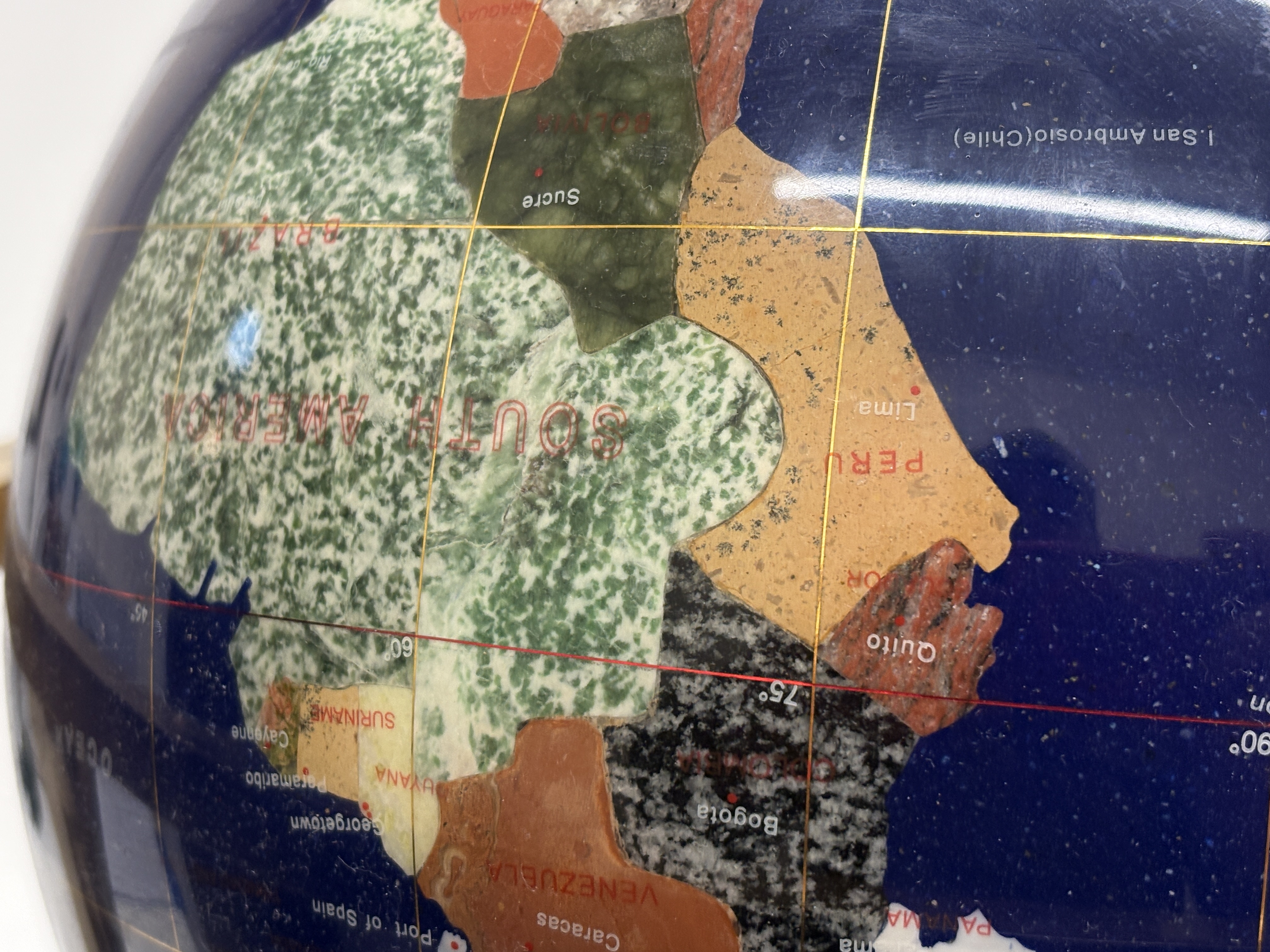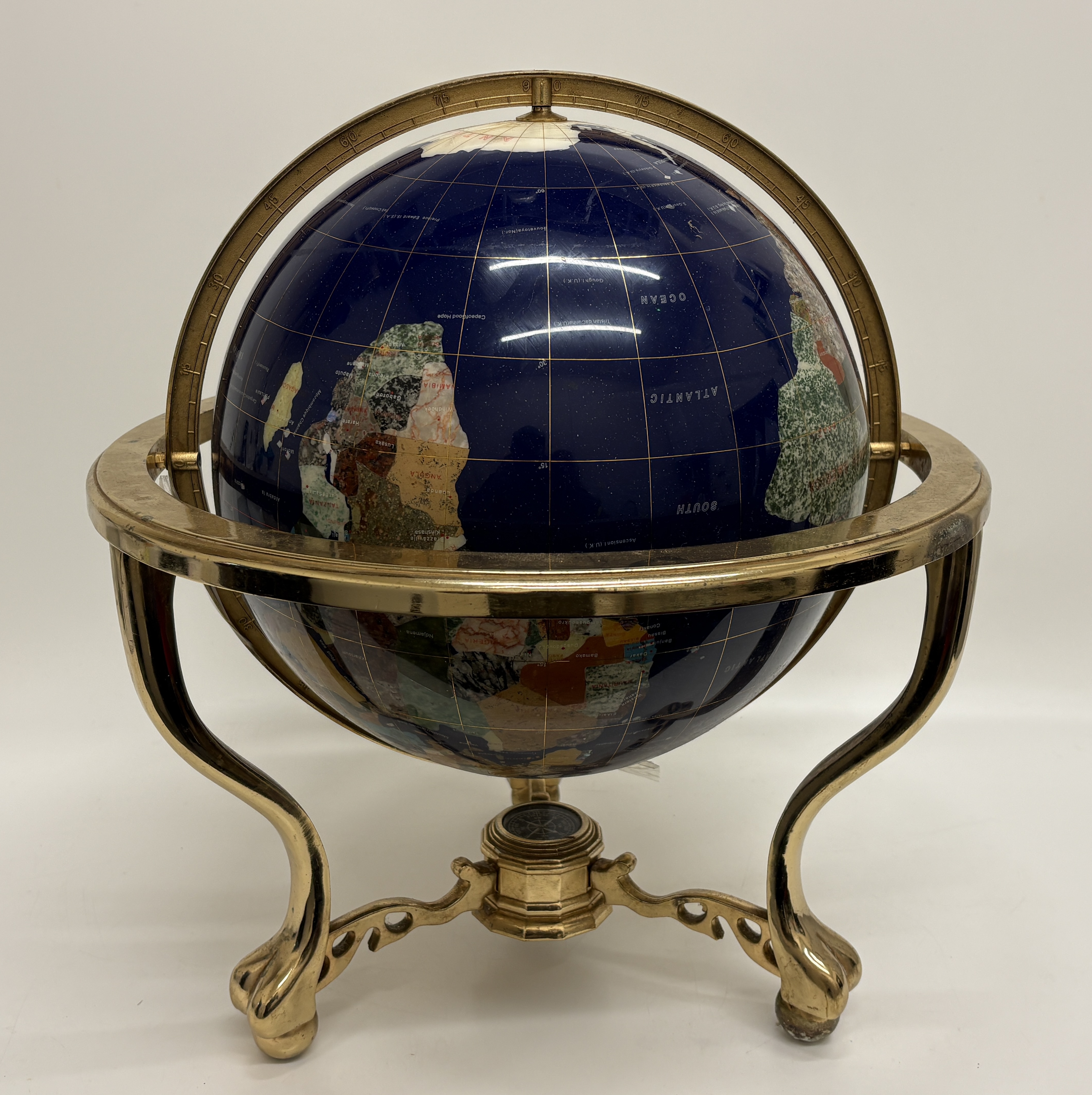 A contemporary decorative desk globe featuring a deep blue lapis lazuli-style composite ocean surface. The continents are meticulously hand-inlaid with a variety of semi-precious gemstones, including malachite, mother-of-pearl, and iridescent abalone shell representing Australia. The globe is set within a 360-degree calibrated meridian and a horizontal ring, supported by a polished gold-toned brass tripod-style base. The base features an integrated magnetic compass with a glass cover at the centre. This piece is characteristic of the designs by Unique Art or Alexander Kalifano. Dimensions: Approximately 45cm x 40cm.