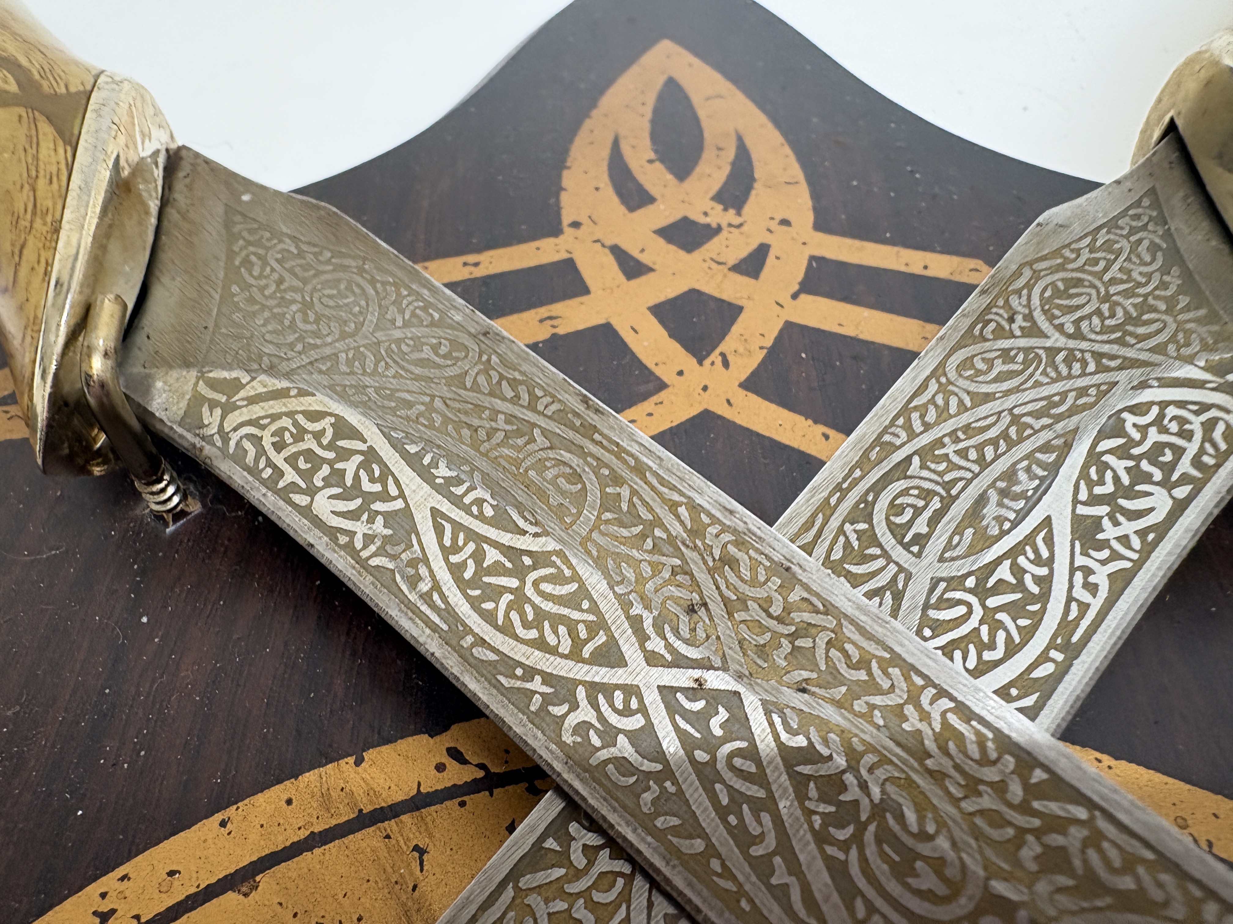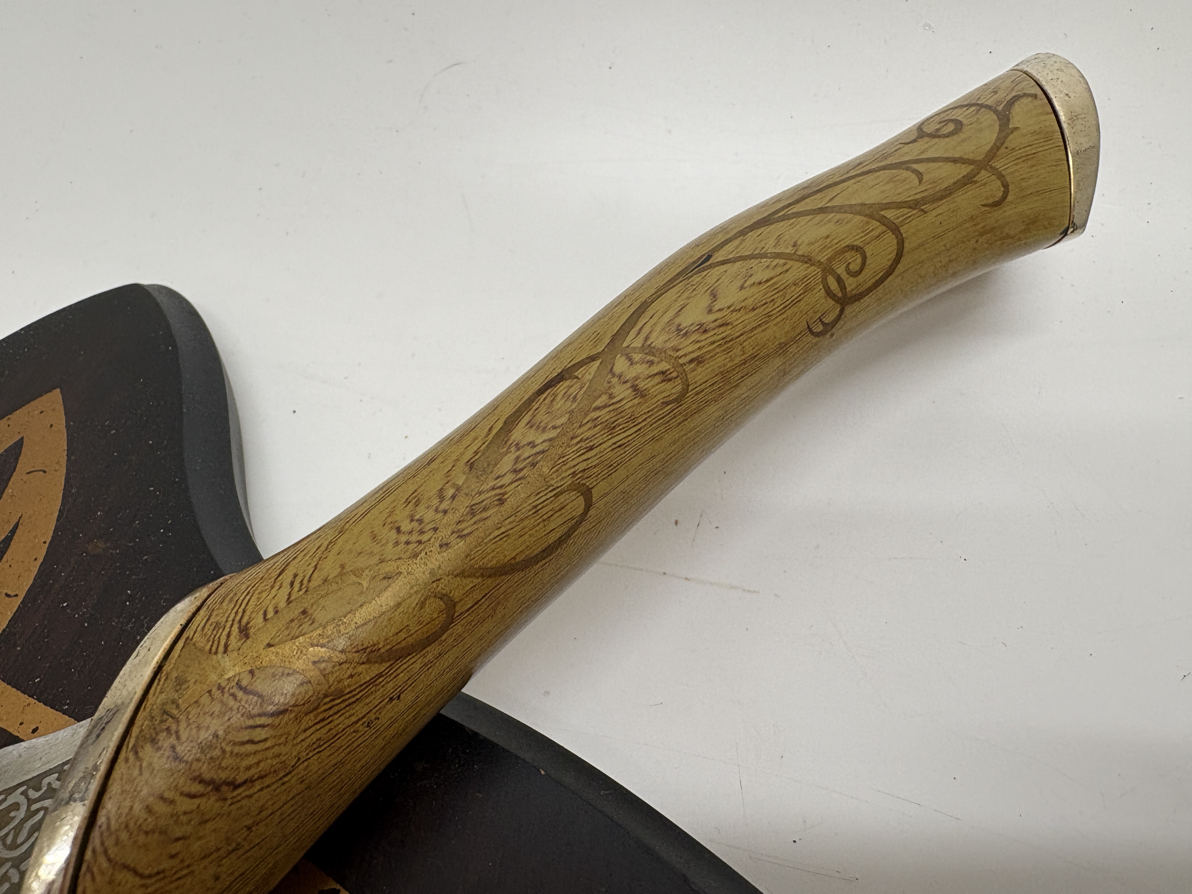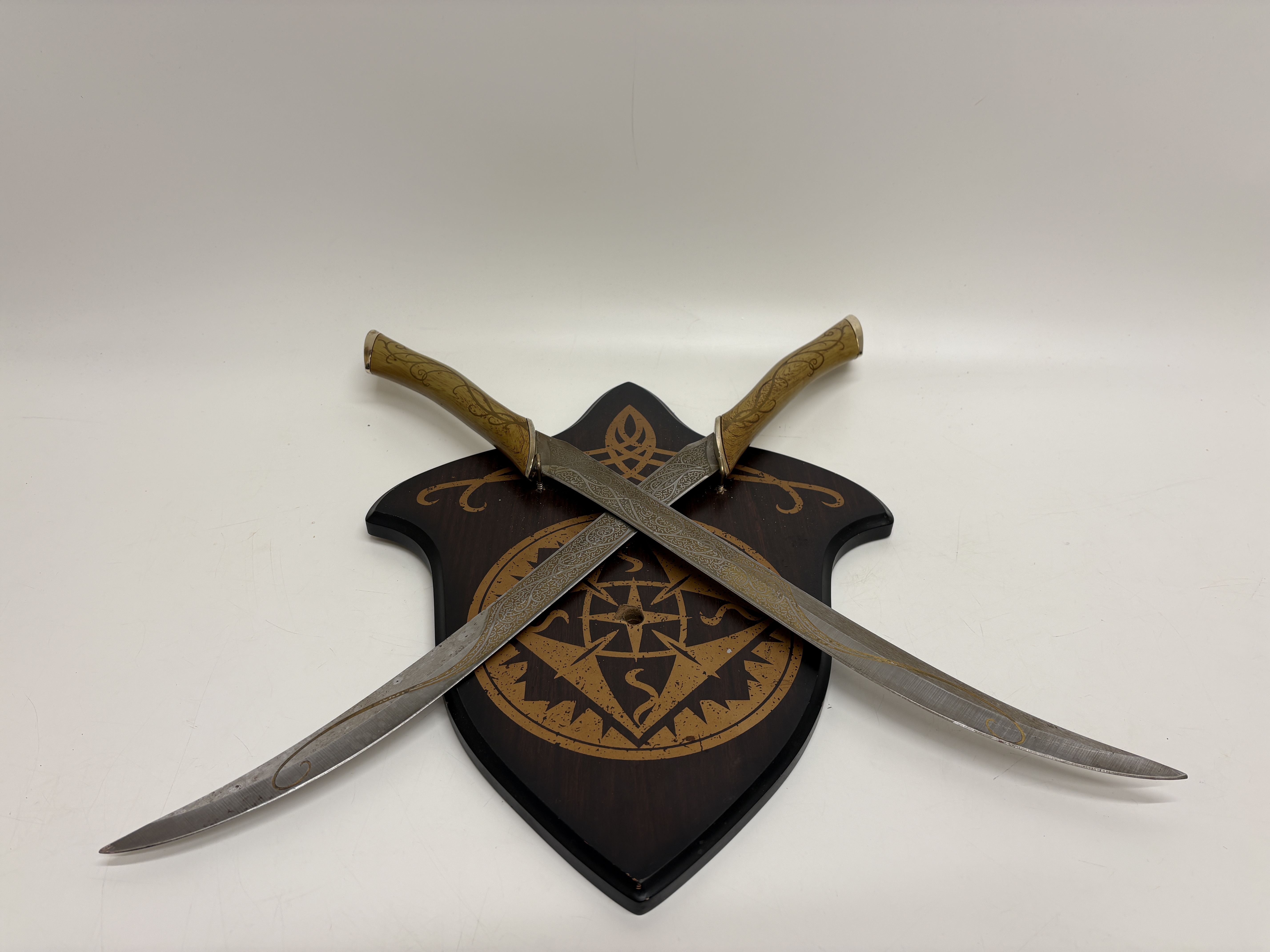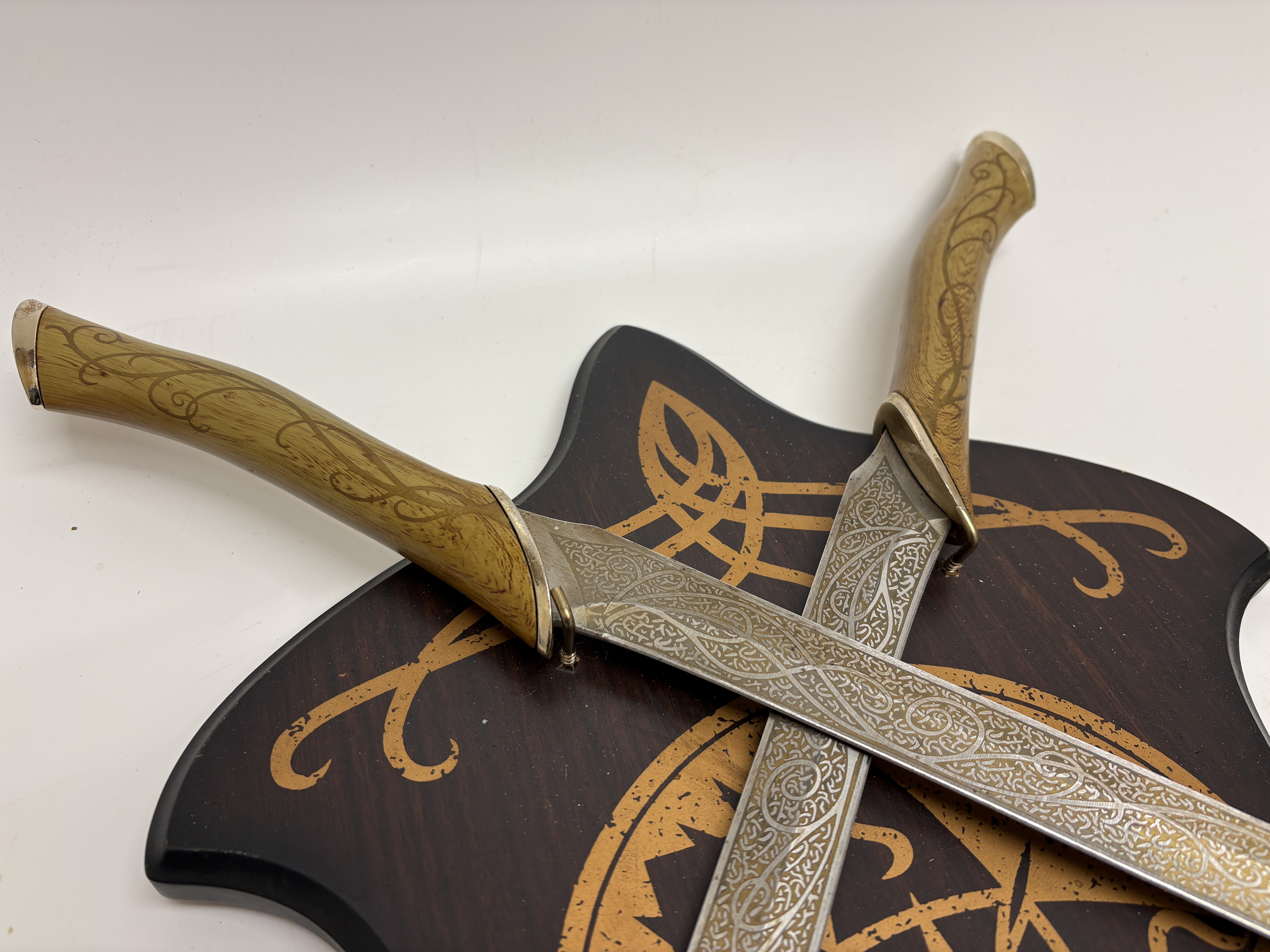 A pair of modern licensed prop replicas of the Fighting Knives of Legolas Greenleaf, as featured in The Lord of the Rings film franchise. These blades represent the specialised weaponry of the Elven forces of Mirkwood. Manufactured by United Cutlery, the knives feature curved stainless steel blades embellished with intricate acid-etched vine and floral motifs extending from the hilt along the spine. The contoured handles are finished in a light oak-coloured composite material, detailed with matching etched patterns and secured with gold-toned metal guards and pommels. The set is presented on a dark-finished wooden display plaque, screen-printed with tan Elven iconography including a central sunburst motif and scrollwork. These items are highly sought after by collectors of modern cinematic militaria and fantasy arms, representing the high-quality craftsmanship of licensed film memorabilia from the early 21st century. Knife length approximately 56 cm each; Plaque dimensions approximately 32 cm x 40 cm.