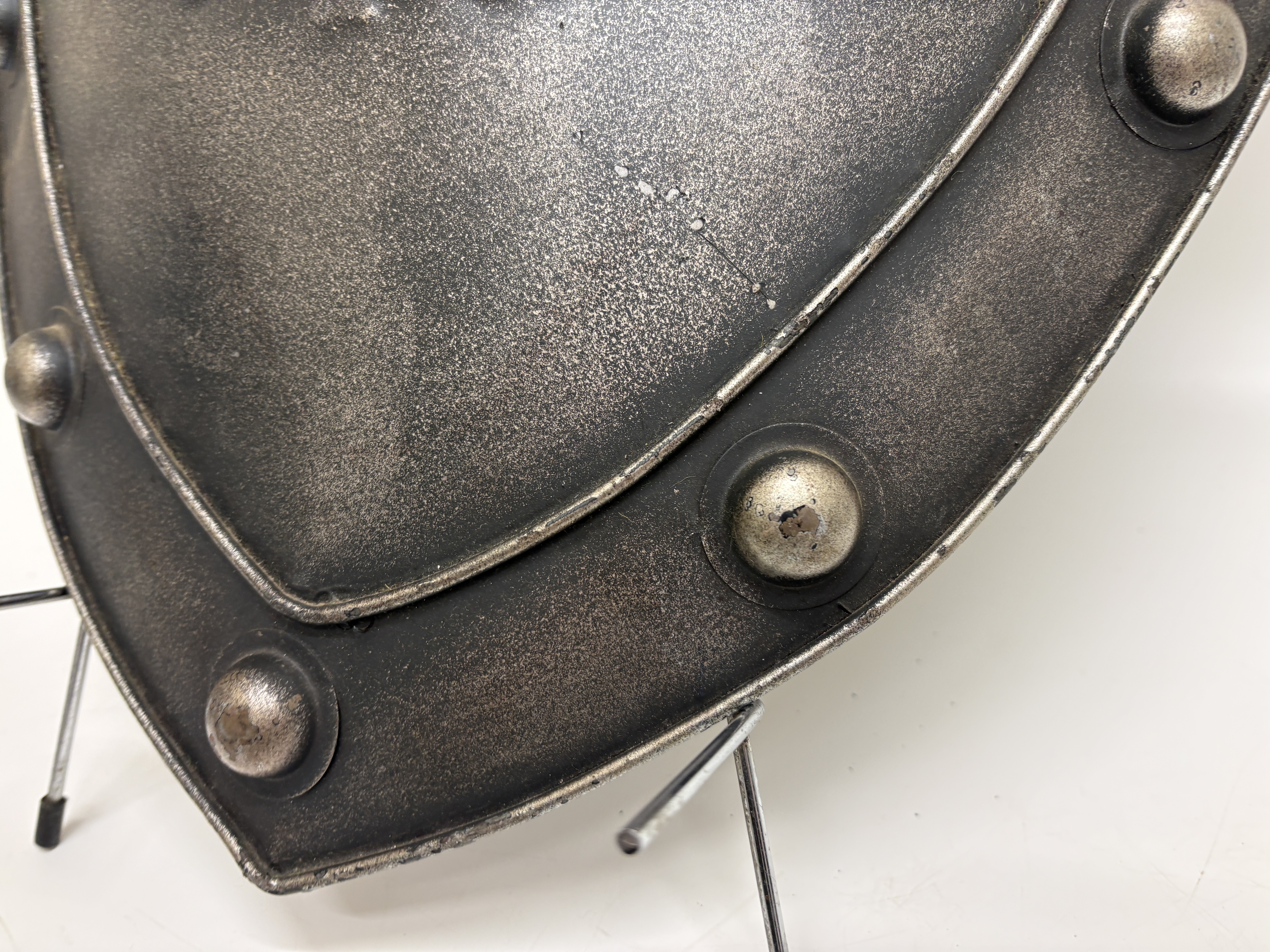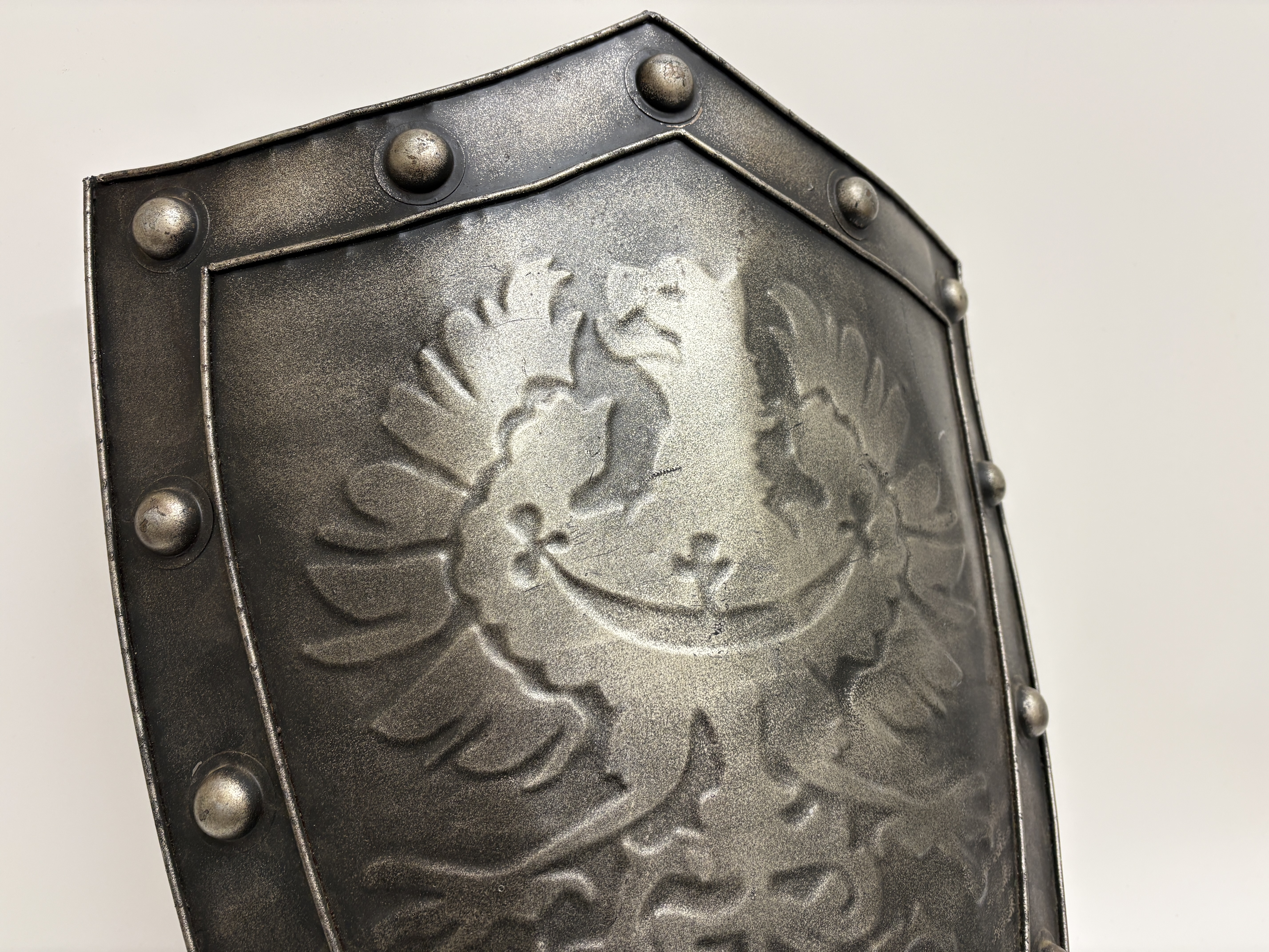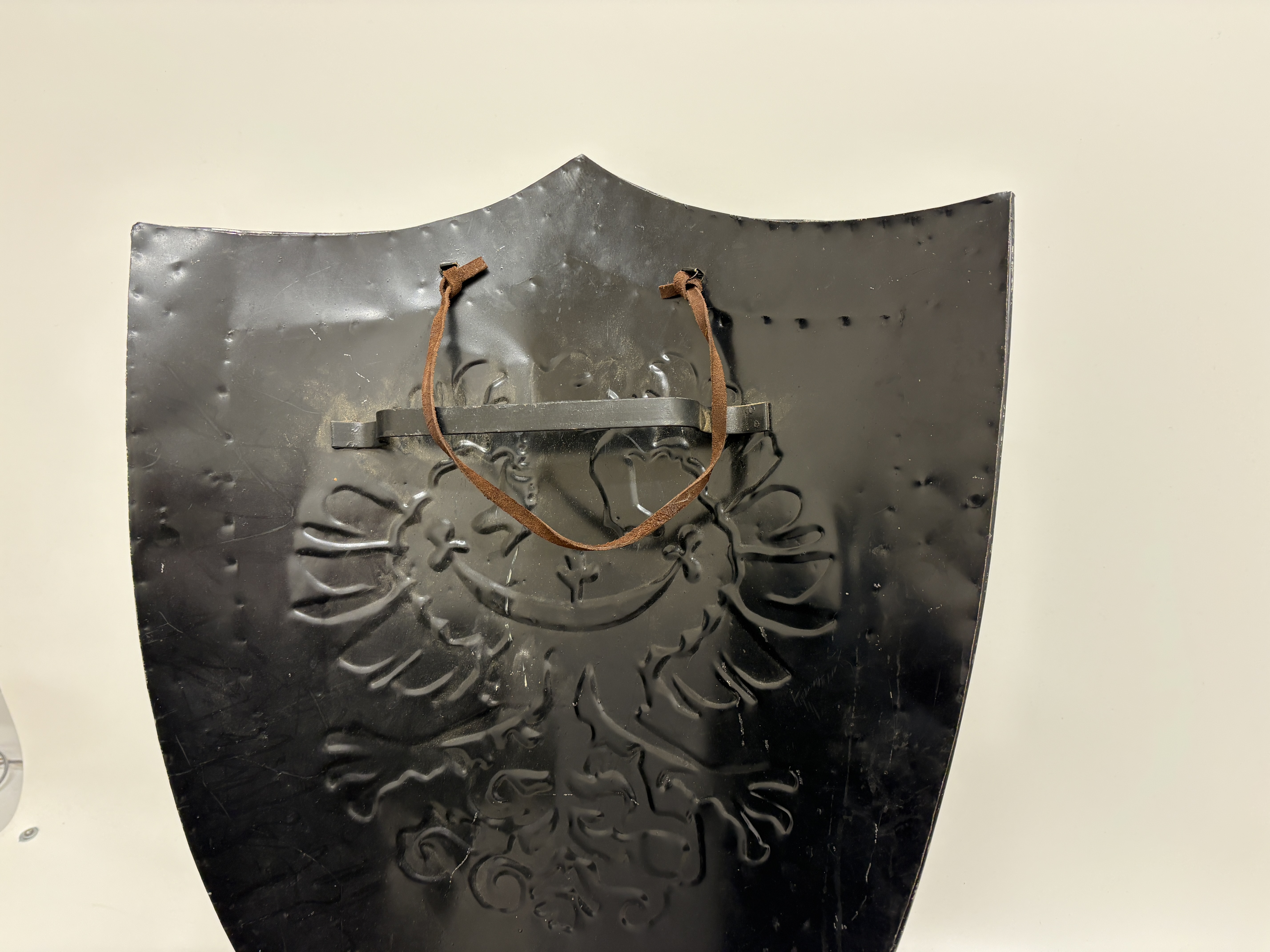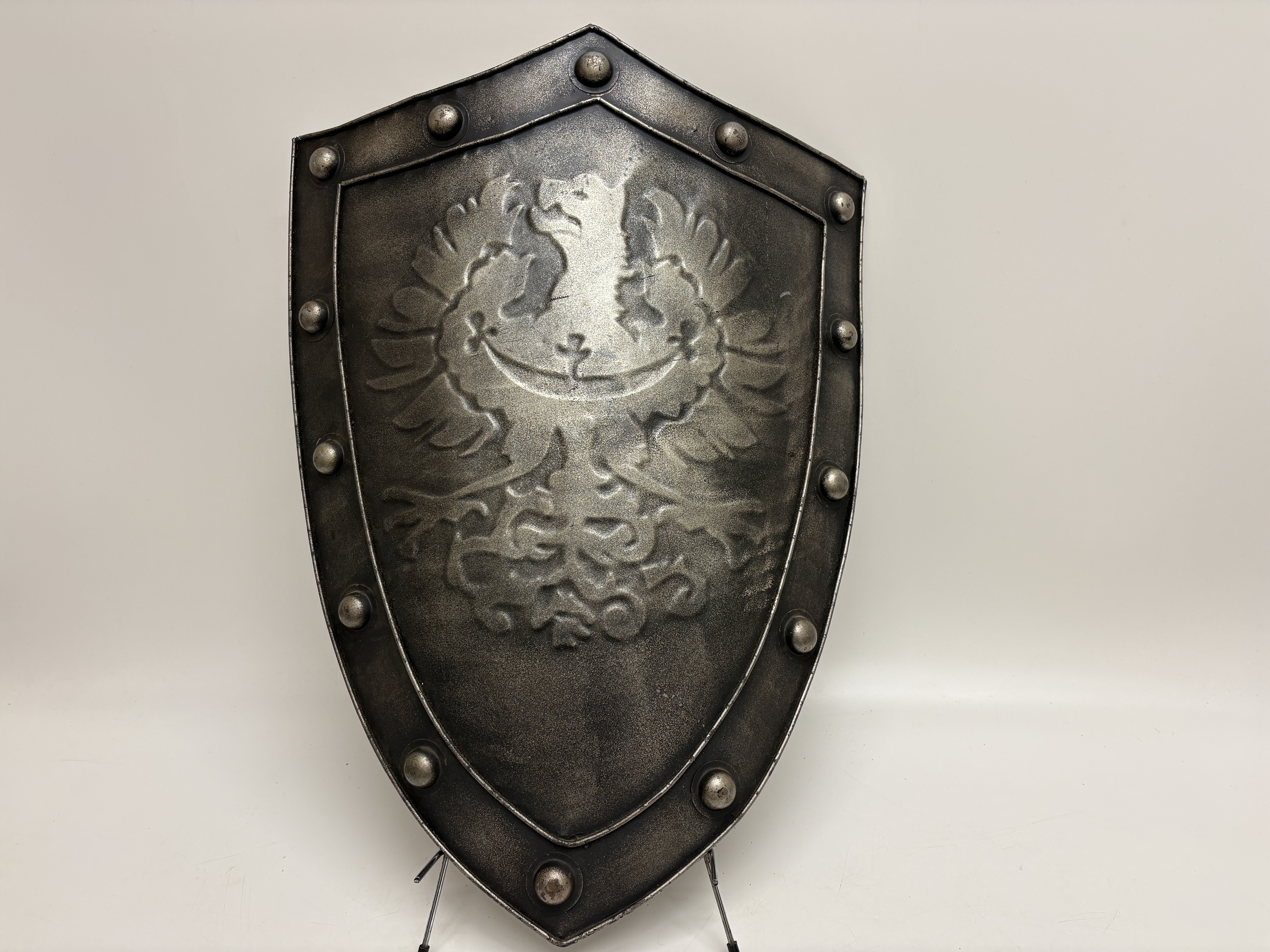 A contemporary decorative heater-style shield of late 20th-century manufacture, designed for wall display or theatrical use. The shield is constructed from a single sheet of metal and features an embossed central design of the Silesian eagle, distinguished by the crescent and cross across its breast. This heraldic device was historically associated with the Duchy of Silesia and later the Prussian Province of Silesia during the Kaiserreich era. The piece is finished in a faux-antique silver and blackened style, bordered by a raised frame secured with large, decorative round-head rivets. The reverse is coated in a matte black paint and is fitted with a fixed horizontal metal bar handle and a cord for mounting.