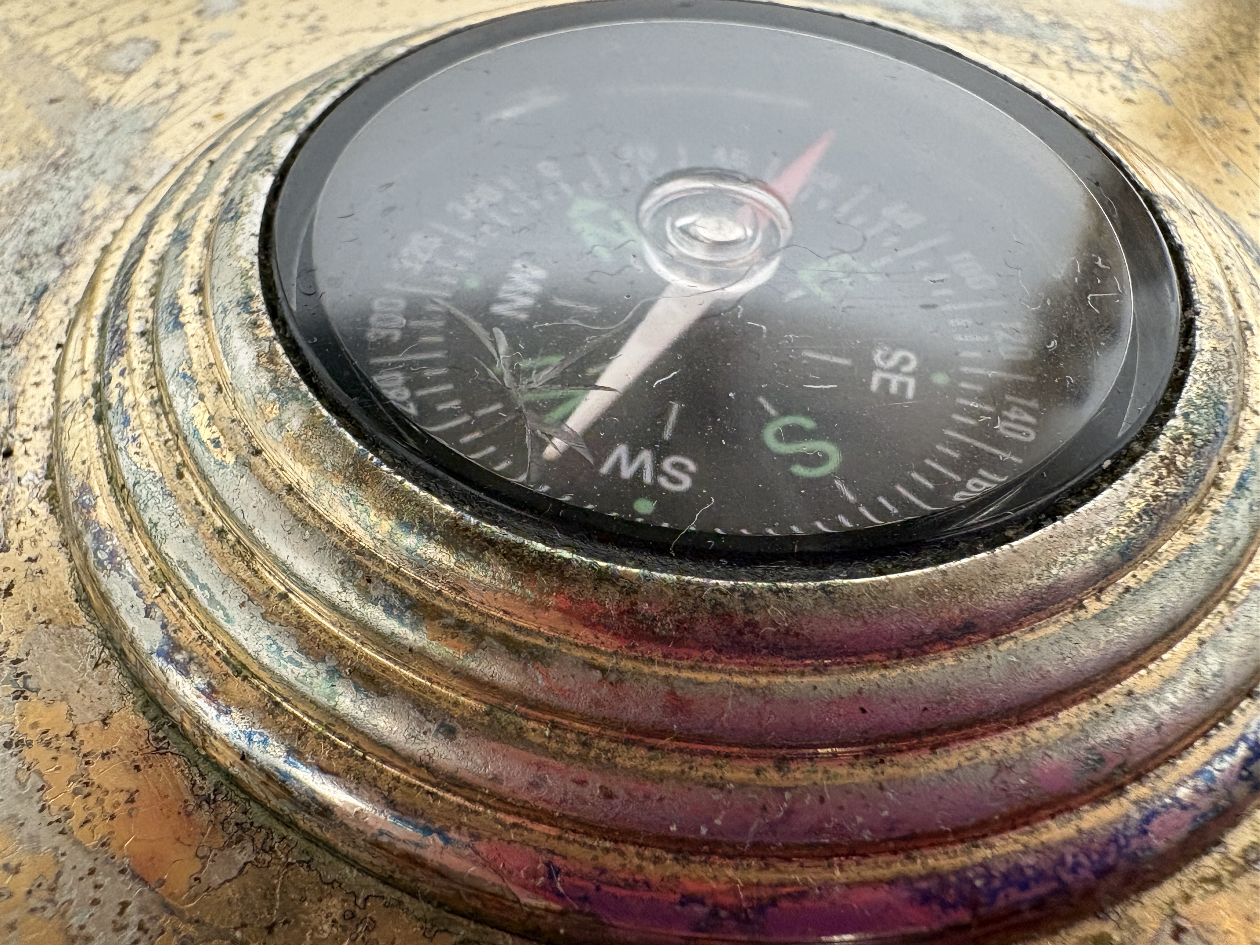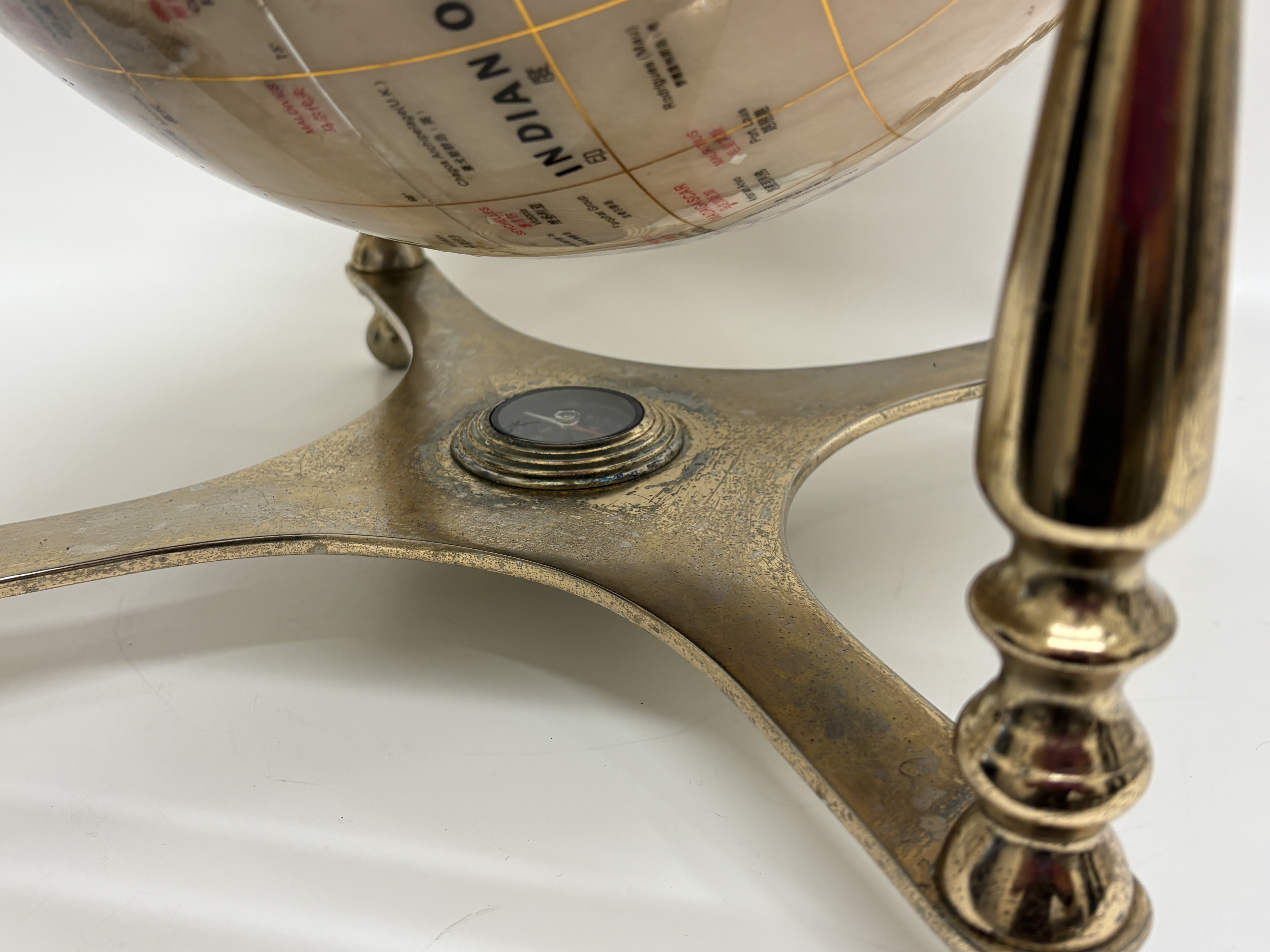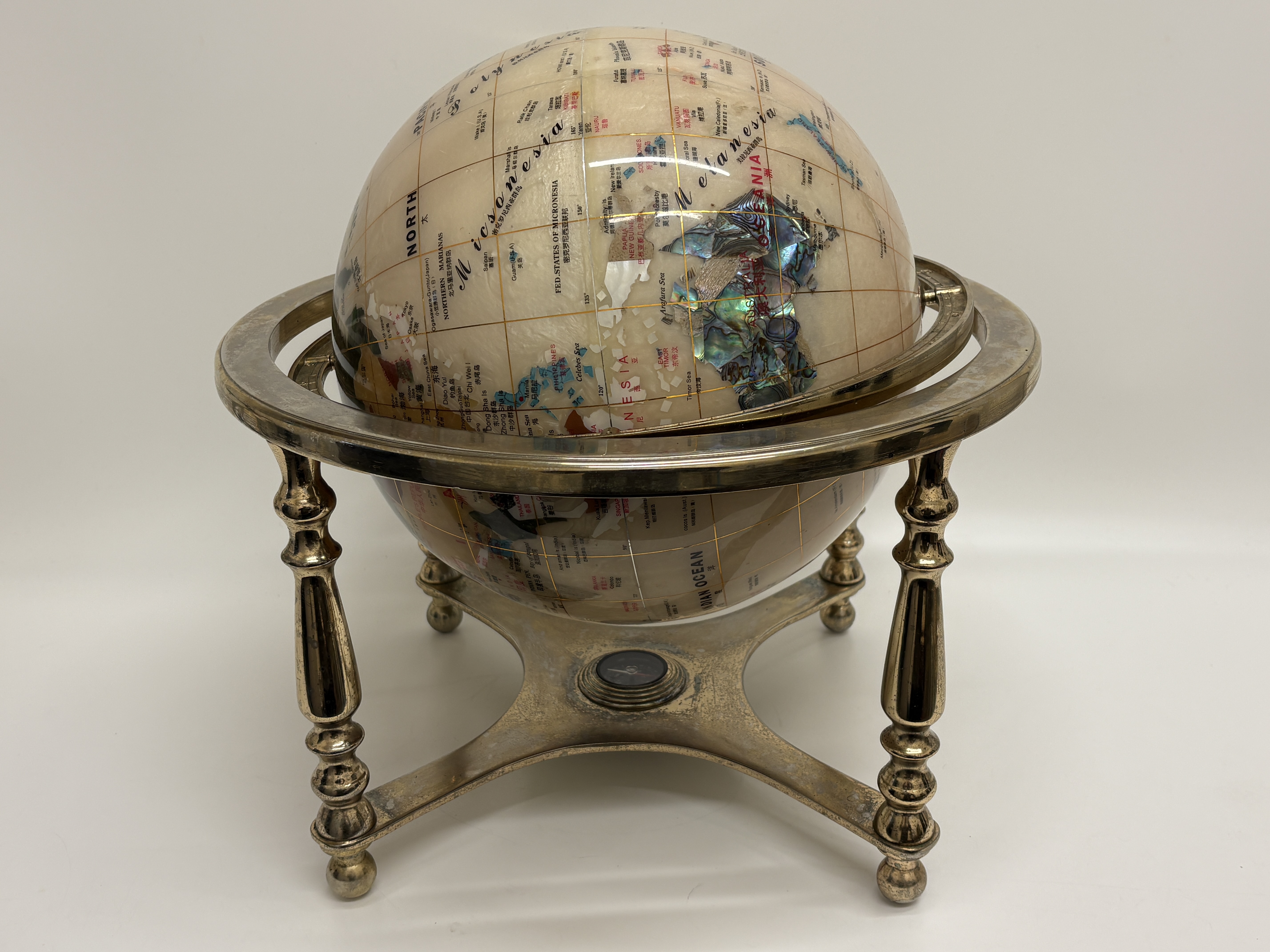 A contemporary desktop globe by Unique Art featuring a cream-coloured sphere with landmasses depicted in various inlaid semi-precious stones and iridescent abalone shell. The globe is mounted within a brass-finished metal gimbal stand comprising a meridian ring and a four-legged base. An integrated compass is set into the centre of the base. Geographic labels are printed in both English and Chinese characters throughout the map surface.