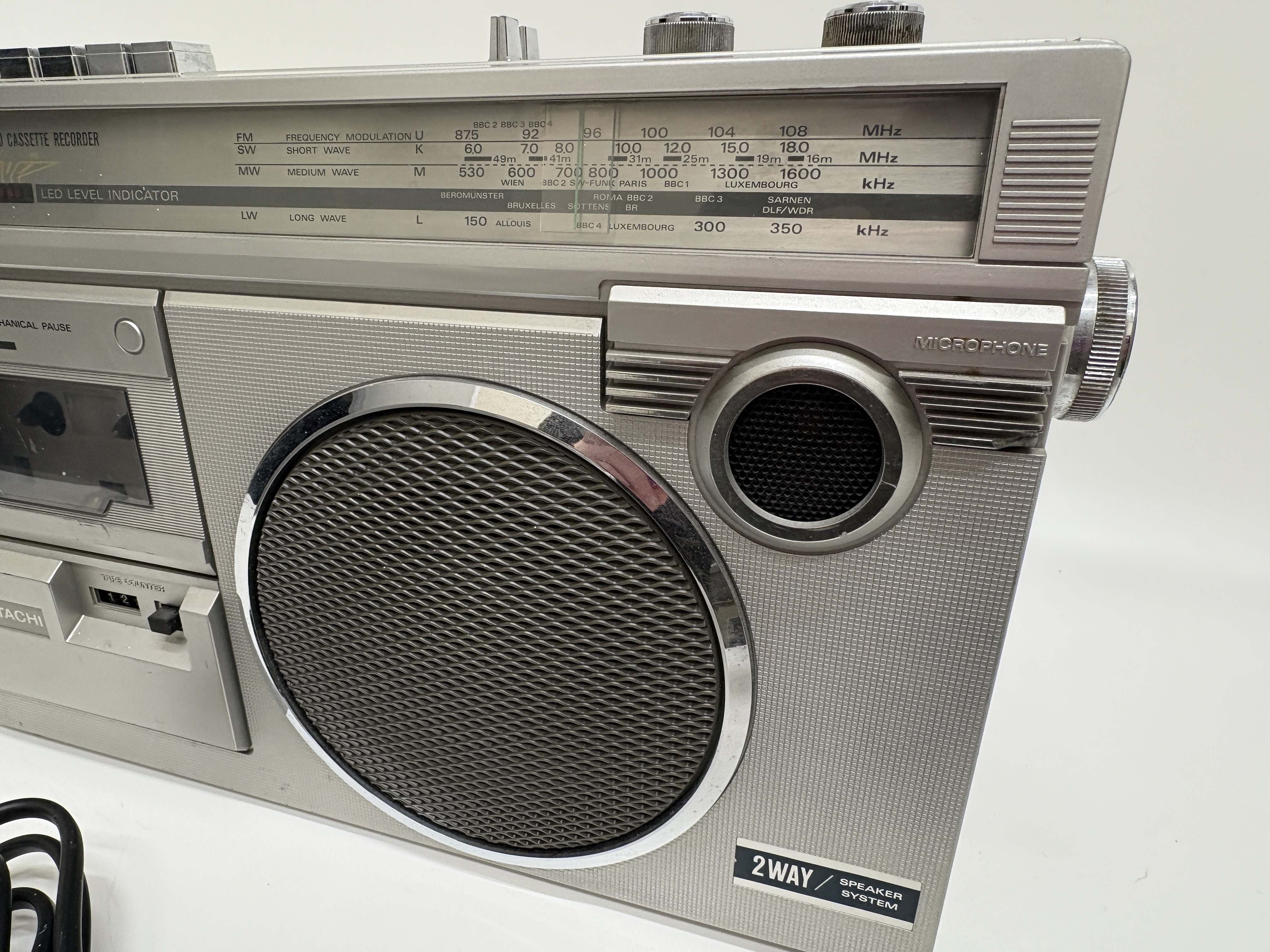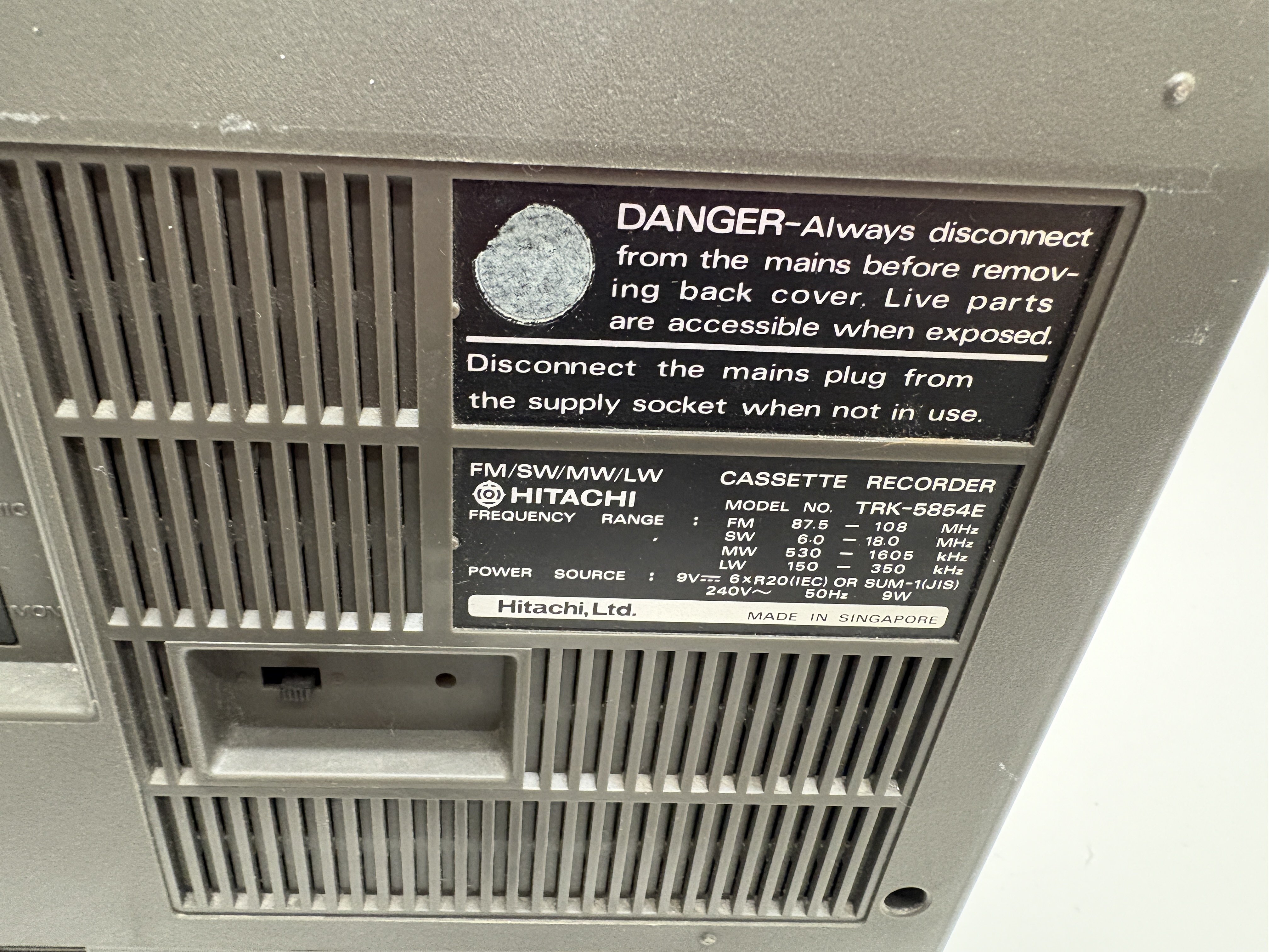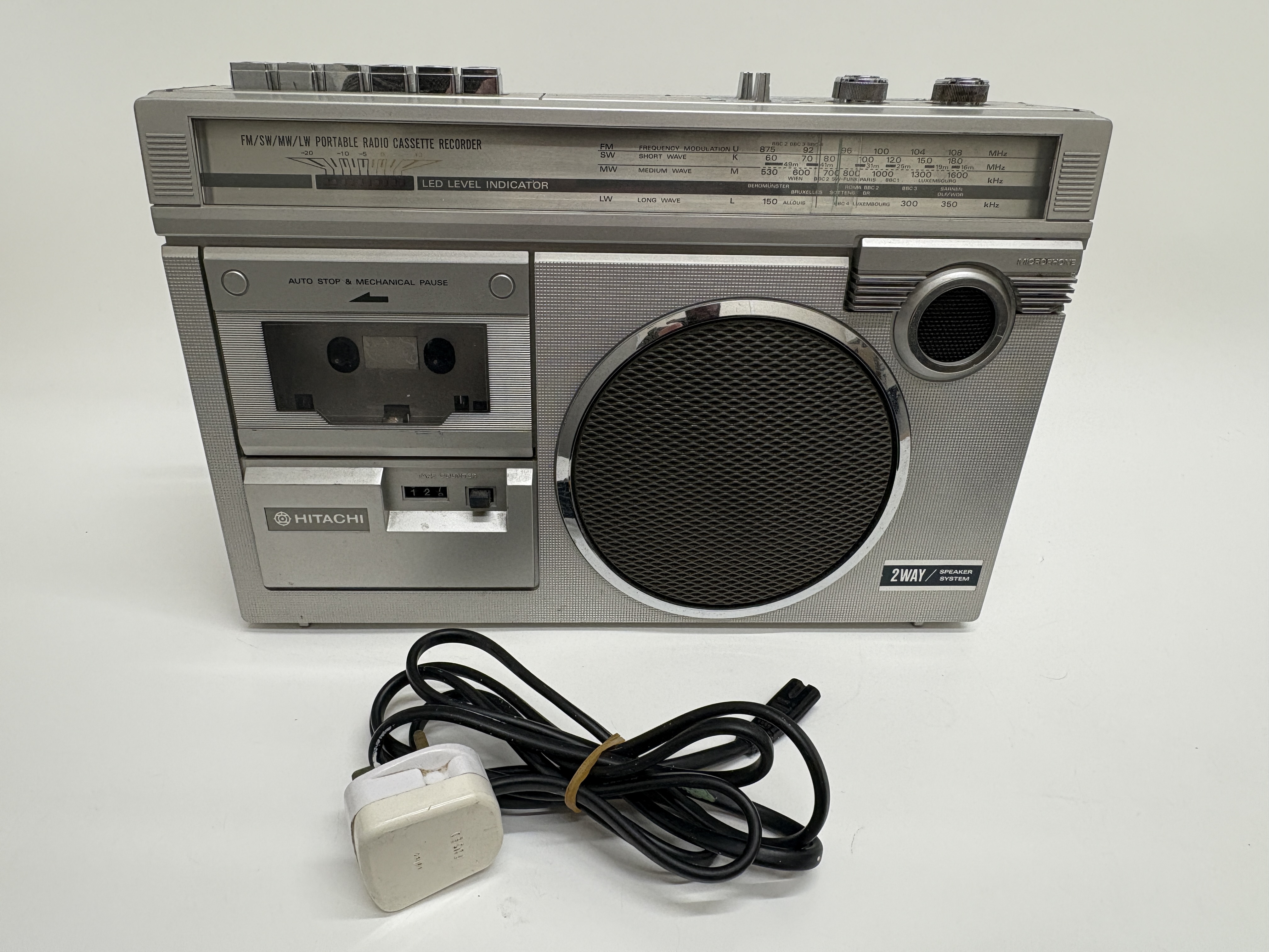 A Hitachi model TRK-5854E portable radio cassette recorder, manufactured in Singapore. This silver-toned unit features a four-band radio covering FM, SW, MW, and LW frequencies, with an analogue tuning dial displaying international station names. The front-loading cassette deck includes a mechanical tape counter, auto-stop functionality, and mechanical pause. The device is designed with a 2-way speaker system protected by chrome-accented grilles, an integrated microphone, and a multi-segment LED level indicator. Top-mounted controls comprise chrome-finished playback buttons, sliding function and band selectors, and rotary knobs for volume and tone. The unit is equipped with a retractable telescopic antenna and a top carrying handle. It is accompanied by a detachable black power cable fitted with a UK three-pin plug. The rear identification plate confirms the model number and technical specifications, including a power source of 240V or six R20 batteries.