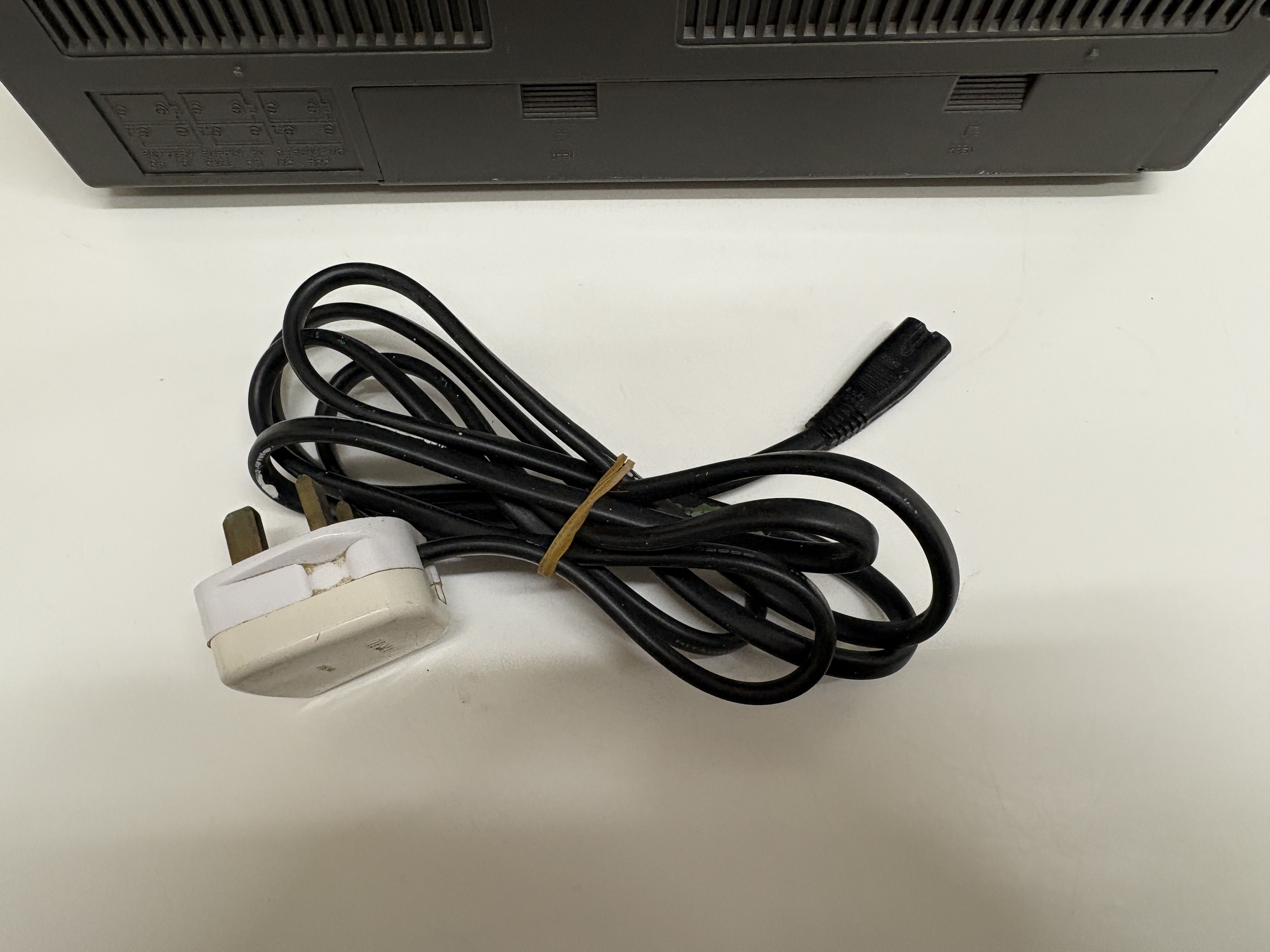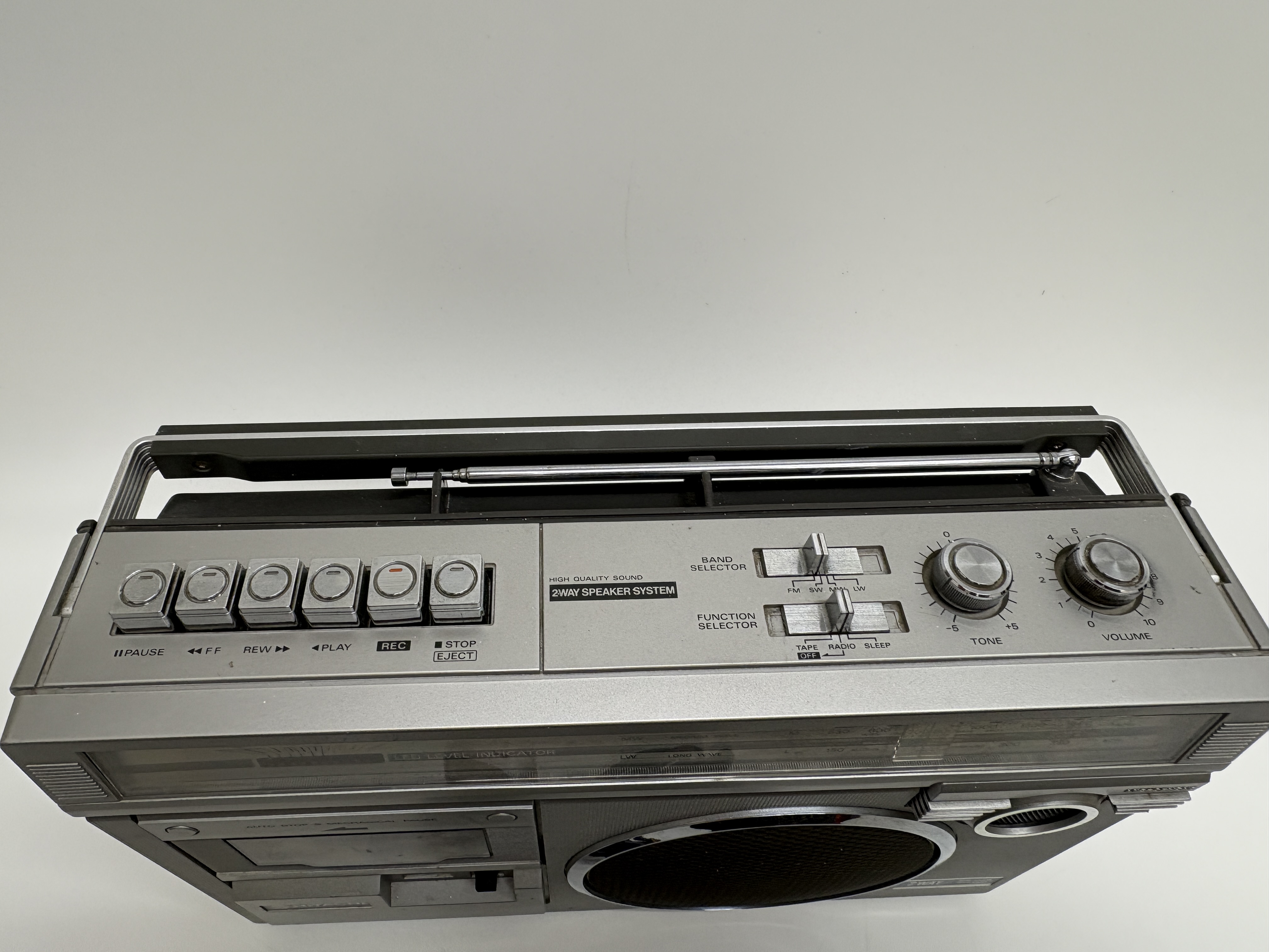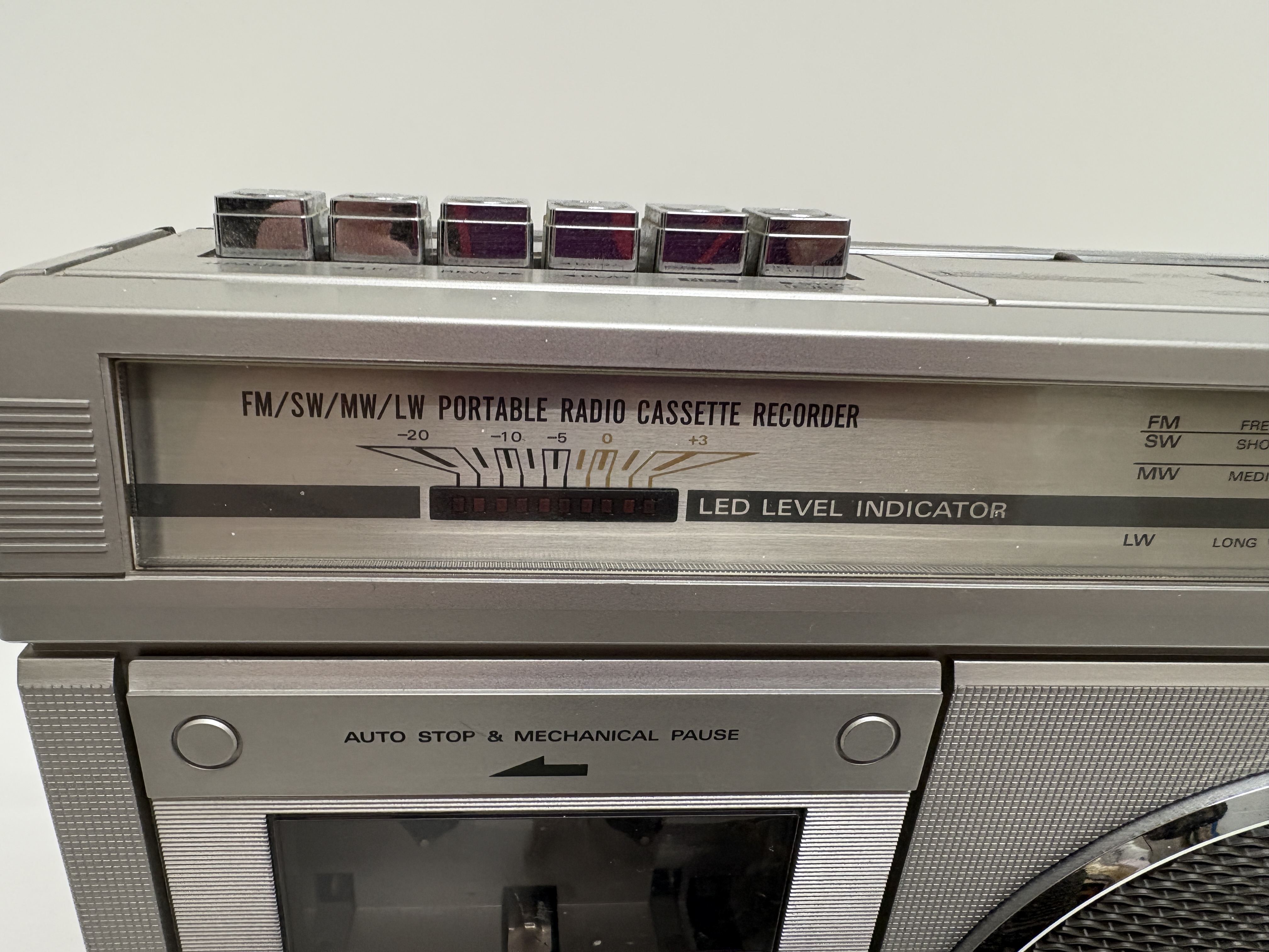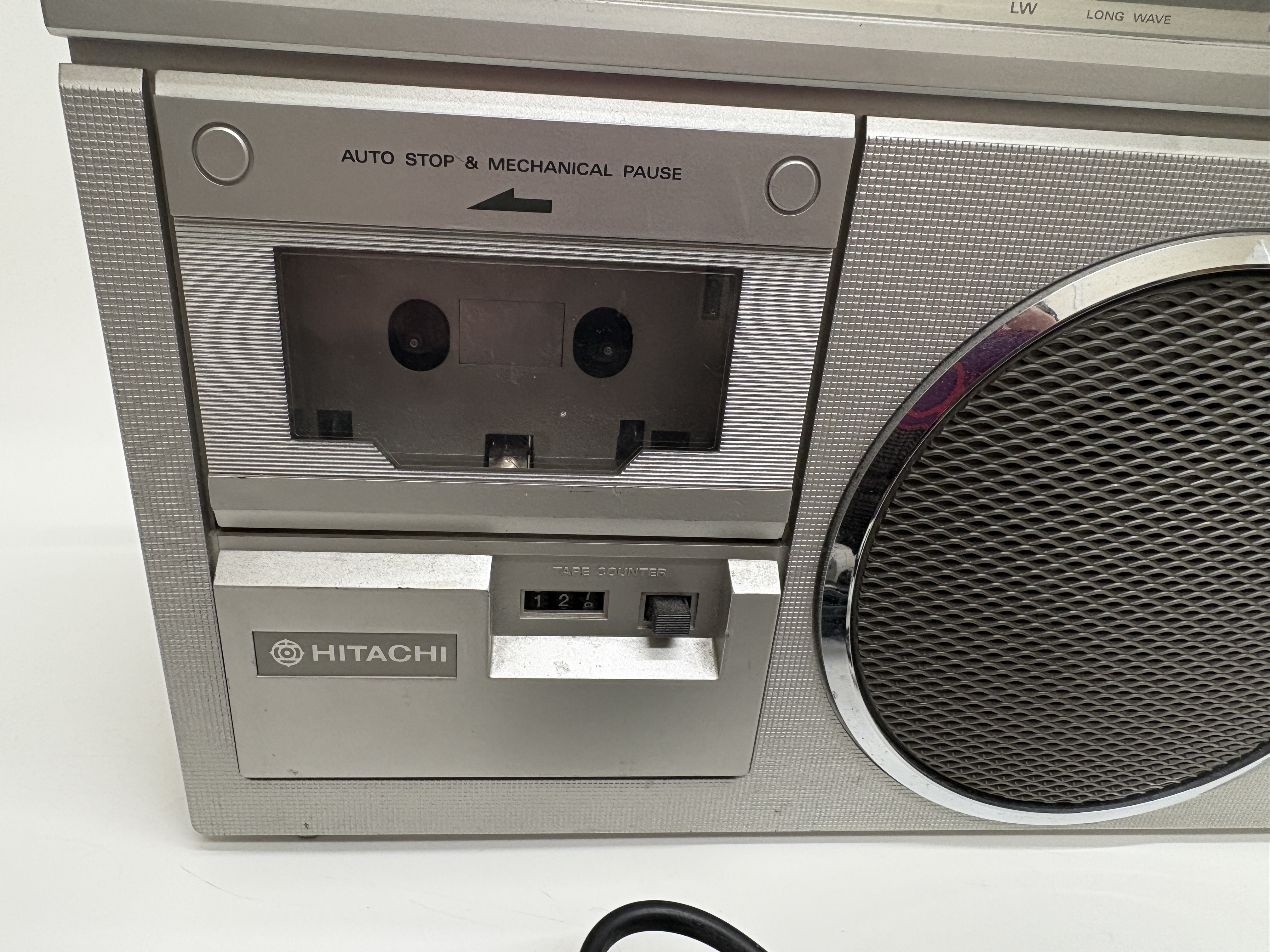 A Hitachi model TRK-5854E portable radio cassette recorder, manufactured in Singapore. This silver-toned unit features a four-band radio covering FM, SW, MW, and LW frequencies, with an analogue tuning dial displaying international station names. The front-loading cassette deck includes a mechanical tape counter, auto-stop functionality, and mechanical pause. The device is designed with a 2-way speaker system protected by chrome-accented grilles, an integrated microphone, and a multi-segment LED level indicator. Top-mounted controls comprise chrome-finished playback buttons, sliding function and band selectors, and rotary knobs for volume and tone. The unit is equipped with a retractable telescopic antenna and a top carrying handle. It is accompanied by a detachable black power cable fitted with a UK three-pin plug. The rear identification plate confirms the model number and technical specifications, including a power source of 240V or six R20 batteries.