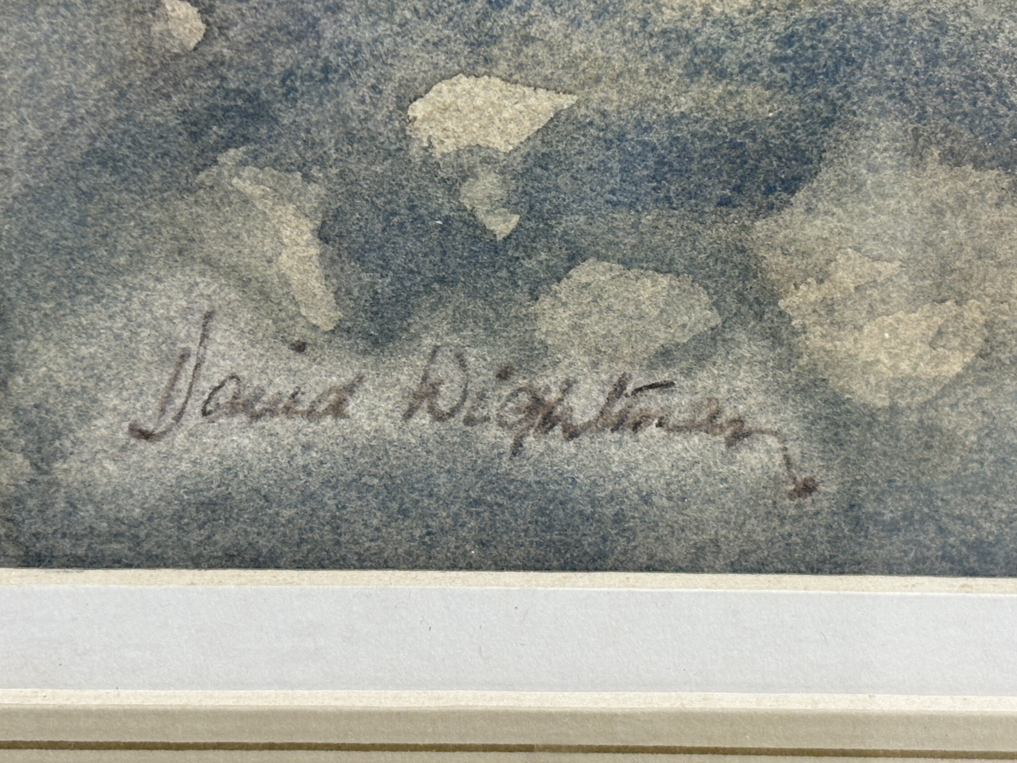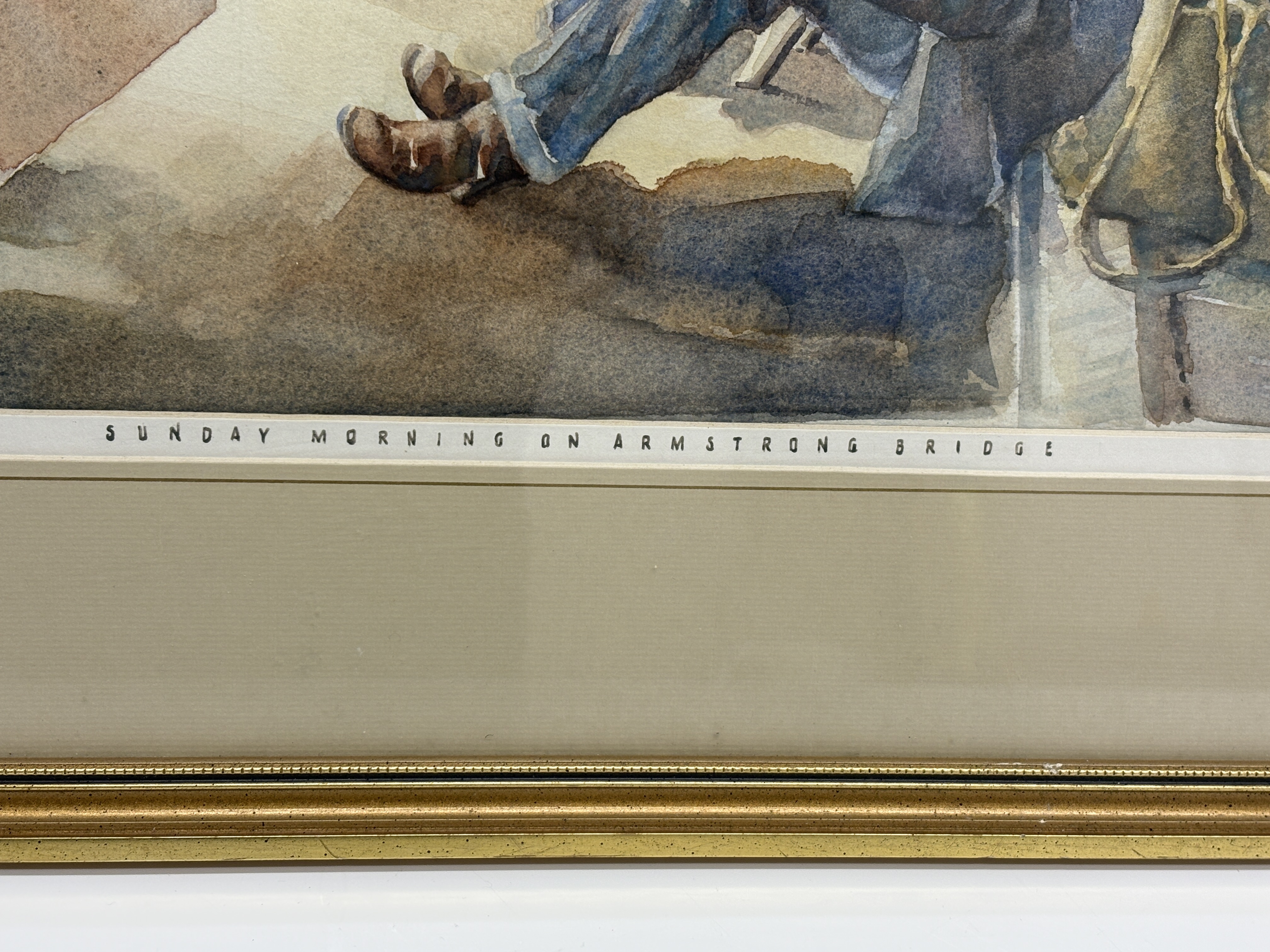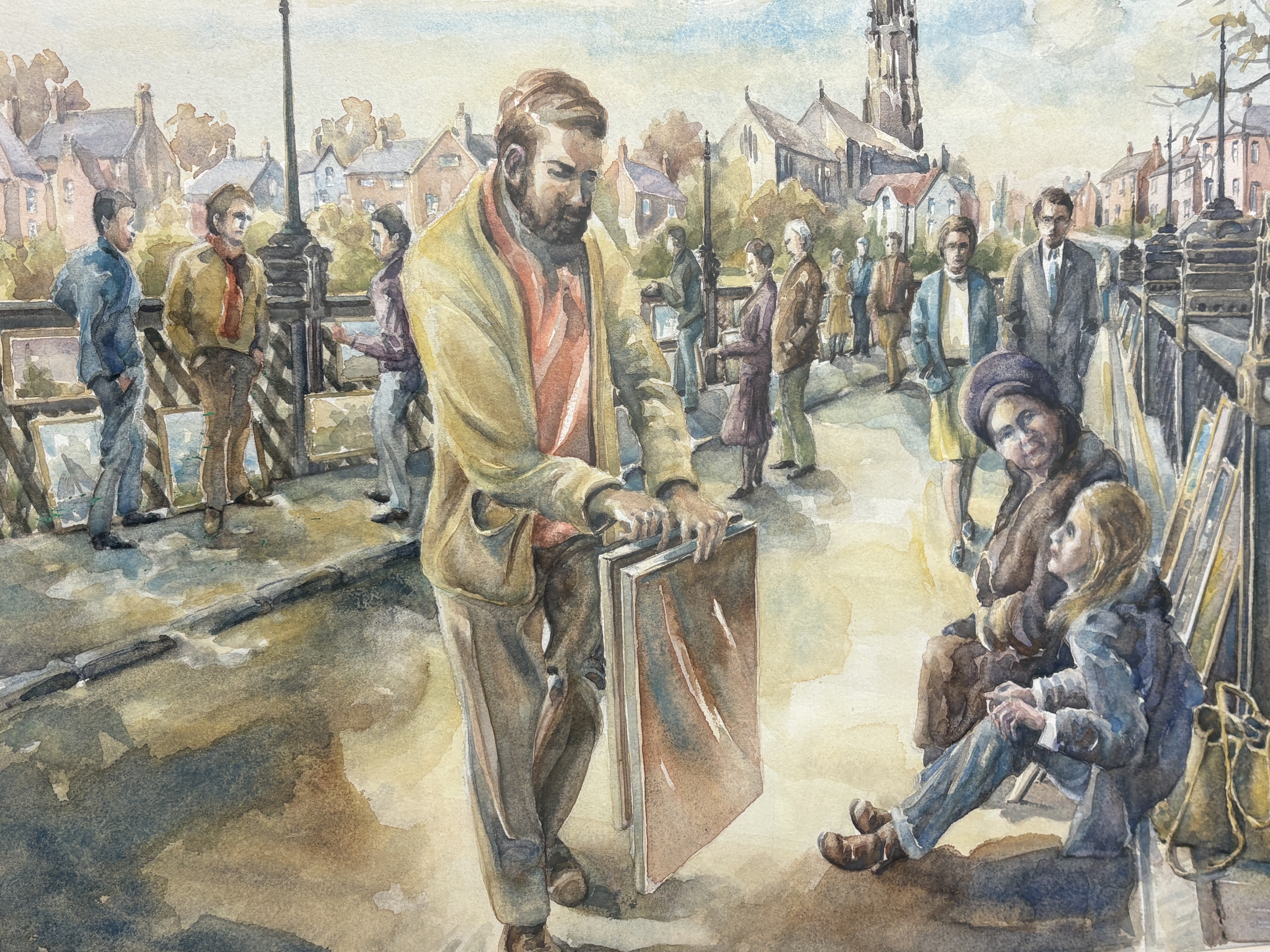 This framed watercolor painting on paper is titled Sunday Morning on Armstrong Bridge and is signed by the artist David Wightman in the lower left corner. The figurative composition depicts an outdoor art market on a bridge. The scene features a central bearded man in a yellow jacket handling artworks, with other figures browsing pieces displayed along the bridge railing. A church spire is visible in the background townscape. The title SUNDAY MORNING ON ARMSTRONG BRIDGE is printed in block capitals on the lower margin of the mount. The work is housed in a cream-coloured mat and a gold-toned frame.