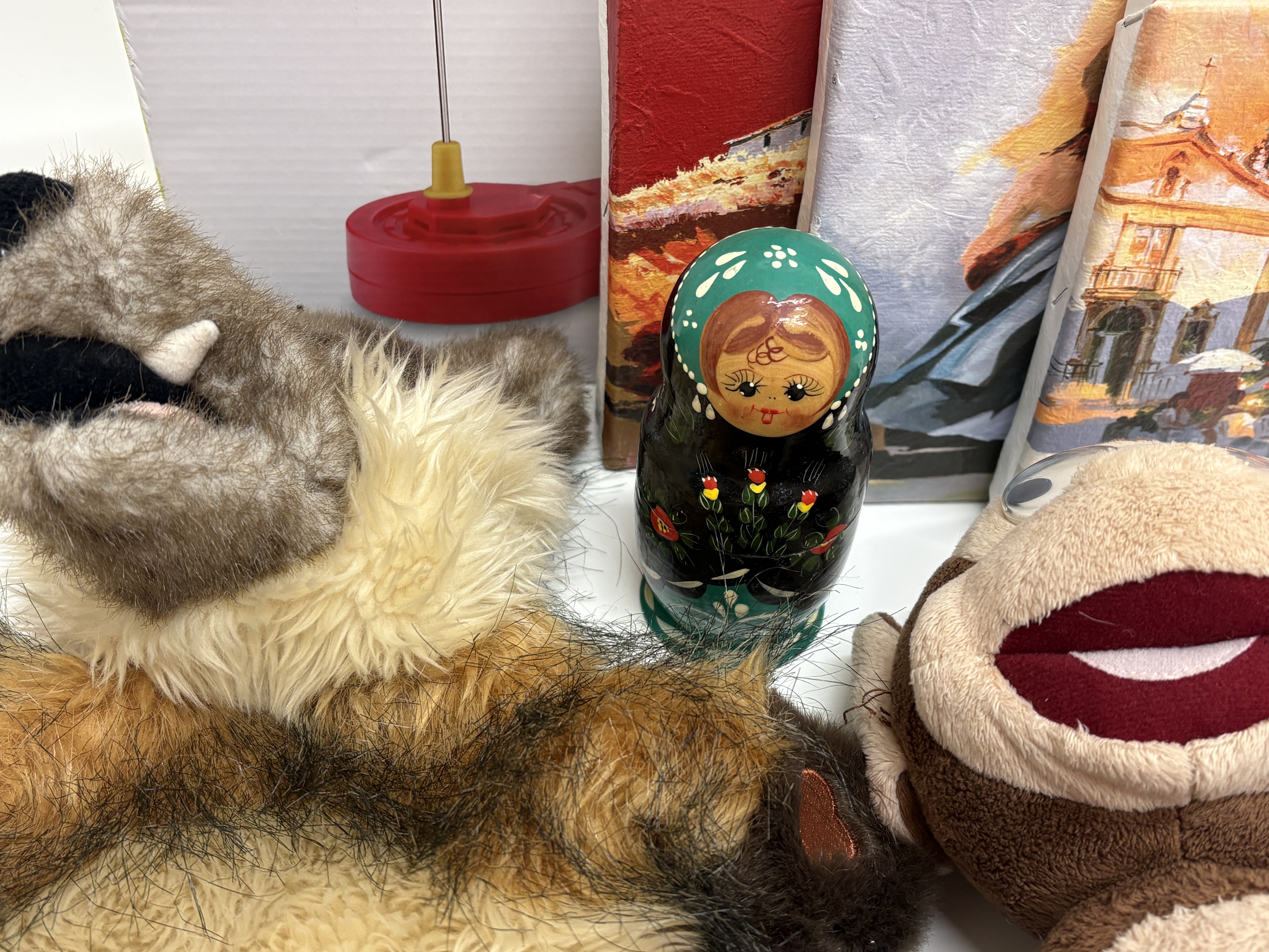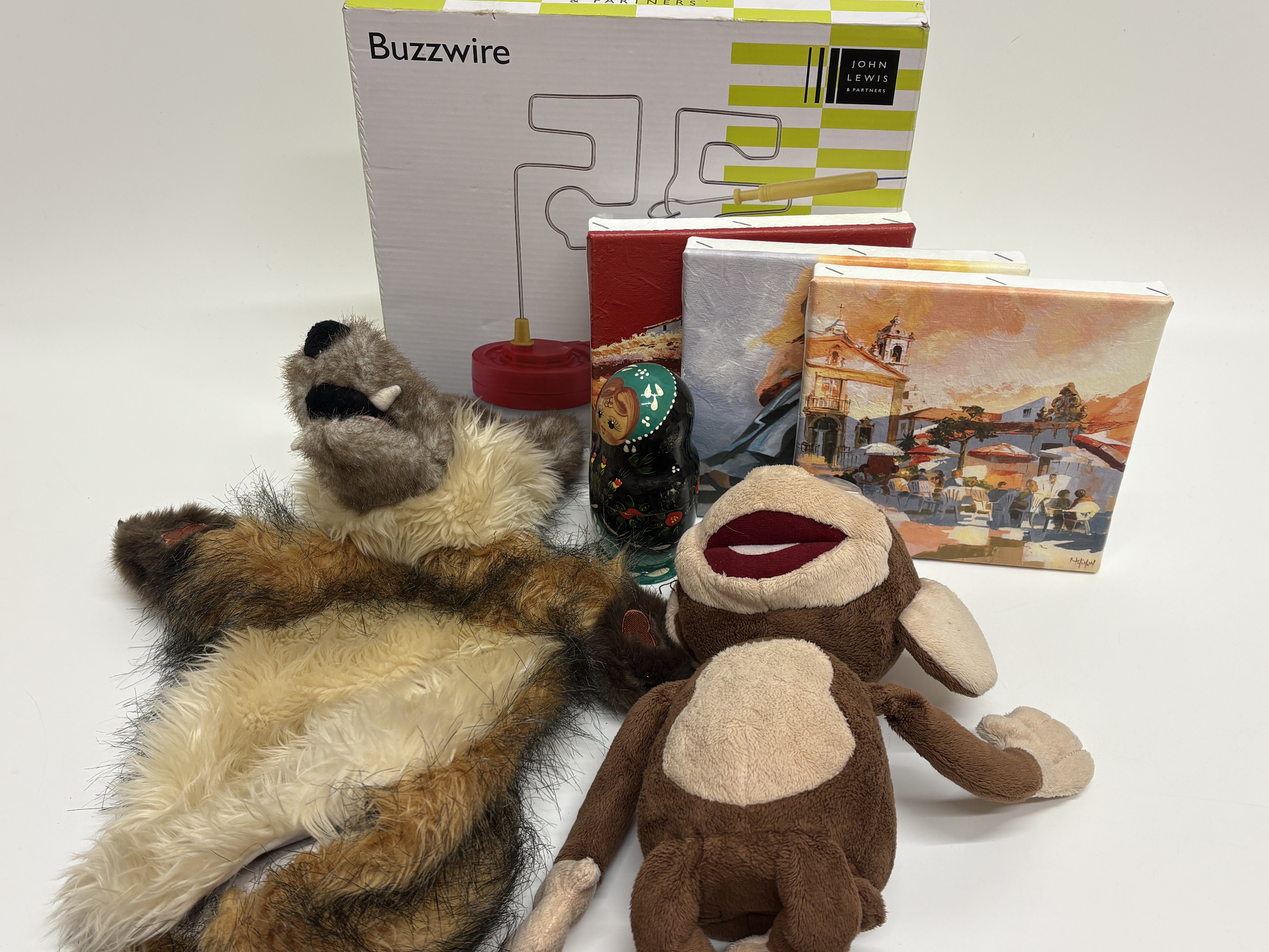 An assortment of items featuring a large multi-toned faux-fur wolf hand puppet by The Puppet Company, as indicated by the interior manufacturer label. The collection includes a boxed Buzzwire electronic game by John Lewis & Partners, several small unframed landscape paintings on canvas depicting European-style scenes, a brown plush monkey with oversized plastic eyes, and a single hand-painted wooden Matryoshka doll with a black and green floral design. The wolf puppet is constructed with long-pile synthetic fur in shades of grey, brown, and cream. The paintings are rendered in an impressionistic style on stretched canvases.