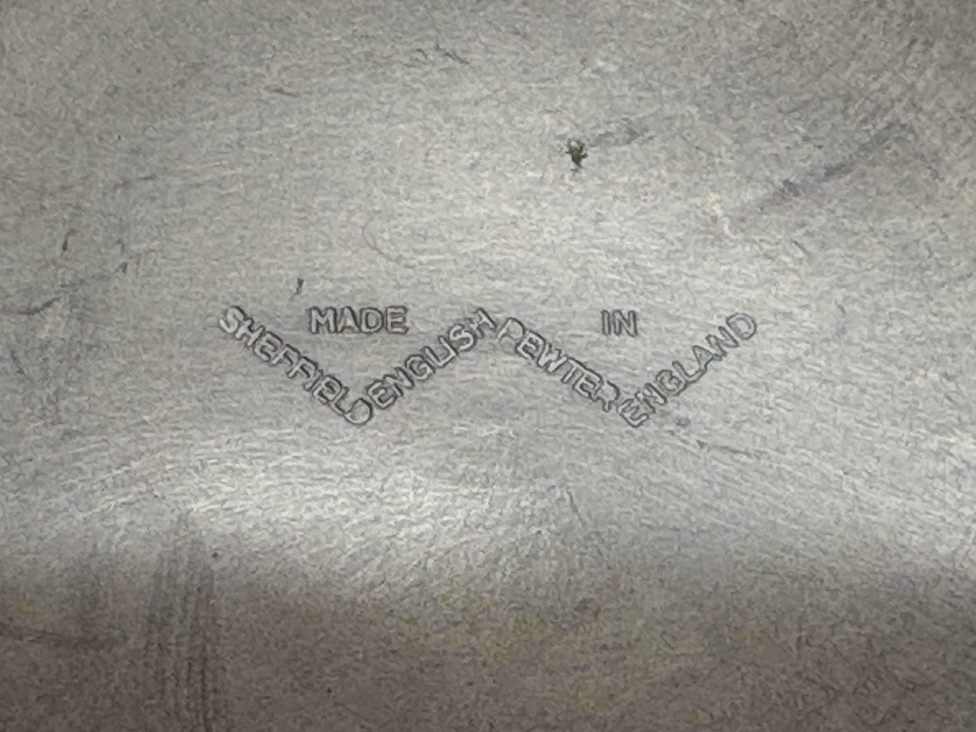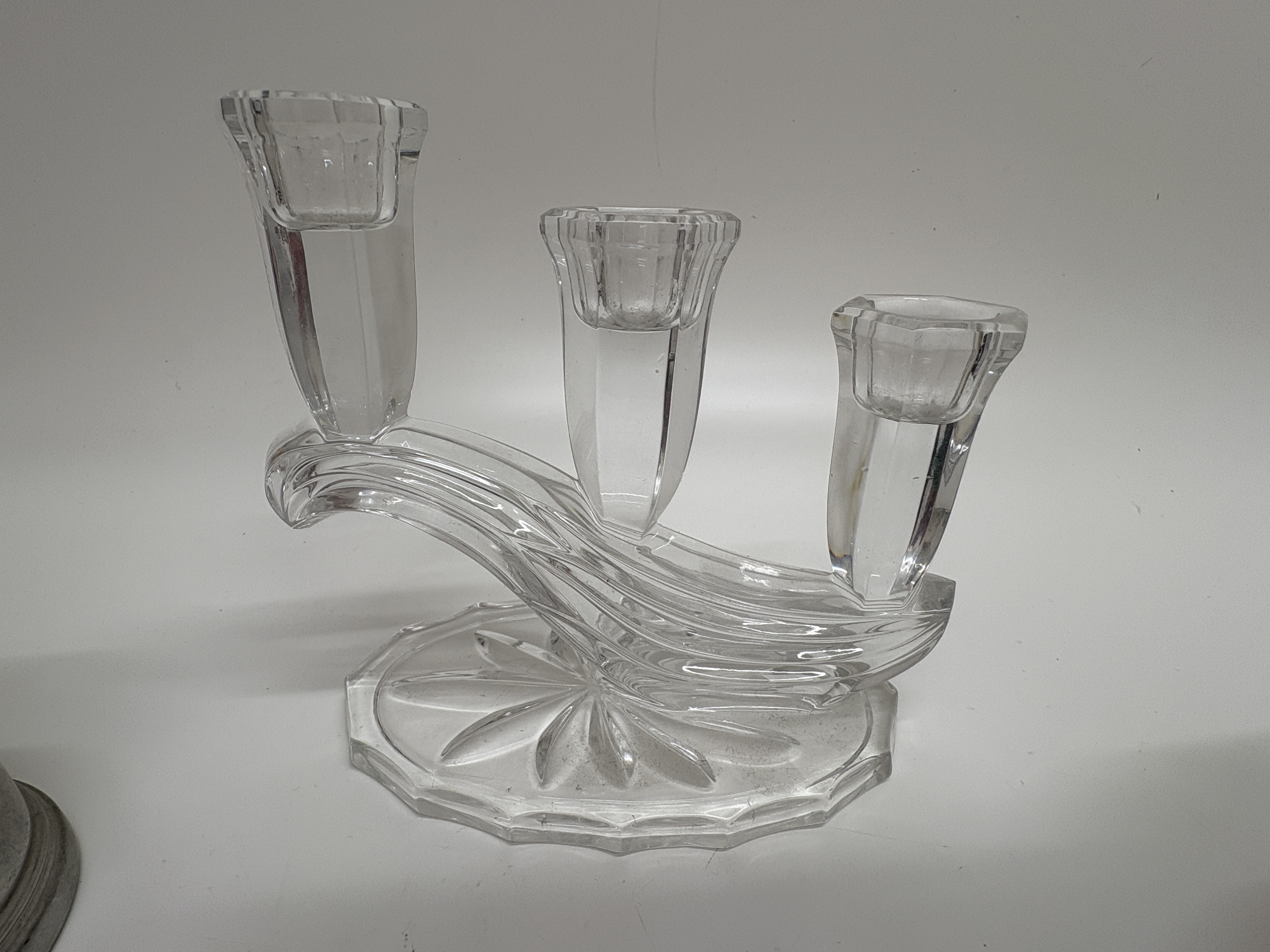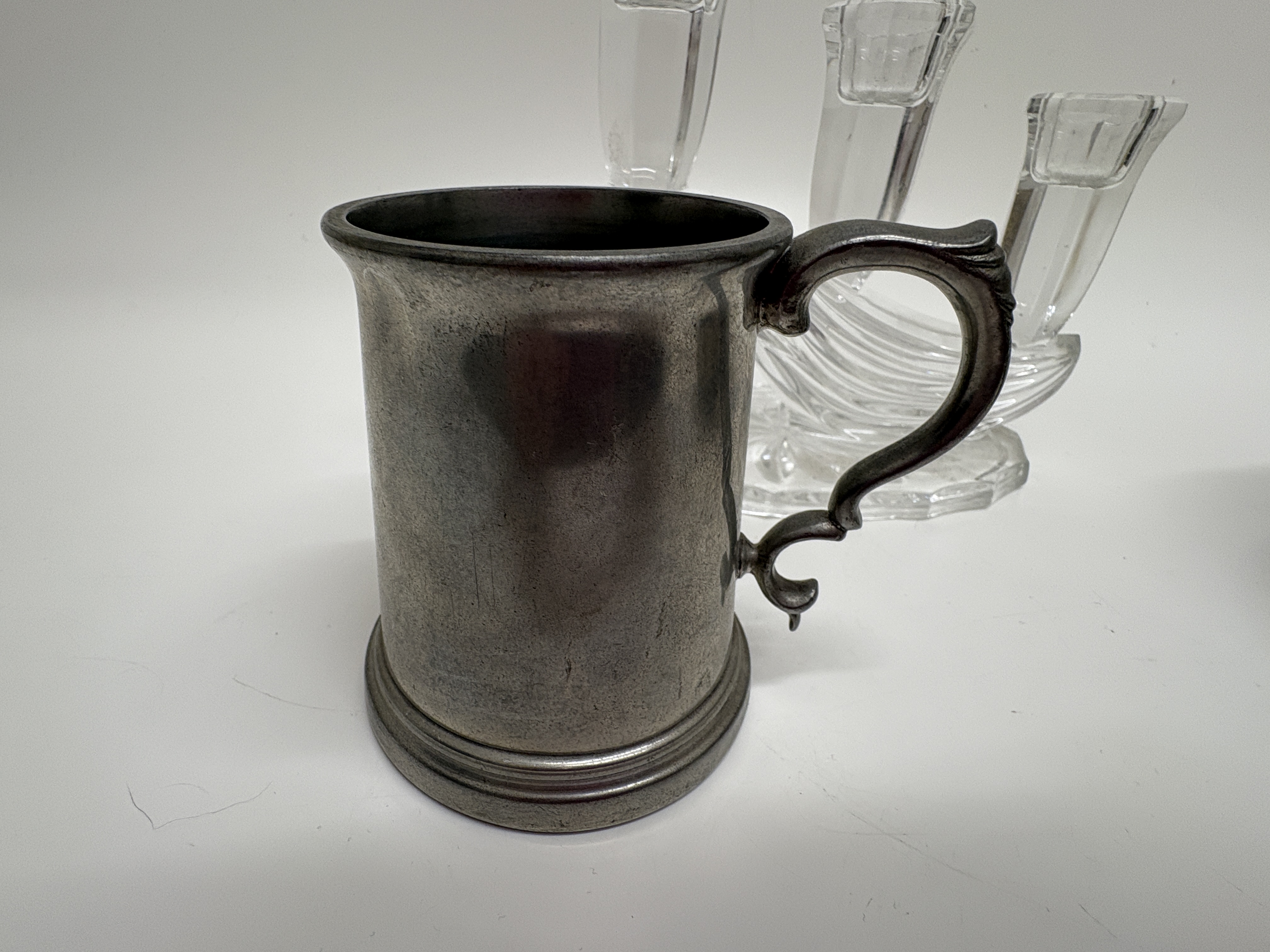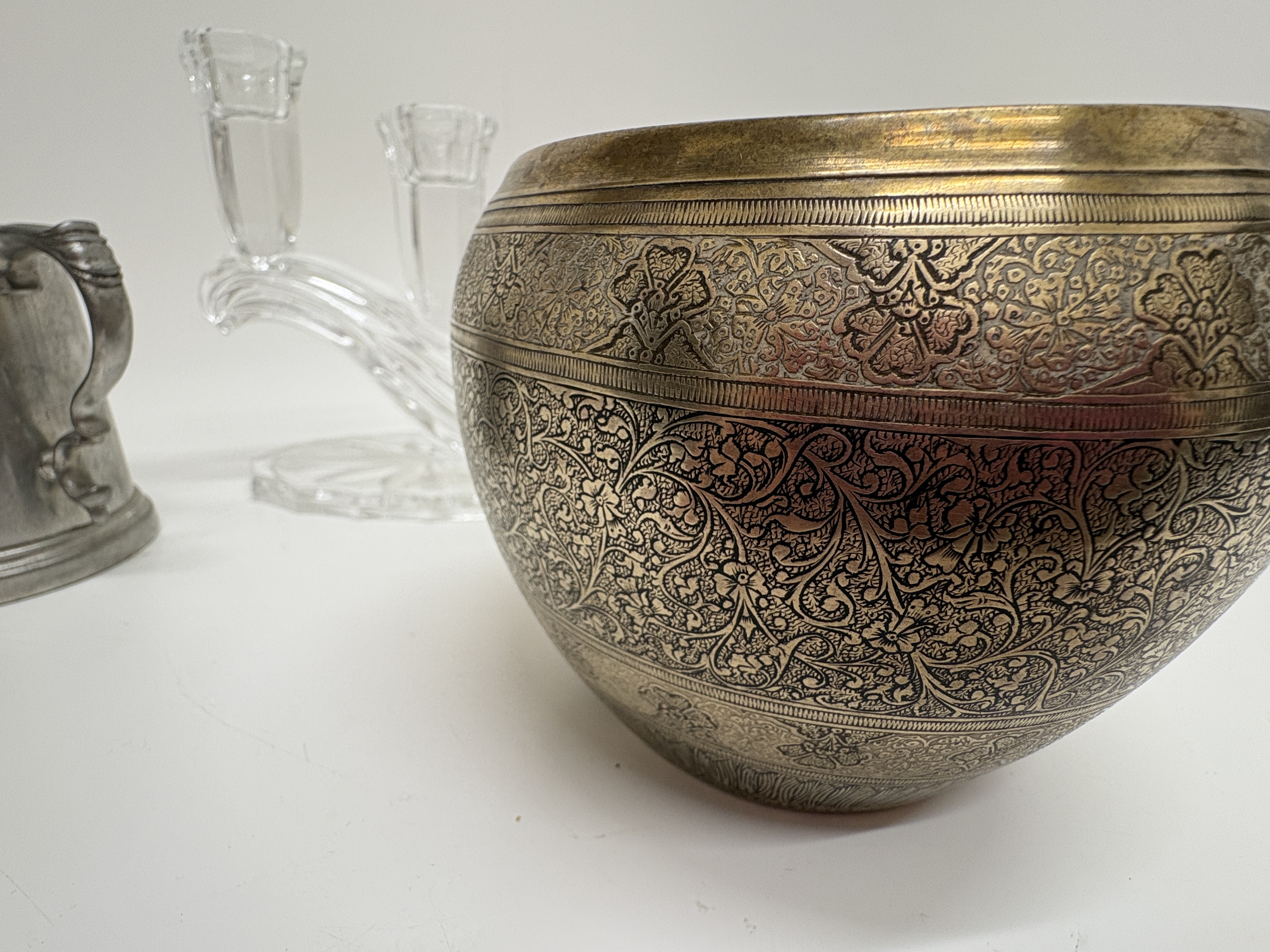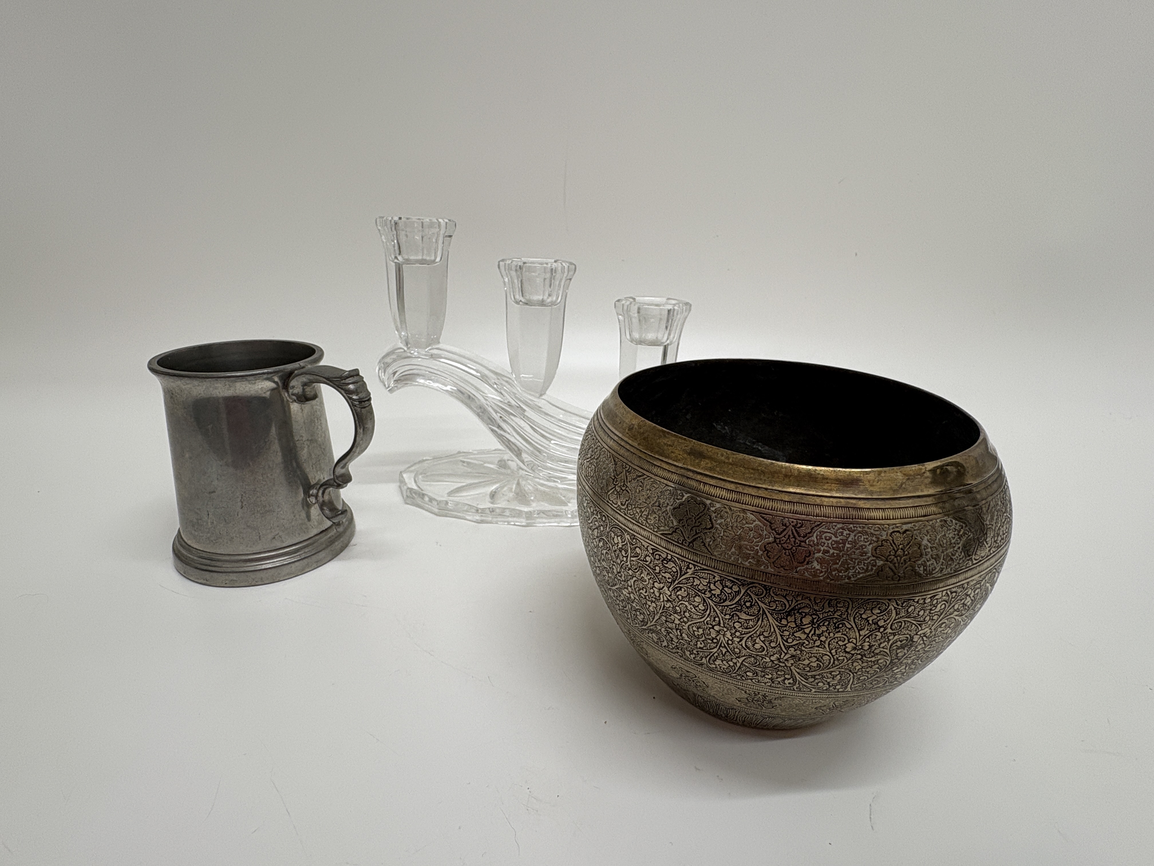 A Persian Mamluk Revival silver-inlaid brass bowl of bulbous form, intricately decorated with dense, hand-etched floral and foliate scrollwork motifs and a contrasting plain gold-toned rim. The lot also includes a pewter tankard featuring a scroll handle and a stepped base, stamped to the underside MADE IN SHEFFIELD ENGLISH PEWTER ENGLAND. Completing the group is a three-light candelabrum crafted from clear moulded glass with a wave-like arm design supported by a faceted, starburst-patterned base.