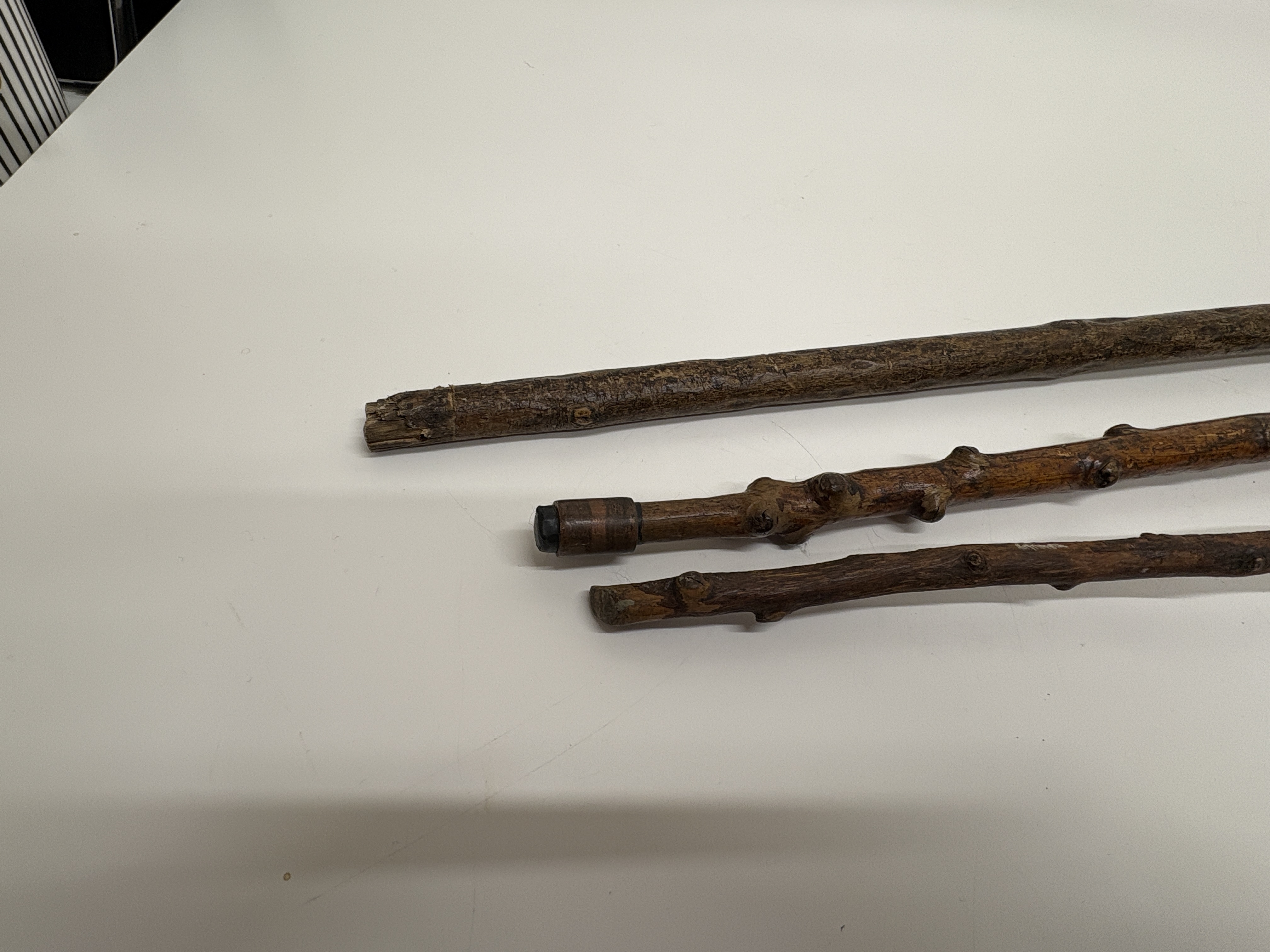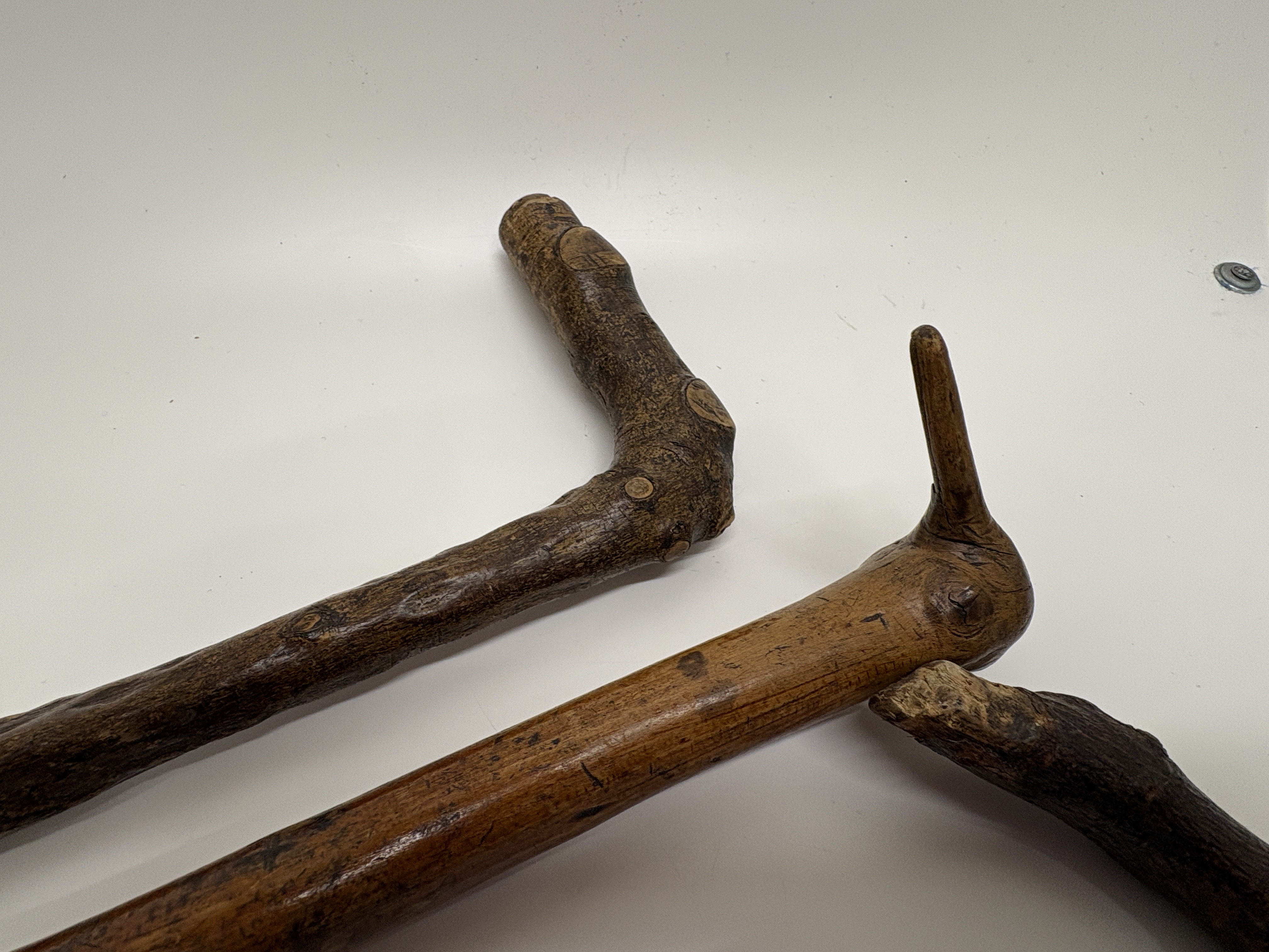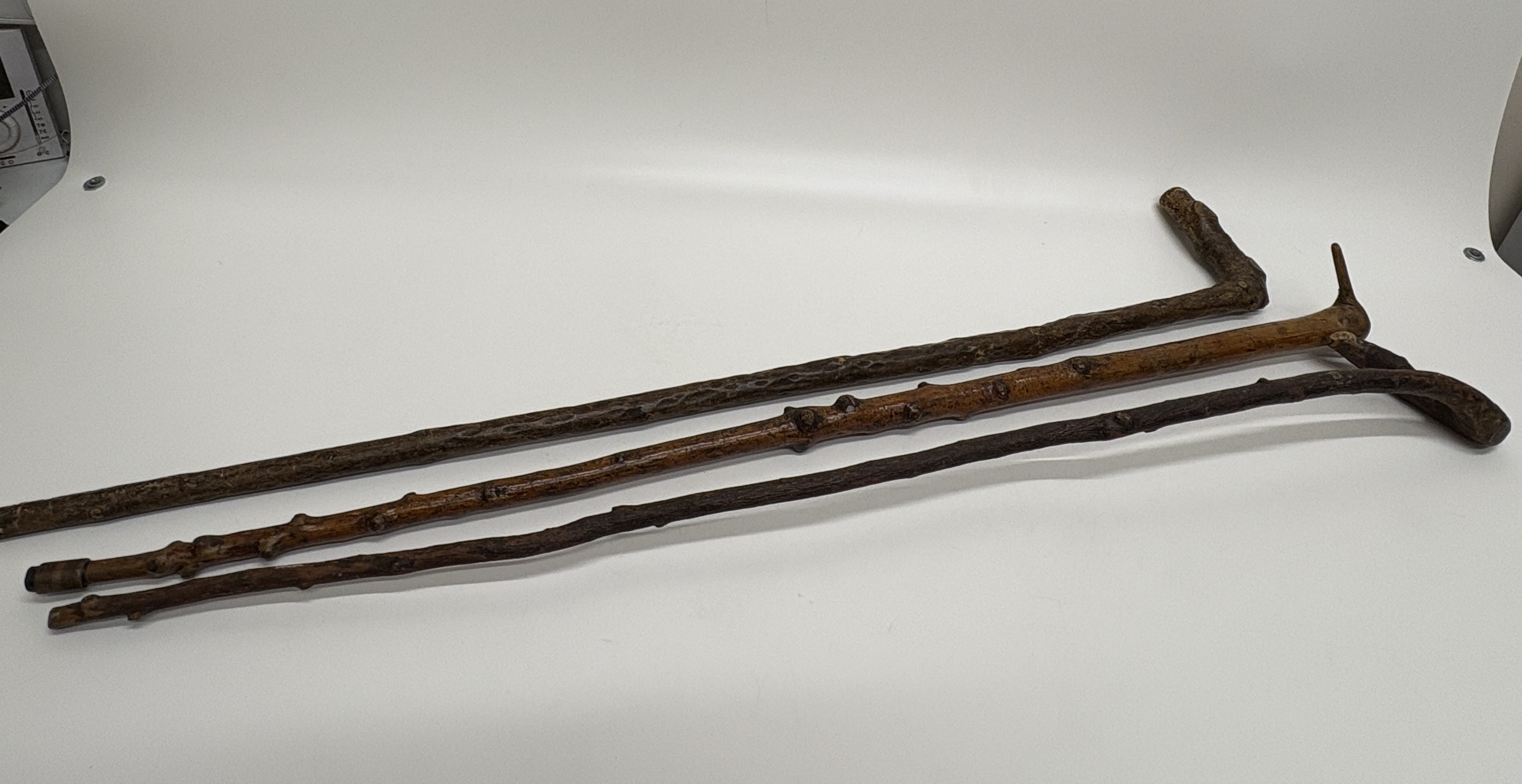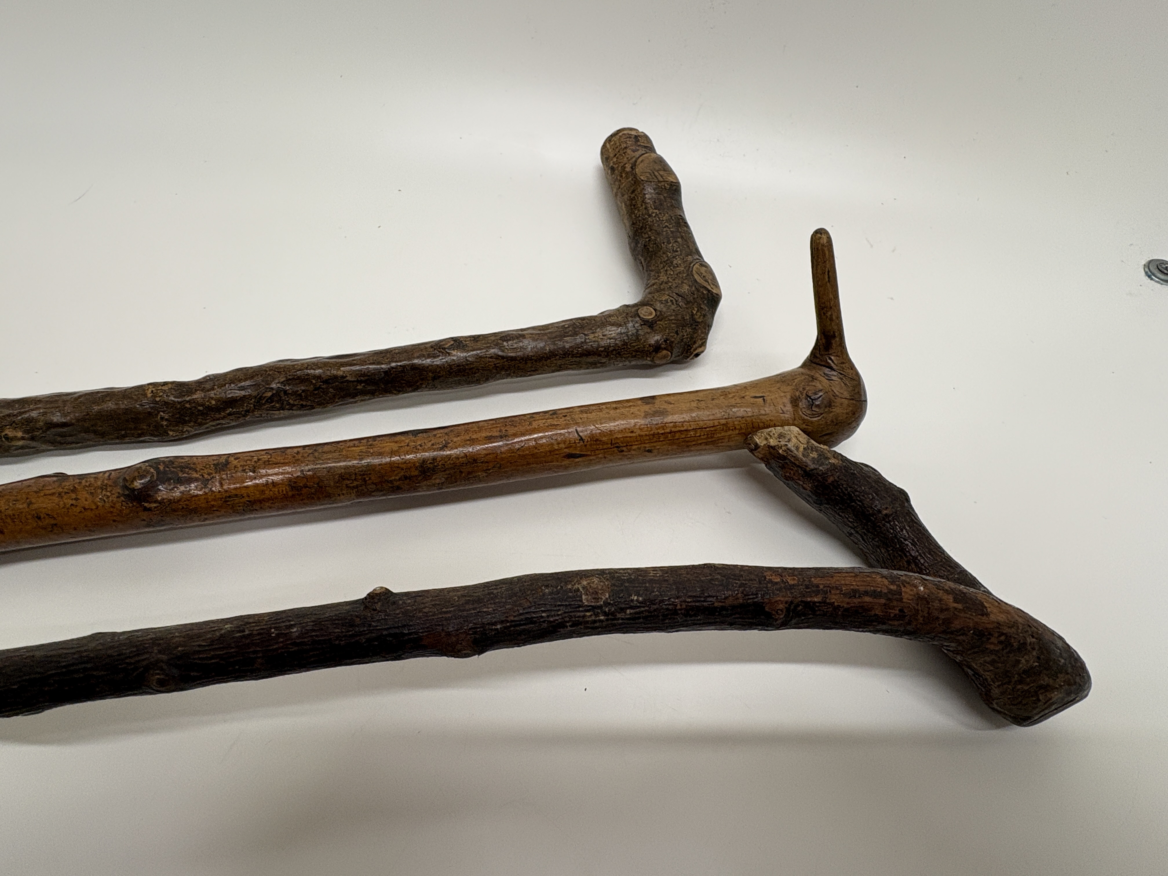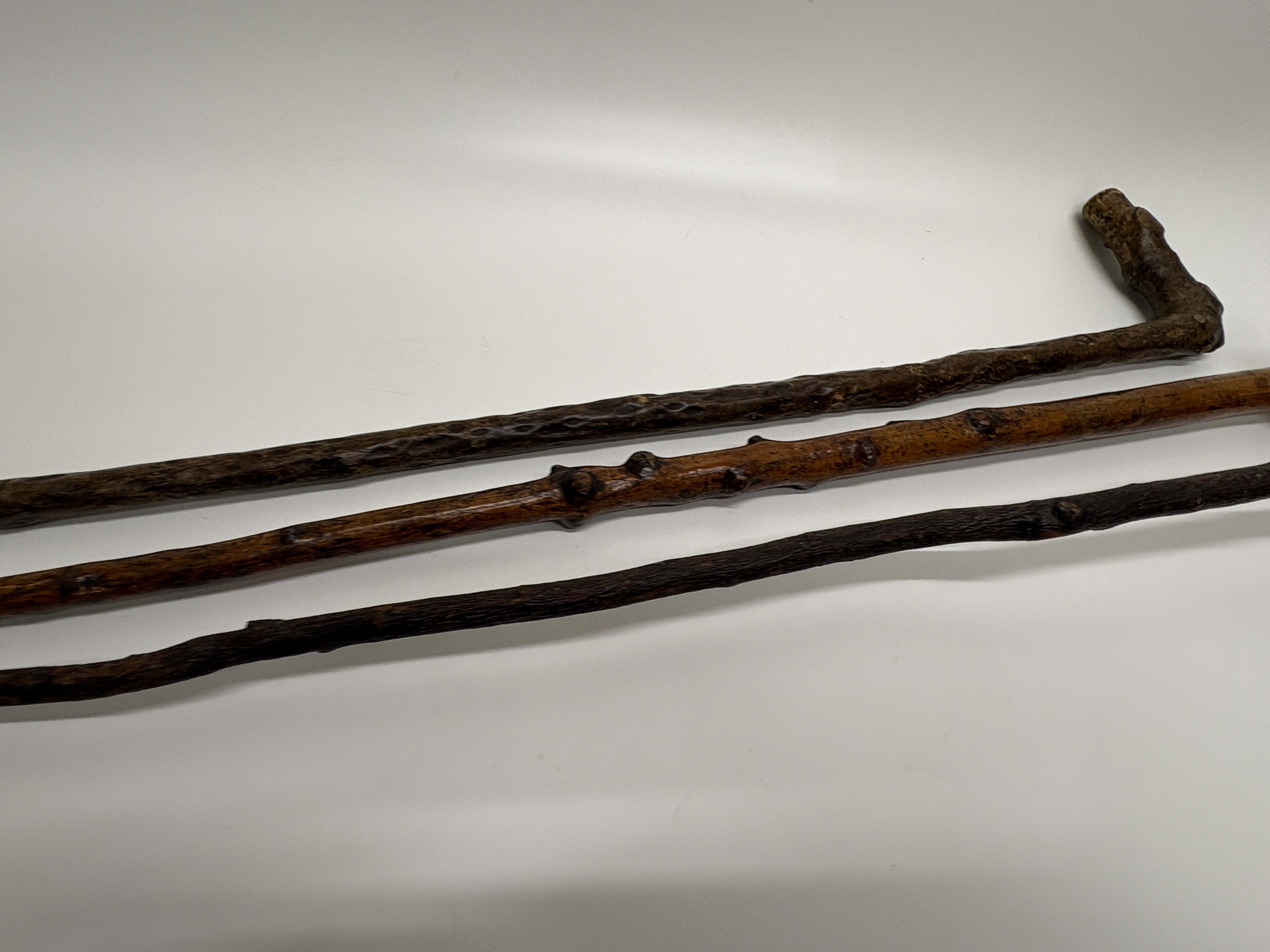 A trio of rustic walking sticks crafted in a naturalistic folk art style. The collection features shafts made from knotty, dark-stained wood, exhibiting the natural irregularities and prominent knots characteristic of blackthorn or similar timber. Each stick possesses a unique handle configuration: one features an L-shaped root handle, another displays a vertical branch projection, and the third has a naturally angled grip. The wood surfaces show a dark, polished patina throughout. One cane is fitted with a dark ferrule at the base, while the others terminate in blunt or tapered wooden tips.